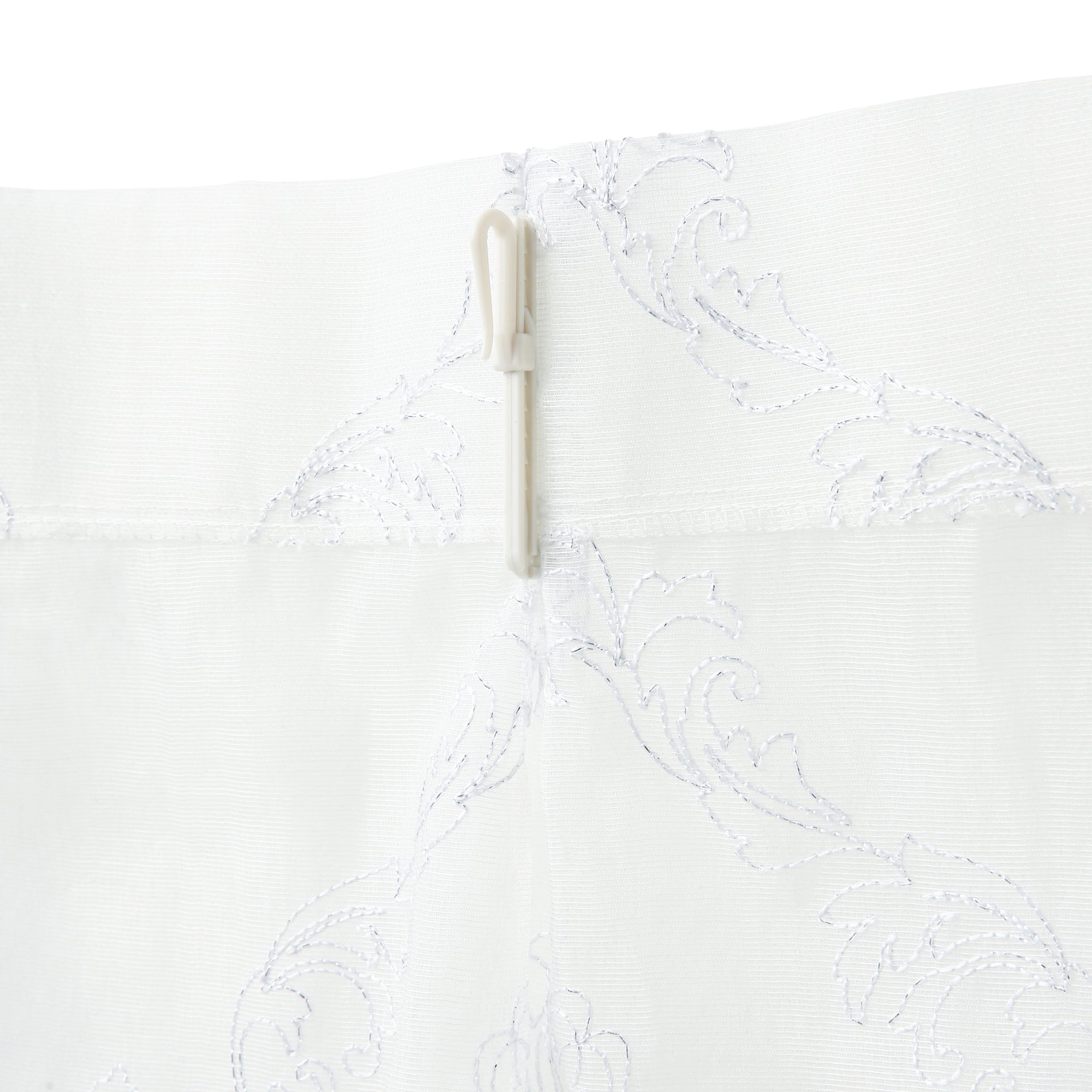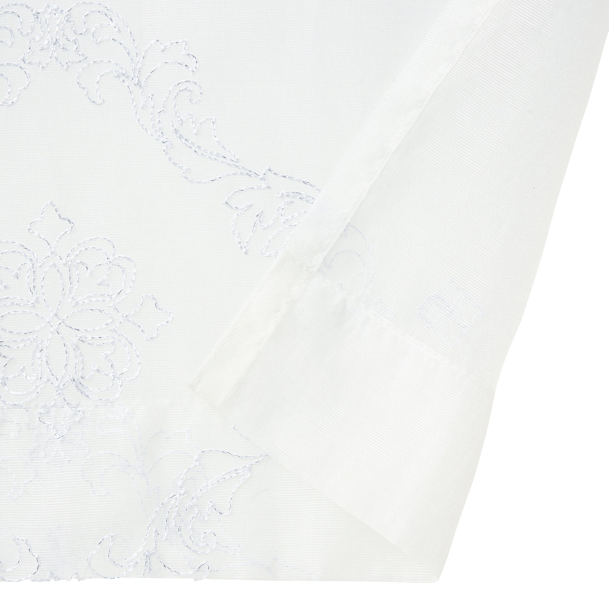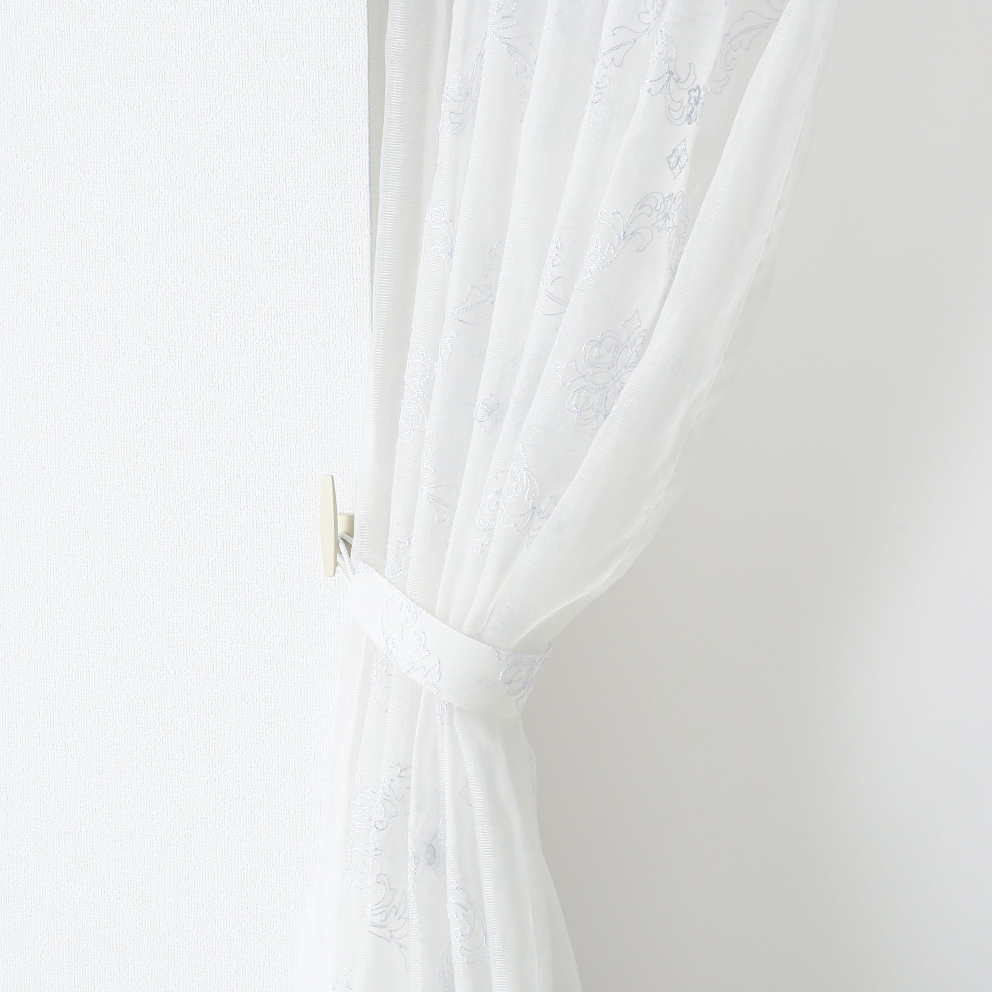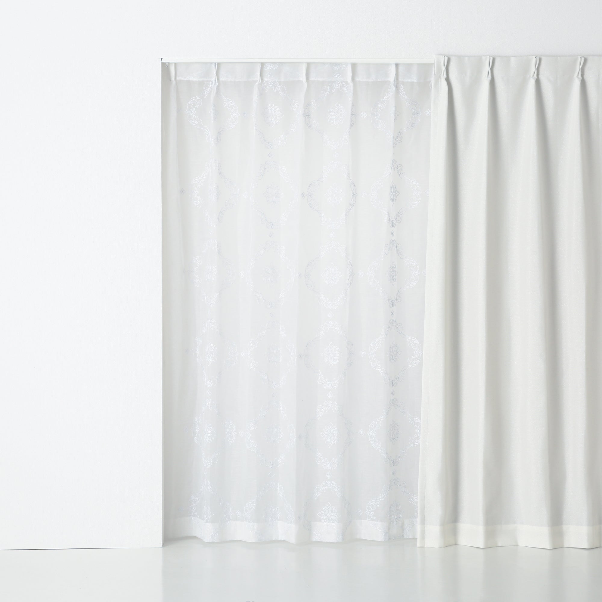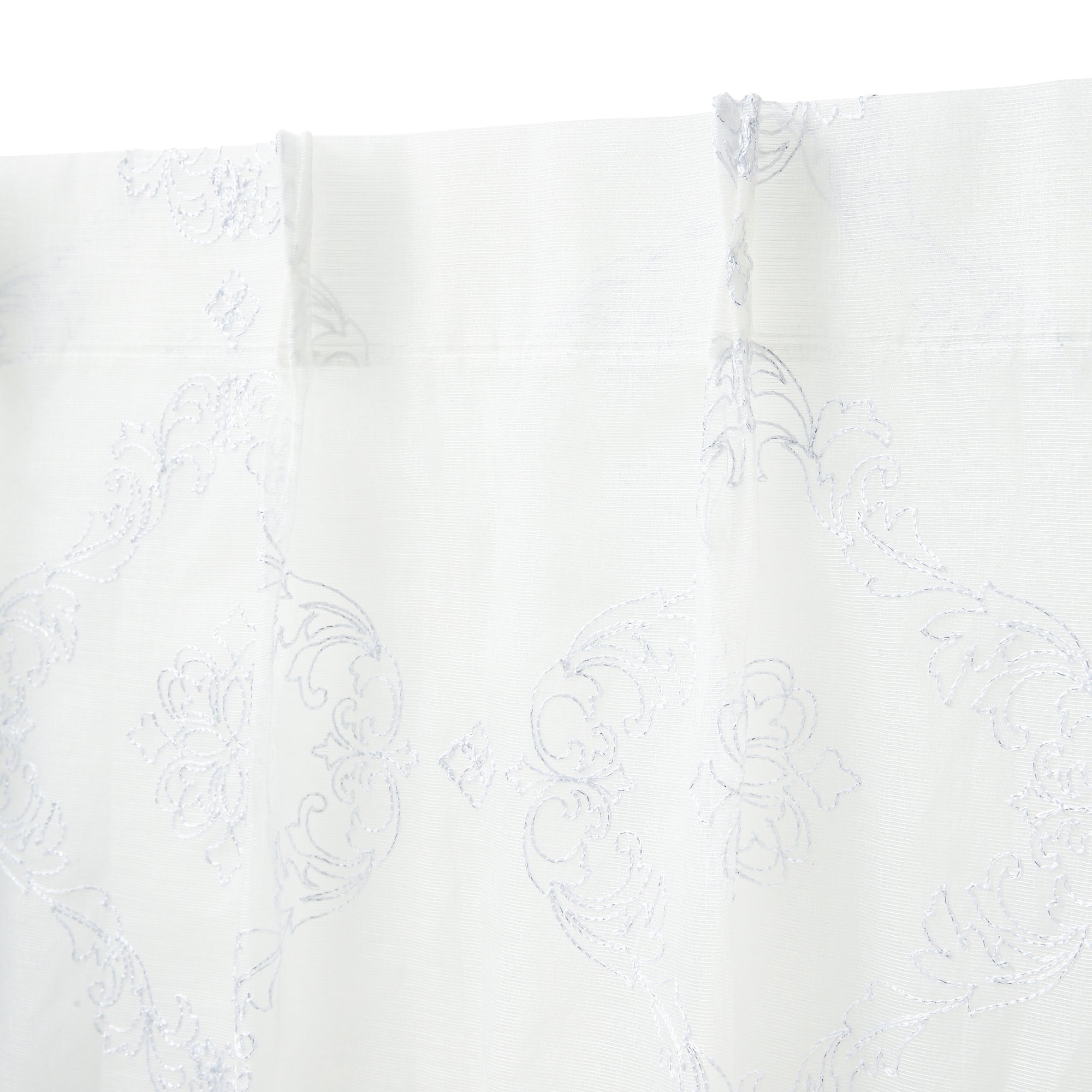 透け感のあるボイル生地のレースカーテンです。 ホワイトのラメ刺繍でオーナメント柄を全面に施した贅沢な仕上げで、エレガントなお部屋のアクセントになります。