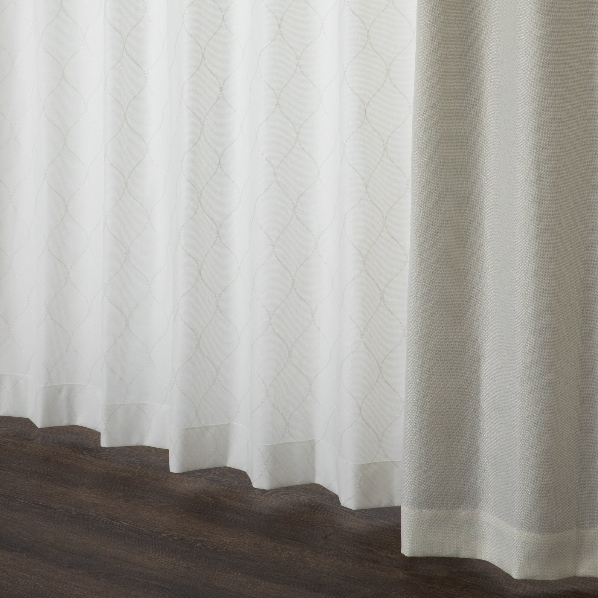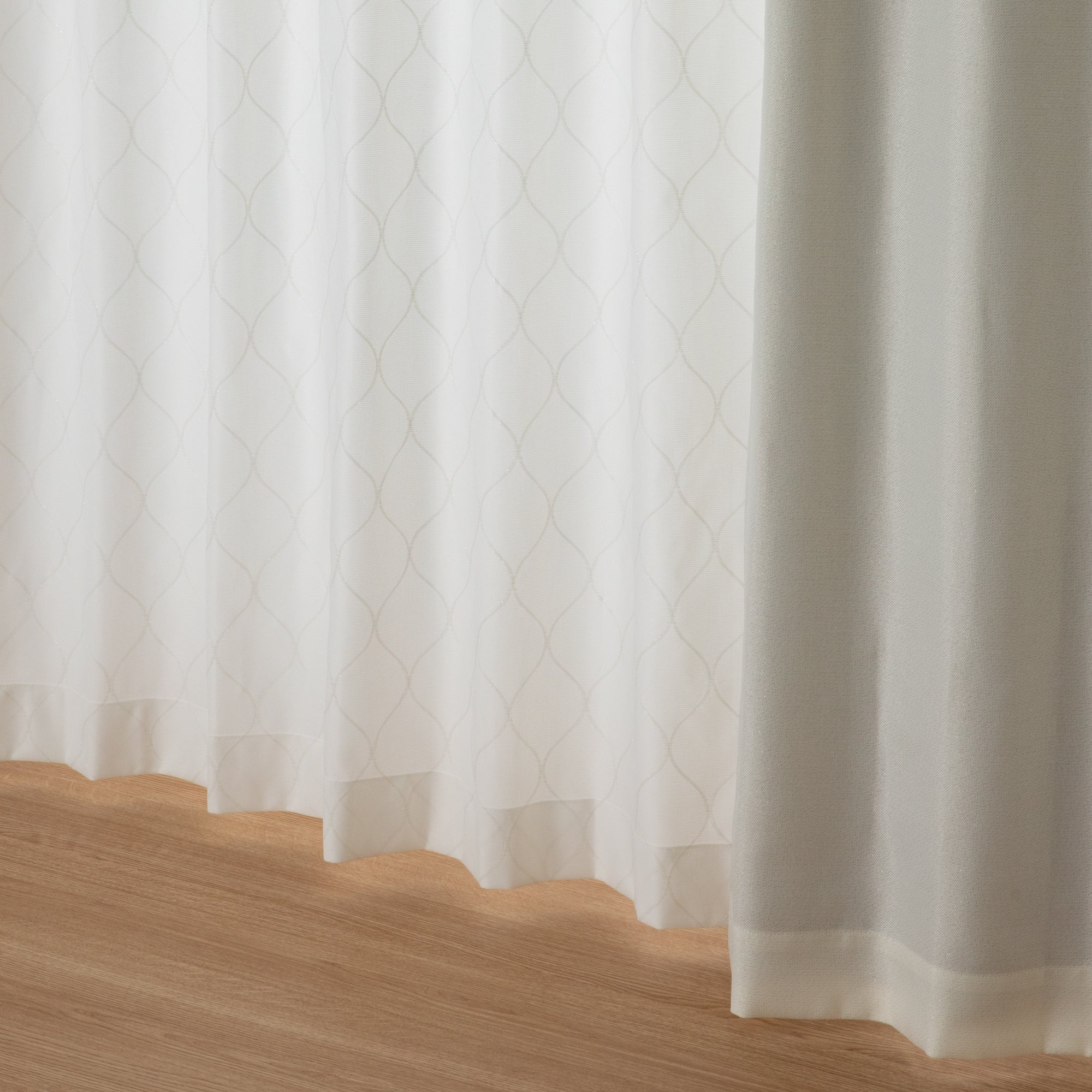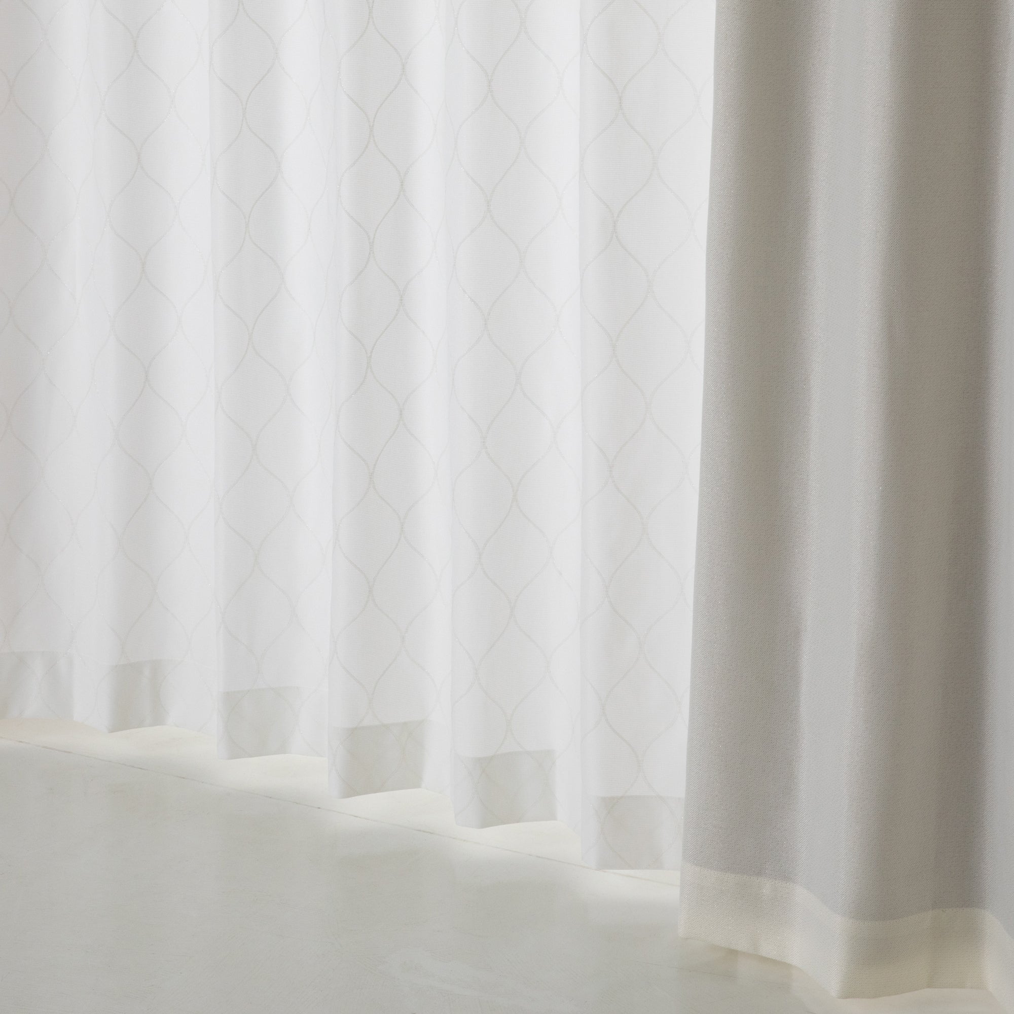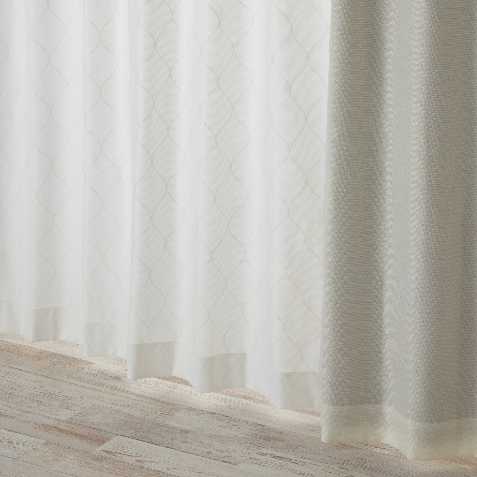ラメ糸の刺繍図案がモロッカンテイストなレースです。防炎、遮像、UVカットなど豊富な機能が付いて便利です。