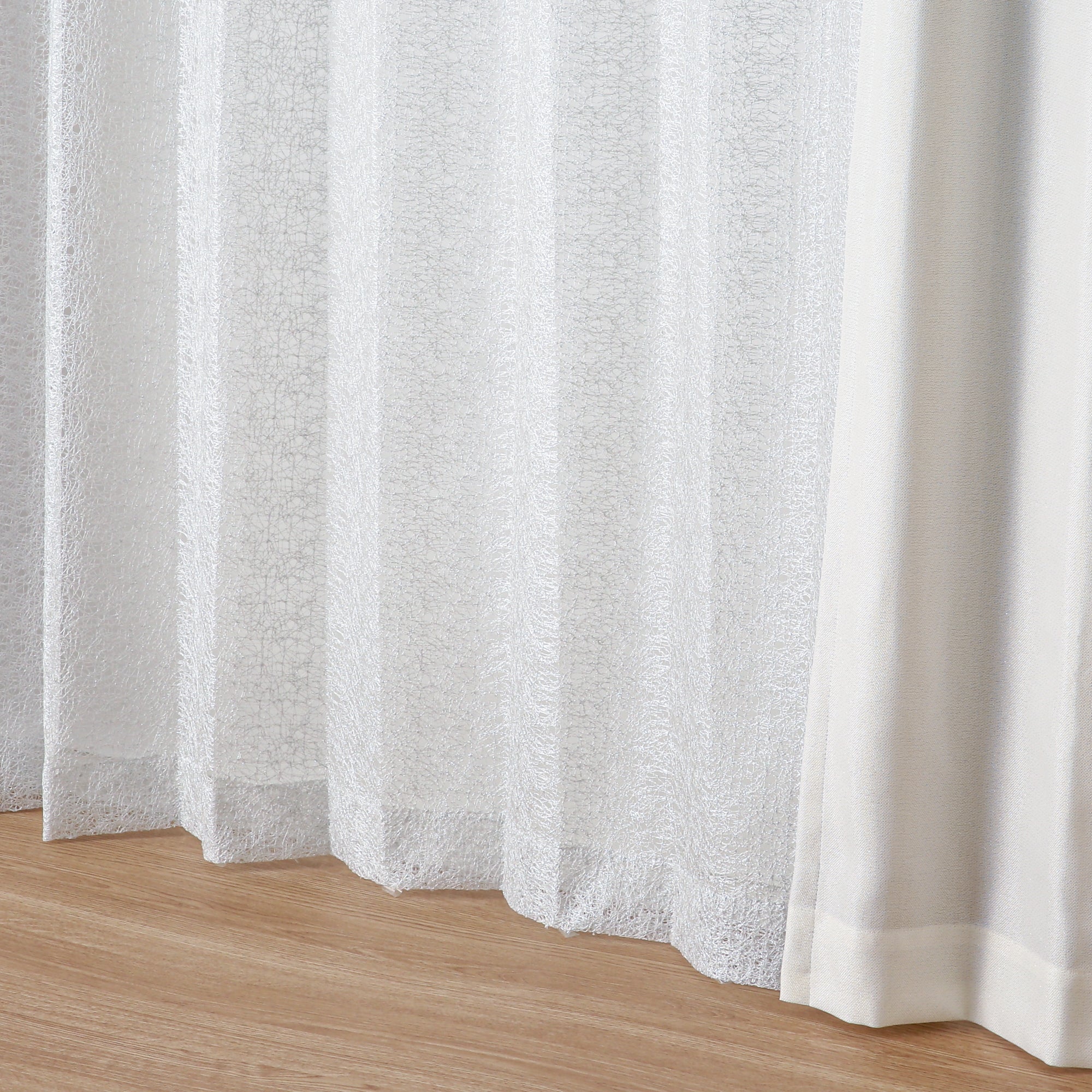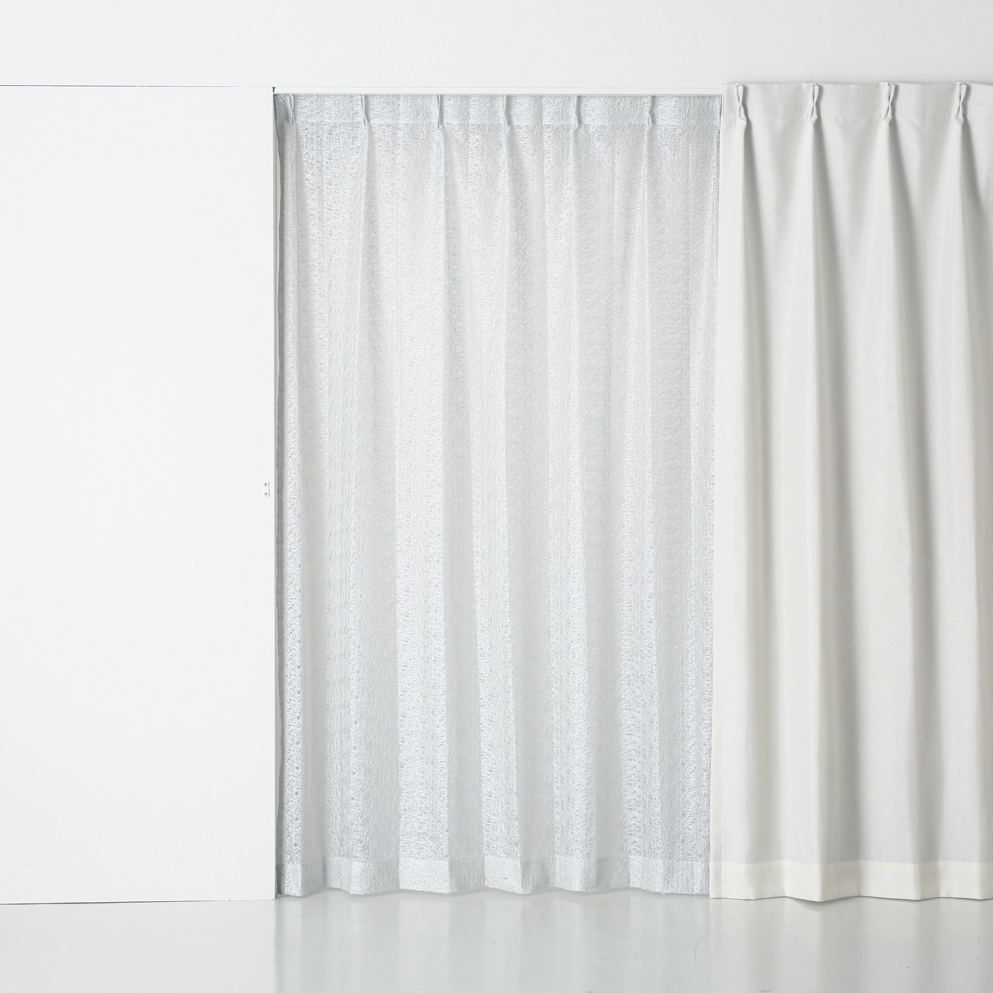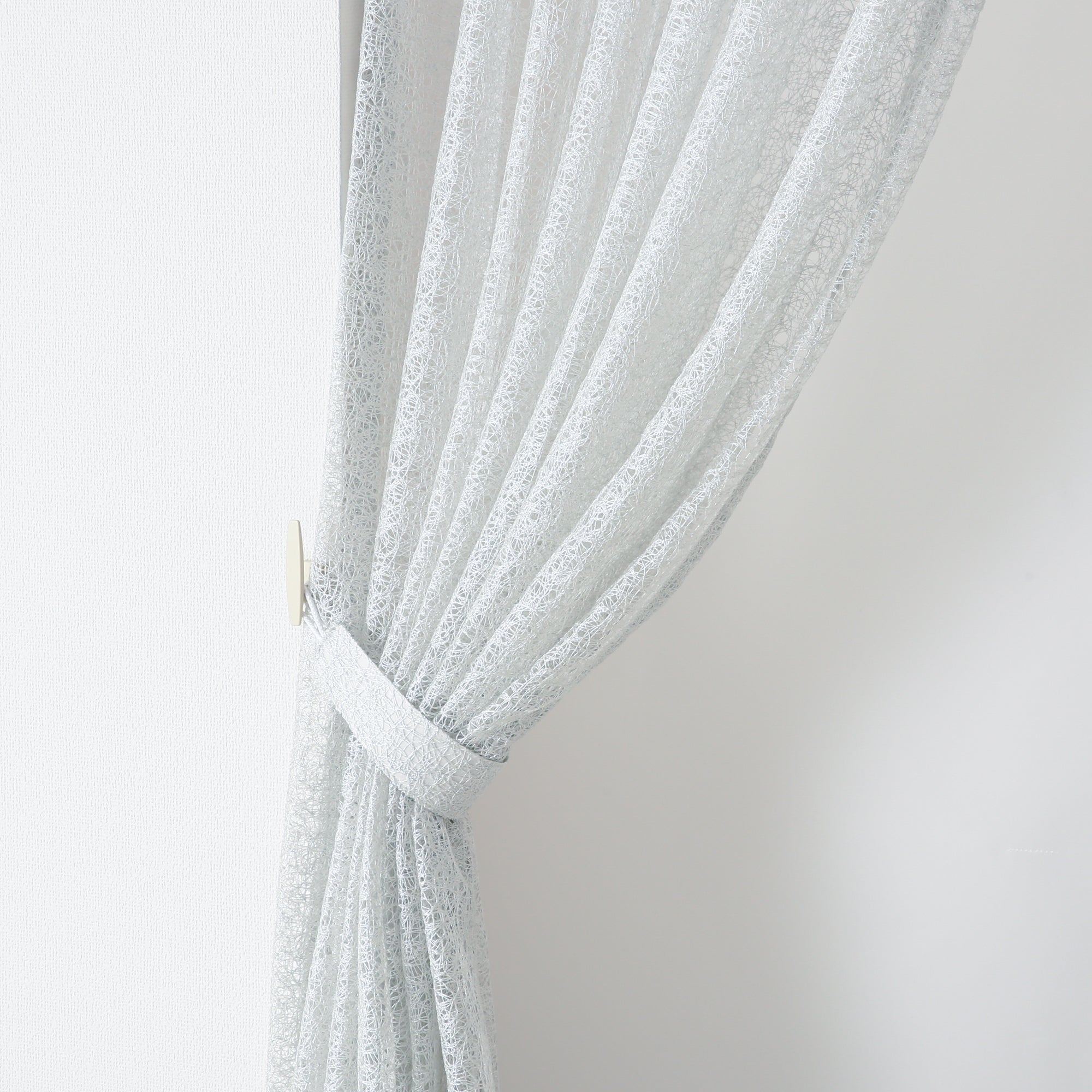 モールのように重ね合わせた糸が独特のテクスチャー感のレースカーテンです。 シンプルなシルバーのカラーは淡い色とも濃い色とも相性がよく、組み合わせるカーテンによって印象が変わるのでコーディネートをお楽しみいただけます。 洋室にはもちろん、和室にもあうデザインで、モダンなインテリアのコーディネートにおすすめです。