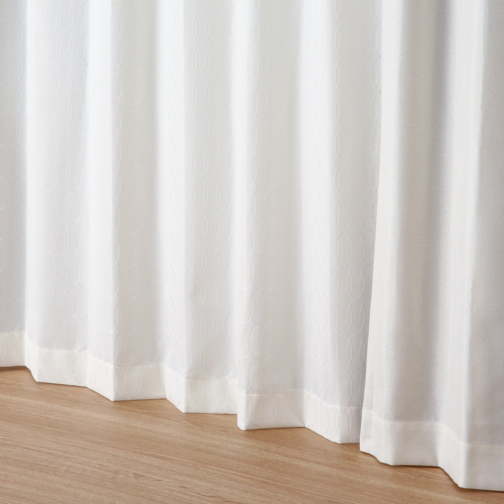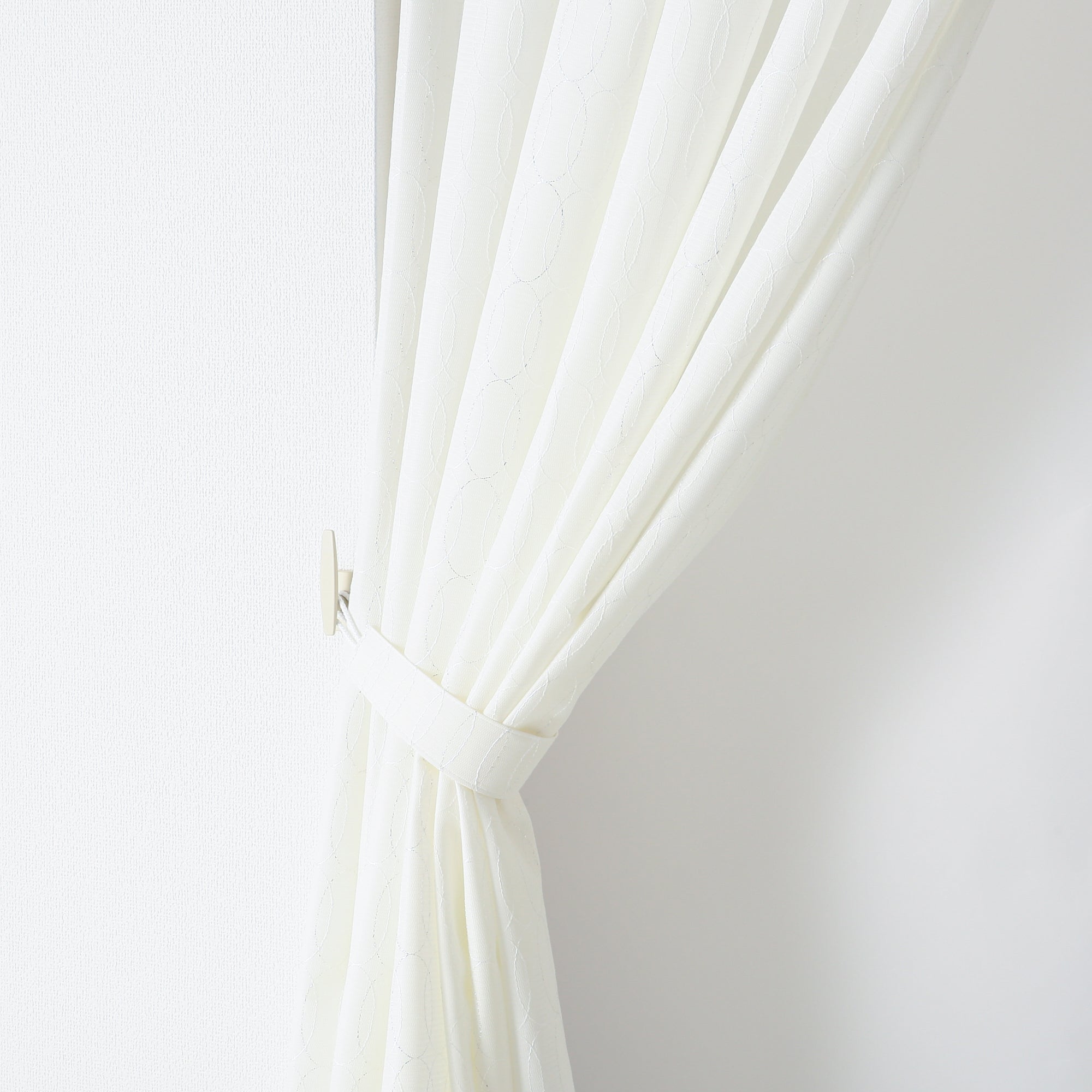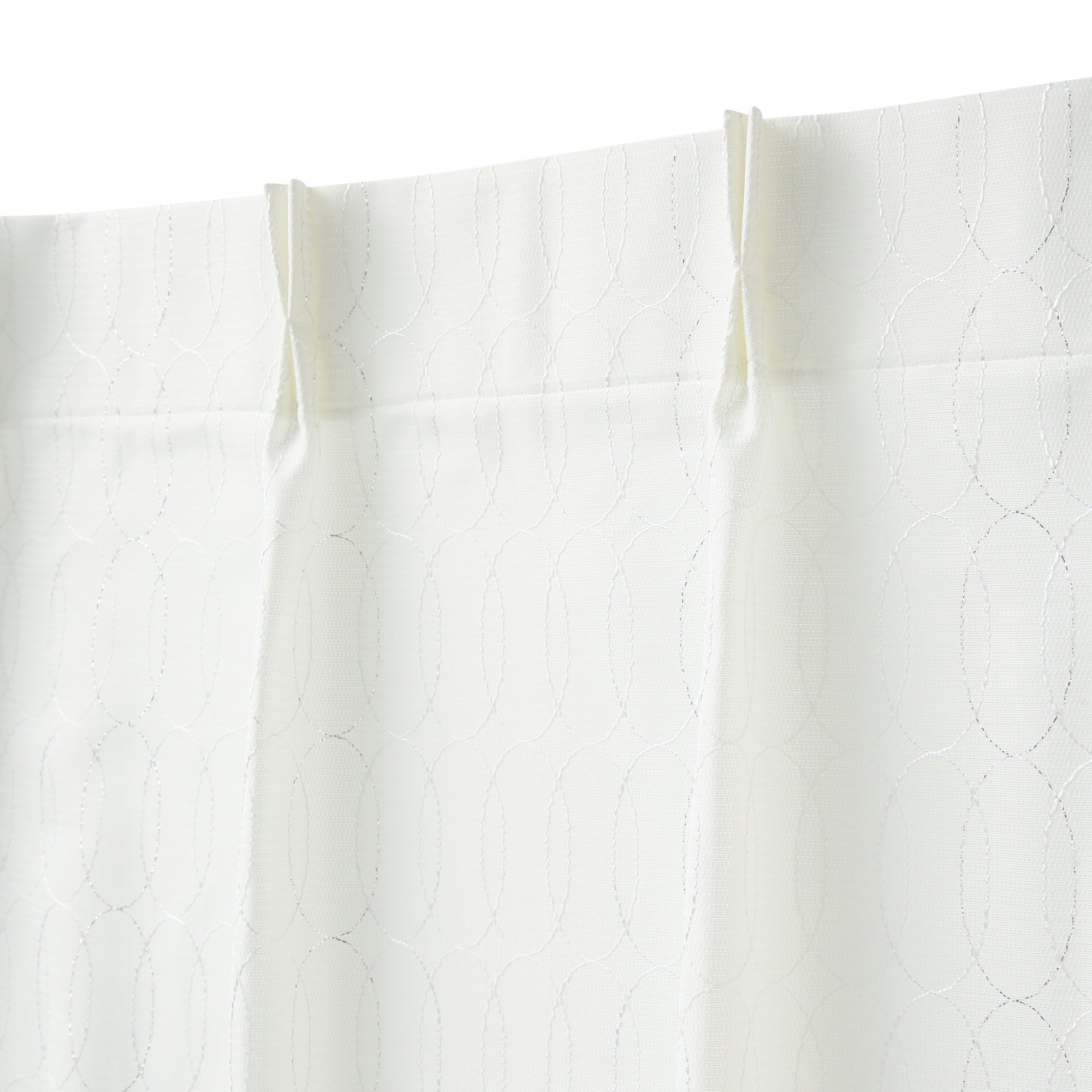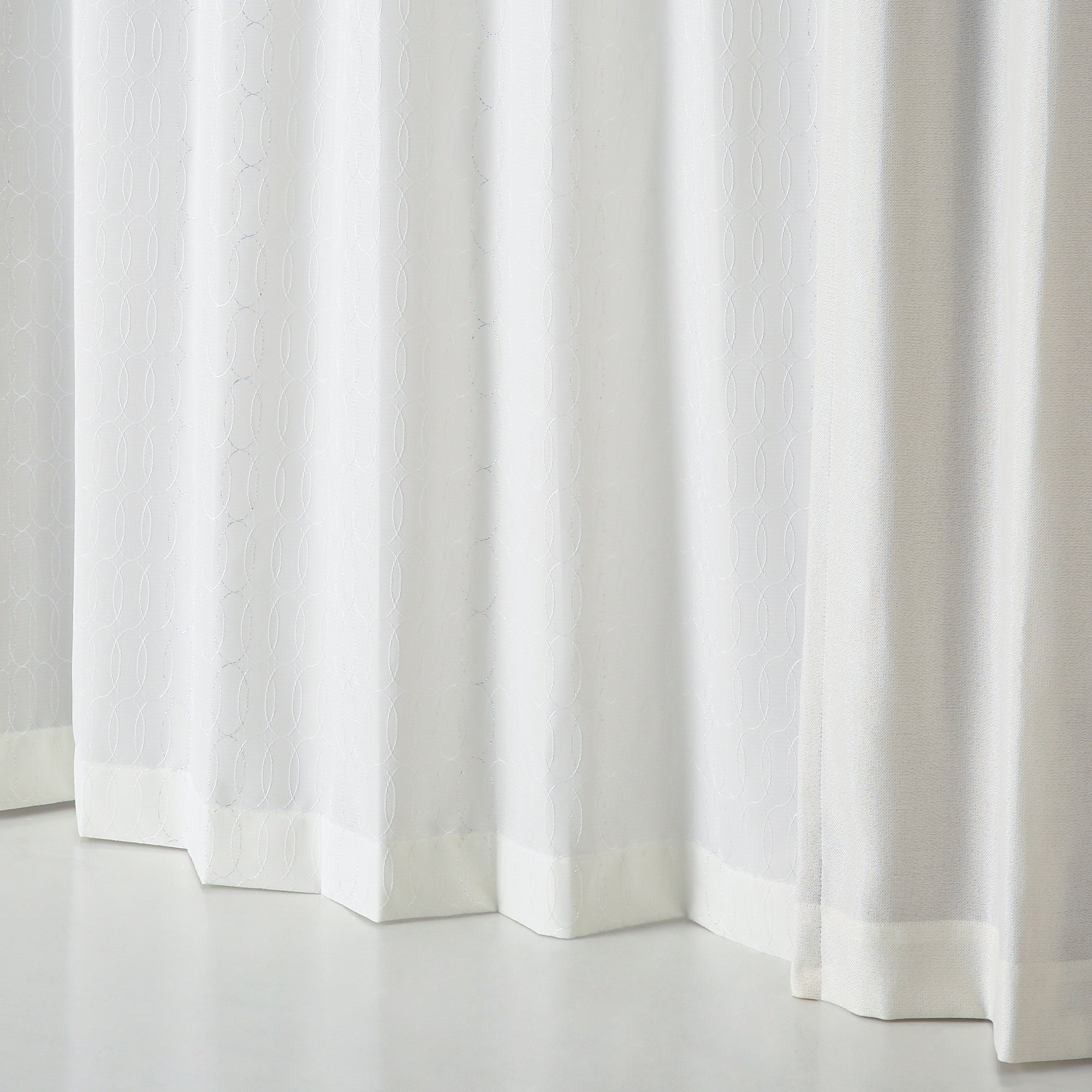 楕円形の刺繍をほどこしたレース生地です。 アクセントとしてところどころラメ糸が使用されています。 遮熱・UVカット・オフシェイドを搭載しており、機能性とデザイン性、どちらも兼ね備えたカーテンです。