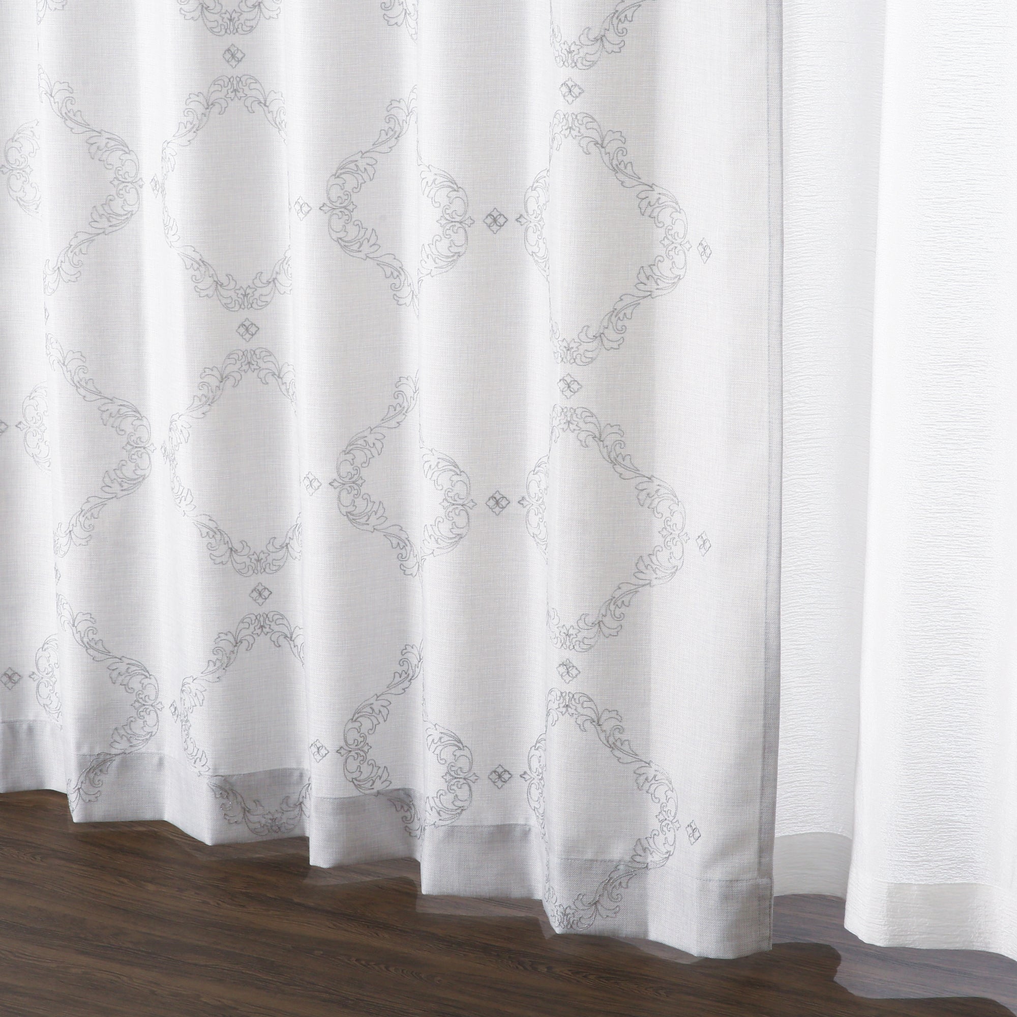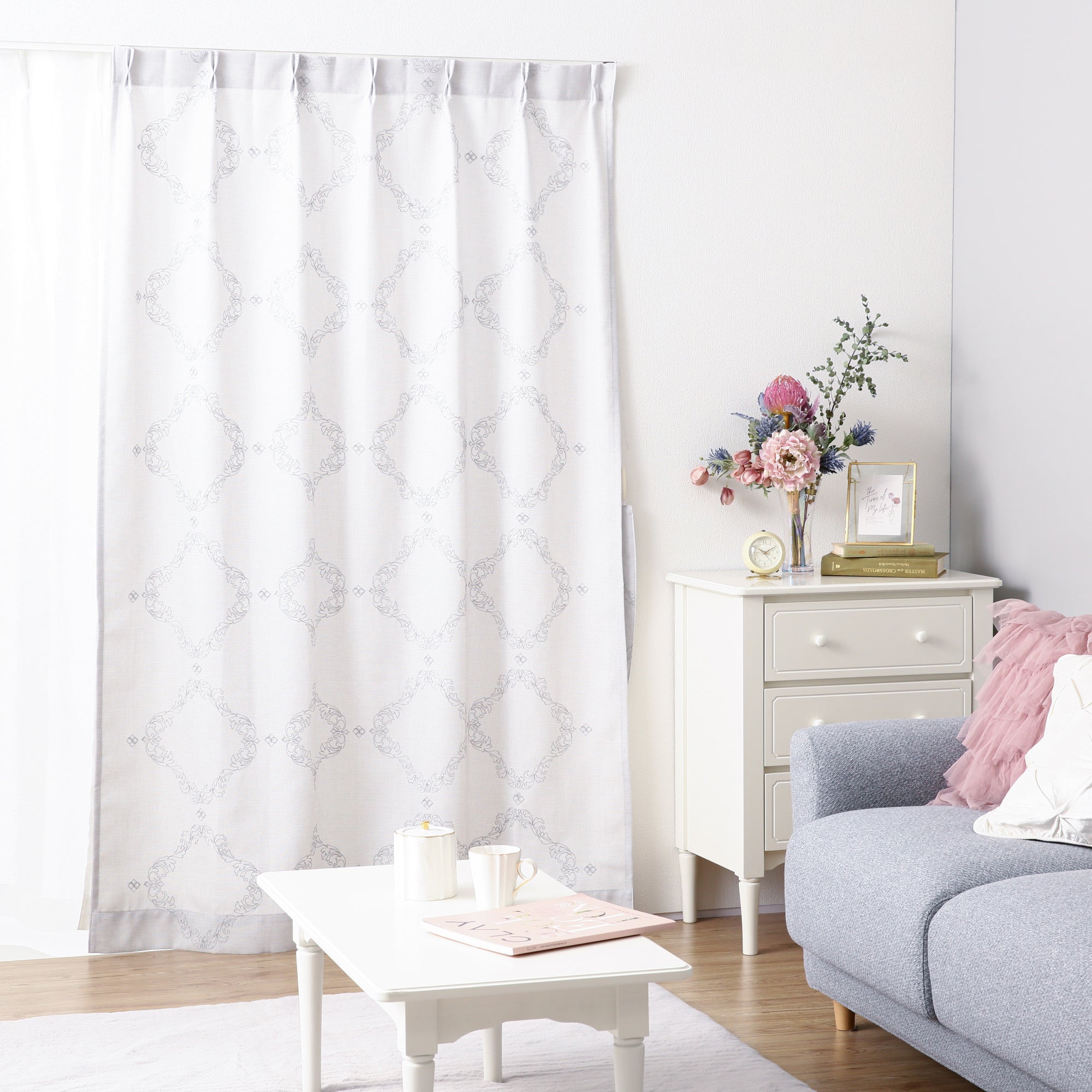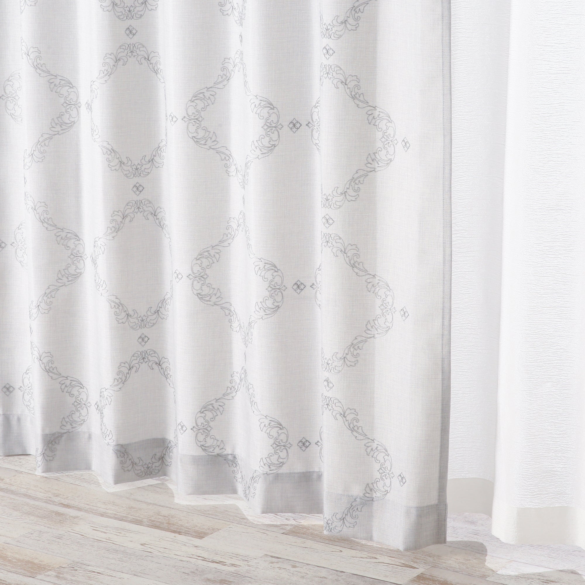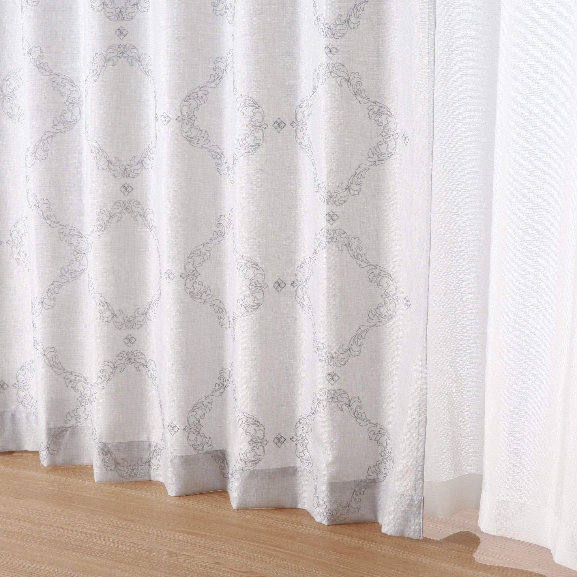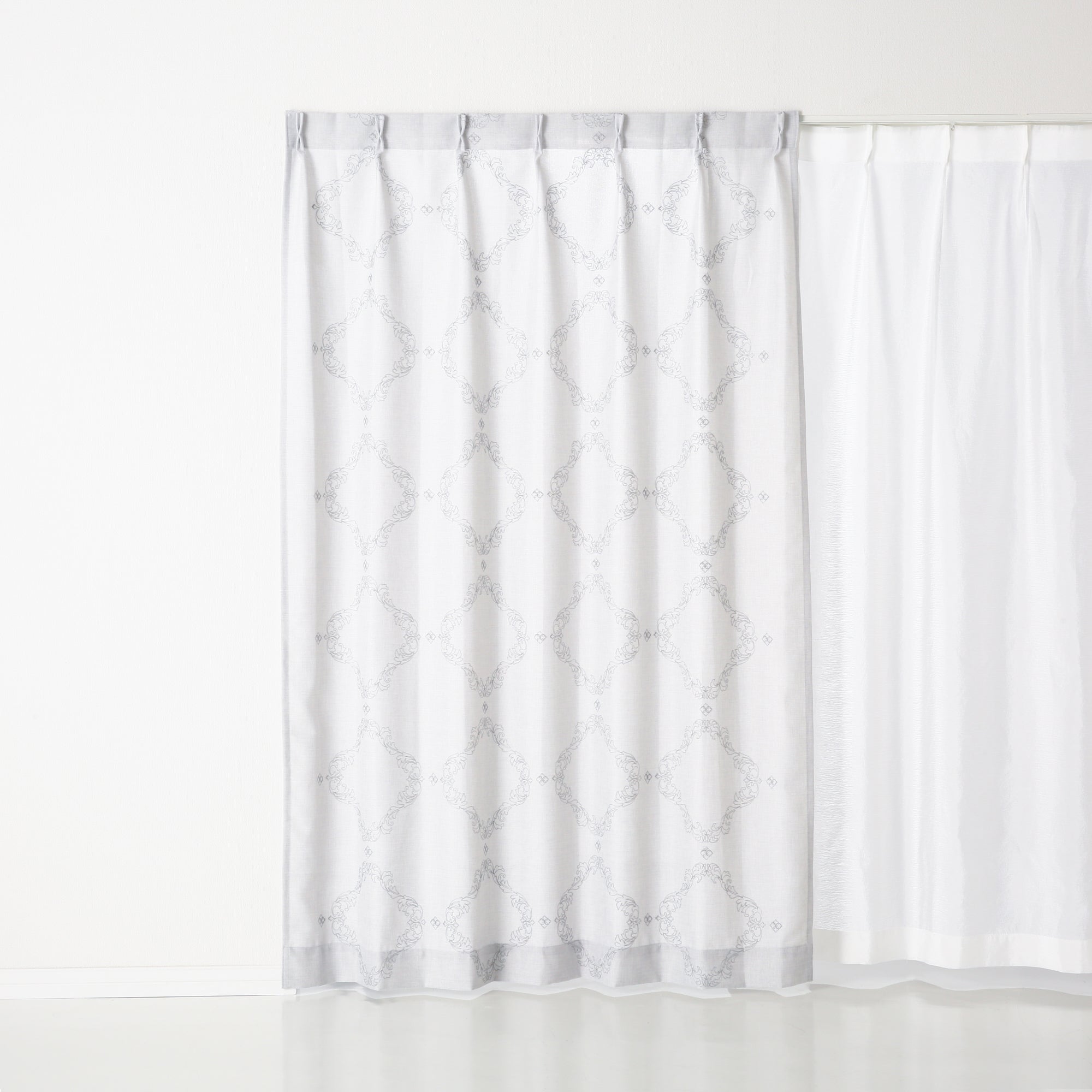 シャンブレー調の上品な生地に、シルバーのラメ刺繍で美しい曲線のオーナメントモチーフを施したカーテンです。 ラメ刺繍で華やかさもありながら全体的にはエレガントな印象のまとまりのあるデザイン。 シンプルななかにこだわりを感じるアイテムです。 ※掲載画像はウェーブ加工を施しております。