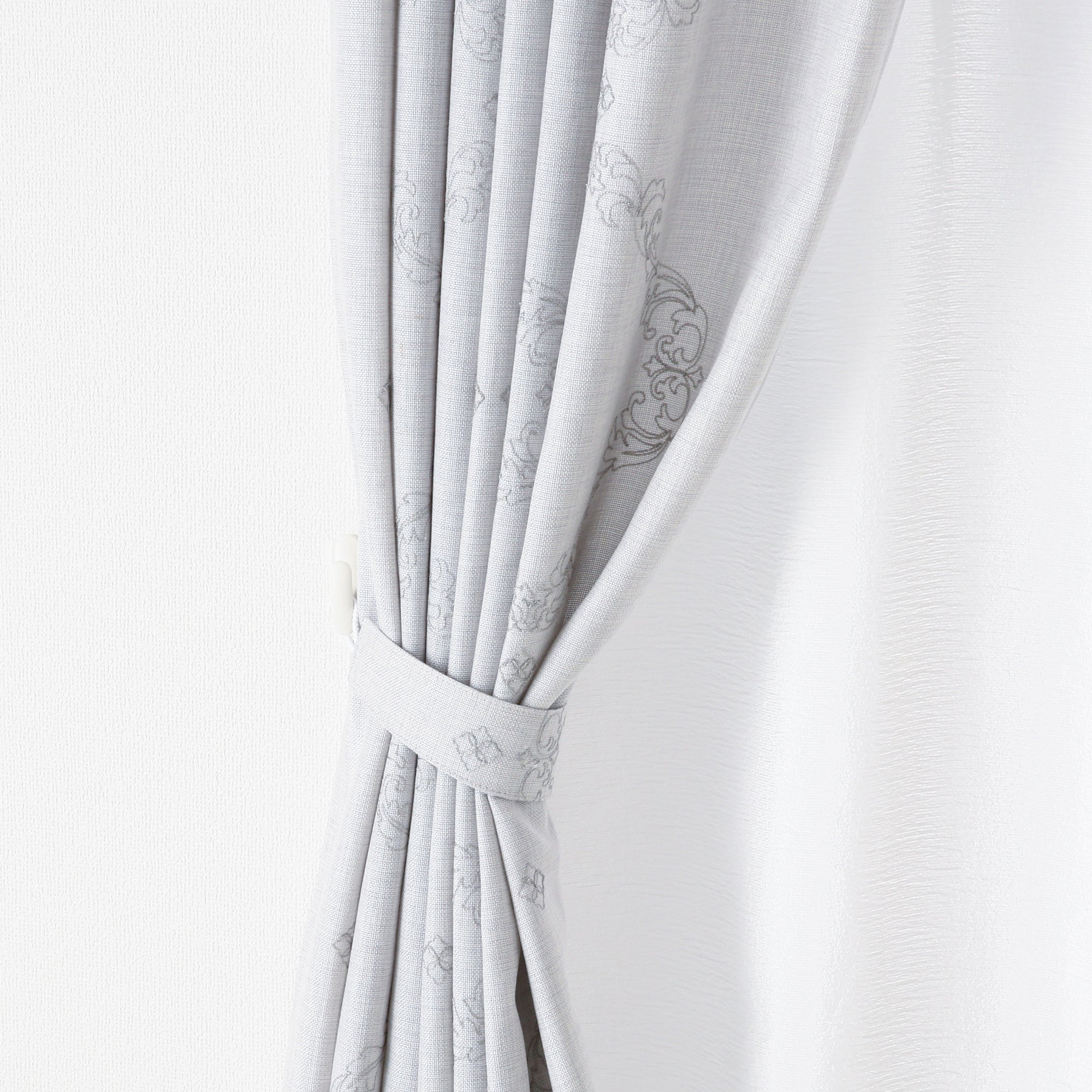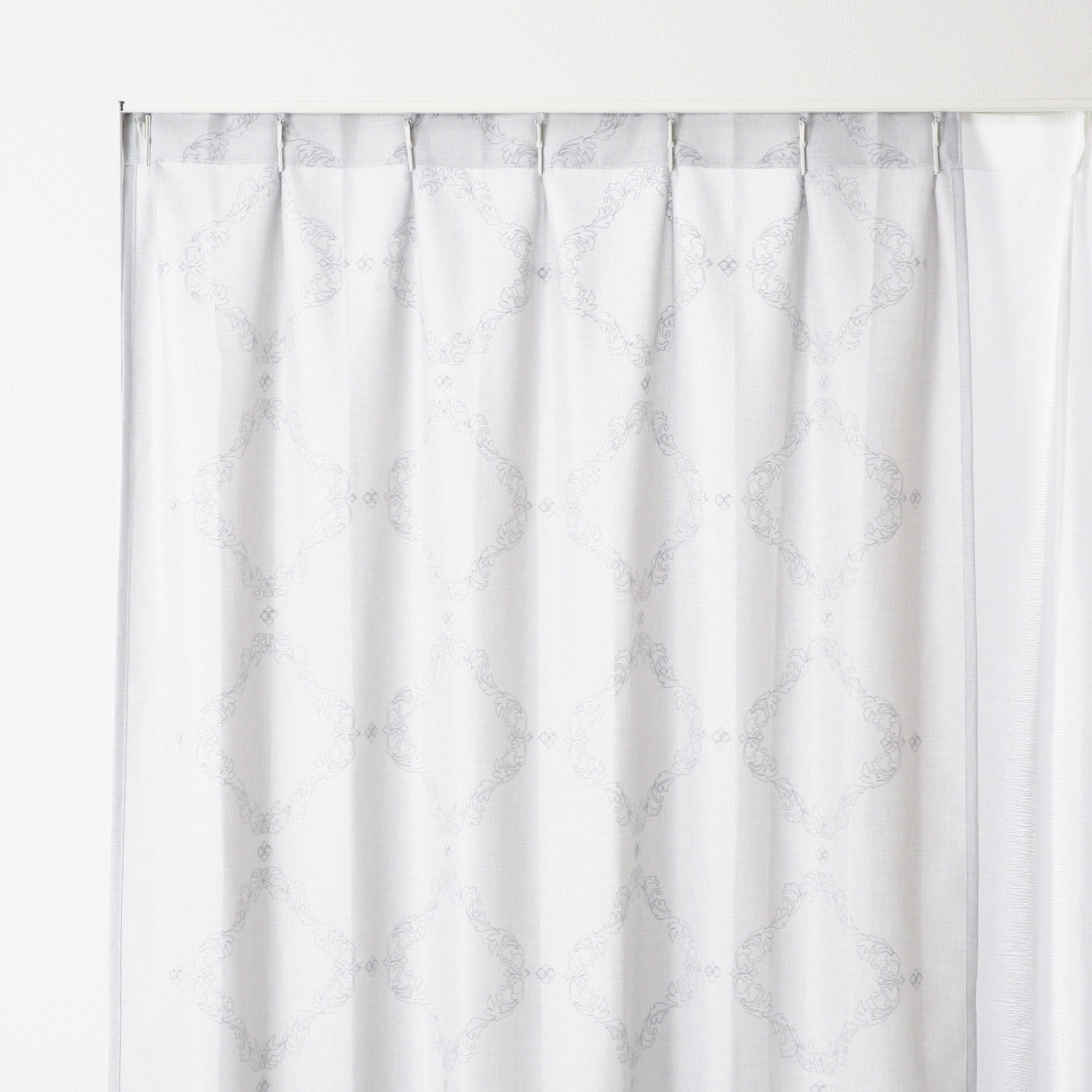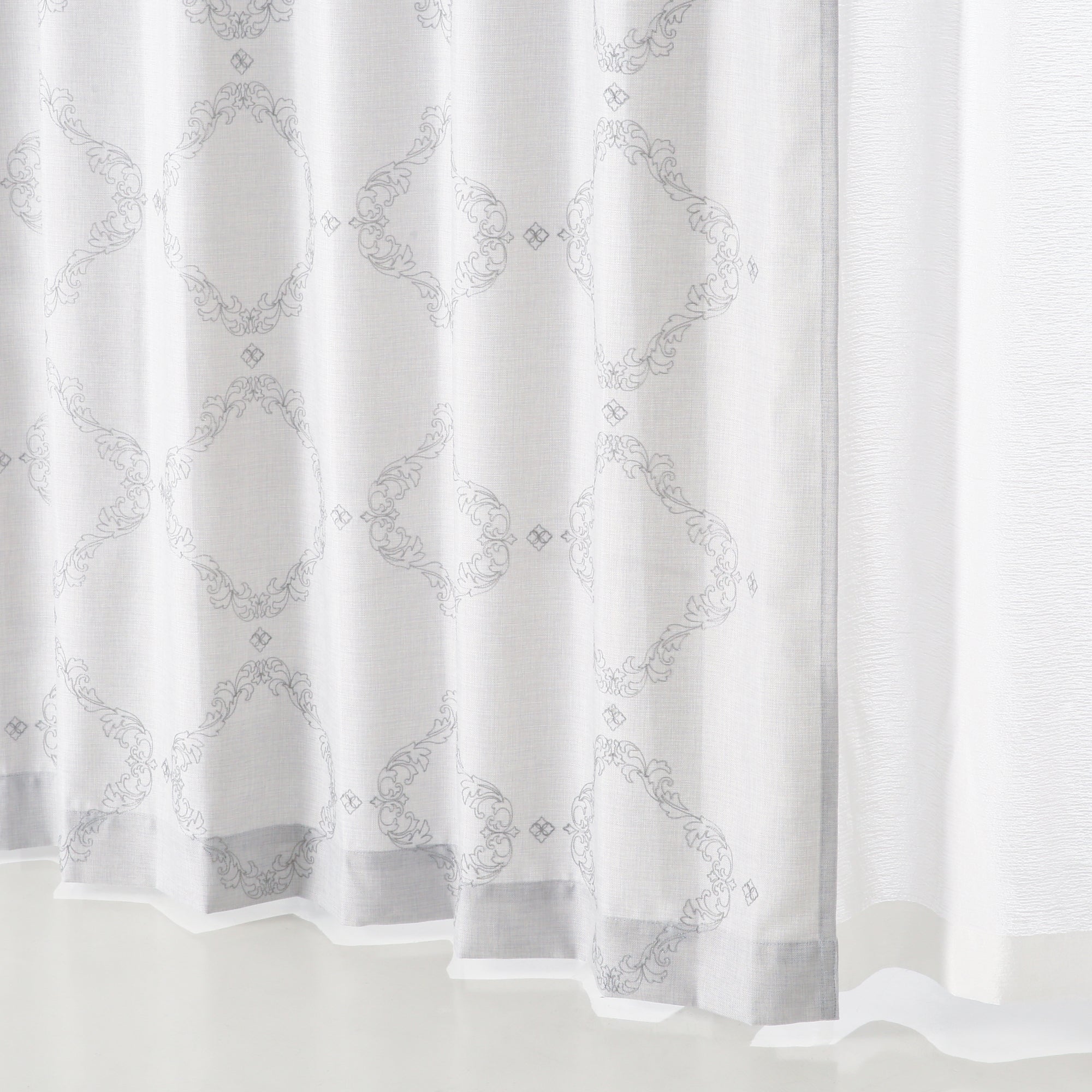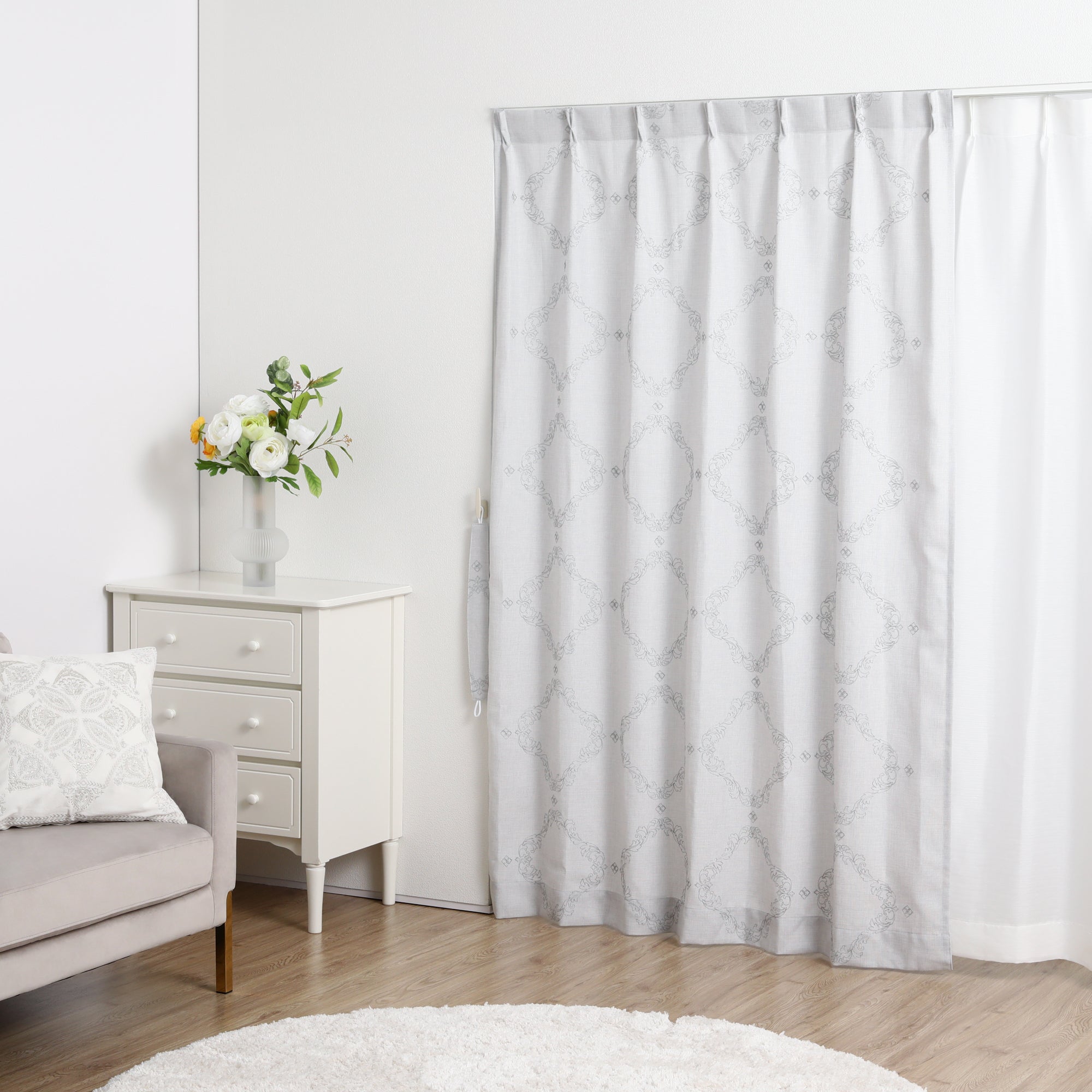 シャンブレー調の上品な生地に、シルバーのラメ刺繍で美しい曲線のオーナメントモチーフを施したカーテンです。 ラメ刺繍で華やかさもありながら全体的にはエレガントな印象のまとまりのあるデザイン。 シンプルななかにこだわりを感じるアイテムです。 ※掲載画像はウェーブ加工を施しております。