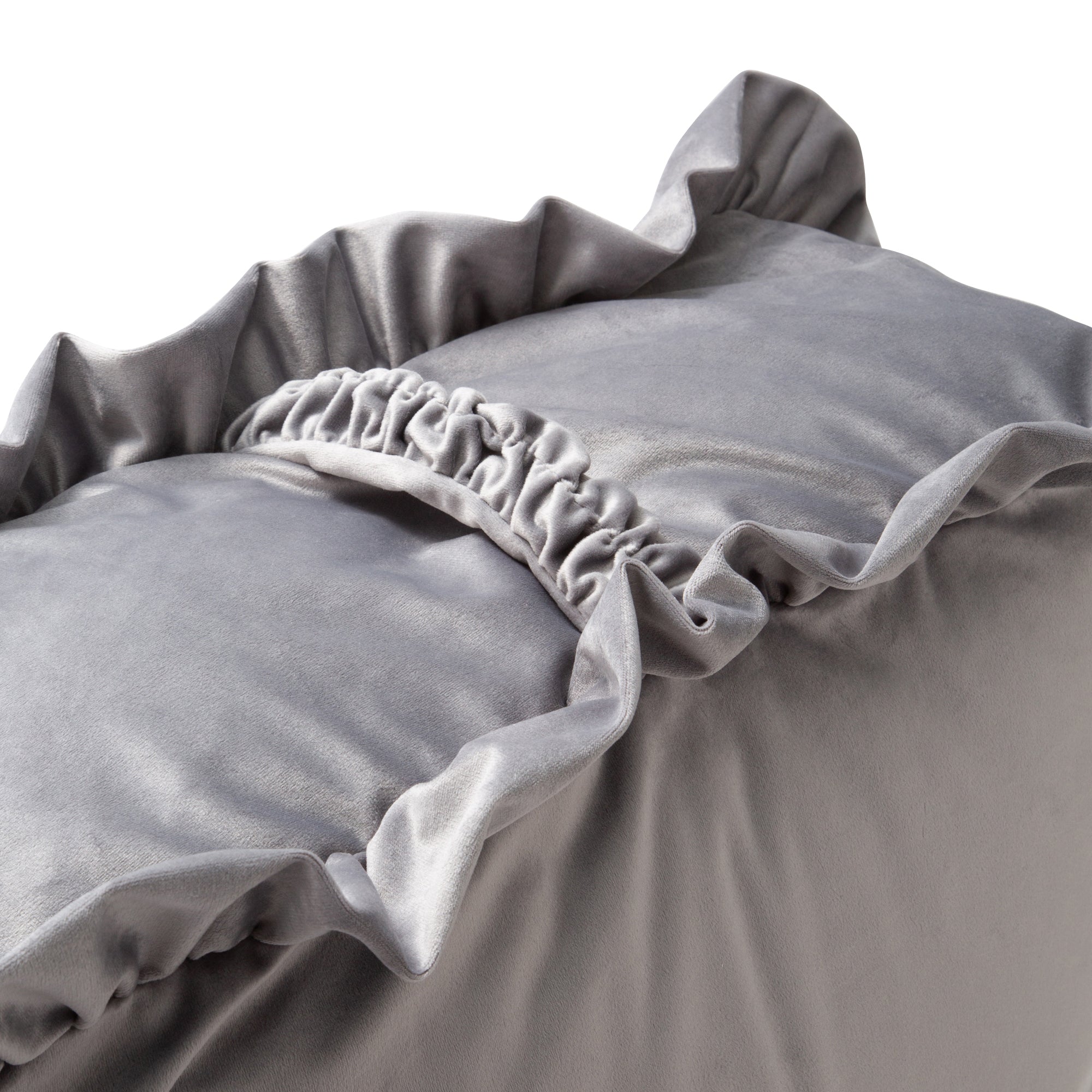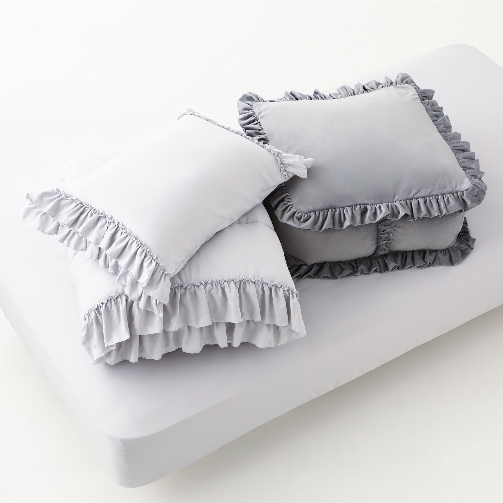 かんたん寝具セット フリル シングル グレー+クッションになるふとん収納ケース ライトグレー