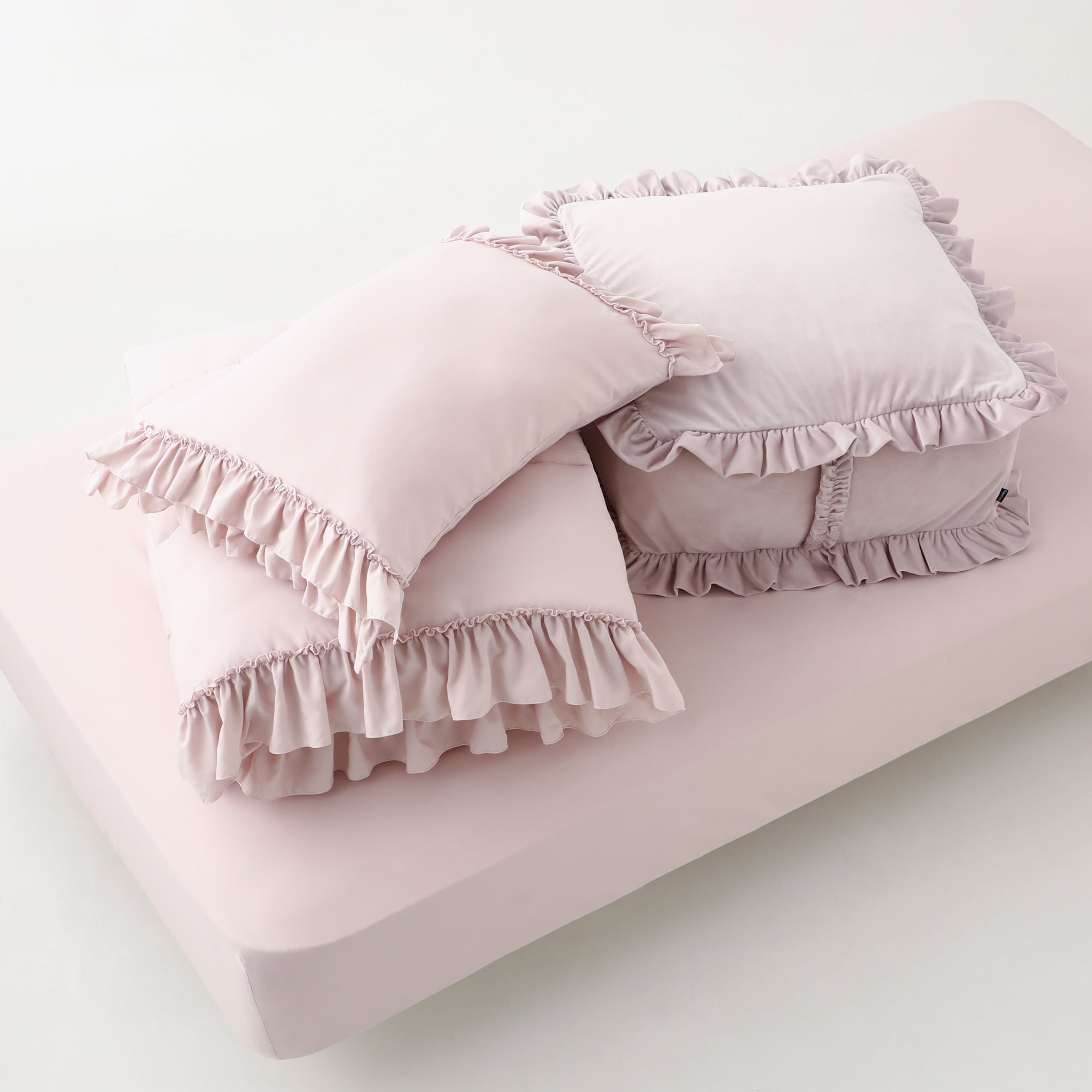 「かんたん寝具セット」と「クッションになるふとん収納ケース」のお得なセットです。※通常合計金額¥16,000→セット価格¥13,900で¥2,100お得!【寝具セット】すぐ使えてお手入れ簡単!寝具4点セットまくら・まくらカバー・掛け布団・ボックスシーツの寝具4点セットです。新生活に必要なアイテムがすべて揃ったスターターセットだから、箱から出したらすぐに使えます。ベッドルームは一日の1/3を過ごす大切な空間。気分の上がるベッドリネンをお手頃プライスで揃えて、気持ちよく新生活を始めましょう。【収納ケース】掛け布団やブランケットなどを収納し、クッションとしてご利用いただける収納ケースです。水洗い可能、持ち運びやすい持ち手付き、開閉しやすいダブルファスナーなど機能性に優れています。フリル&ベルベット生地の可愛らしいデザインで、"見せる収納"としてお部屋を彩ります。ローテーブルと合わせれば程よいフロアチェア代わりに。※中材のふとんは別売りです。※かんたん寝具セットとクッションになるふとん収納ケースの異なる組み合わせは単品販売をそれぞれご購入ください。