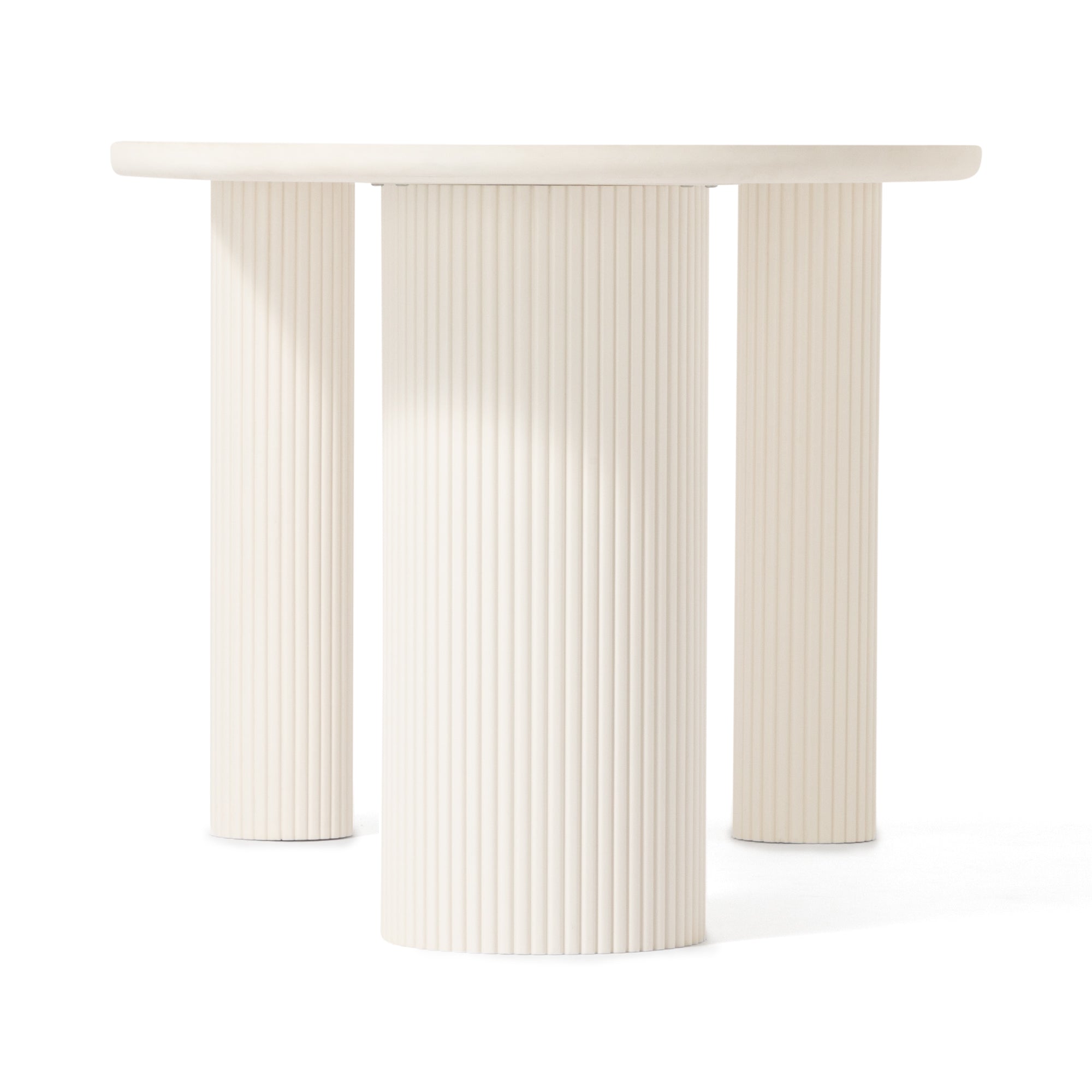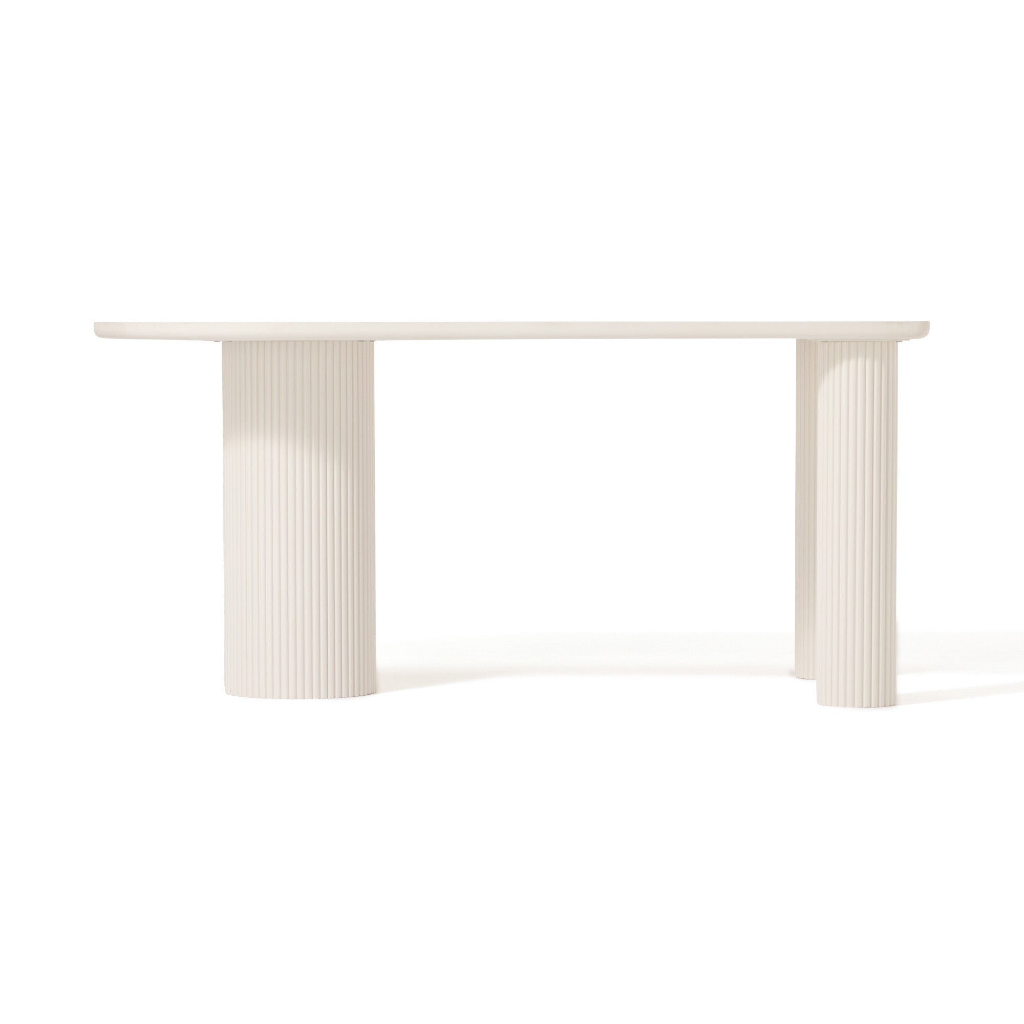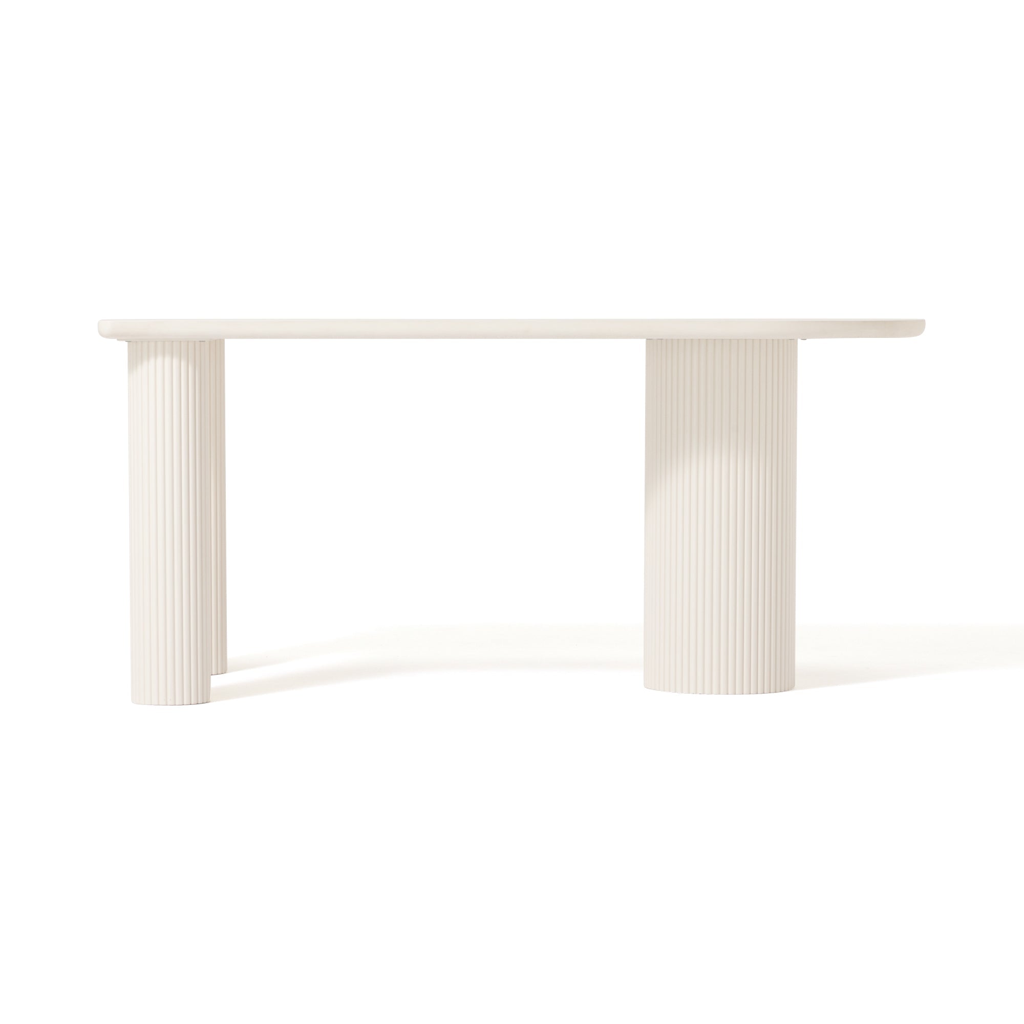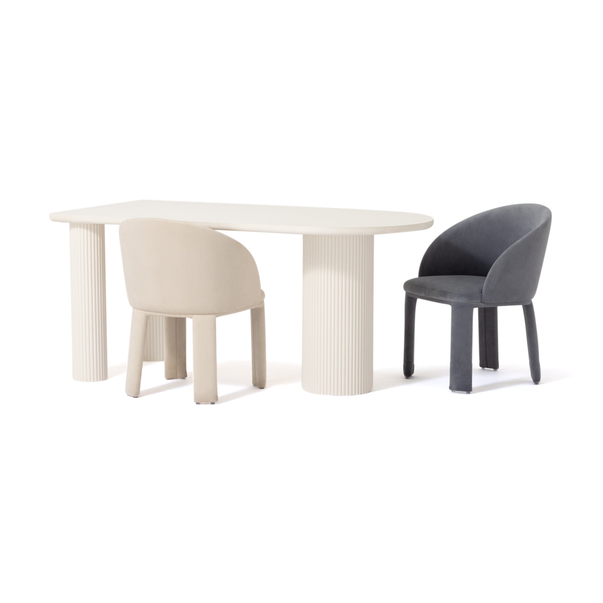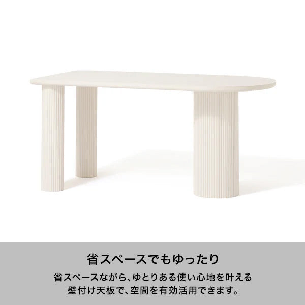 ペニンシュラ型(半島型)の天板と、太くどっしりとした円柱脚が印象的なダイニングテーブルです。マットな質感のホワイトで圧迫感がなく、壁付け仕様のオーバル型は省スペースながらゆとりあるダイニングシーンが叶います。幅160cmサイズは一般的に4名掛けですが、様々な椅子の配置、囲み方ができるので最大6名まで着席が可能。支柱から天板端まで距離を確保しているから、膝が当たらず座りやすい設計です。角に丸みを持たせているのでお子様やペットがいるご家庭でも安心してお使いいただけます。丸みをもたせた柔らかい形状とみんなで食卓を囲える(包める)イメージから、英語で「パルム(PALM)」=手のひら、と名付けました。