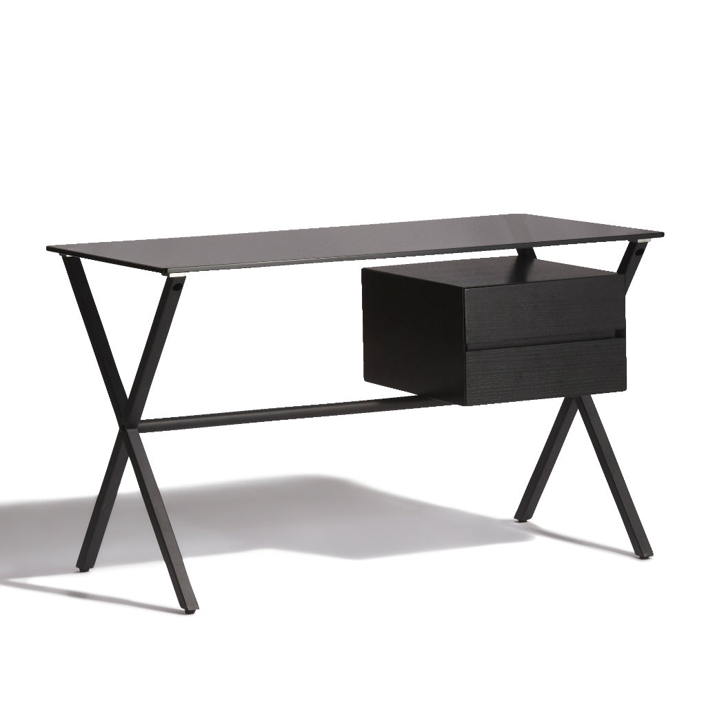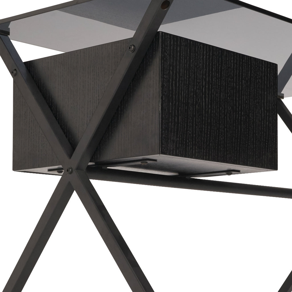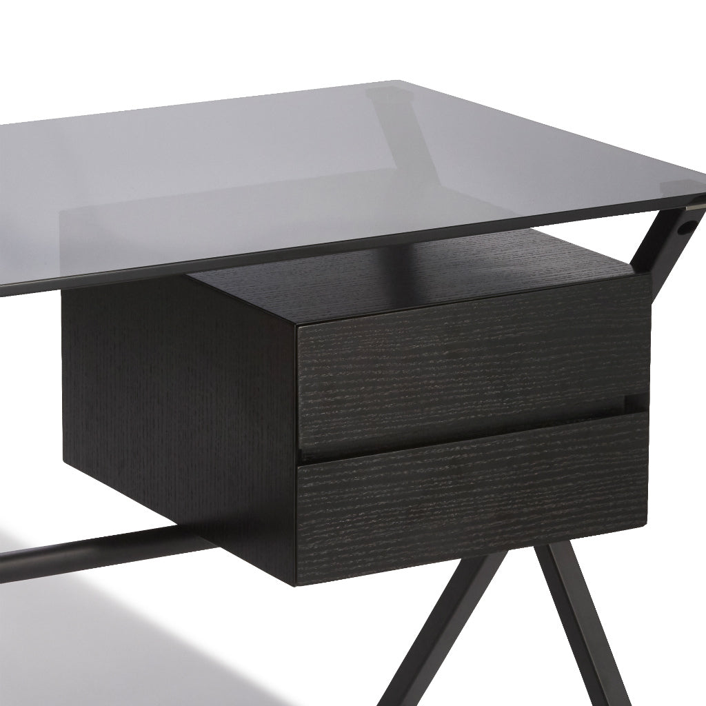 ドロワー付きのシックなデスクブラックの強化ガラス天板と艶消しフレームが落ち着きのある印象のデスクです。引出しはブラックとブラウンの2色をお選びいただけます。