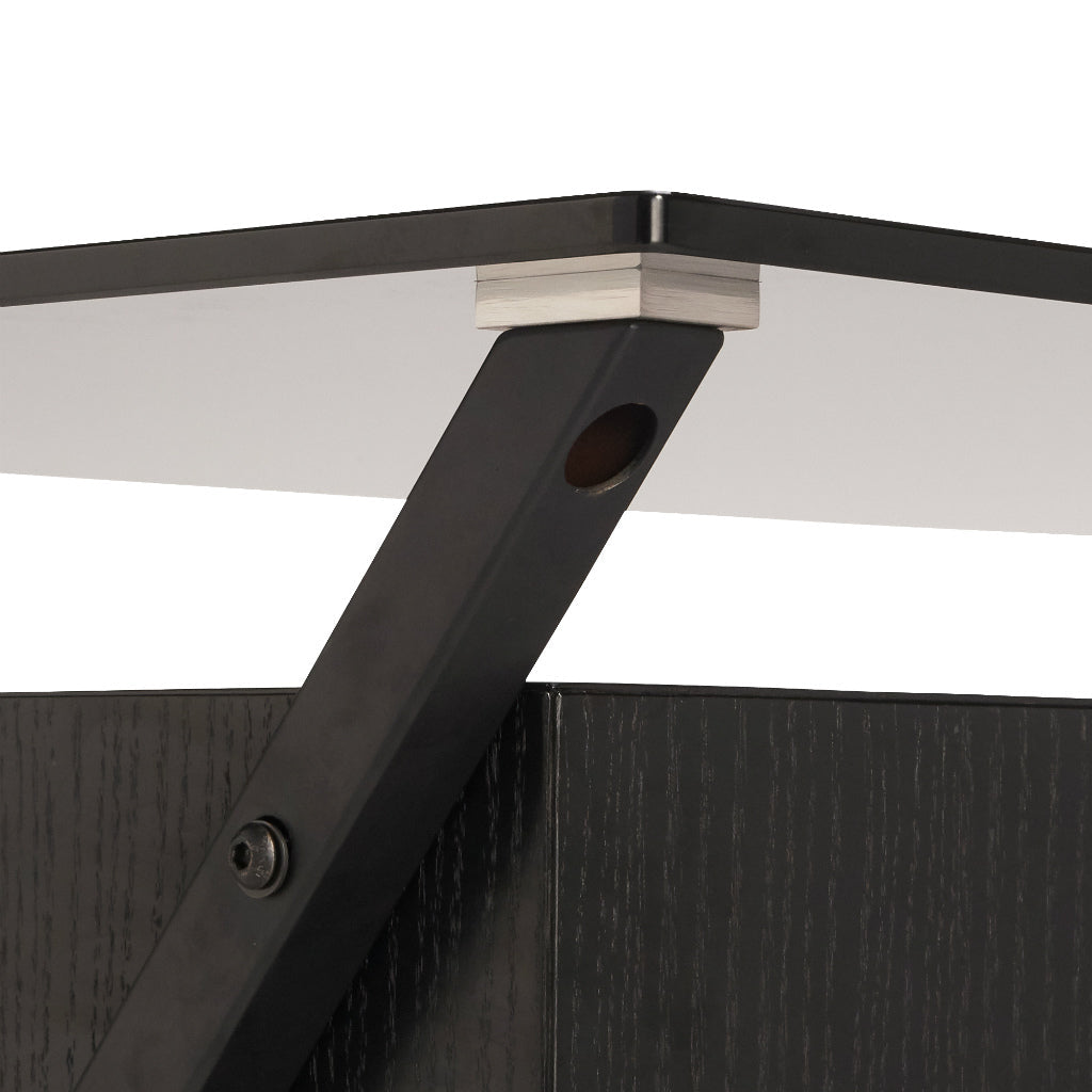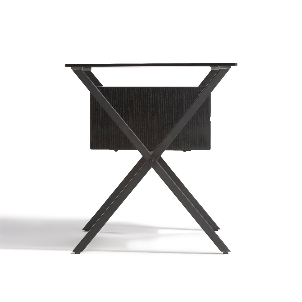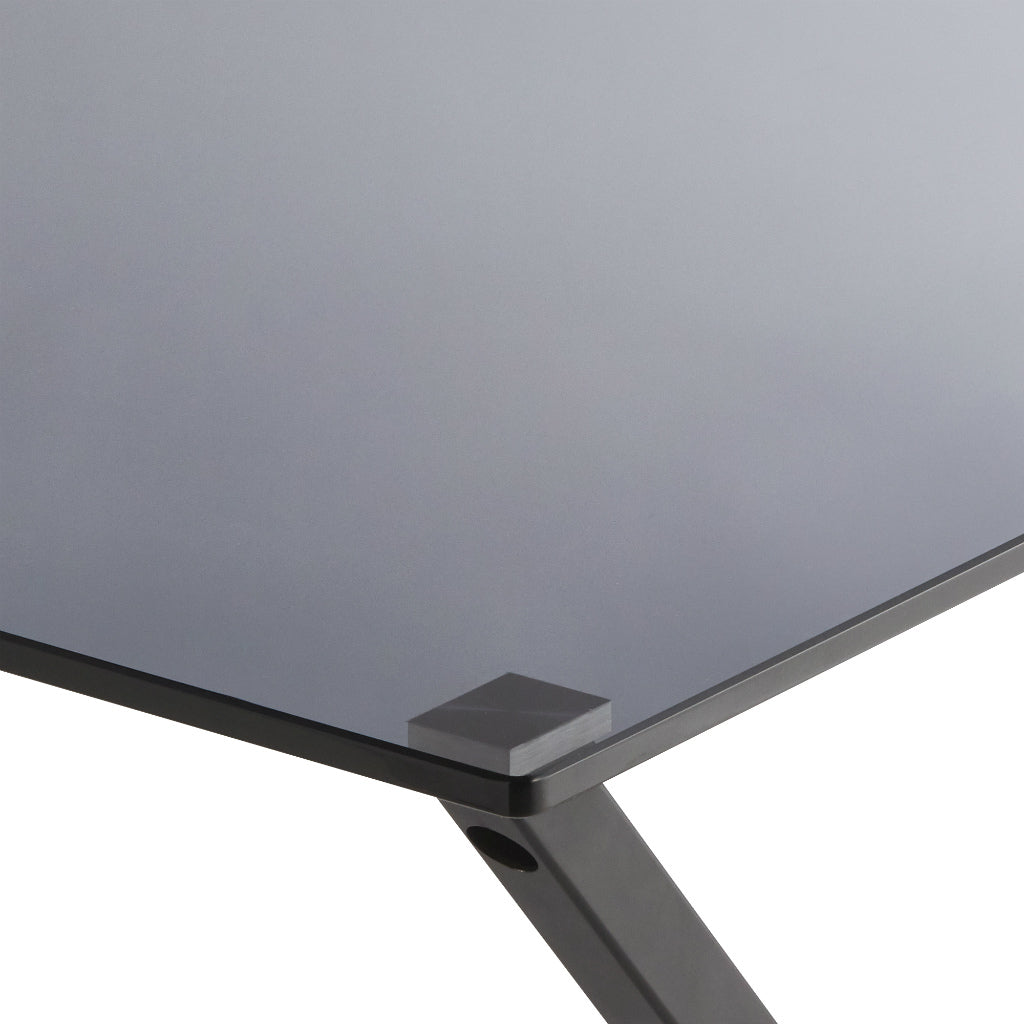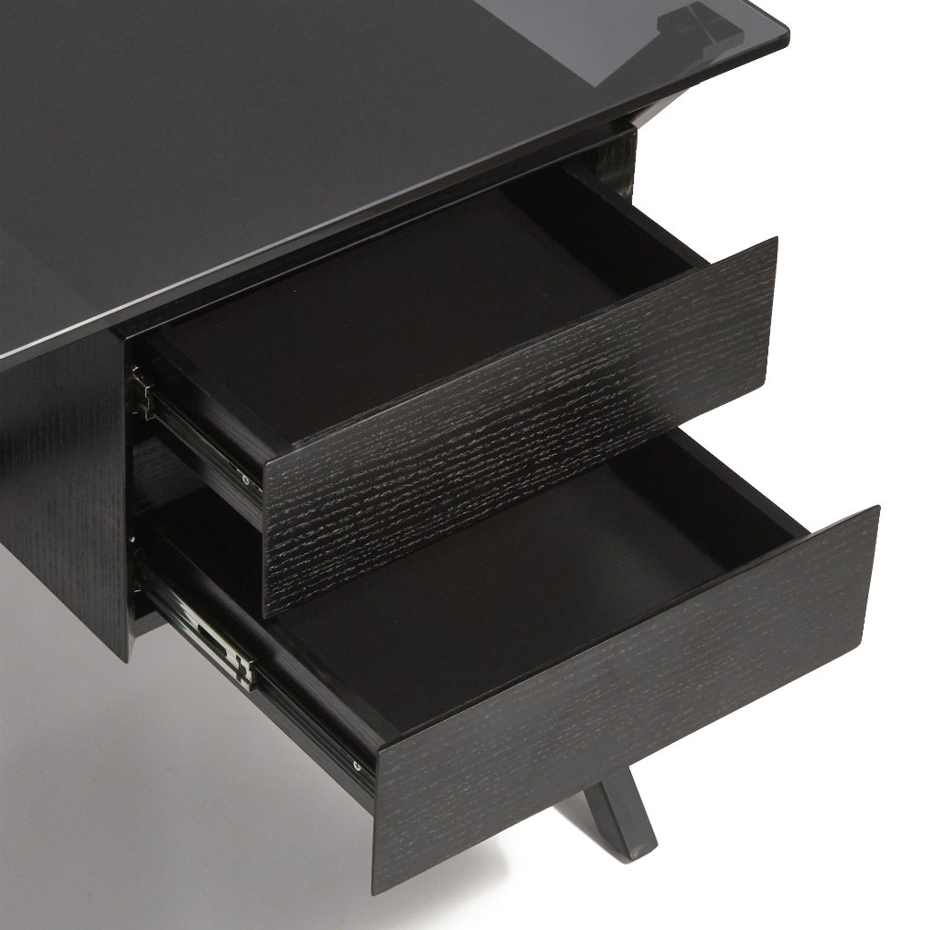 ドロワー付きのシックなデスクブラックの強化ガラス天板と艶消しフレームが落ち着きのある印象のデスクです。引出しはブラックとブラウンの2色をお選びいただけます。