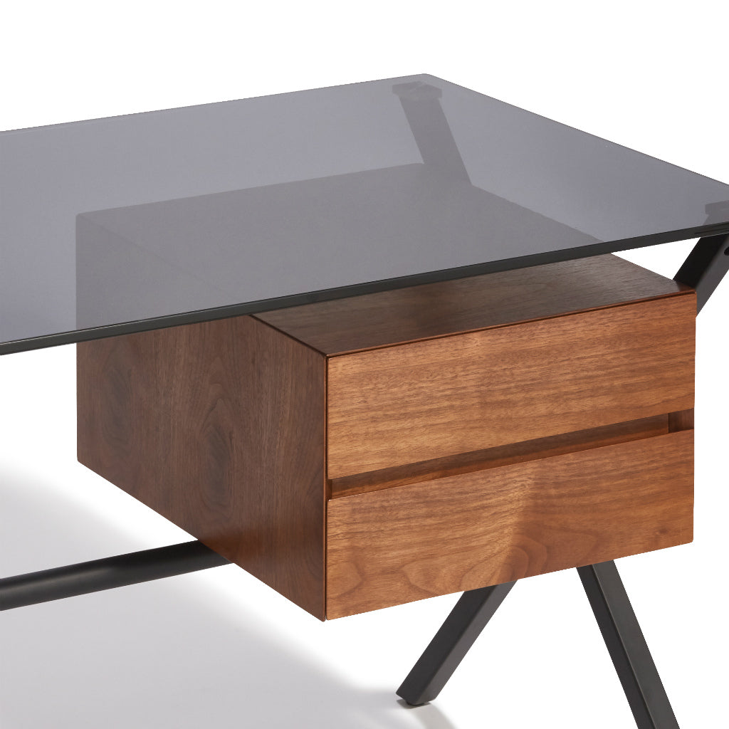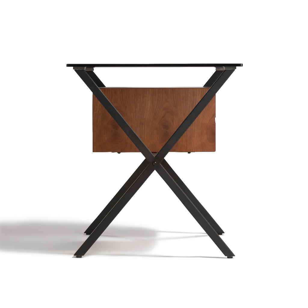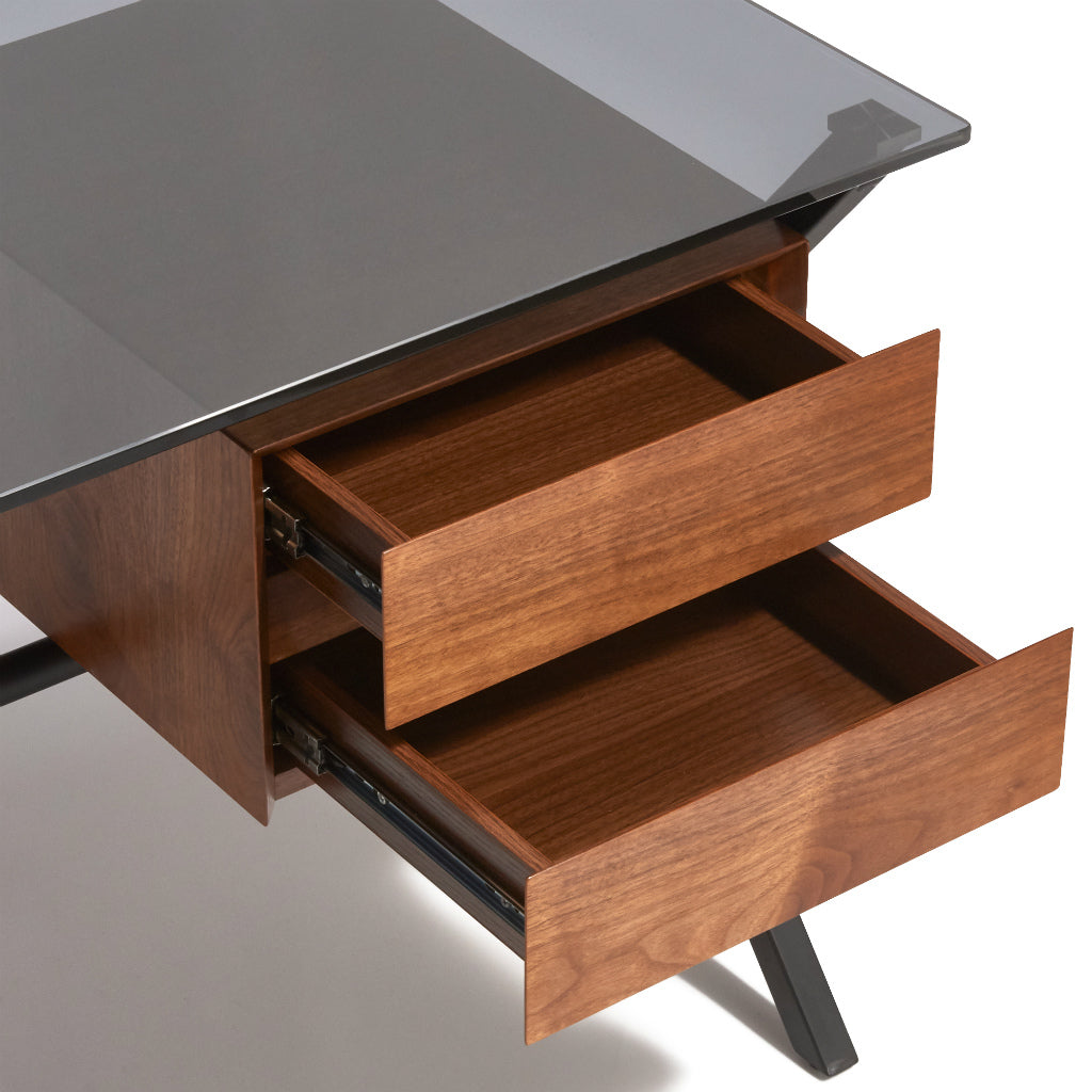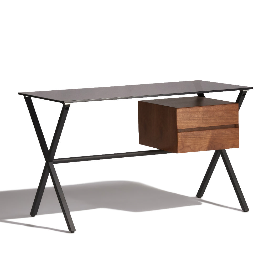 ドロワー付きのシックなデスクブラックの強化ガラス天板と艶消しフレームが落ち着きのある印象のデスクです。引出しはブラックとブラウンの2色をお選びいただけます。