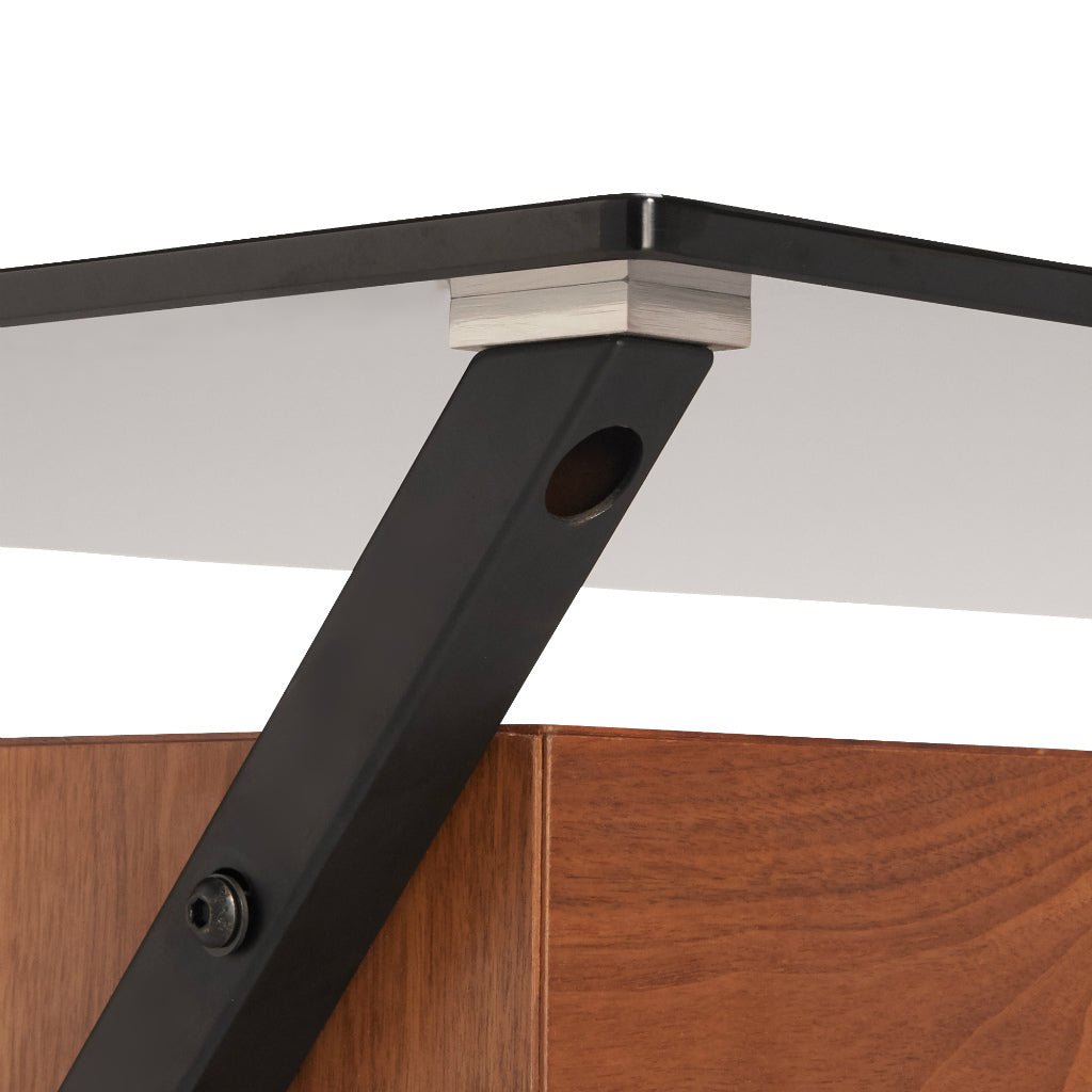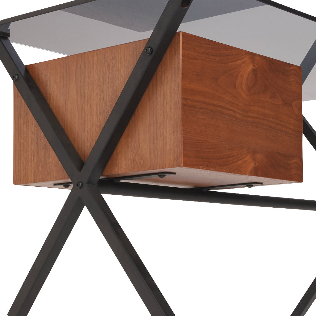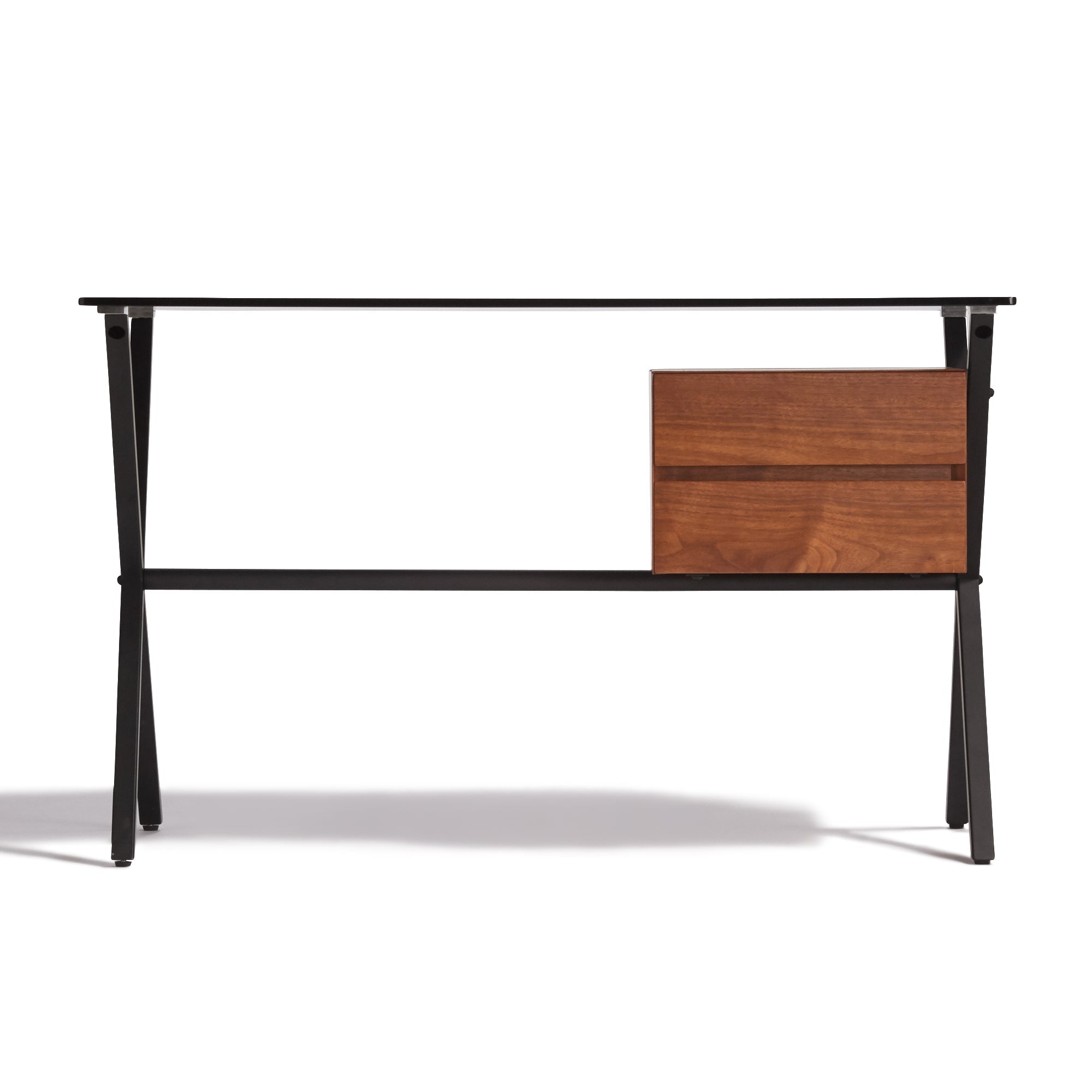 ドロワー付きのシックなデスクブラックの強化ガラス天板と艶消しフレームが落ち着きのある印象のデスクです。引出しはブラックとブラウンの2色をお選びいただけます。