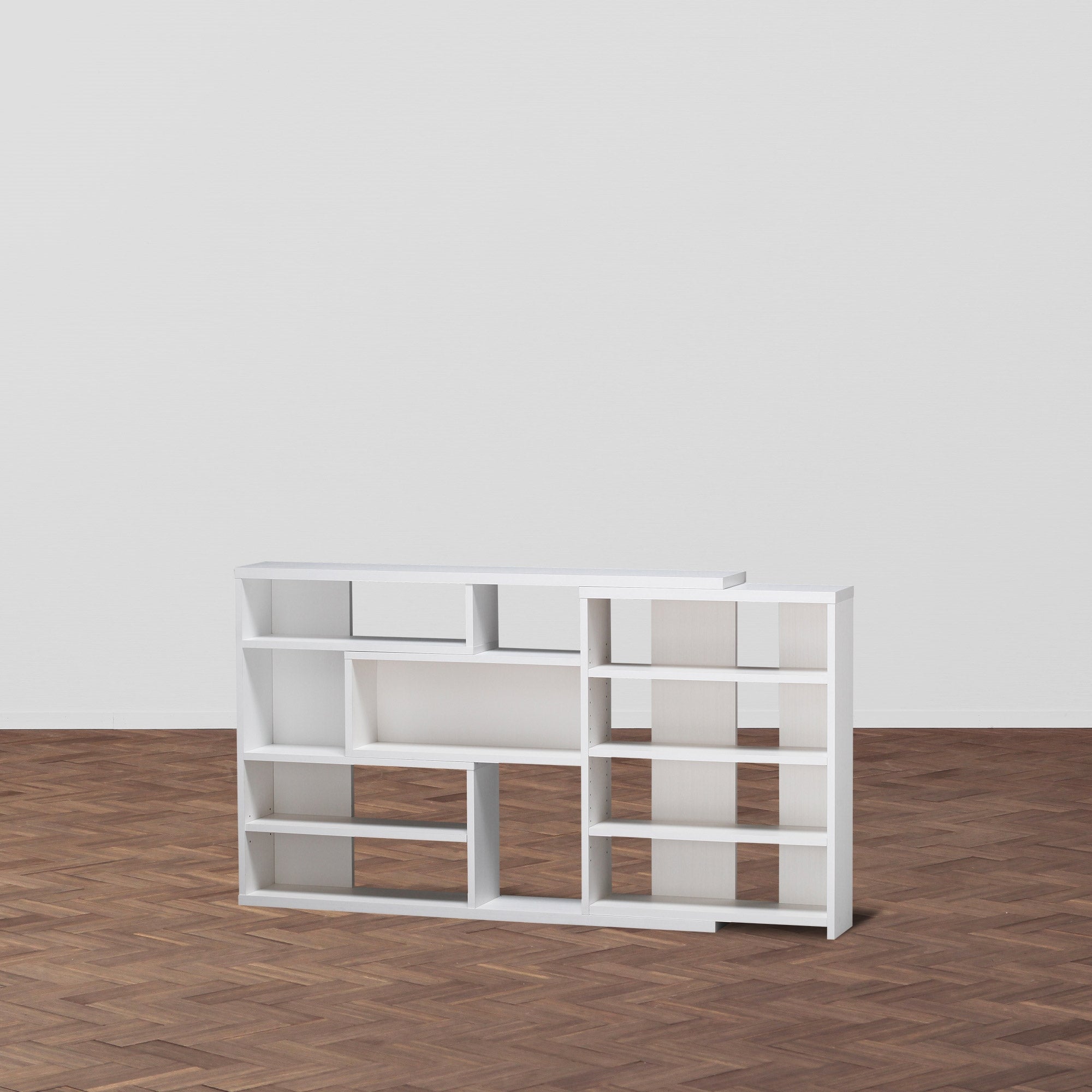 洗練された印象のある伸縮シェルフです。 様々なサイズの棚を複雑に組み合わせた収納スペースは、文庫本など書籍を収納するだけでなく、雑貨やグリーンをコーディネートしながら、飾り棚としてのご使用もオススメです。 横幅1180~1550mmまで調整でき、お好みのサイズで設置可能です。