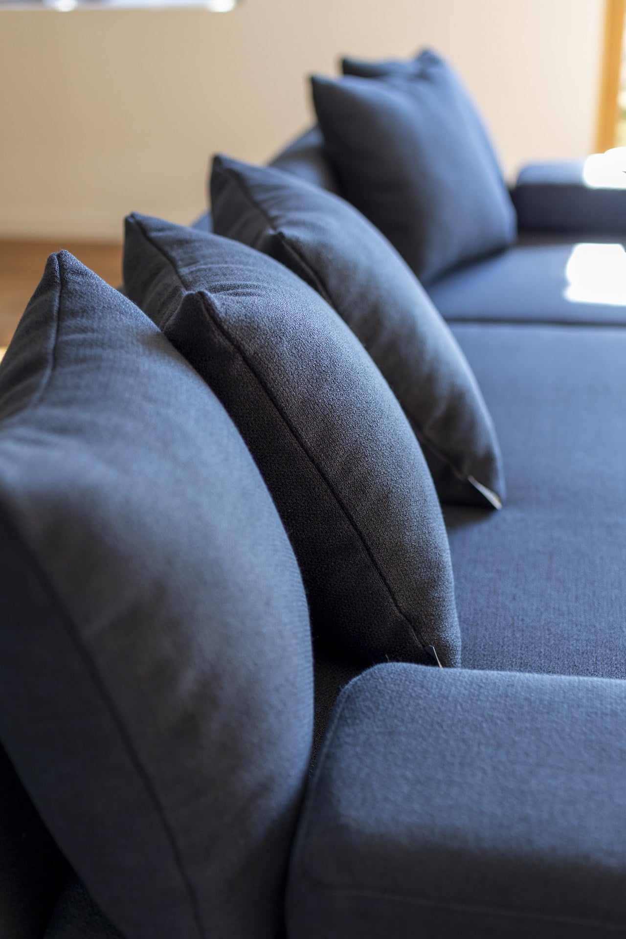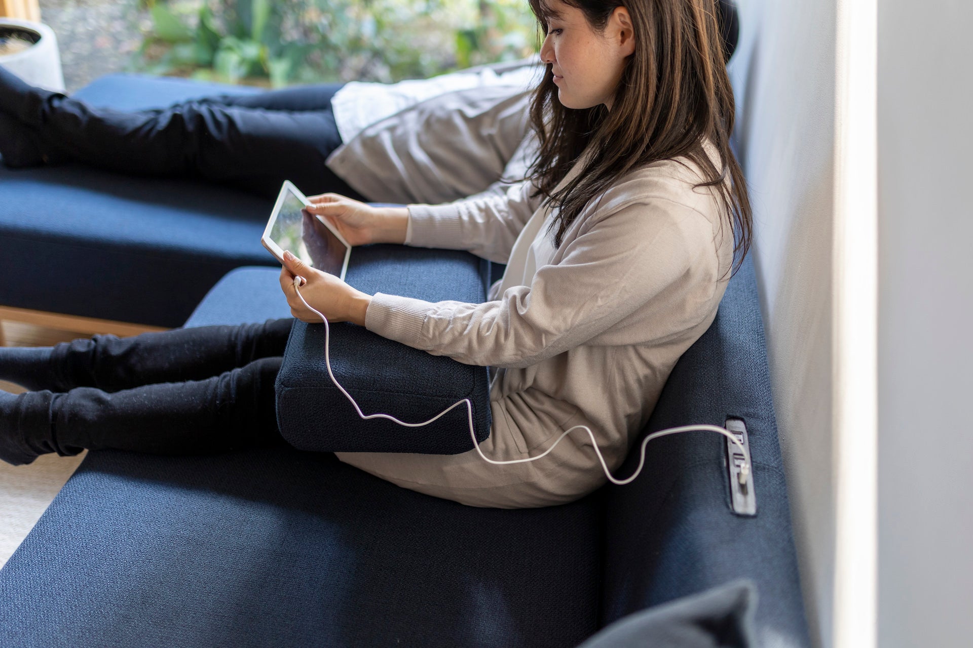 季節やお部屋のコーディネートに合わせてクッションカバーを替えて楽しめるペットの爪に強い生地を使用したソファです。3個のクッションがついています。自由に配置ができる肘クッションを膝の上に置き、スマホ鑑賞時に疲れる腕の支えにもなります。ソファの背部分にはUSBポートとコンセントが内蔵されており、ソファでスマホを充電しながら寛げます。各パーツのカバーは洗って衛生的に使用できます。