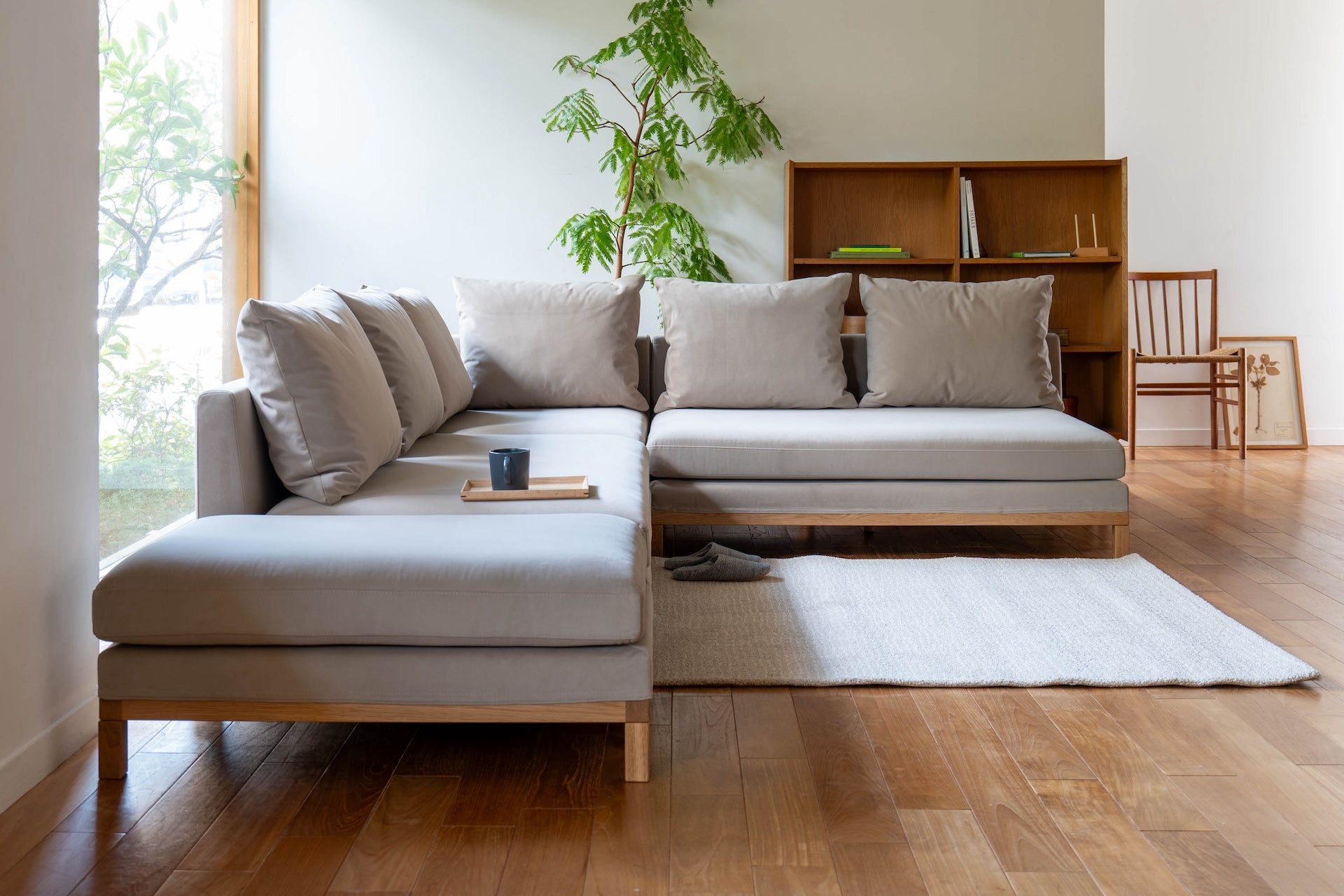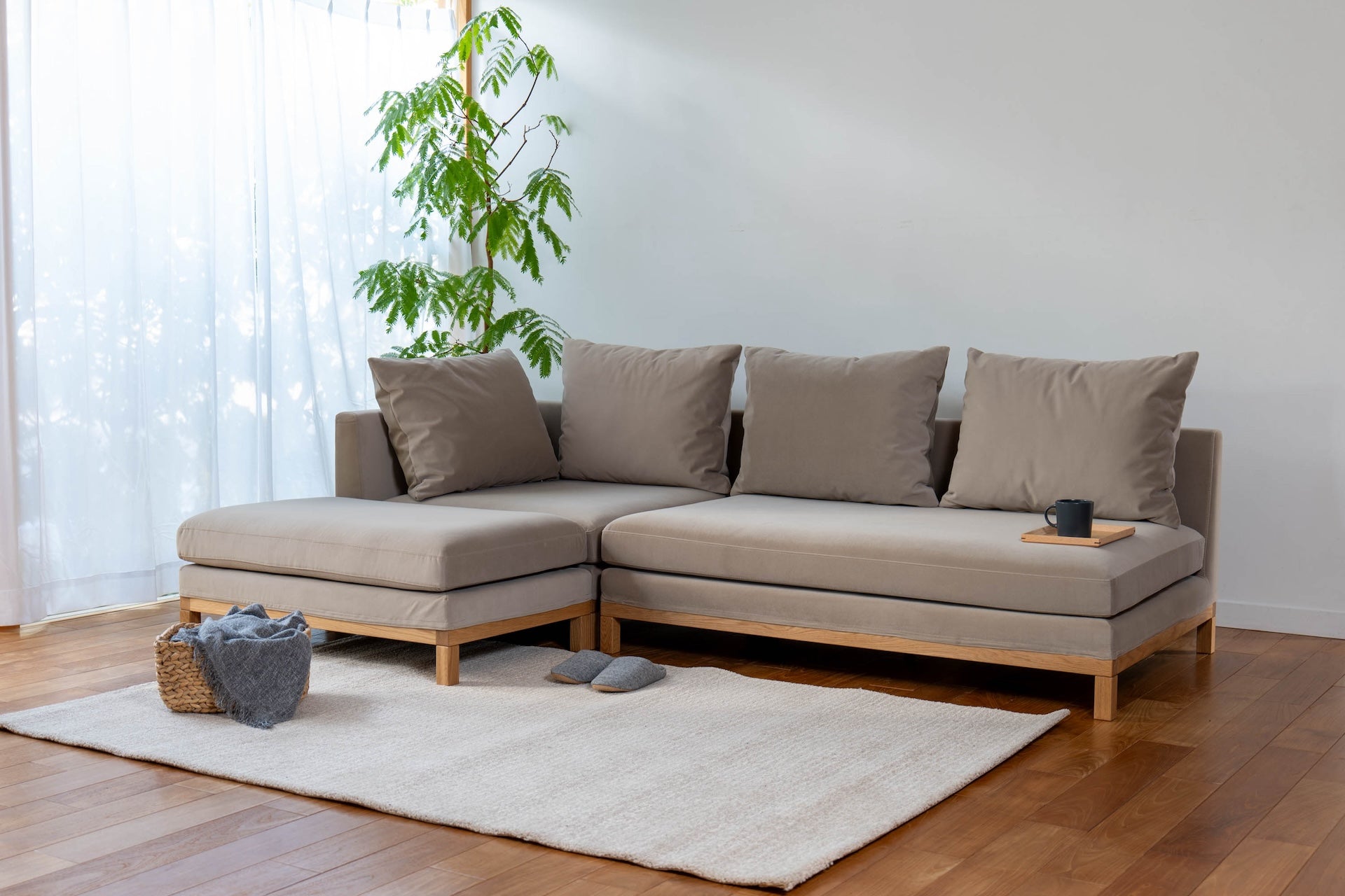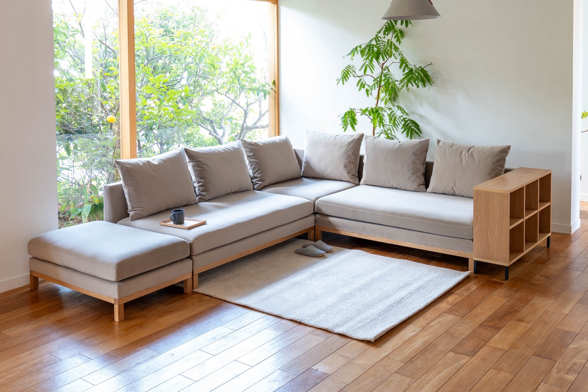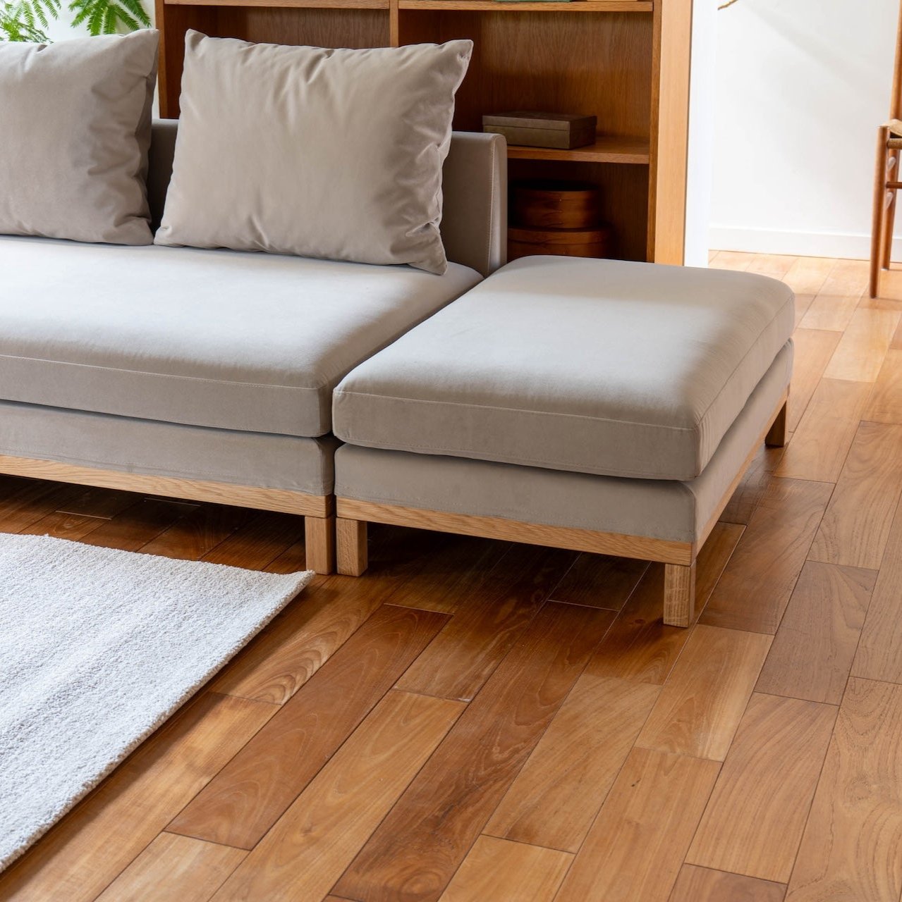 ワイド、コーナー、スツール、棚の各パーツを組み合あせることで、ライフスタイルに合わせた組み合わせができるペットの爪に強い生地を使用したスツールです。後で必要なパーツがあれば買い足しも可能です。リビングに調和した収納スペースがソファ近くにあることで、片付けもしやすく、リビングをきれいに保つことができます。