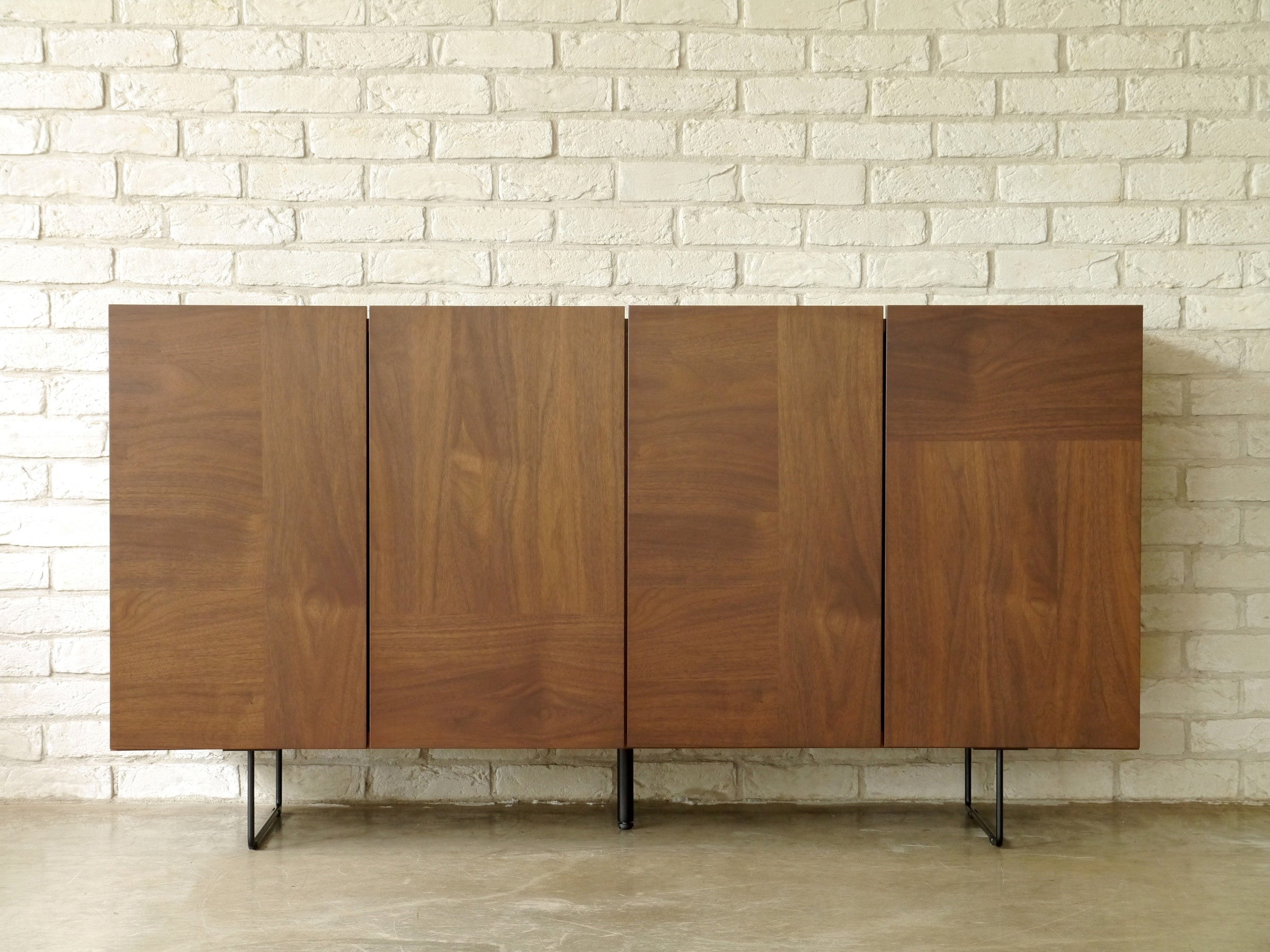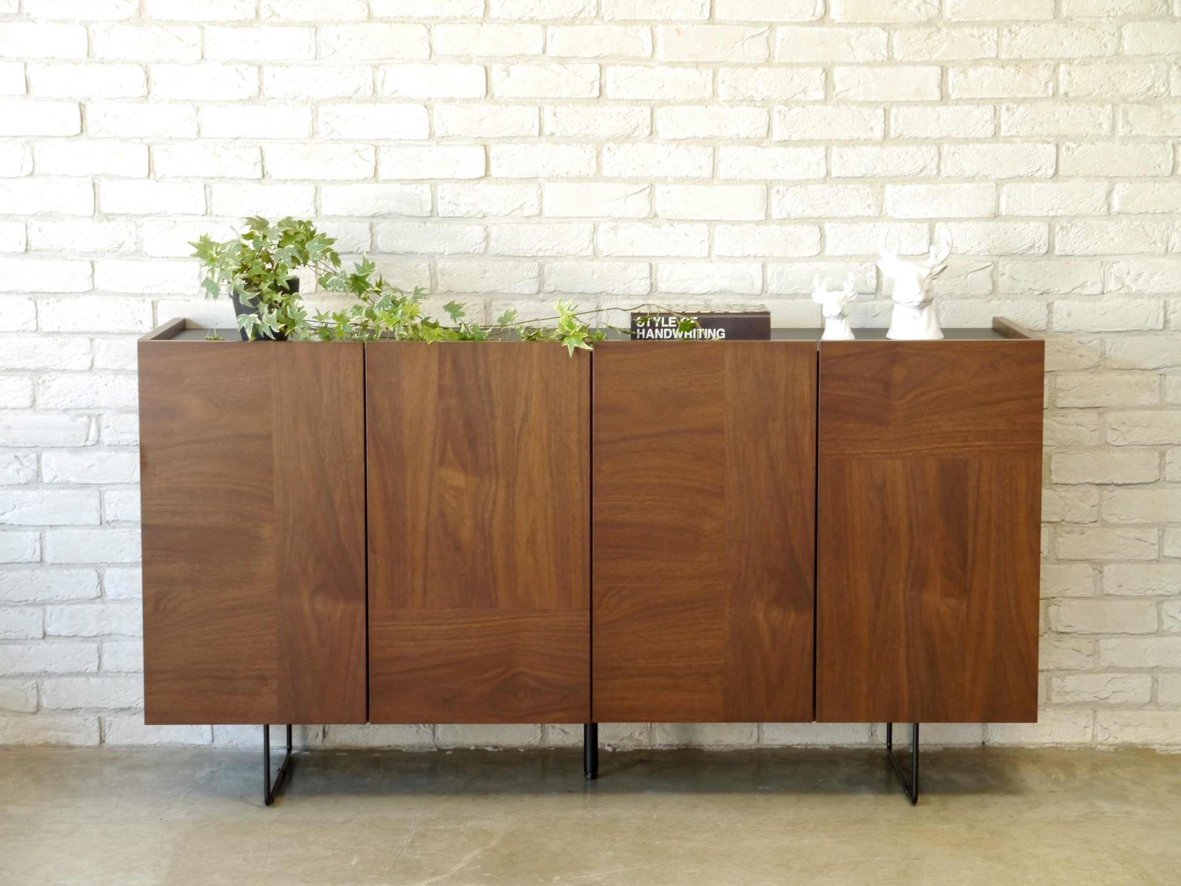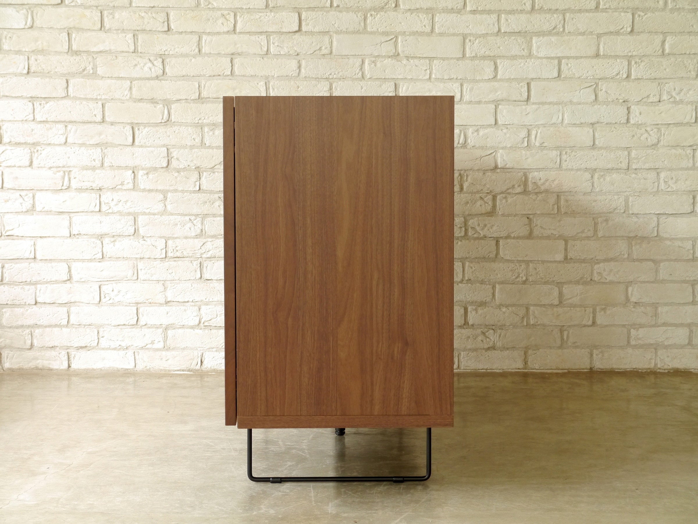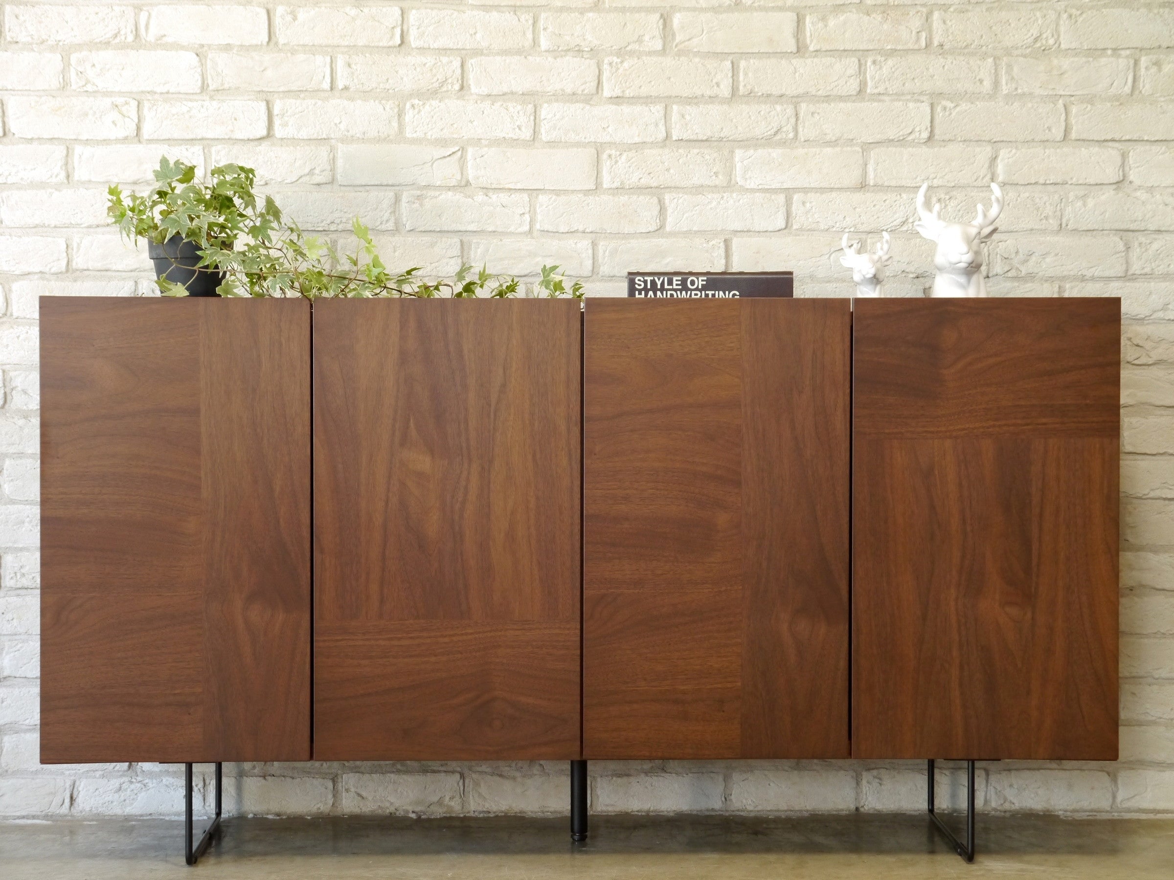 スクエアなフォルムにスリムなスチール脚、前板のウォールナットツキ板の貼り分け加工がアクセントとなった繊細でありながら高級感のあるサイドボードです。