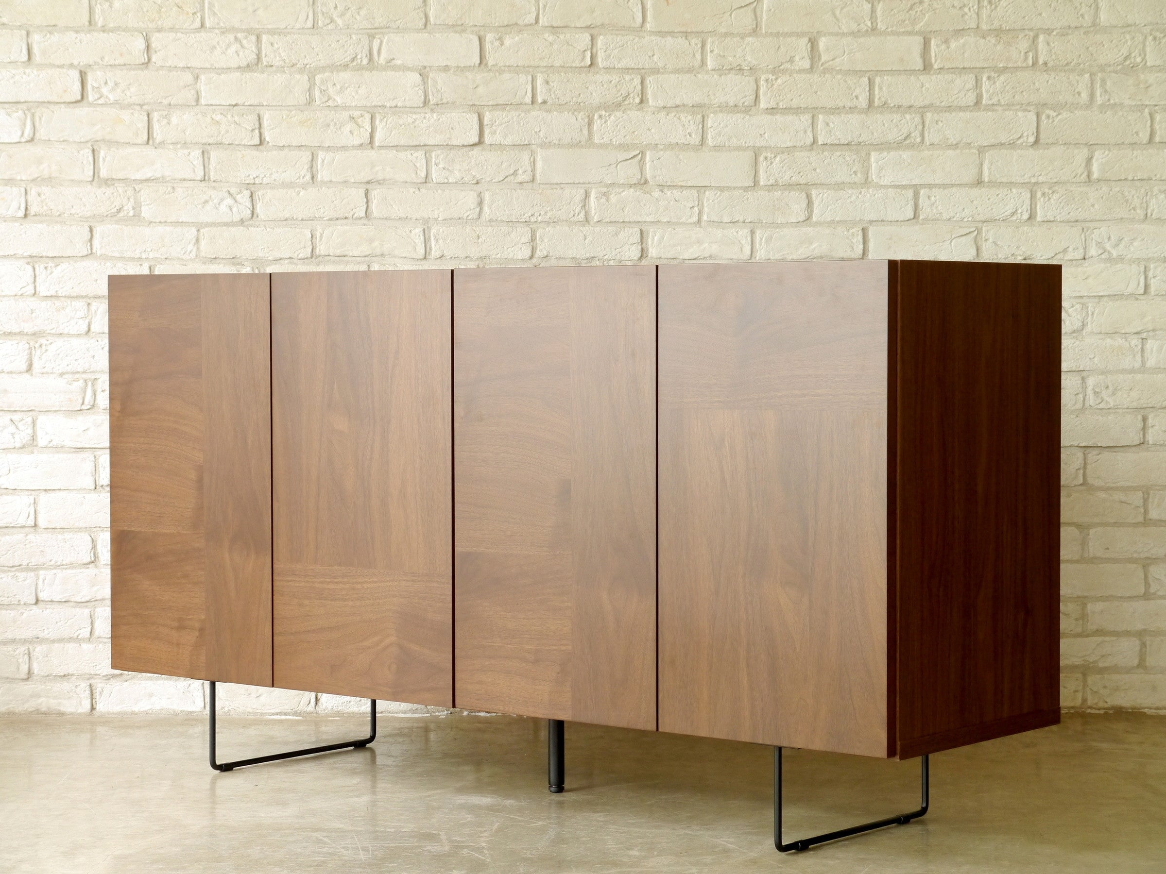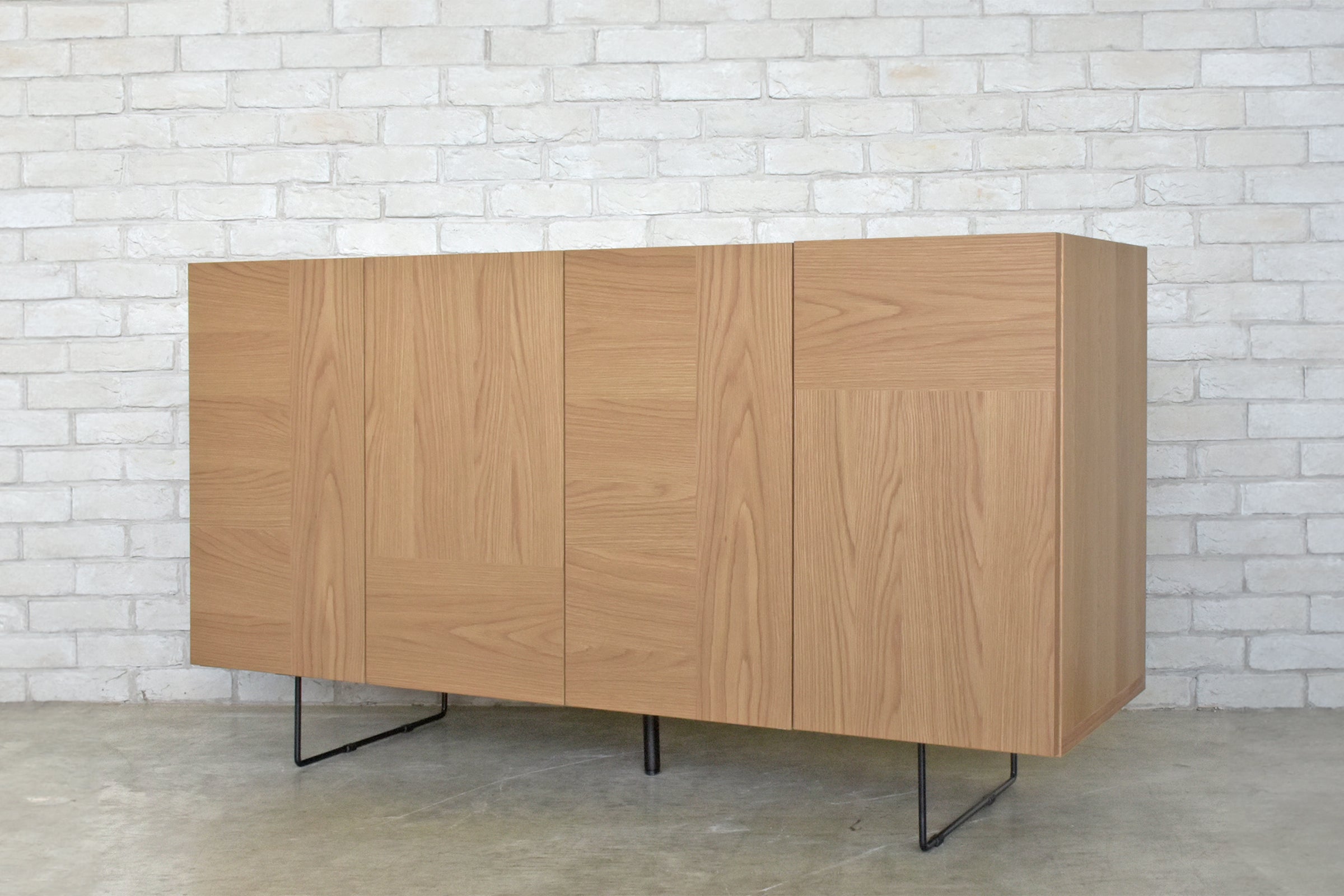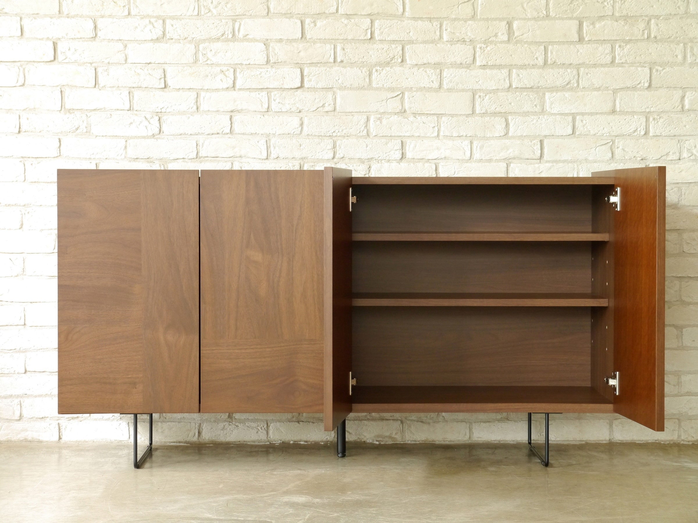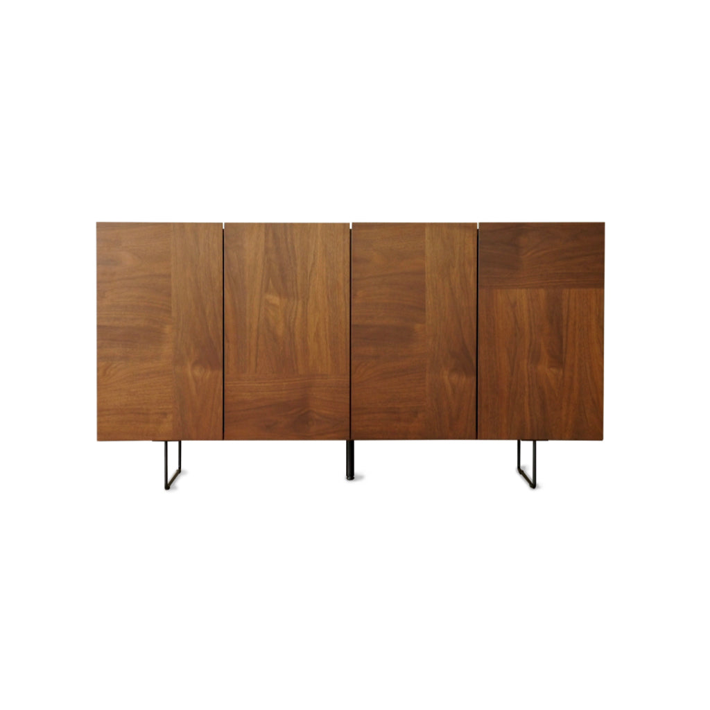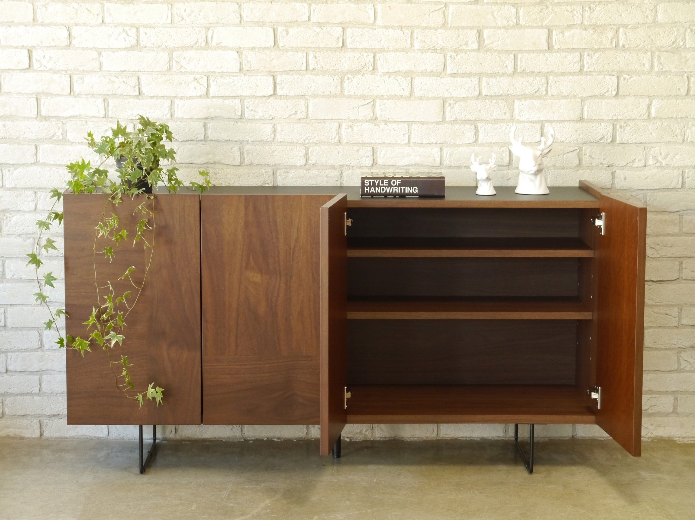 スクエアなフォルムにスリムなスチール脚、前板のウォールナットツキ板の貼り分け加工がアクセントとなった繊細でありながら高級感のあるサイドボードです。