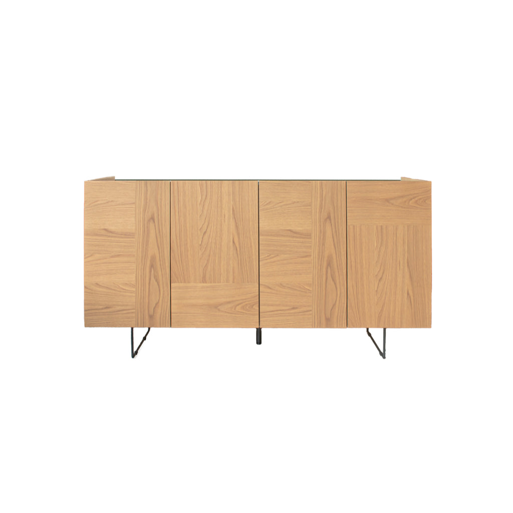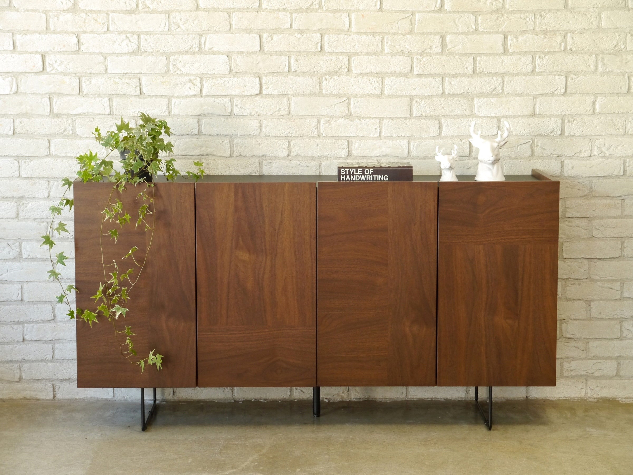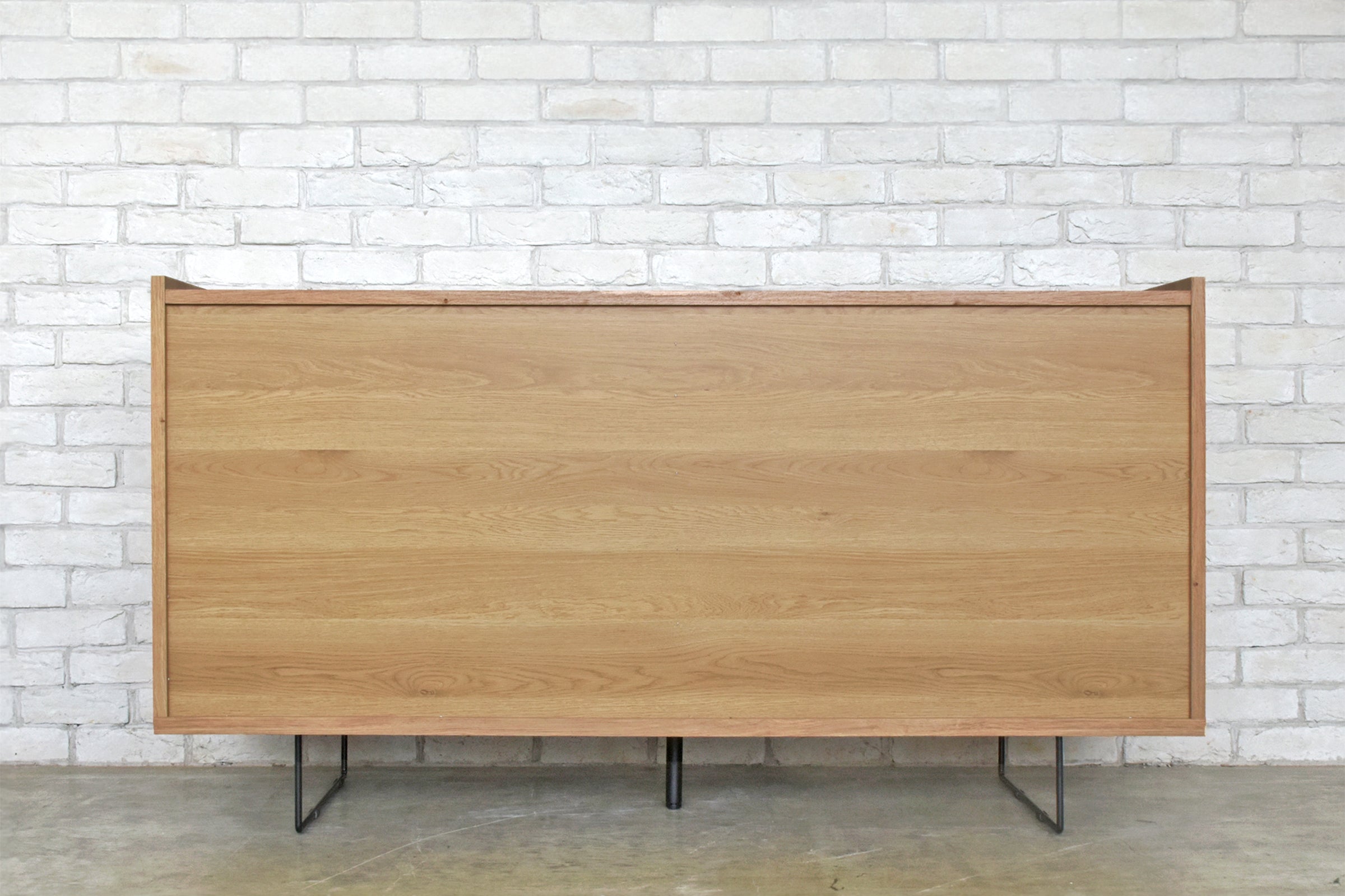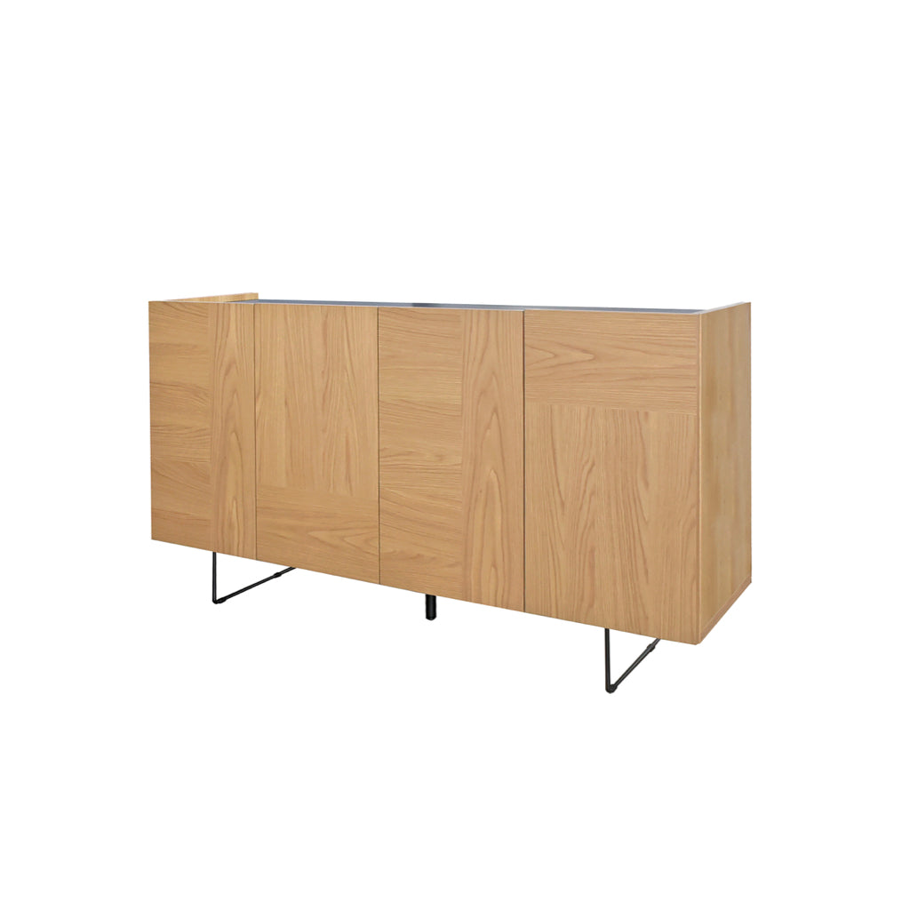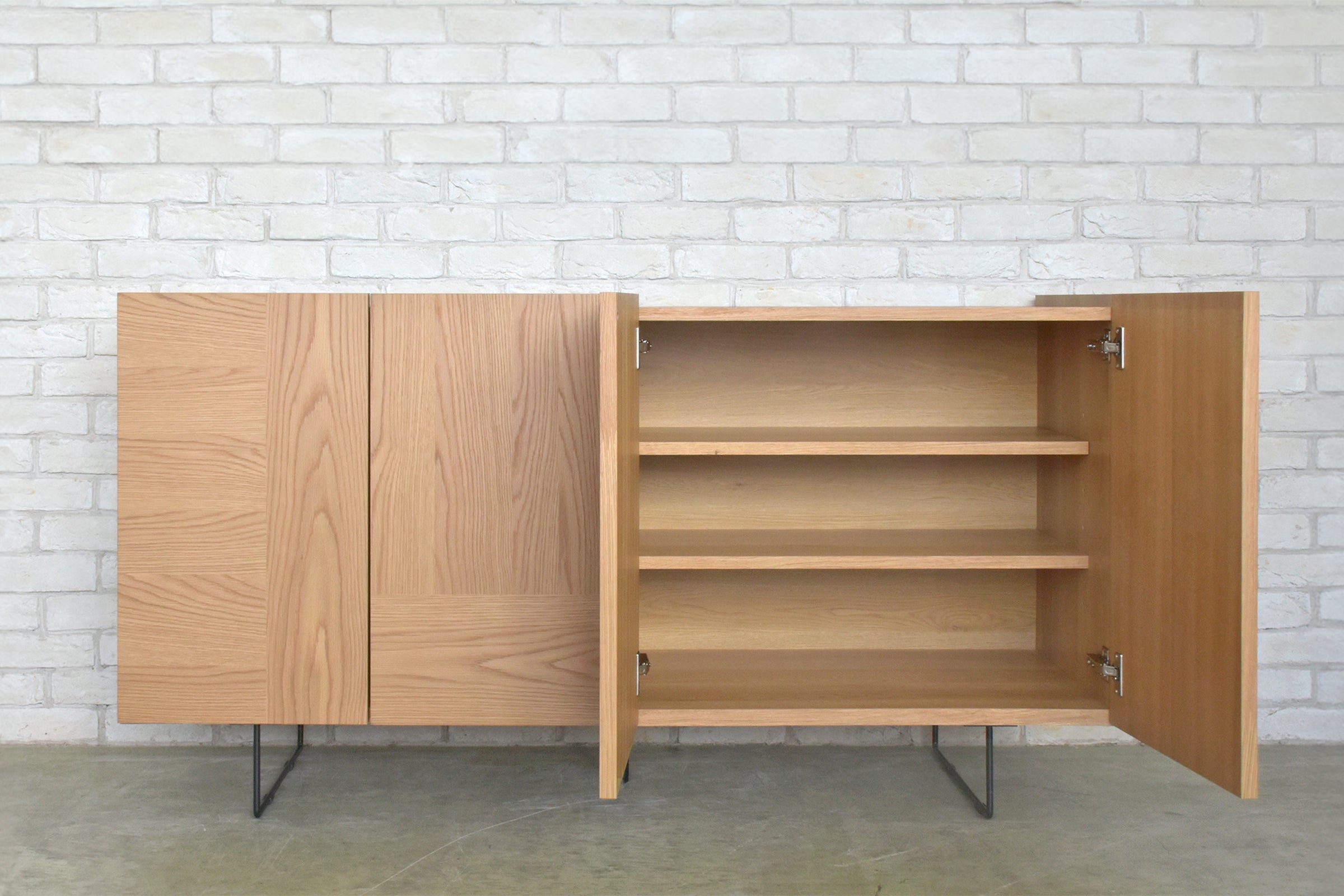 スクエアなフォルムにスリムなスチール脚、前板のウォールナットツキ板の貼り分け加工がアクセントとなった繊細でありながら高級感のあるサイドボードです。