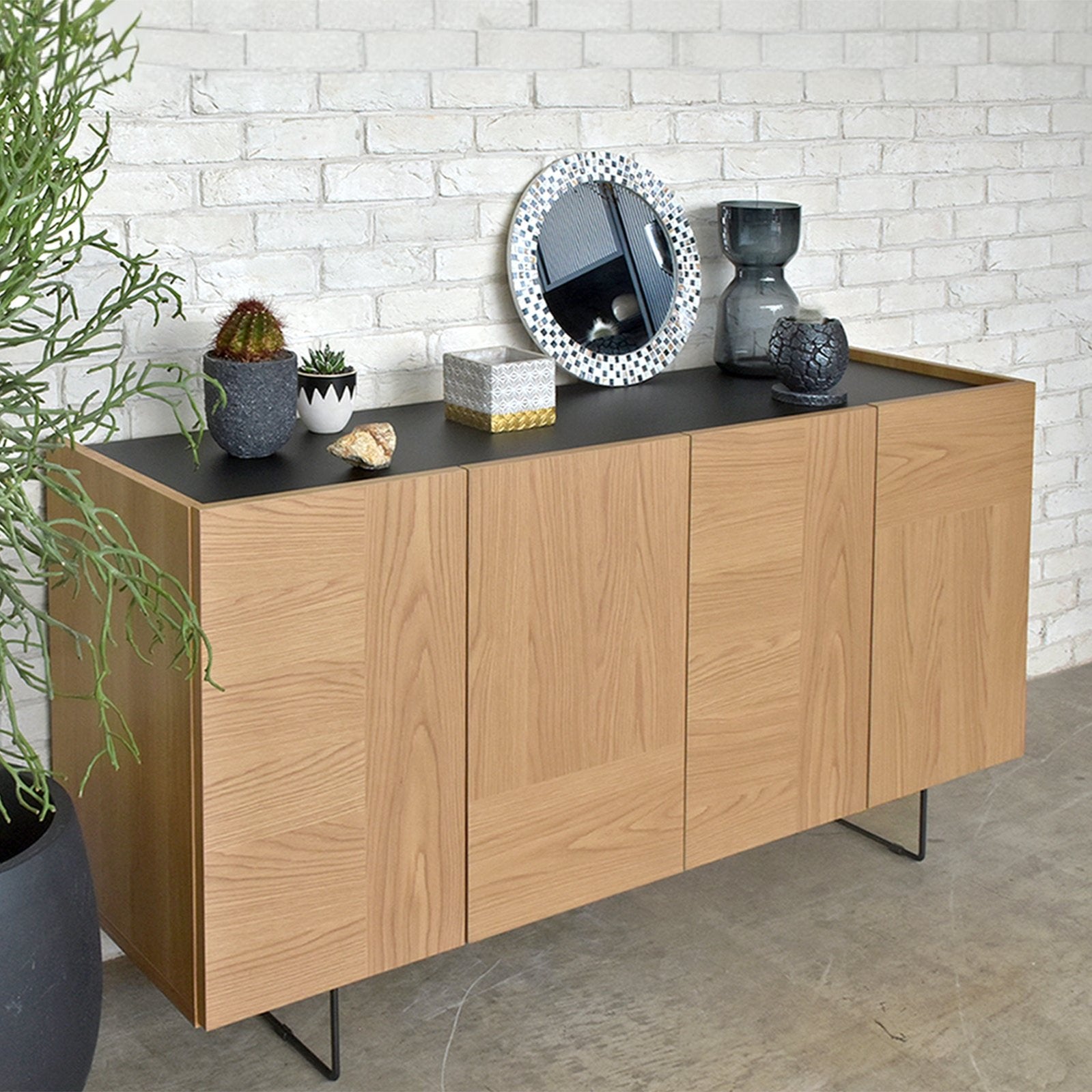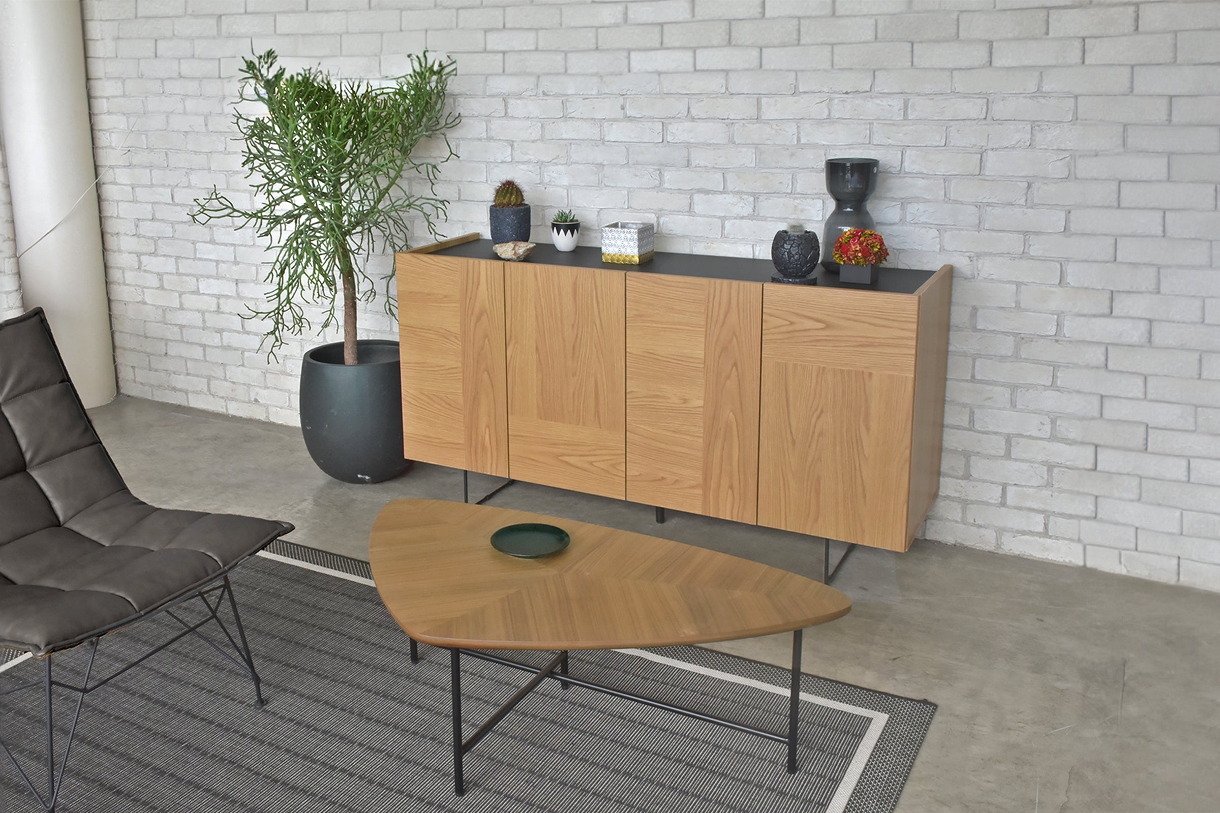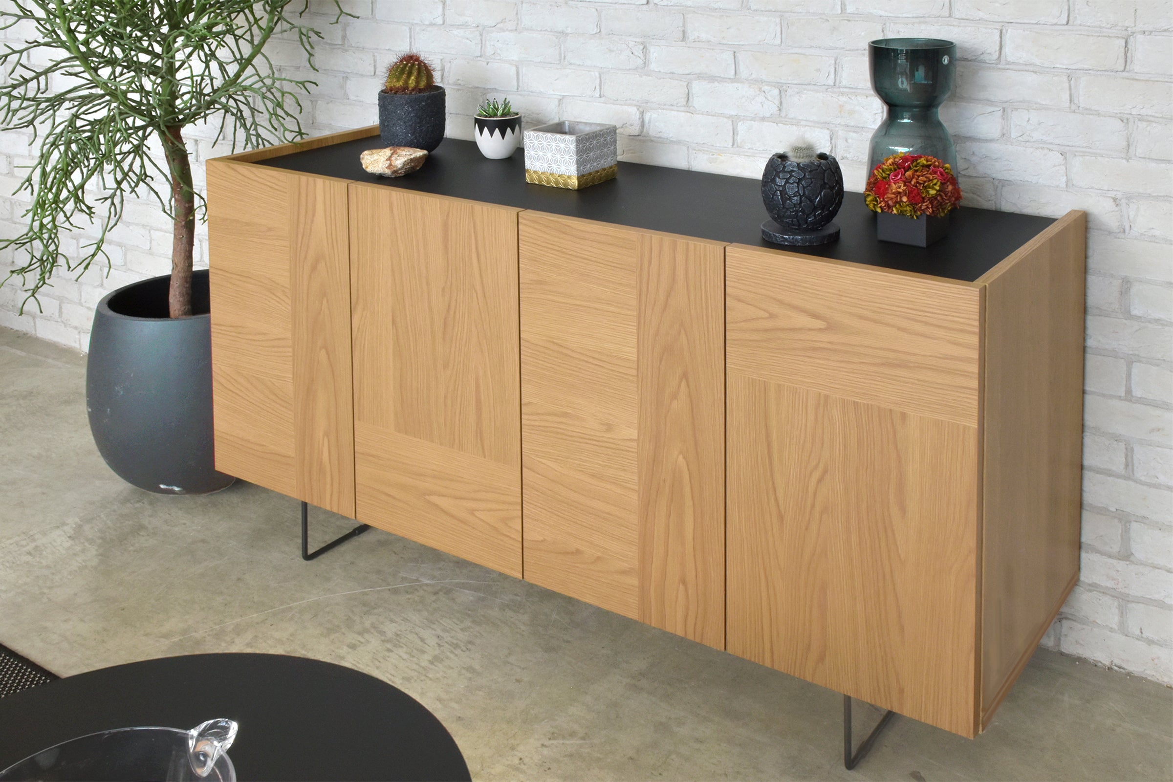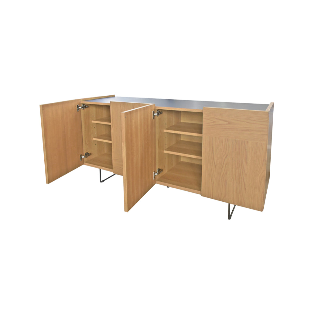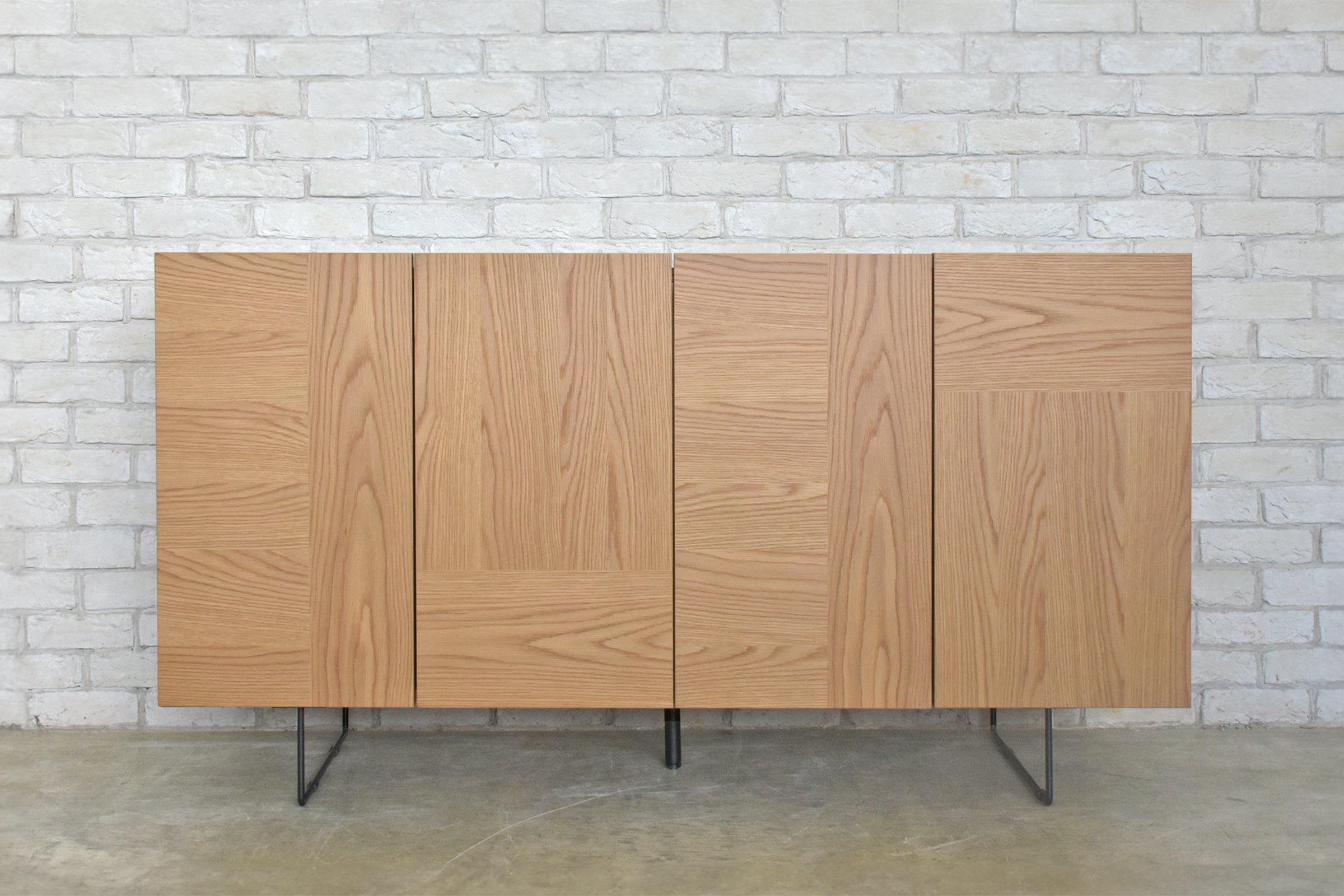 スクエアなフォルムにスリムなスチール脚、前板のウォールナットツキ板の貼り分け加工がアクセントとなった繊細でありながら高級感のあるサイドボードです。