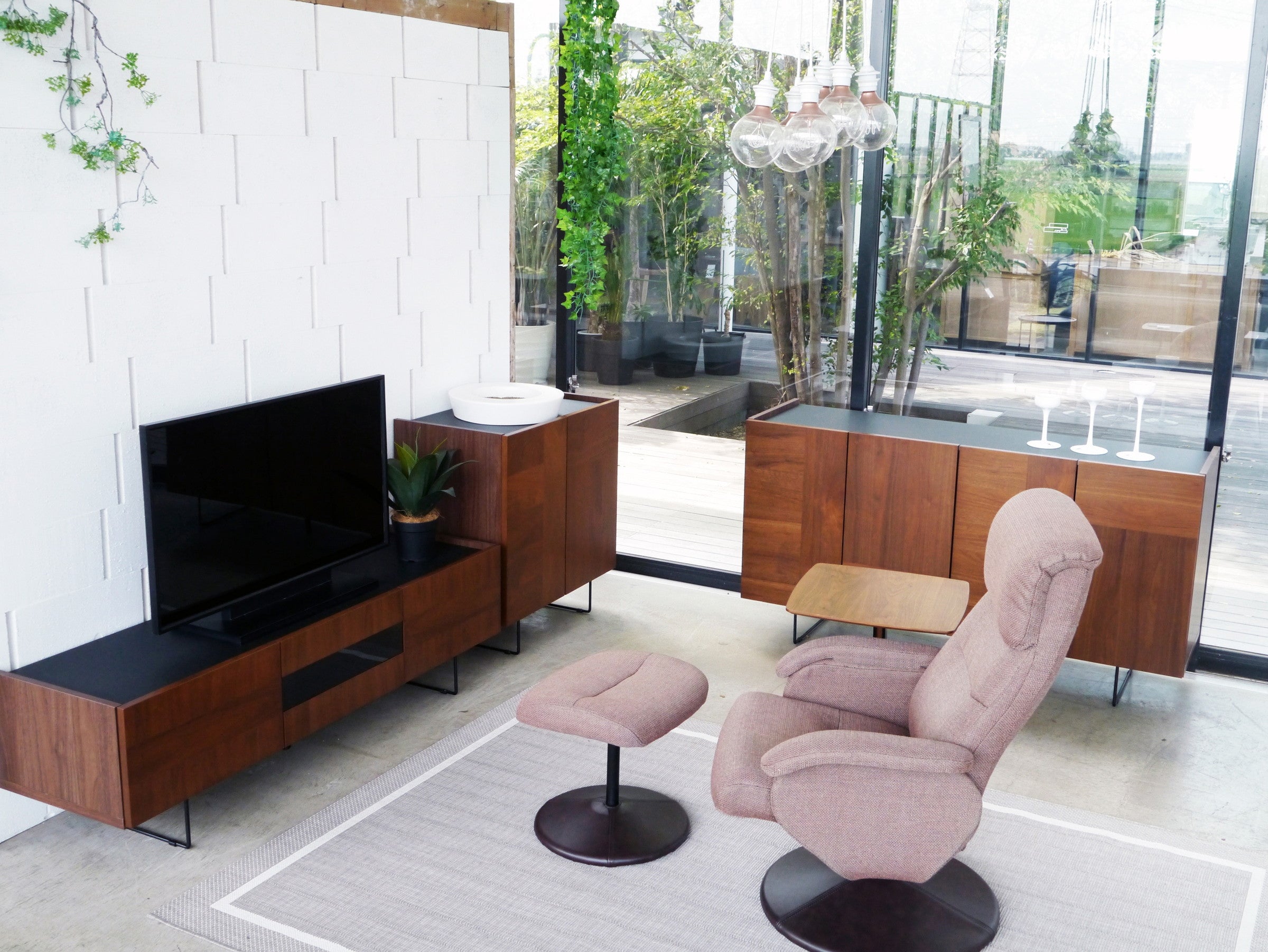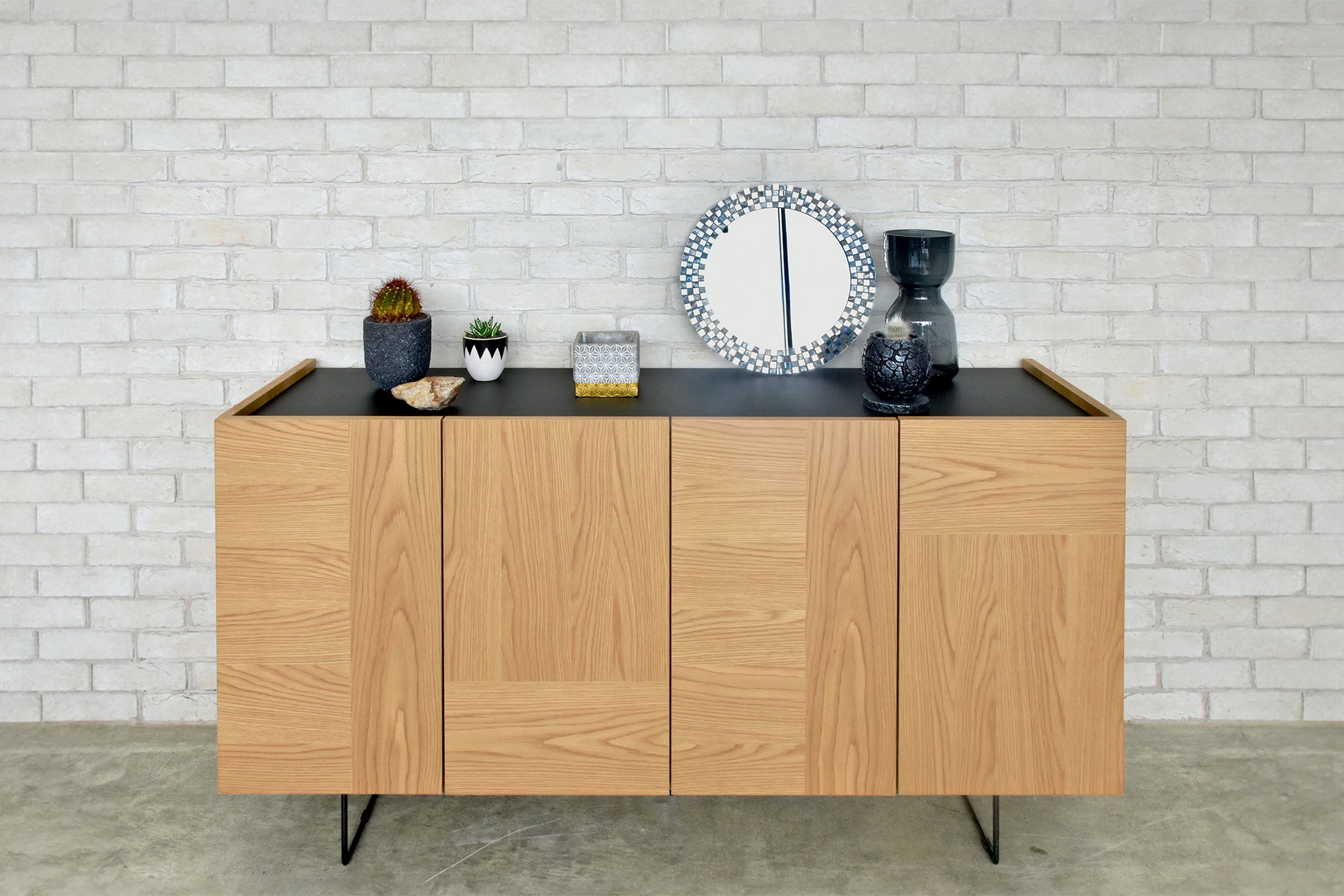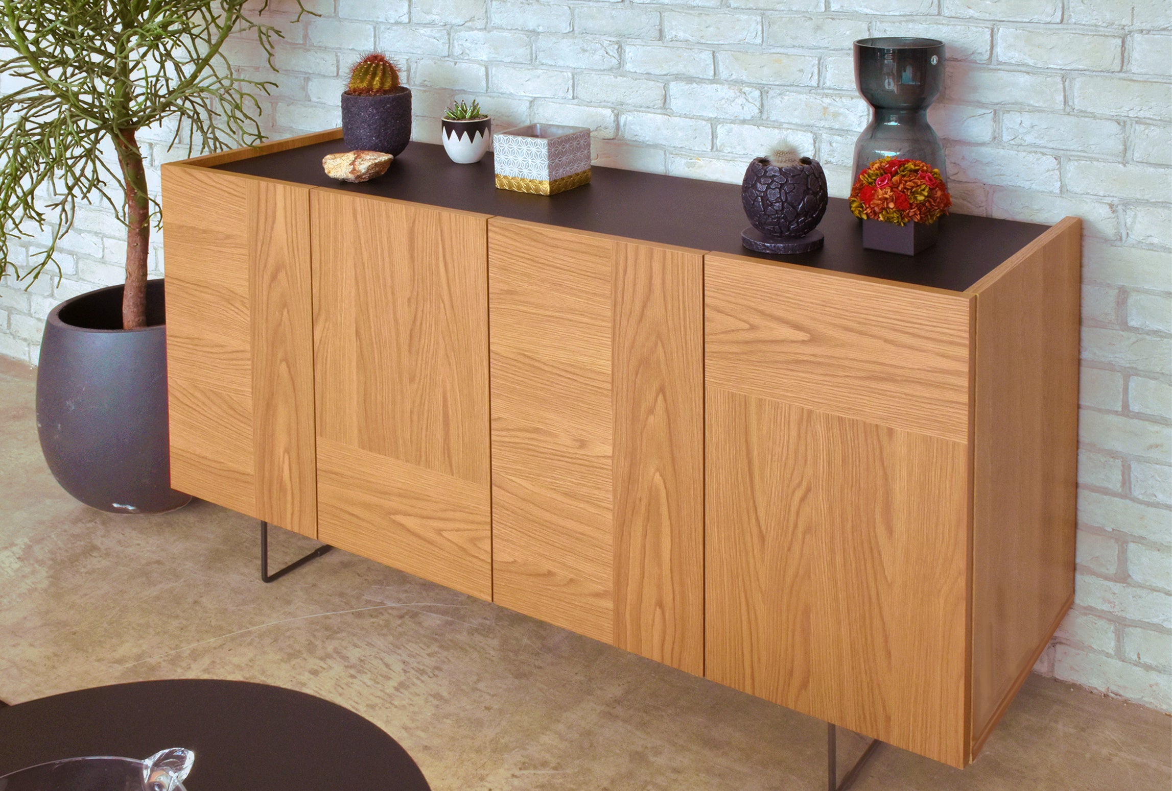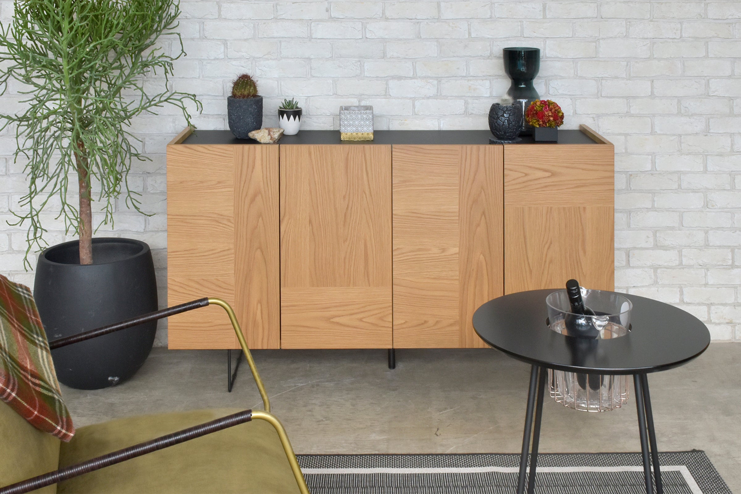 スクエアなフォルムにスリムなスチール脚、前板のウォールナットツキ板の貼り分け加工がアクセントとなった繊細でありながら高級感のあるサイドボードです。