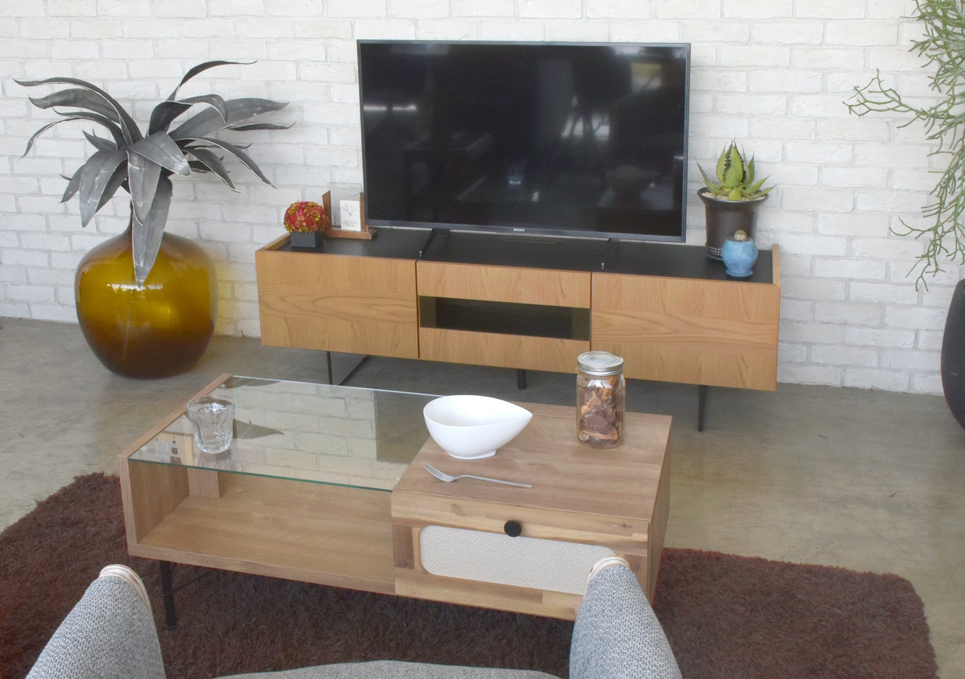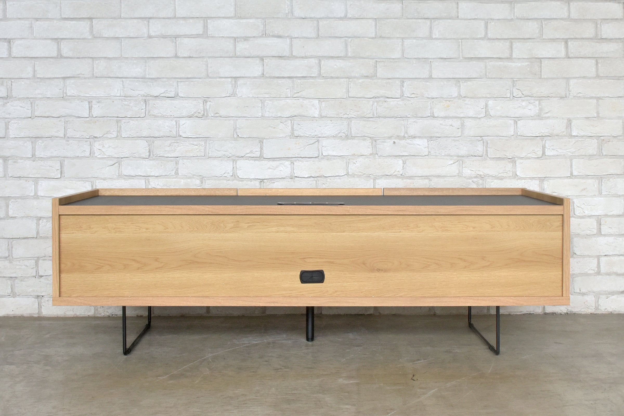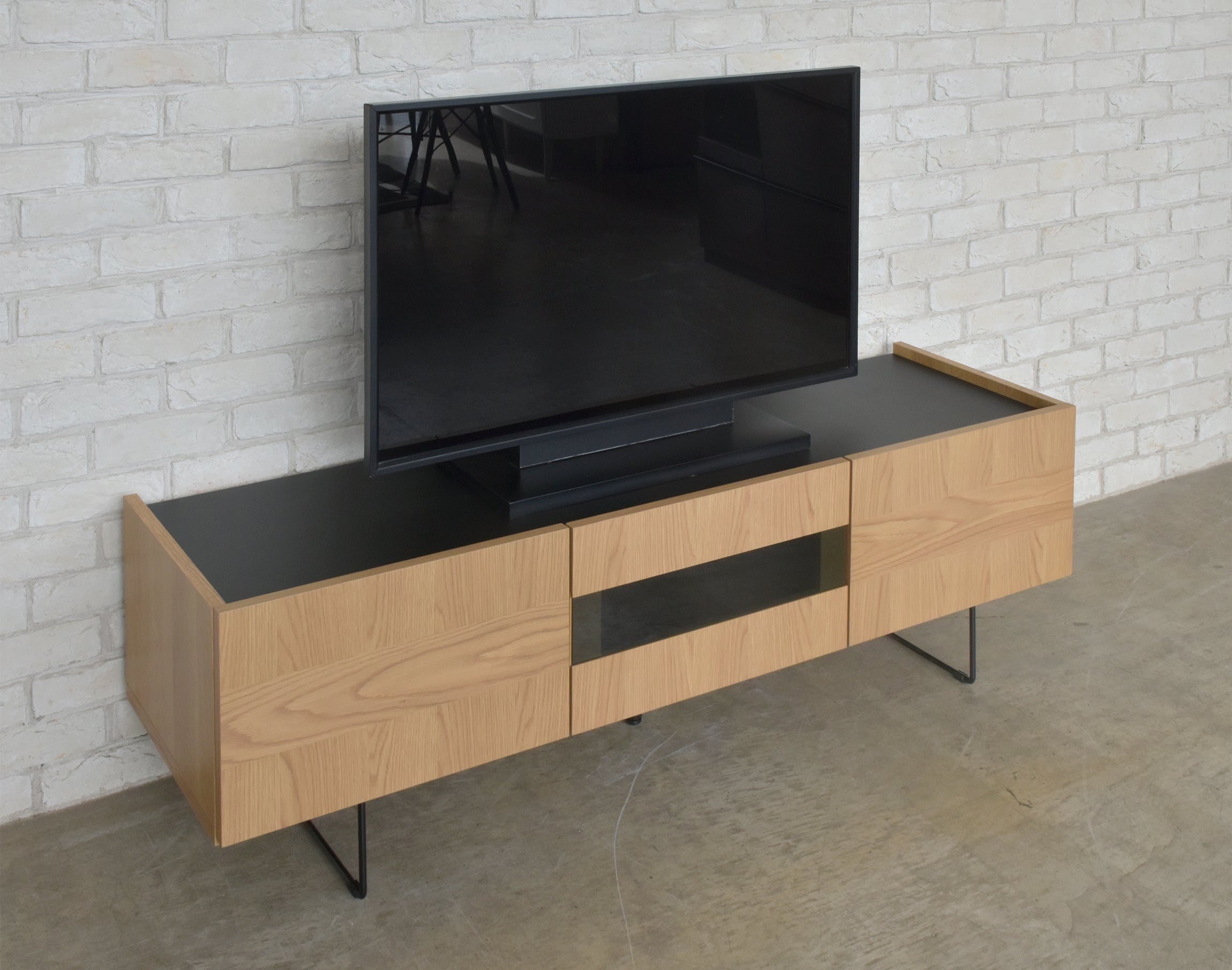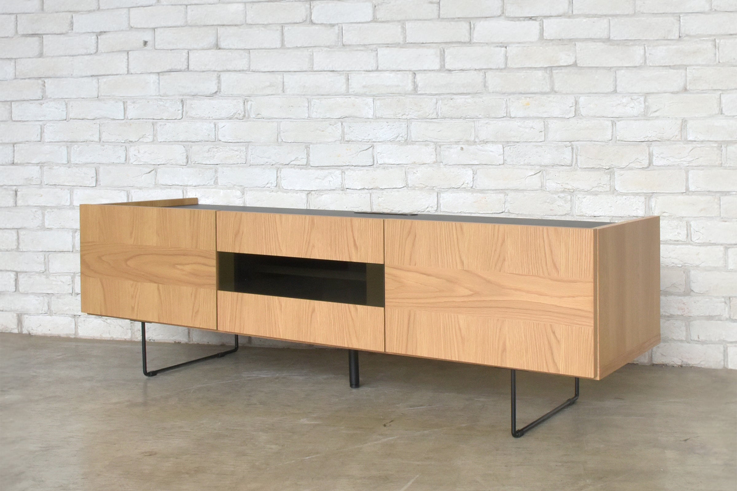 テレビを置いた姿の美しさにこだわったローボードです。シンメトリに貼り分けた前板のウォールナットツキ板がシンプルなデザインの中に上品な彩りを感じさせるTVボードです。