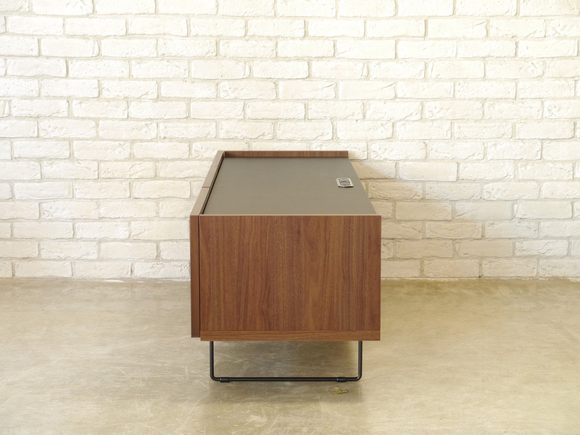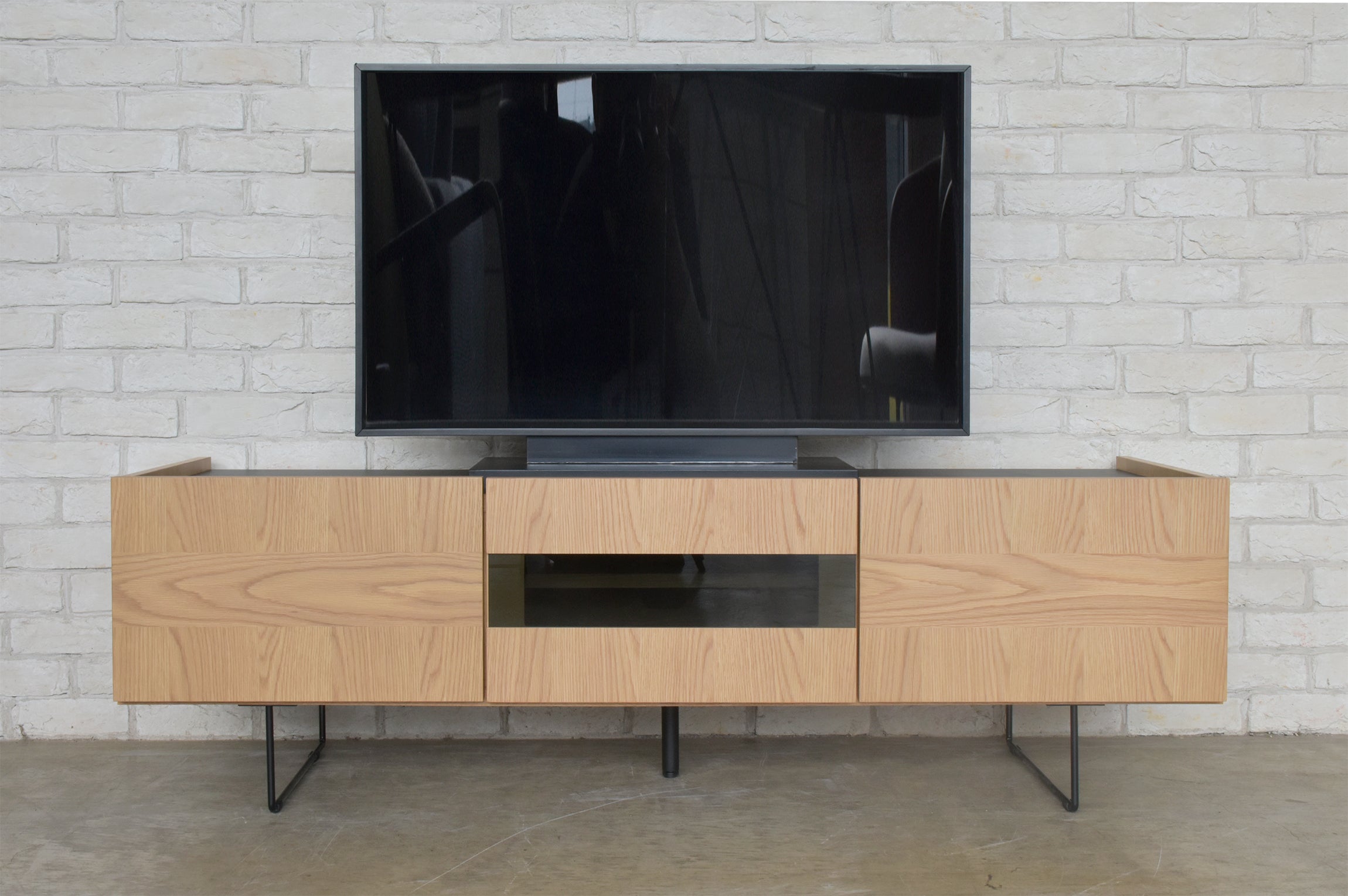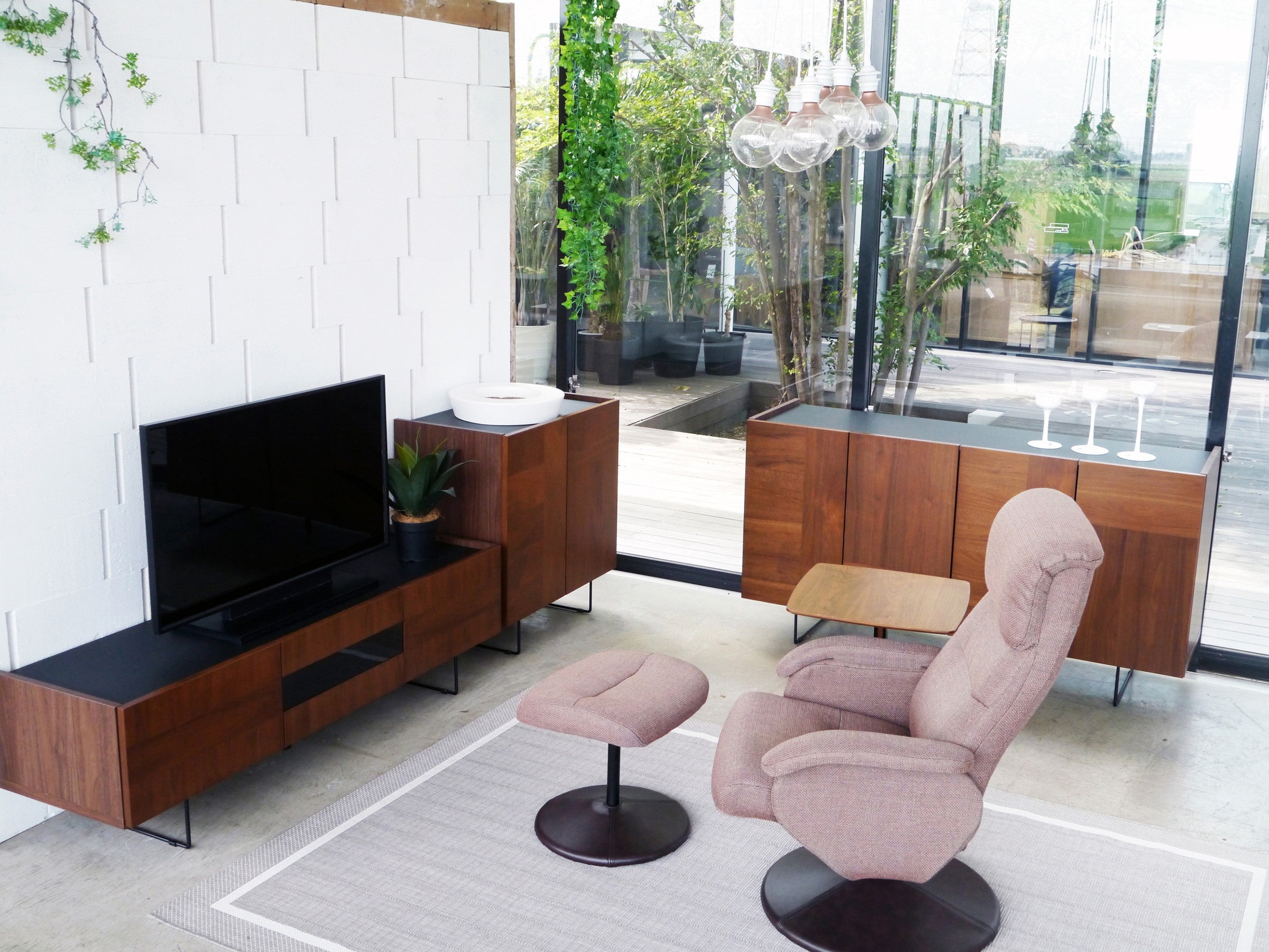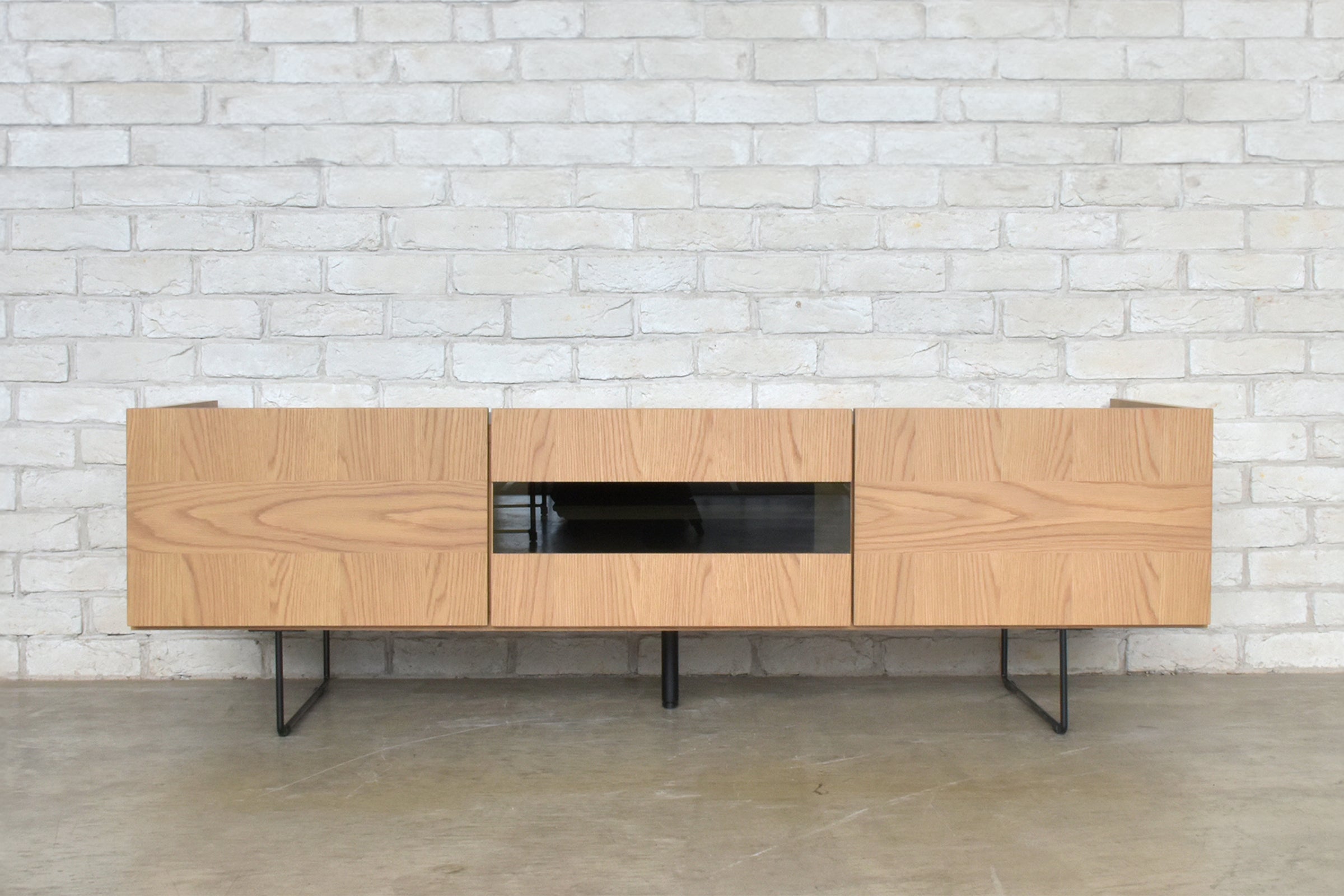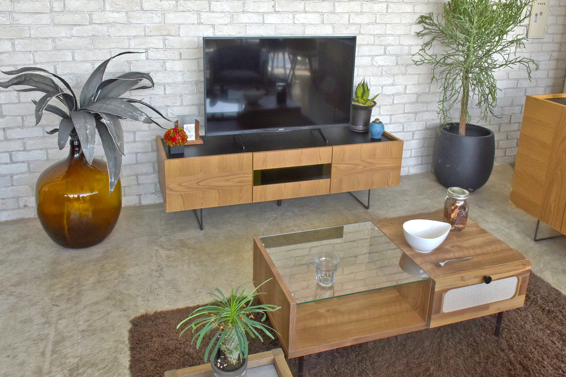テレビを置いた姿の美しさにこだわったローボードです。シンメトリに貼り分けた前板のウォールナットツキ板がシンプルなデザインの中に上品な彩りを感じさせるTVボードです。