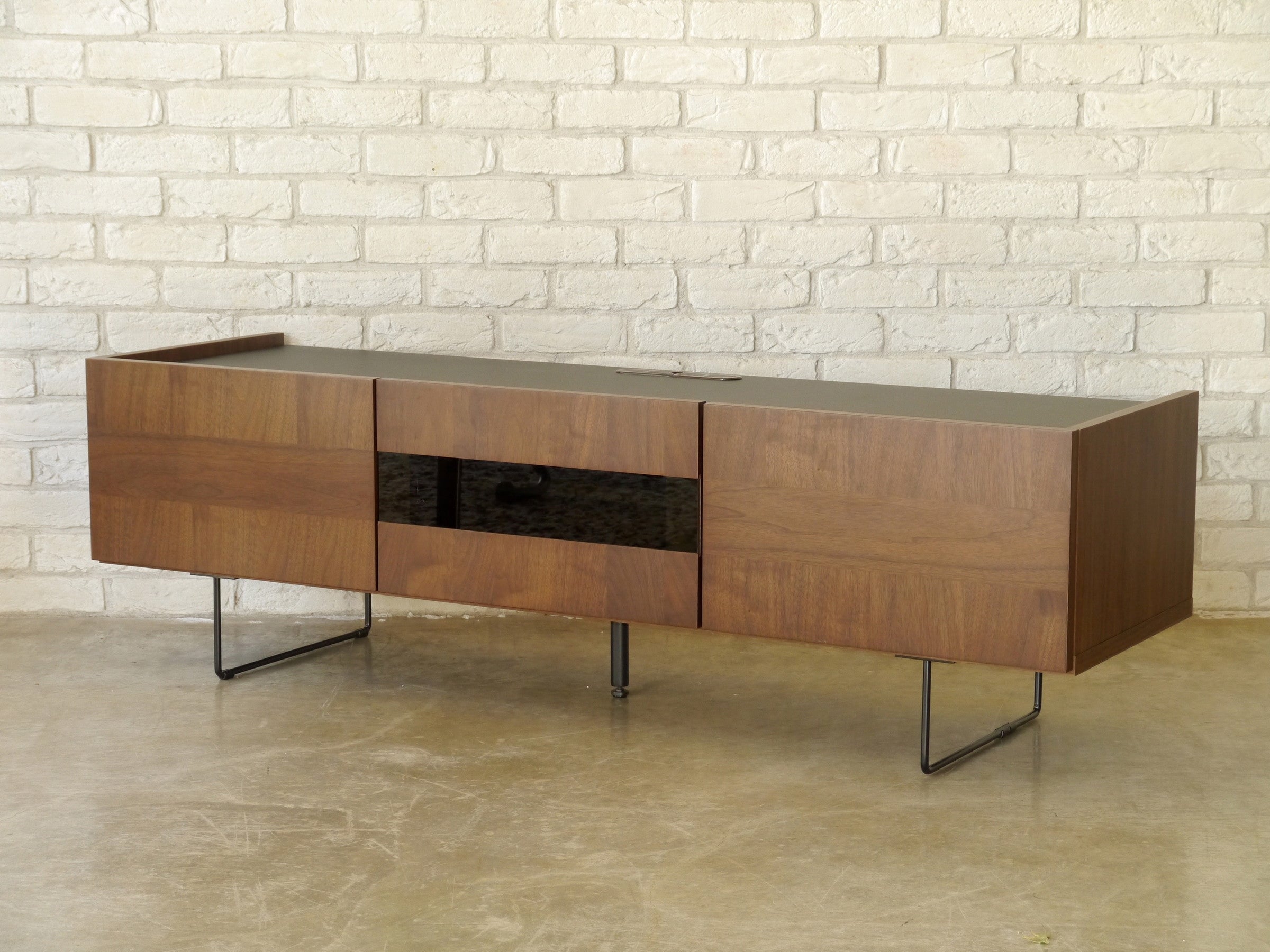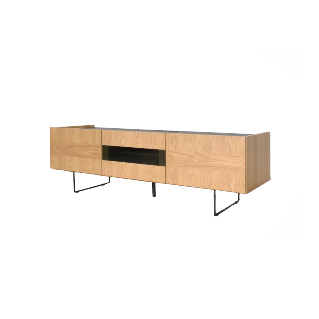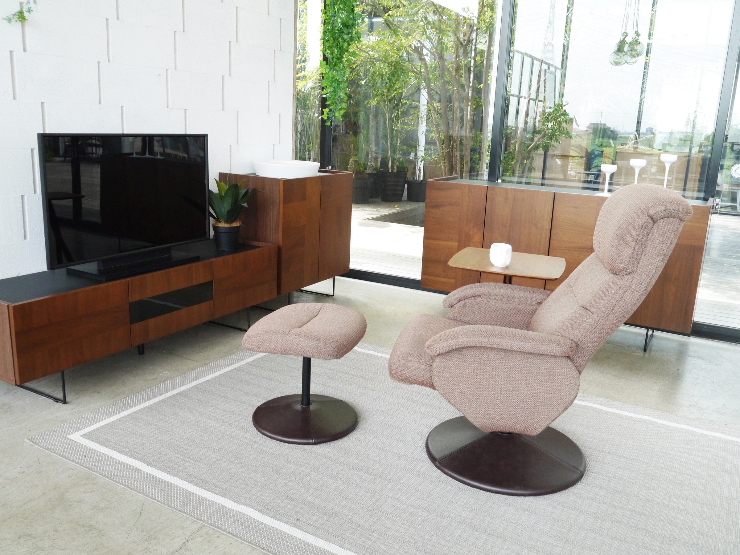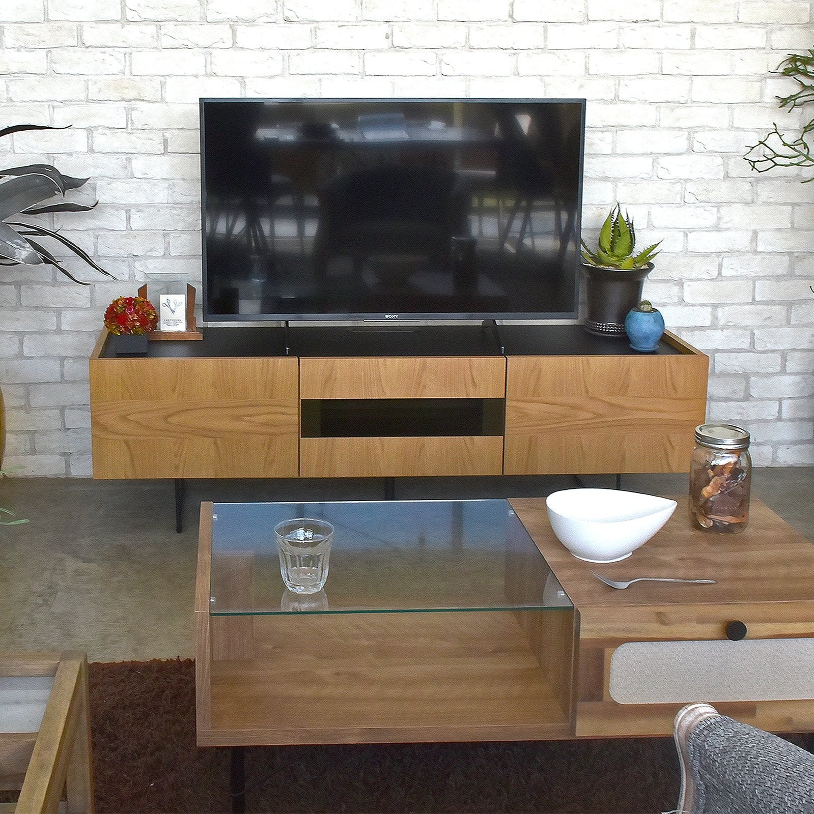 テレビを置いた姿の美しさにこだわったローボードです。シンメトリに貼り分けた前板のウォールナットツキ板がシンプルなデザインの中に上品な彩りを感じさせるTVボードです。