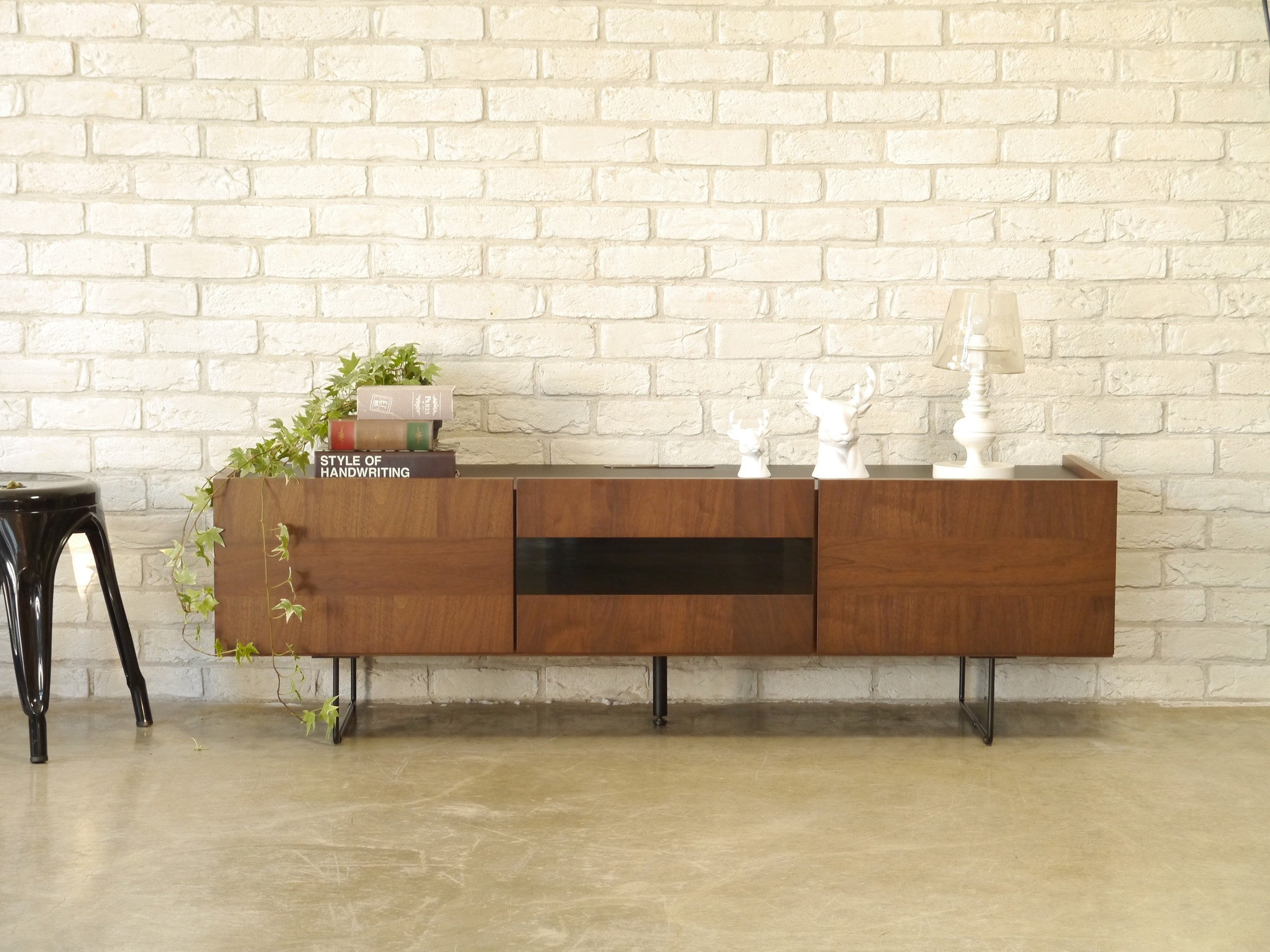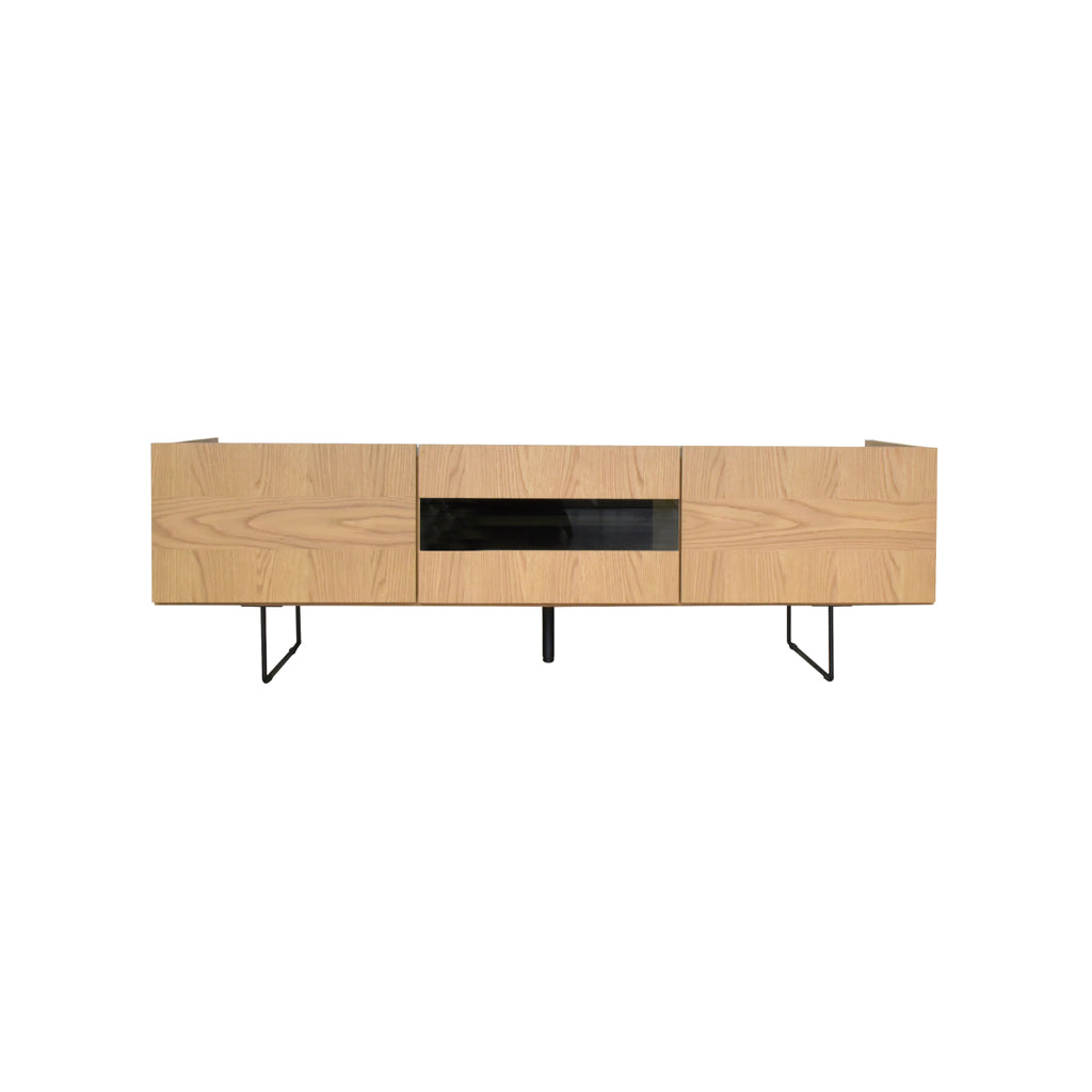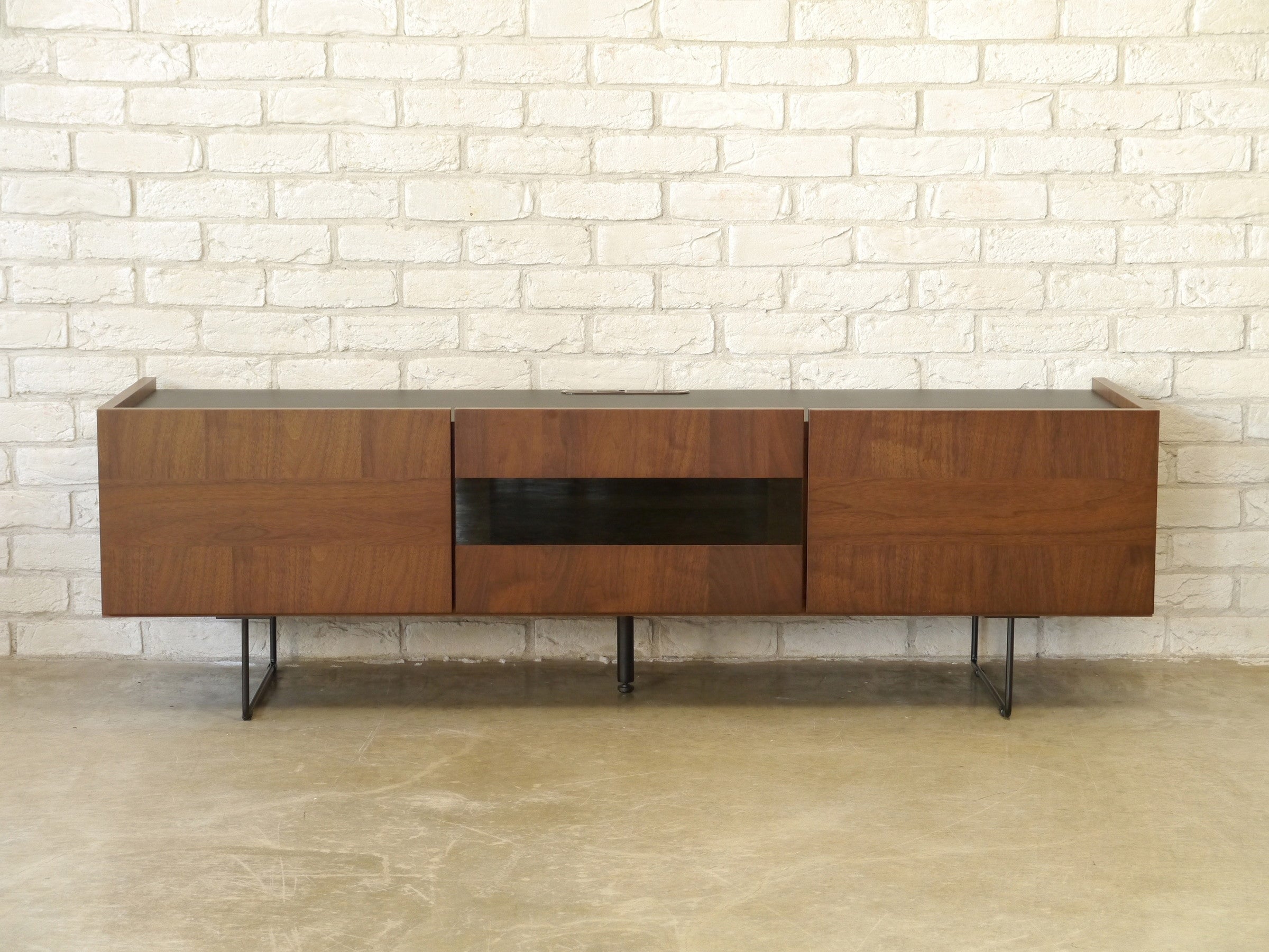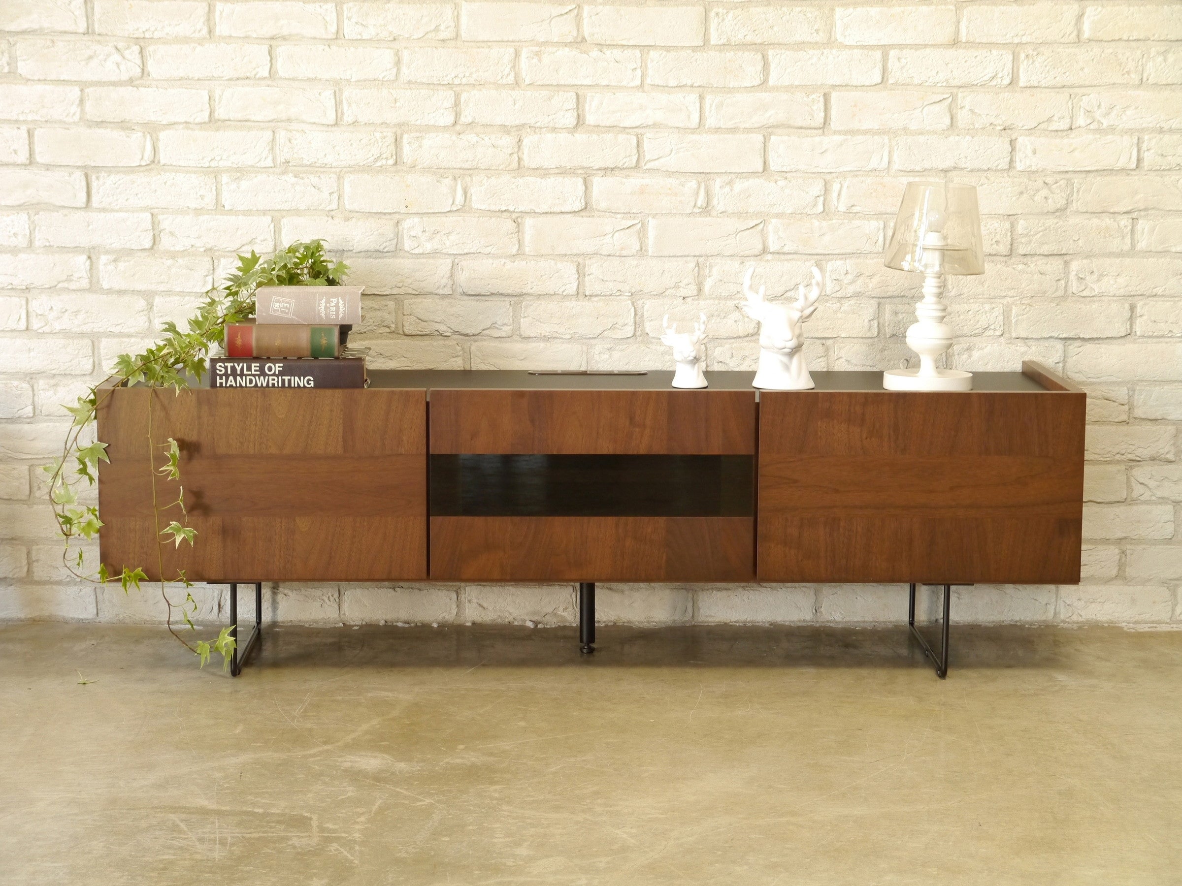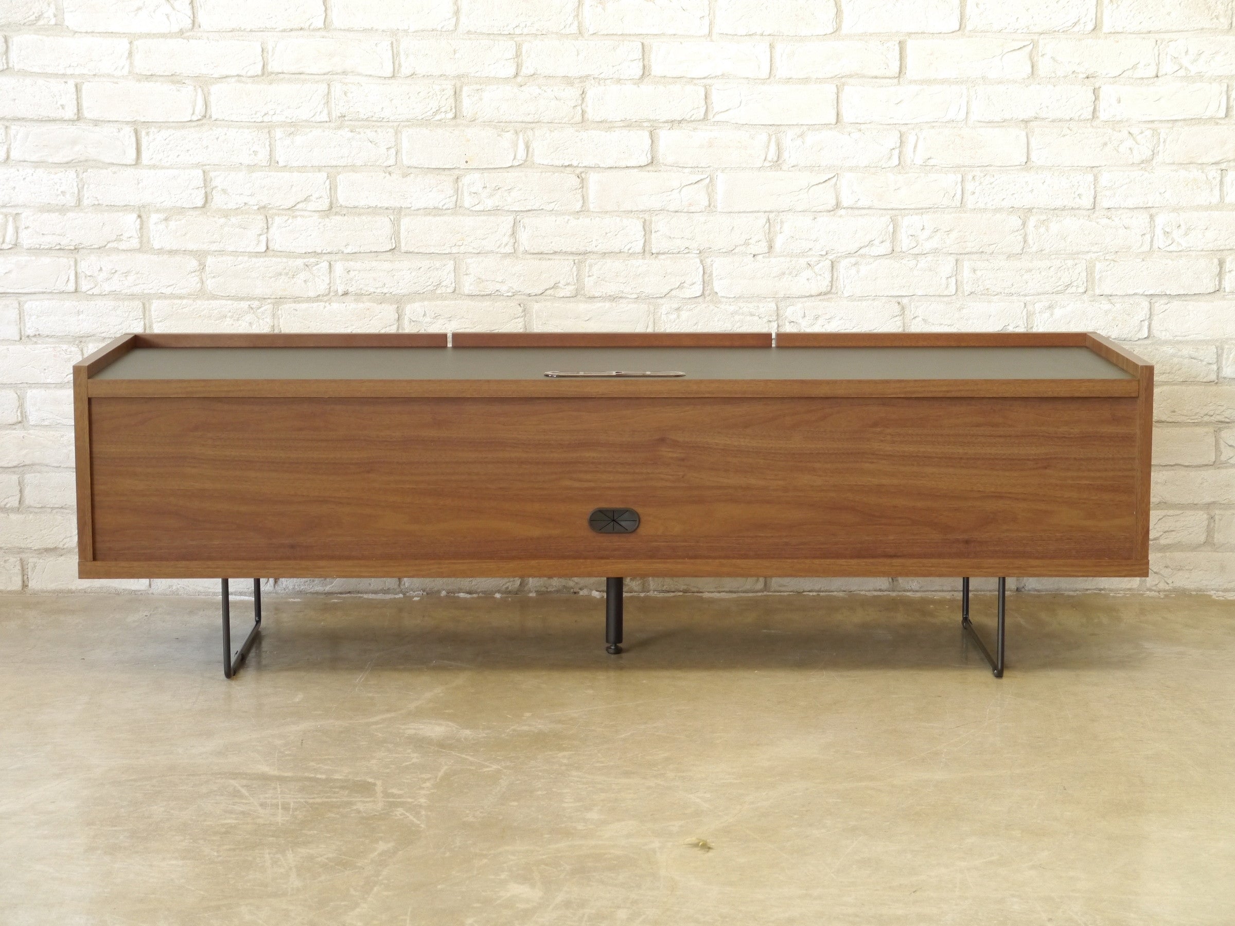 テレビを置いた姿の美しさにこだわったローボードです。シンメトリに貼り分けた前板のウォールナットツキ板がシンプルなデザインの中に上品な彩りを感じさせるTVボードです。
