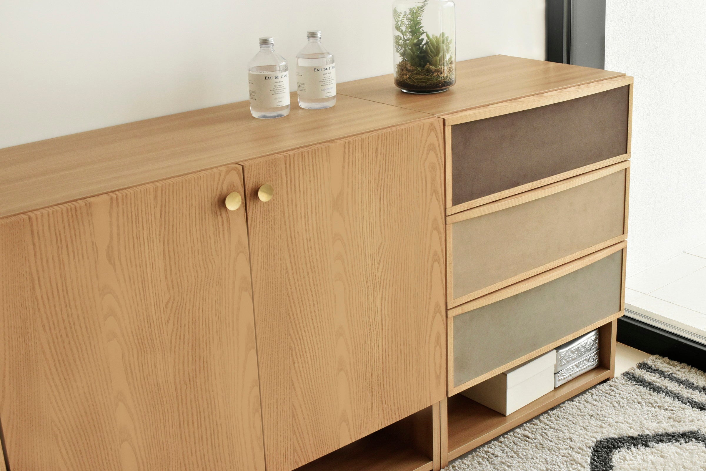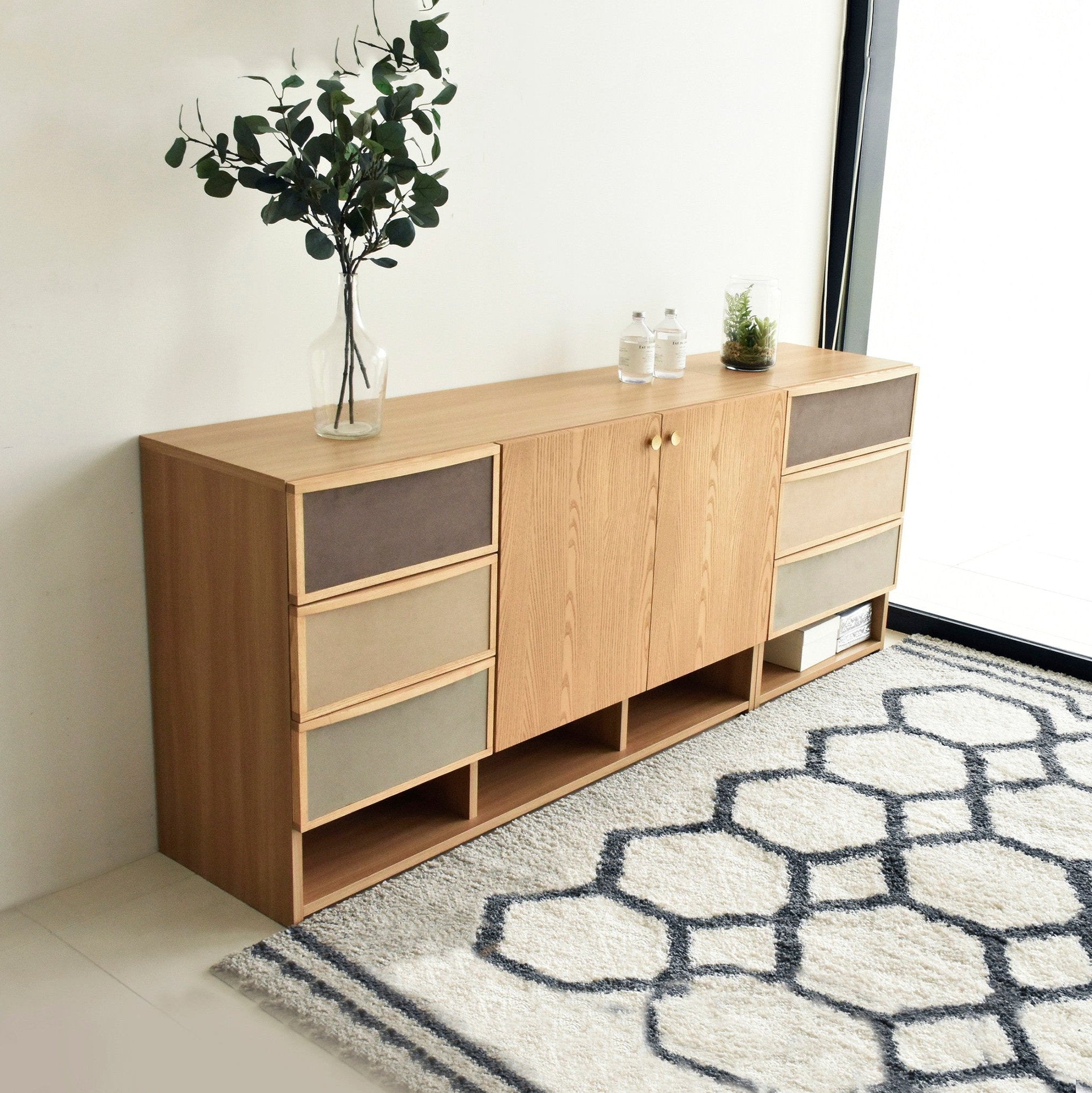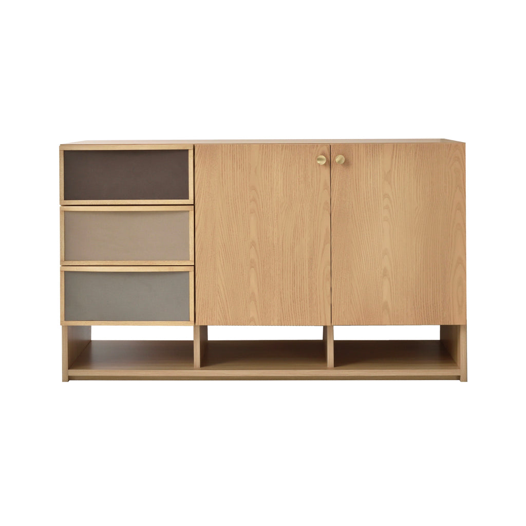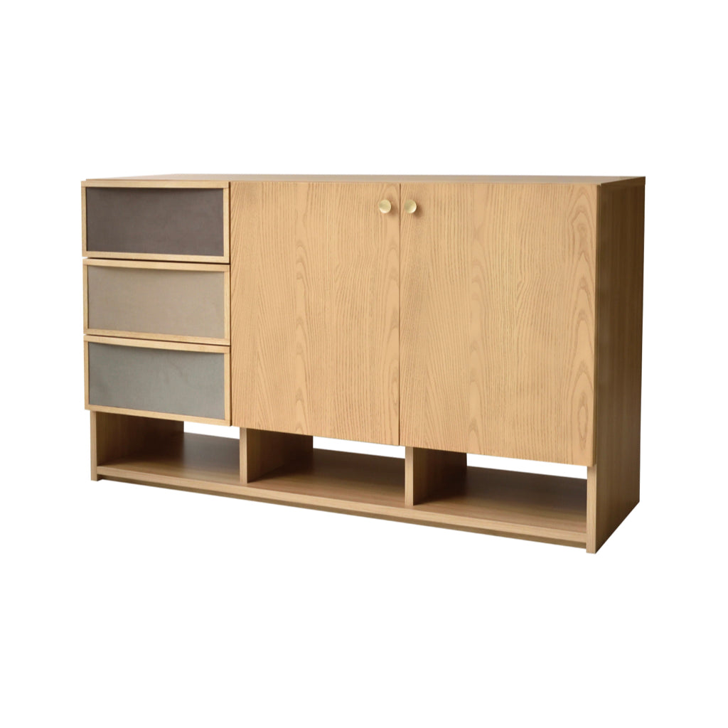 北欧家具からインスピレーションを得て製作した引出のファブリックとゴールド色のつまみが特徴的なサイドボードです。同シリーズのチェストと同じ高さで並べて使用できます。前板は贅沢に無垢材を使用しています。女性に人気なグレージュとナチュラル色が流行りの韓国風インテリアともマッチします。