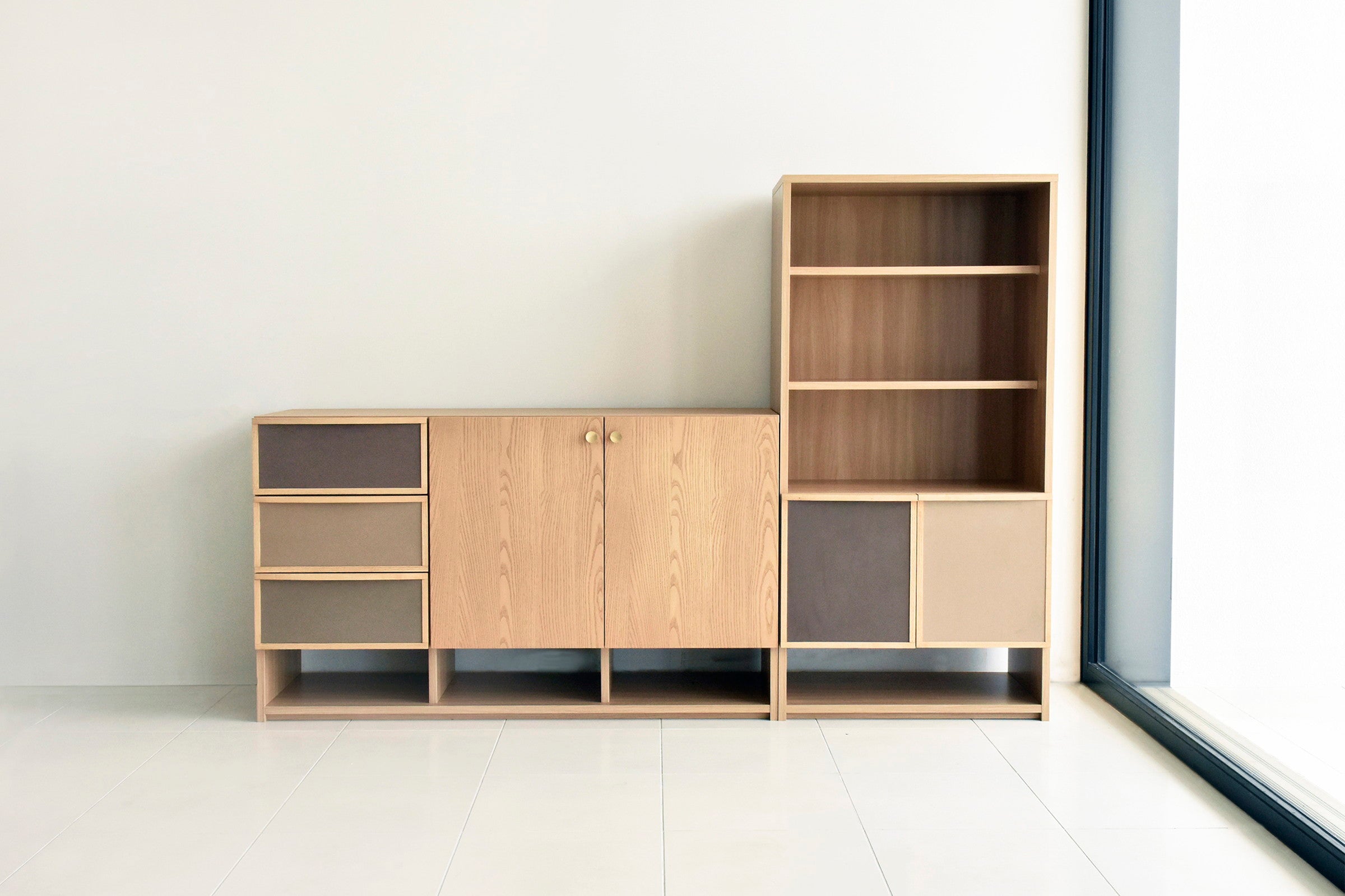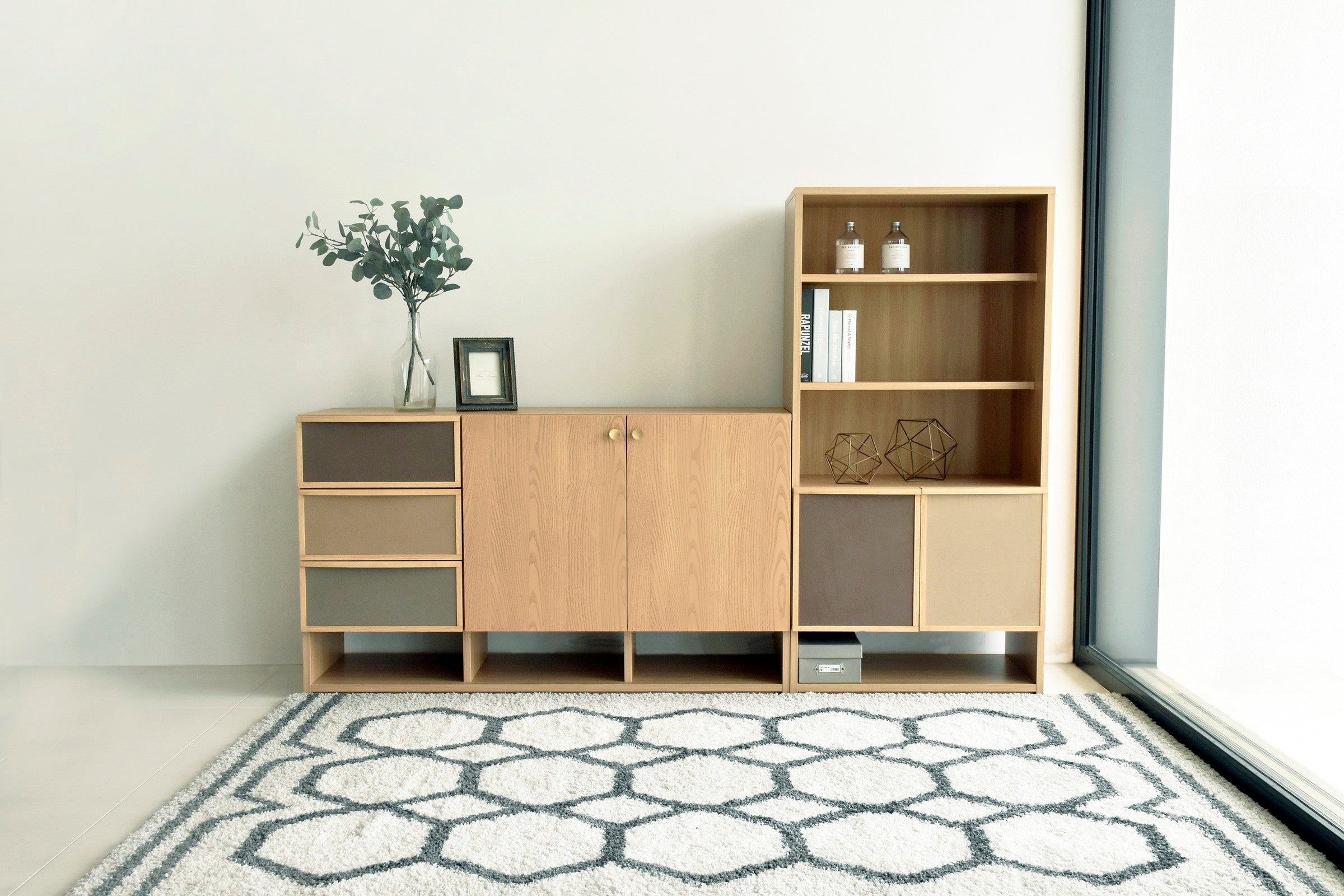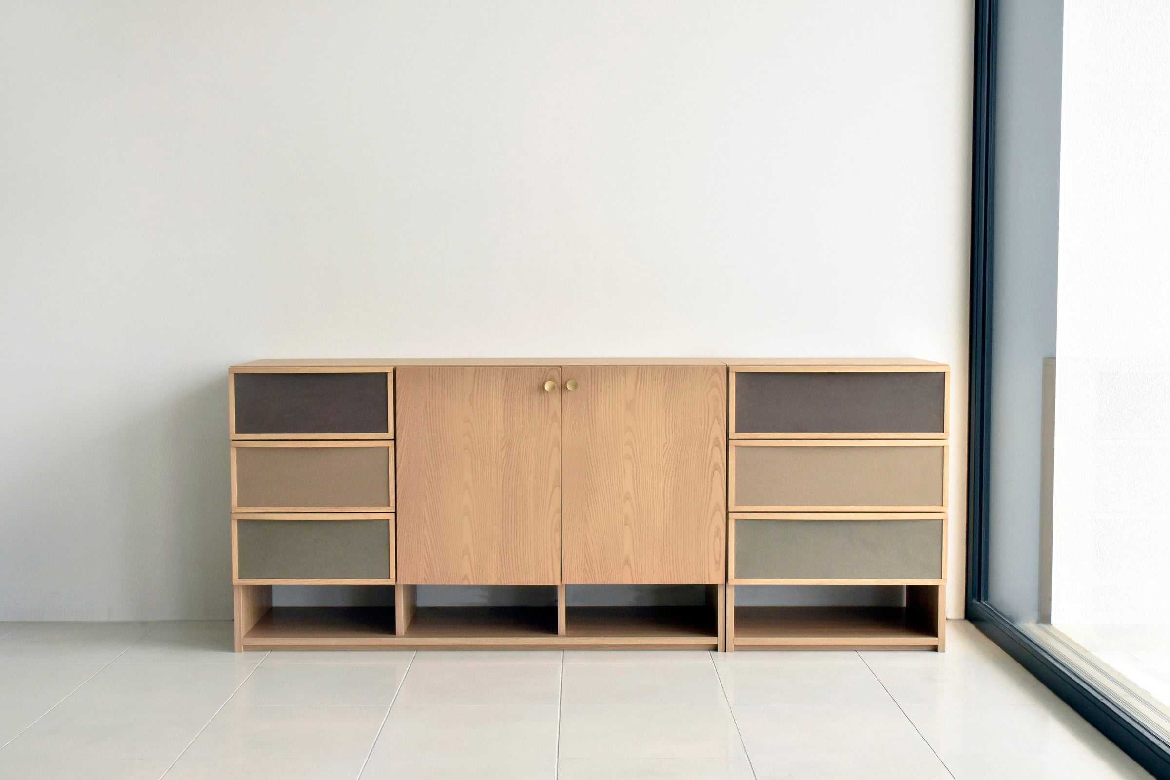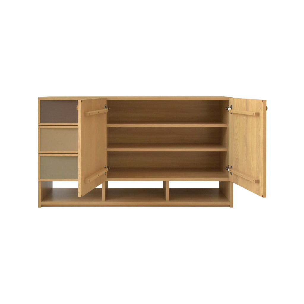 北欧家具からインスピレーションを得て製作した引出のファブリックとゴールド色のつまみが特徴的なサイドボードです。同シリーズのチェストと同じ高さで並べて使用できます。前板は贅沢に無垢材を使用しています。女性に人気なグレージュとナチュラル色が流行りの韓国風インテリアともマッチします。