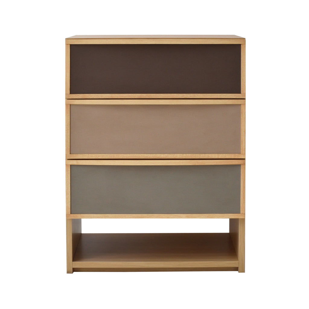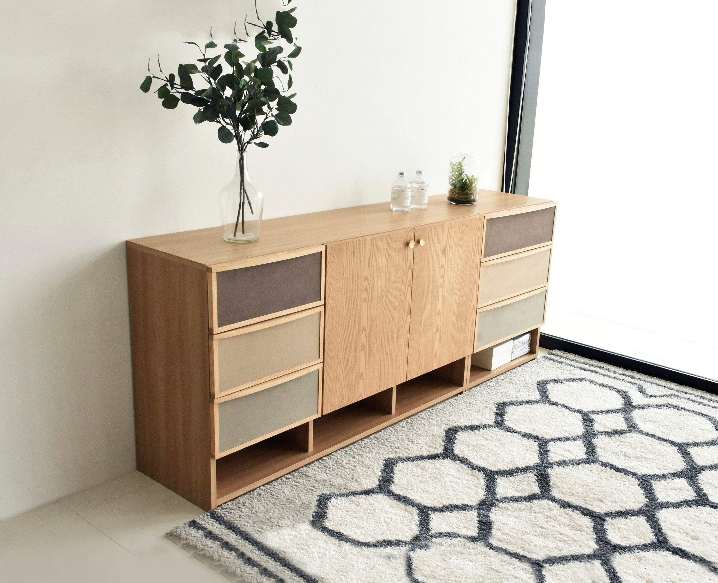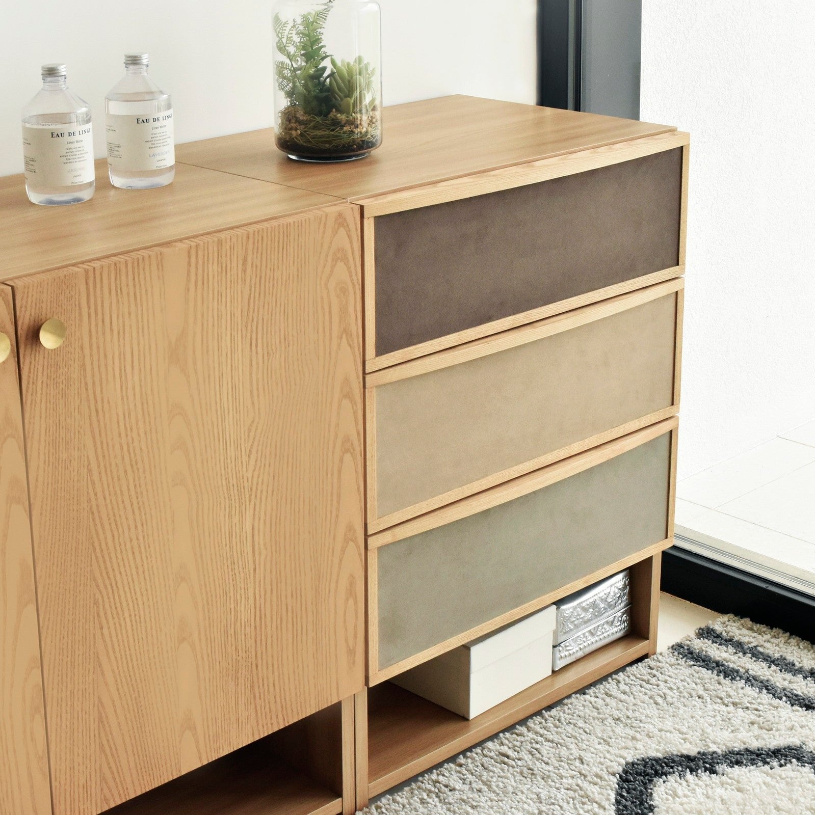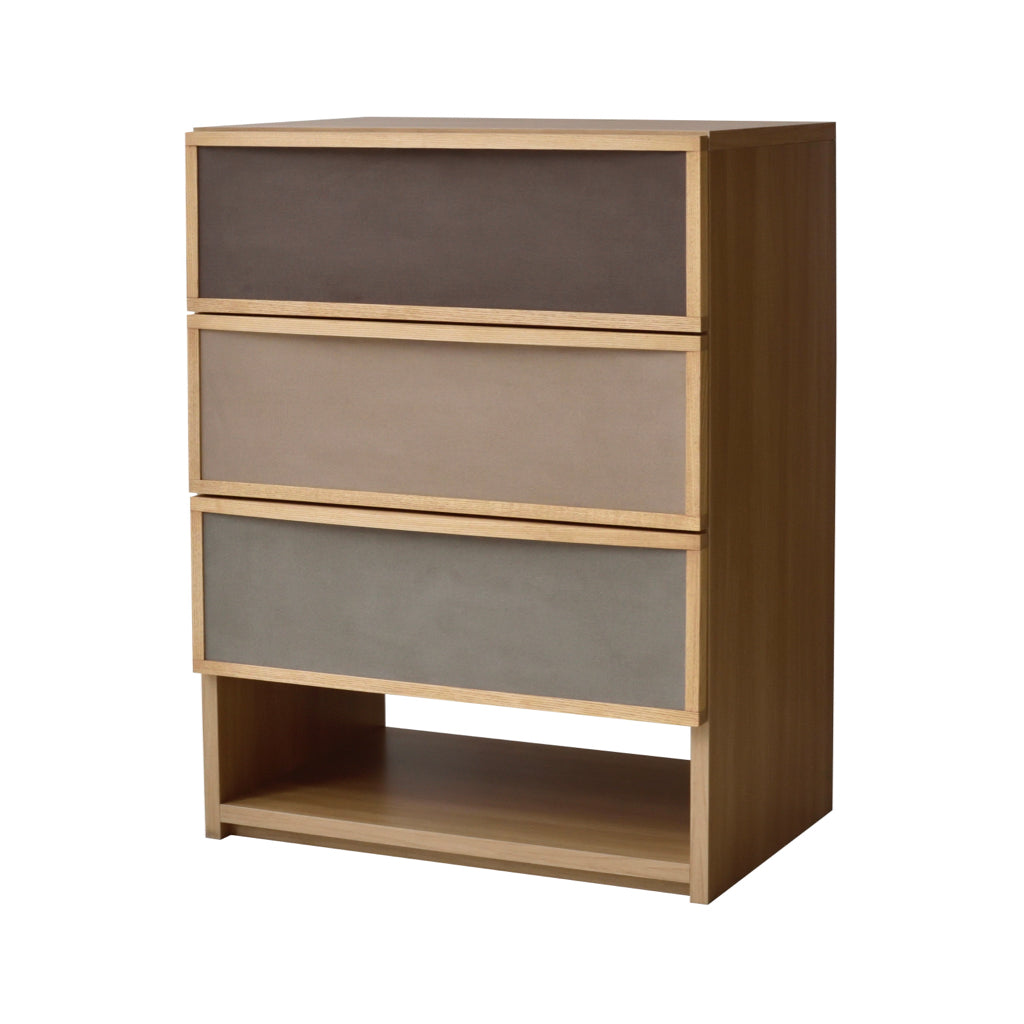 ブラウン系で統一された前板のファブリックが目を引く、北欧テイストで温かみのあるチェストです。同シリーズのサイドボードと同じ高さで並べて使用できます。女性に人気なグレージュとナチュラル色が流行りの韓国風インテリアともマッチします。