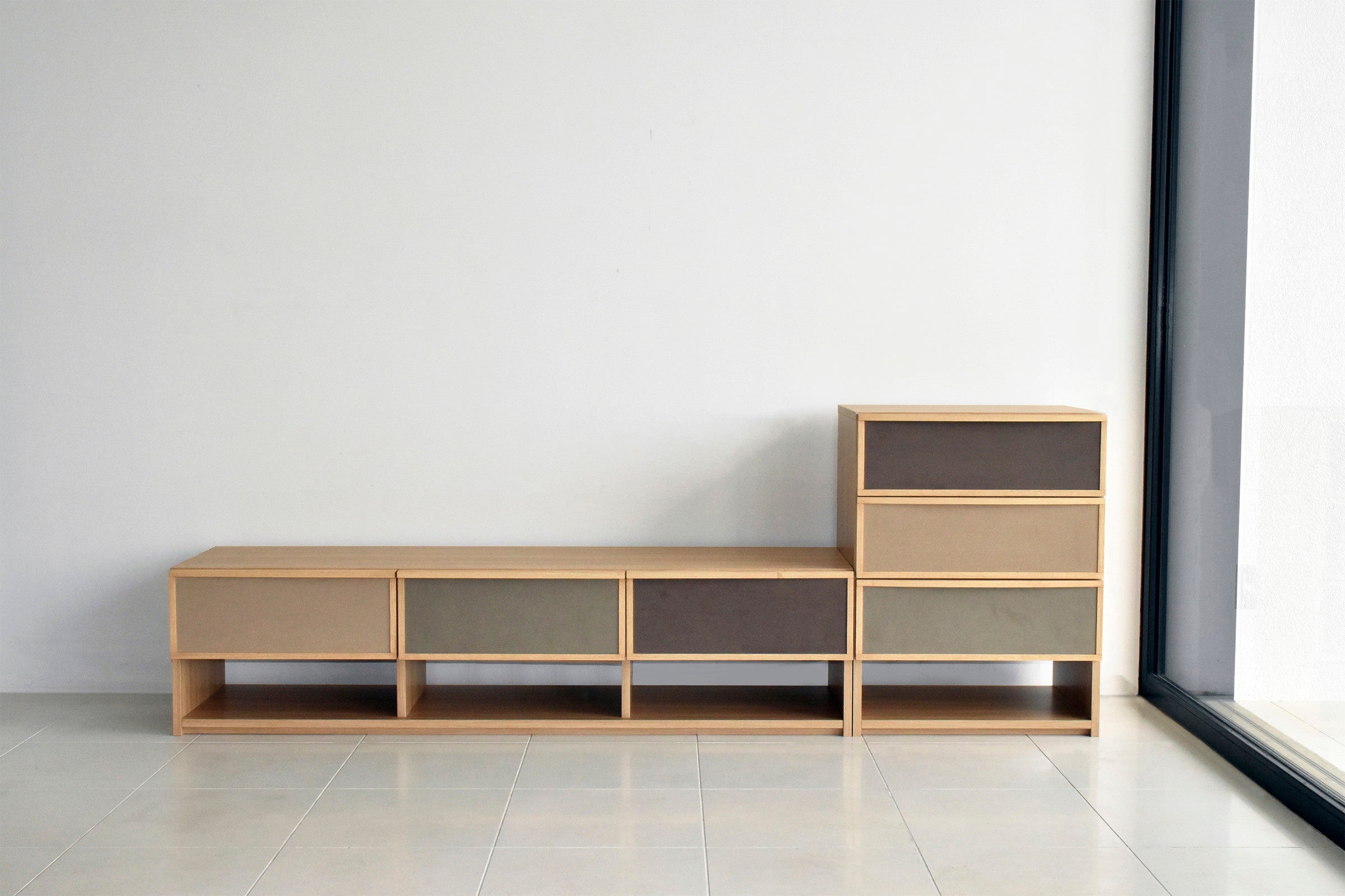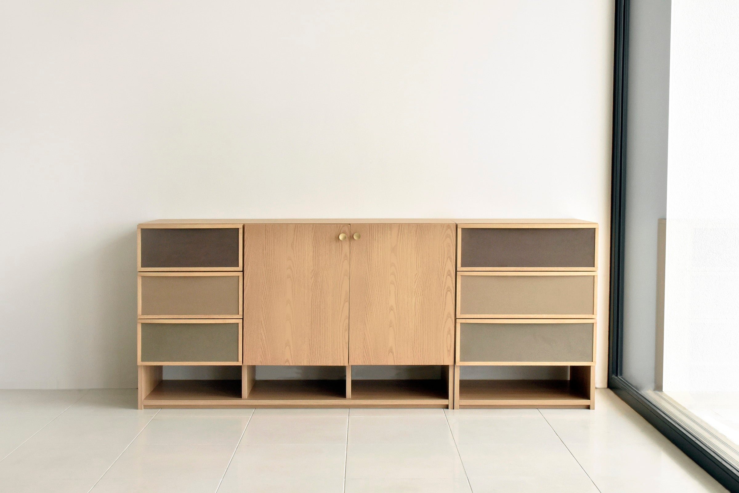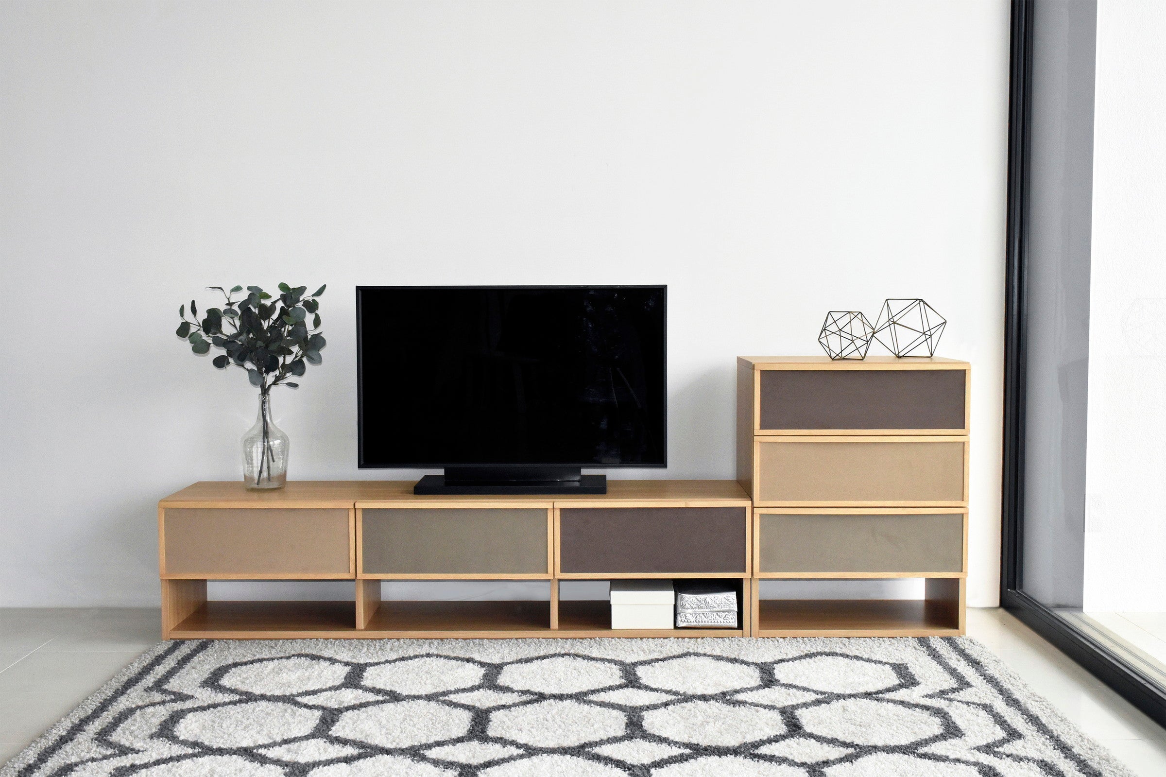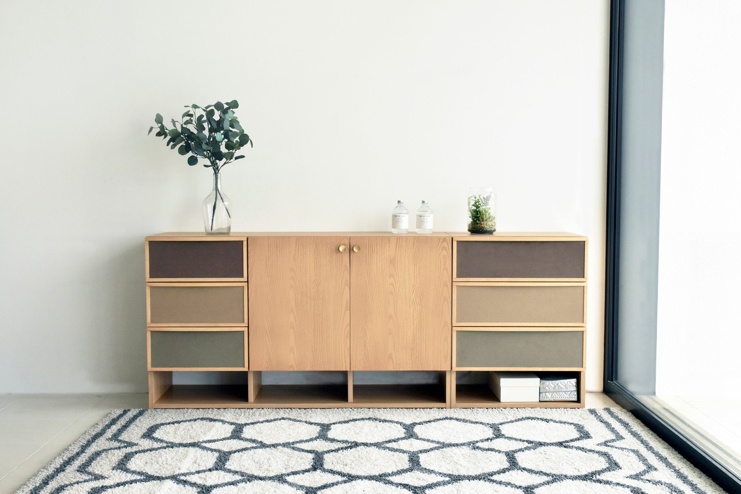 ブラウン系で統一された前板のファブリックが目を引く、北欧テイストで温かみのあるチェストです。同シリーズのサイドボードと同じ高さで並べて使用できます。女性に人気なグレージュとナチュラル色が流行りの韓国風インテリアともマッチします。
