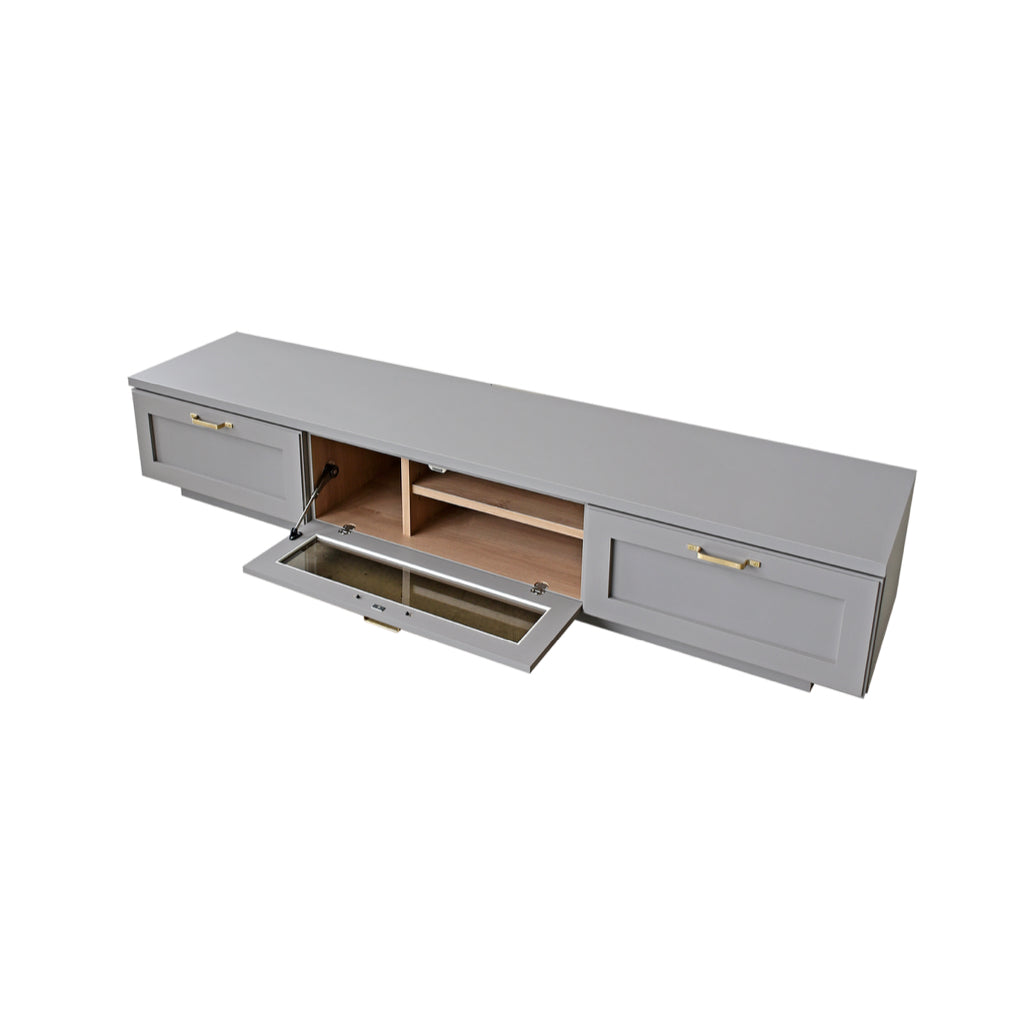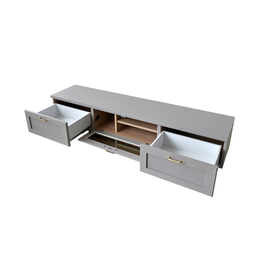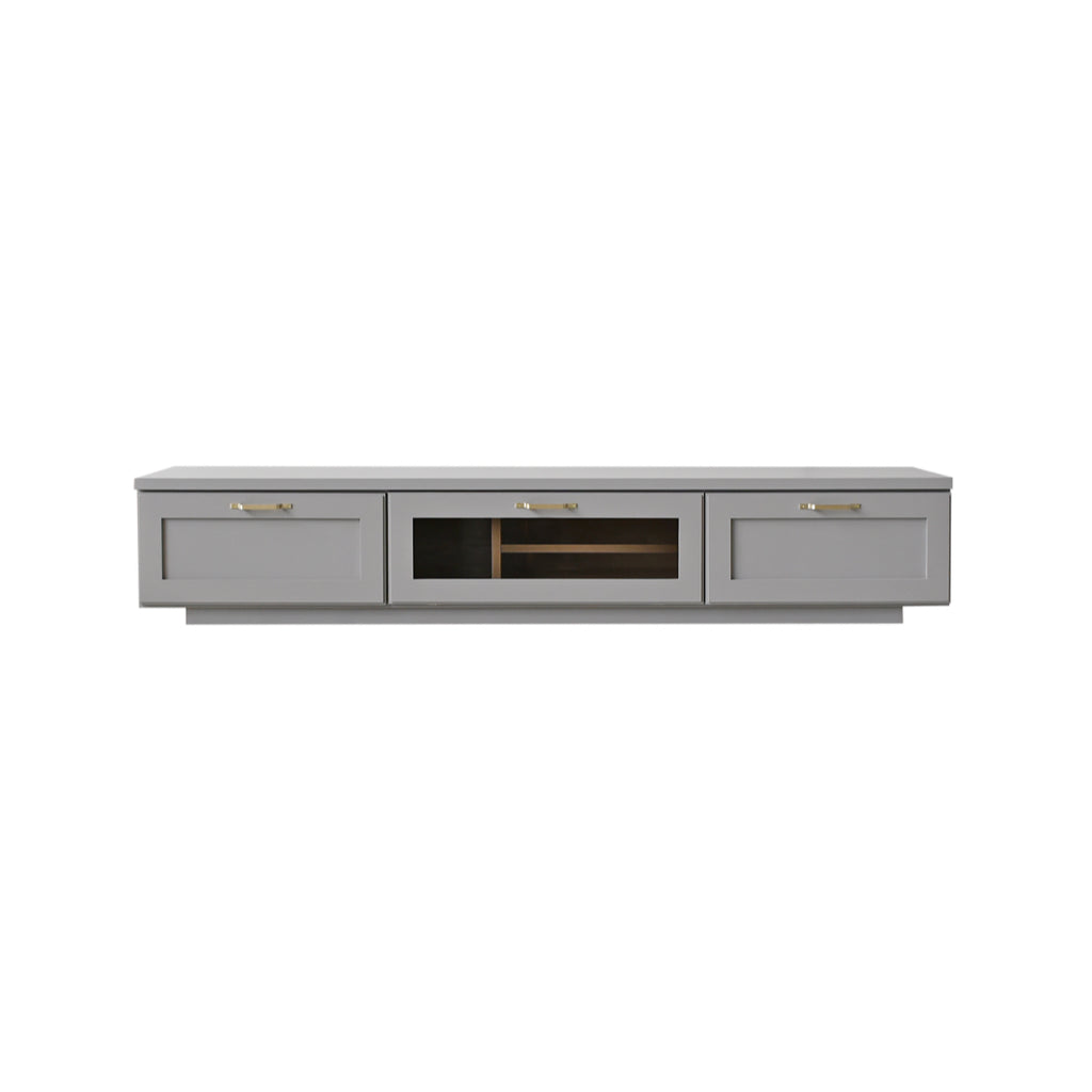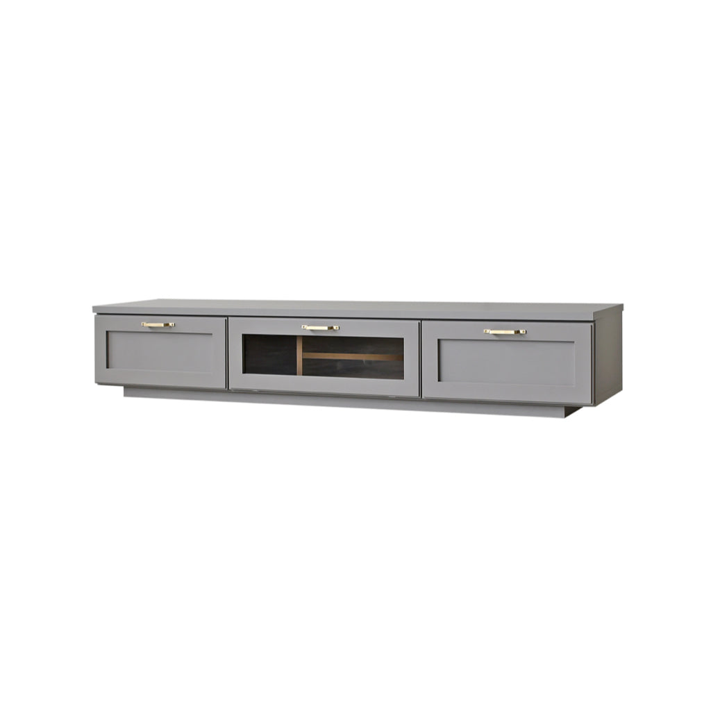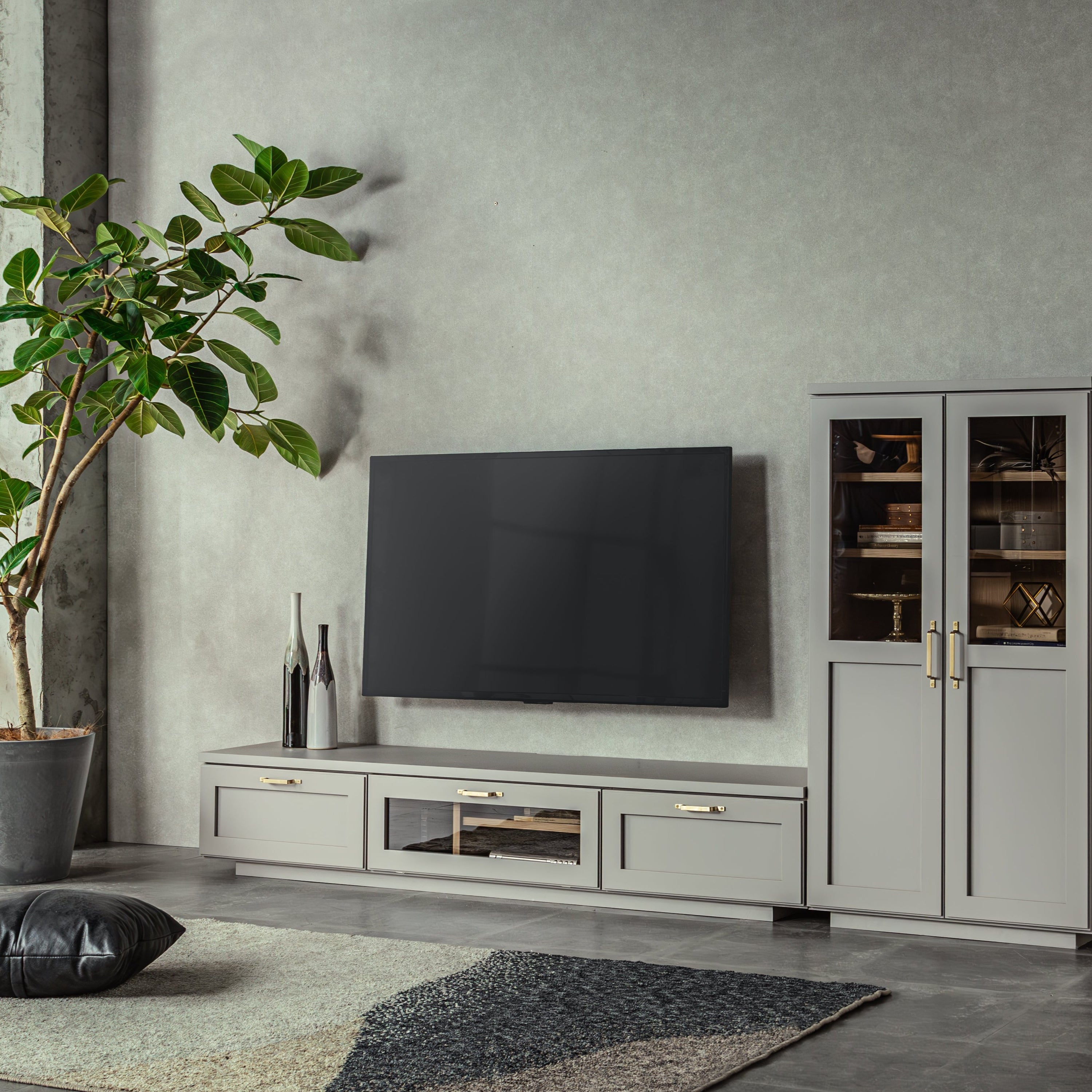 落ち着いたグレーカラーと真鍮の取っ手の組み合わせが、レトロモダンな雰囲気を演出するテレビ台です。圧迫感の少ないロータイプなので、お部屋を広く見せてくれるのが特徴です。