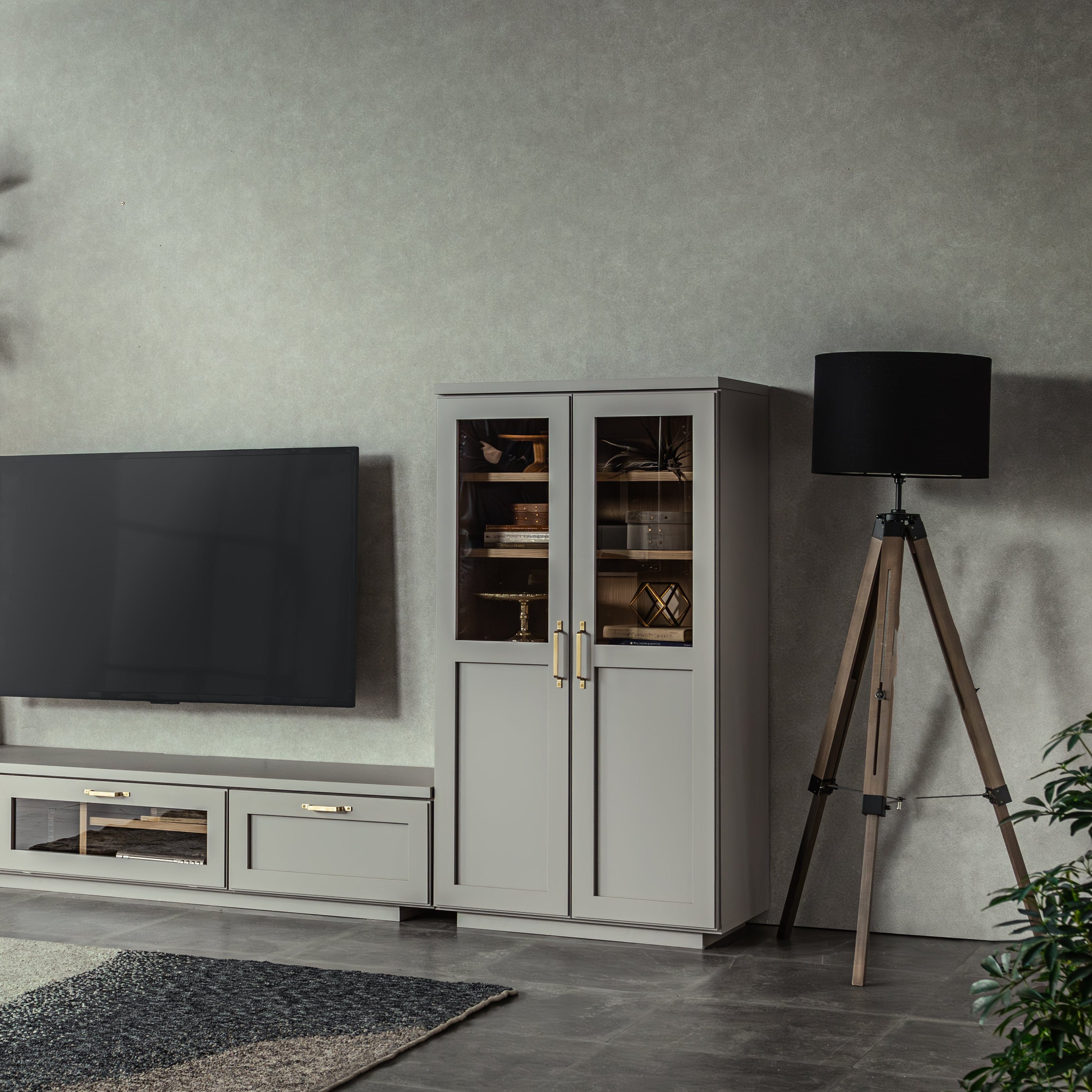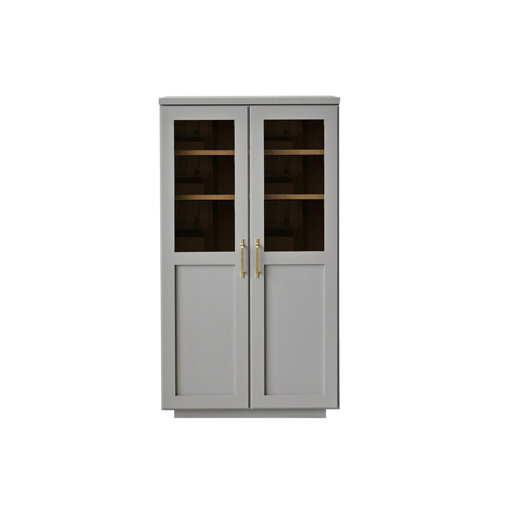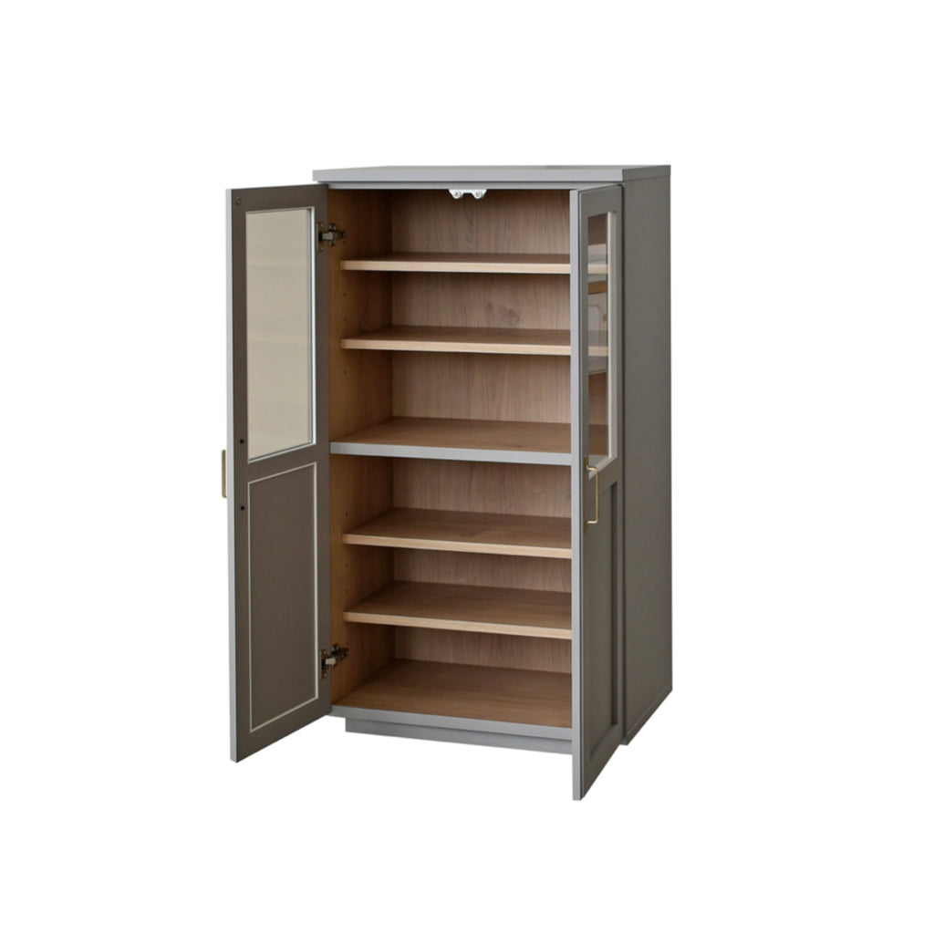 落ち着いたグレーカラーと真鍮の取っ手の組み合わせが、レトロモダンな雰囲気を演出するキャビネットです。本や小物をしっかり収納できリビング周りをスッキリと見せてくれます。