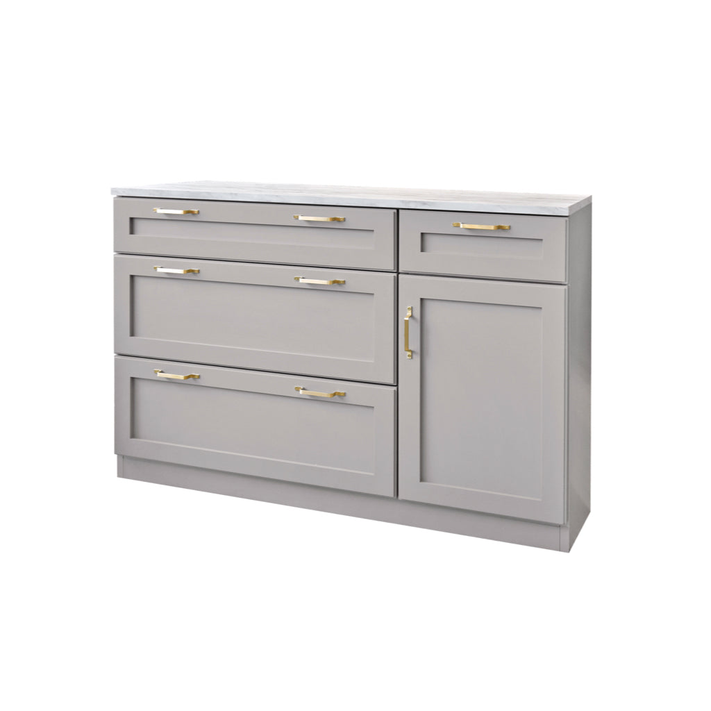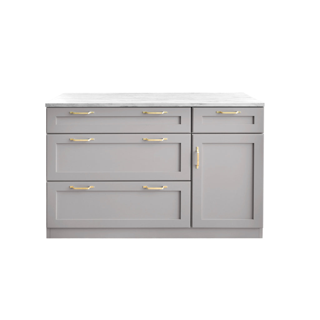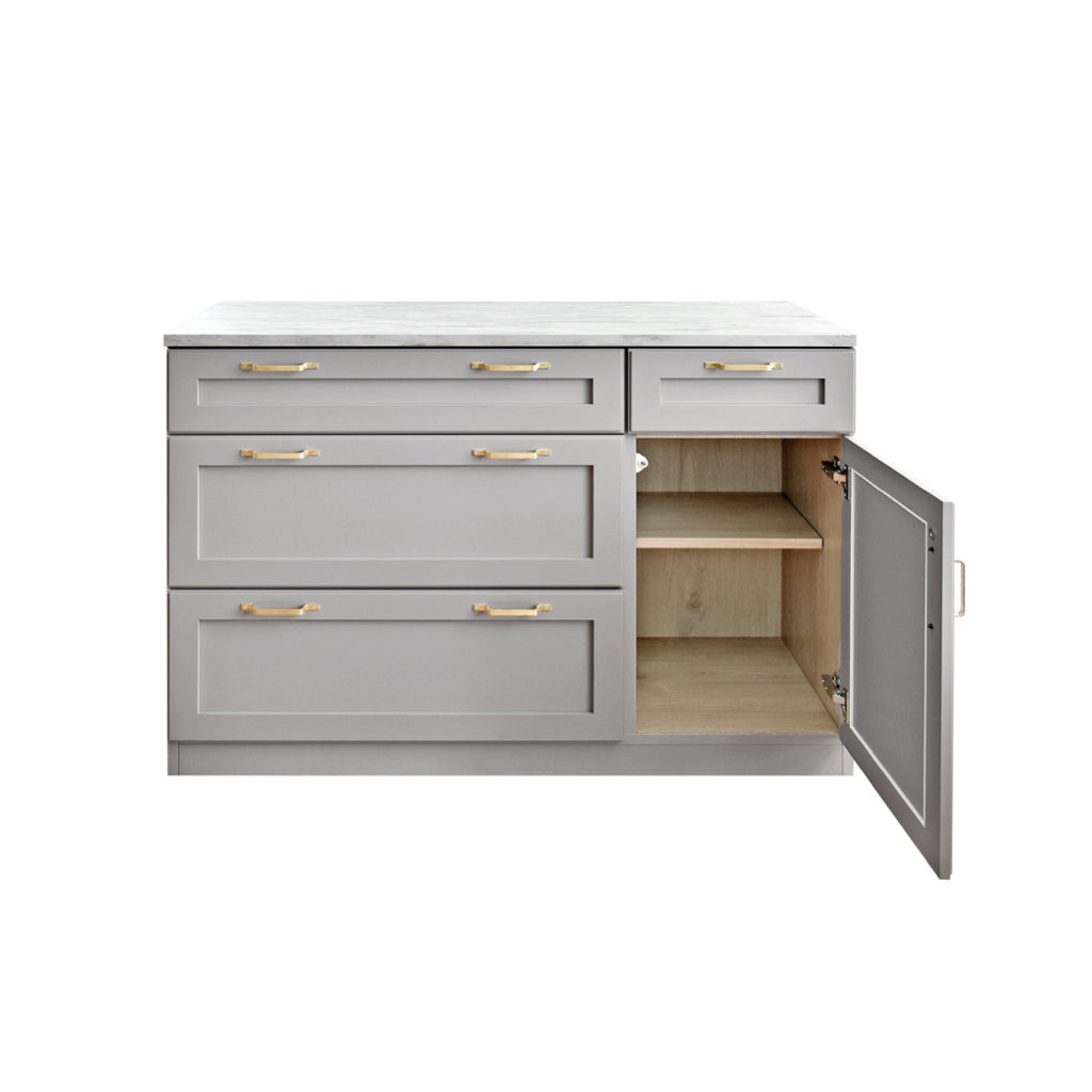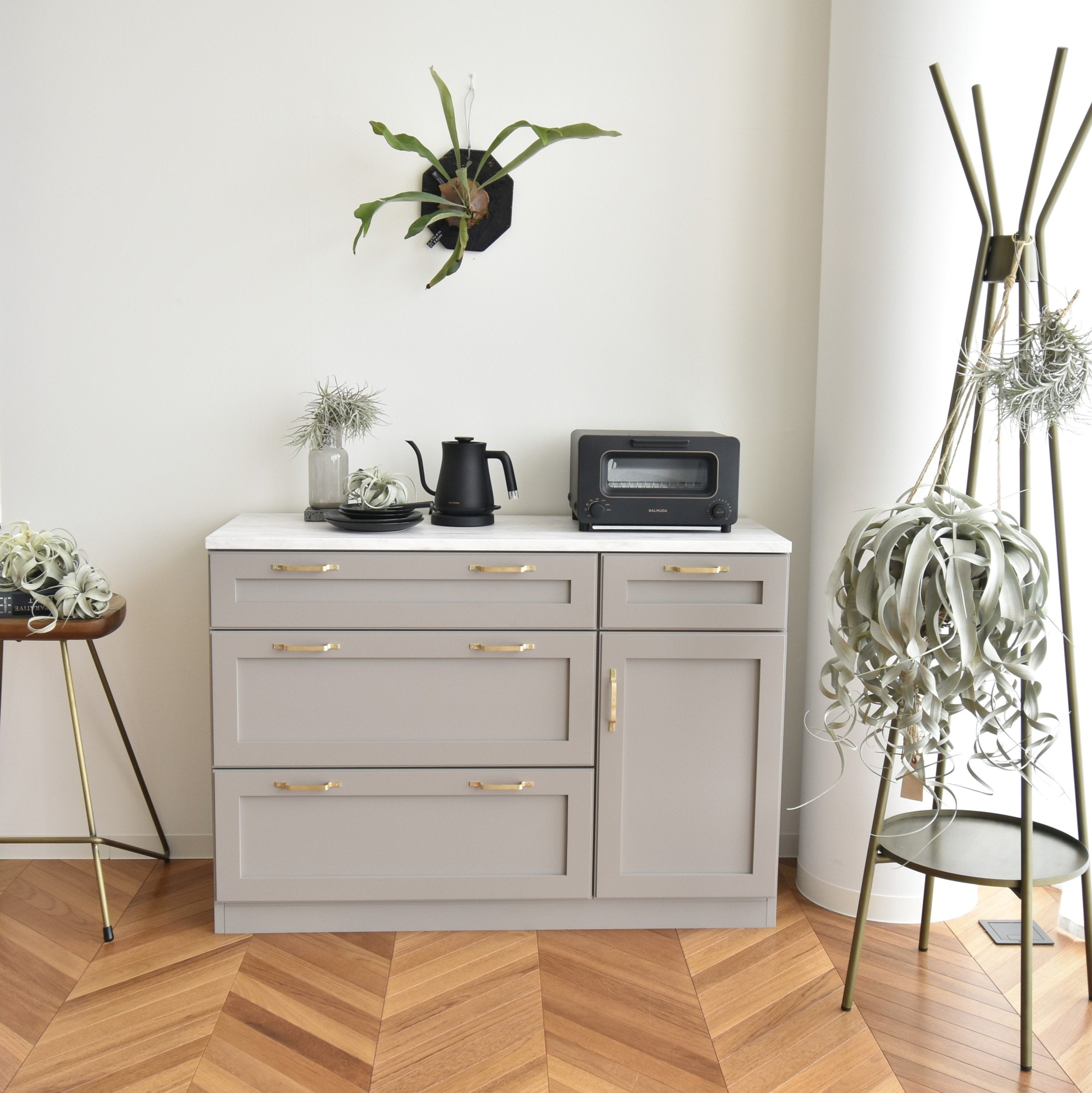 落ち着いたグレーカラーと真鍮の取っ手の組み合わせが、レトロモダンな雰囲気を演出するキッチンカウンターです。広々とした天板と充実した収納でキッチン周りのものをスッキリ片付けられます。