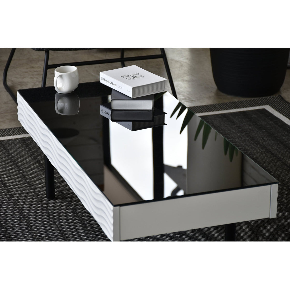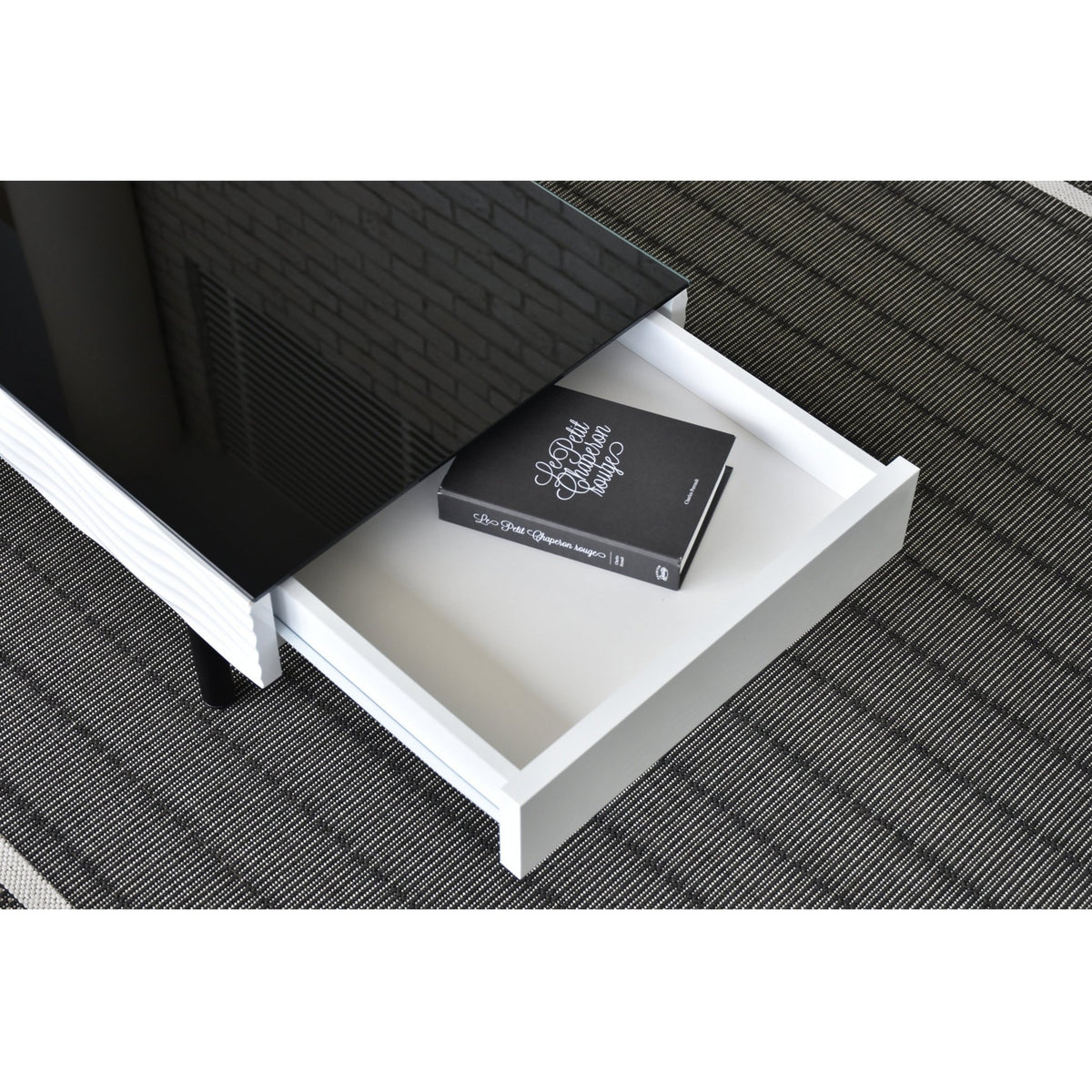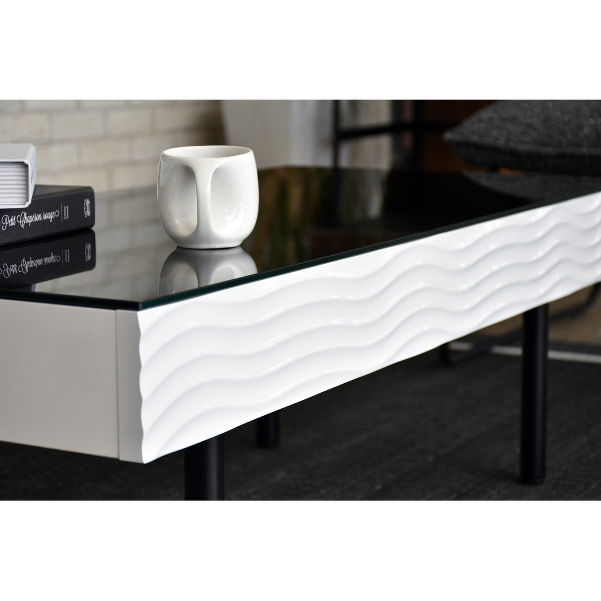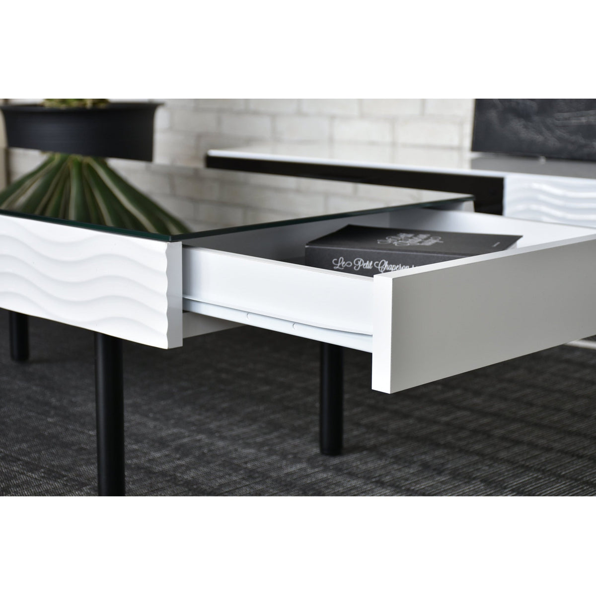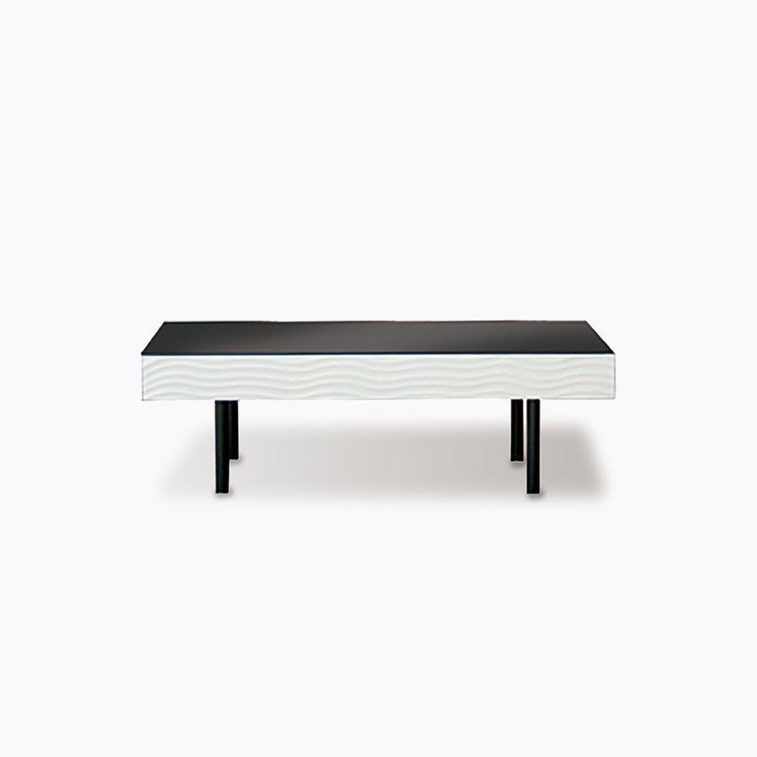 ホワイトとブラックのコントラストが美しいシュールシリーズのテーブルです。テーブル側面部分は、ウェーブデザインが施されているので、個性的かつおしゃれな印象を与えてくれます。テーブル天板ガラスには飛散防止フィルムが貼ってありますので、安全製も確保しています。またテーブル側面部分には引き出しが備わっており、テーブル周りの小物や雑誌などを収納でき、散らかりやすいテーブル上もすっきり片付きます。脚部分はスタイリッシュなフォルムなので、おしゃれ感のあるテーブルとなっております。