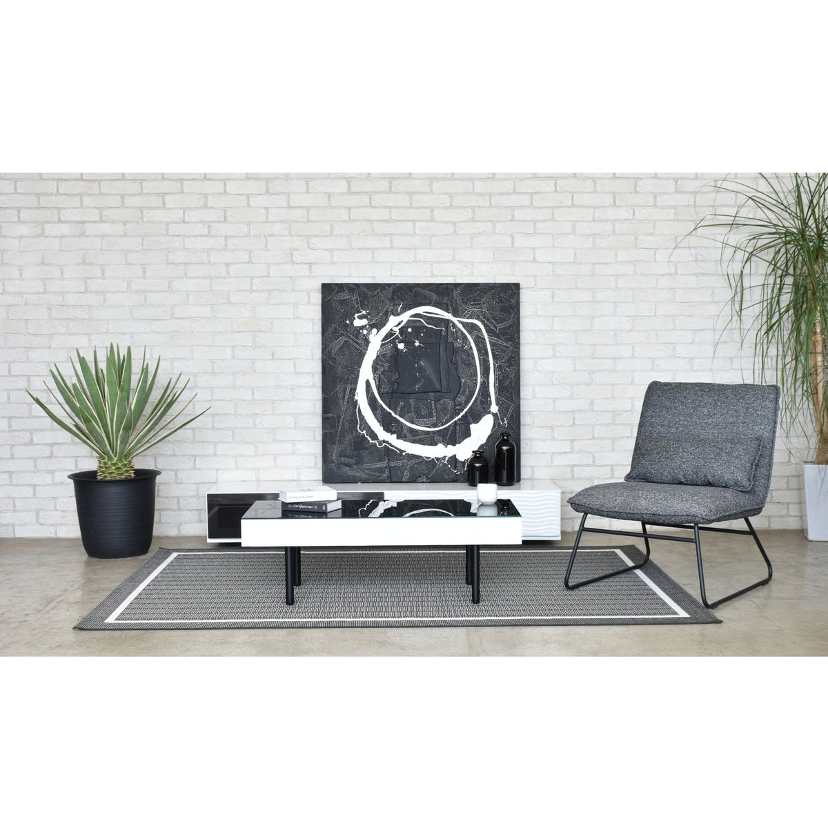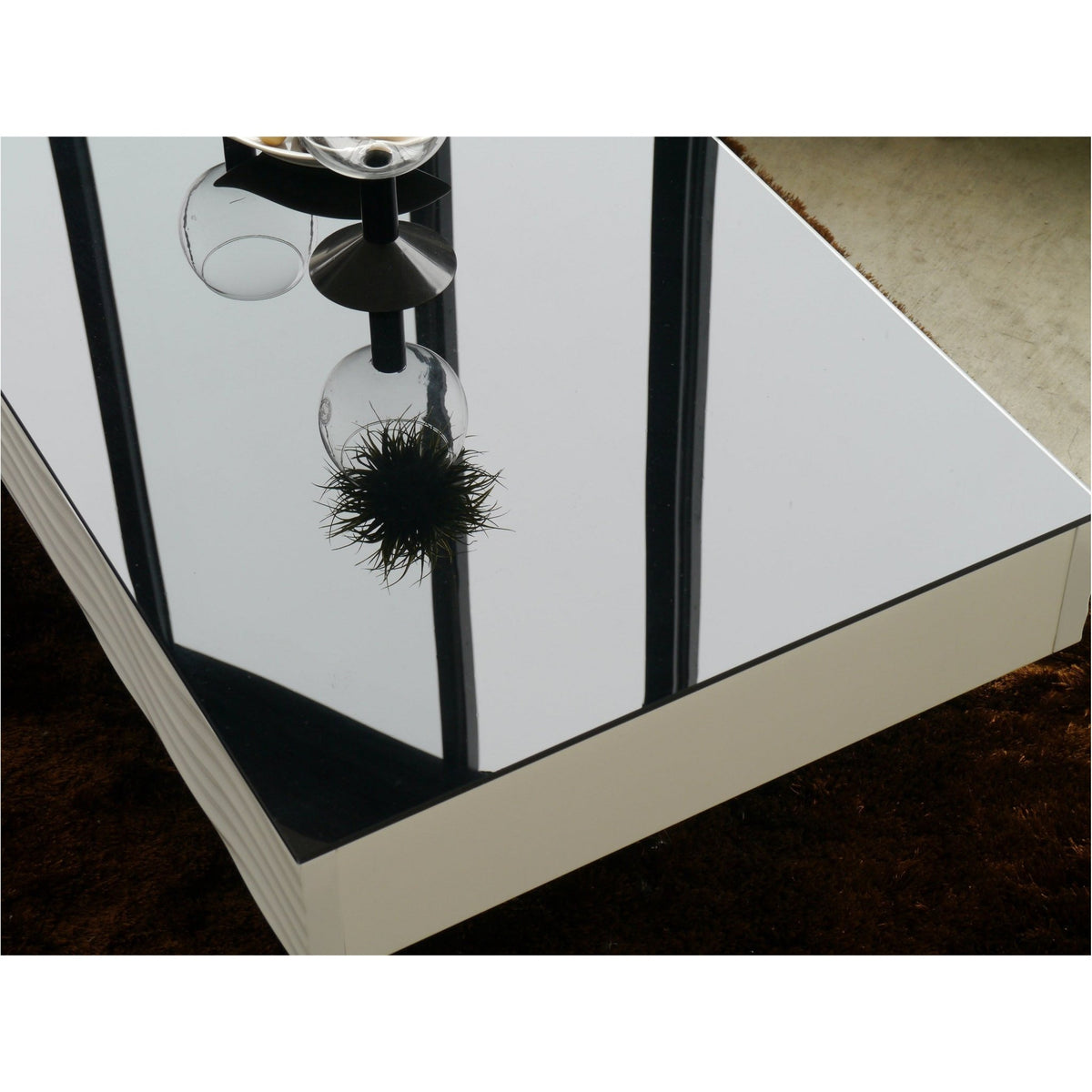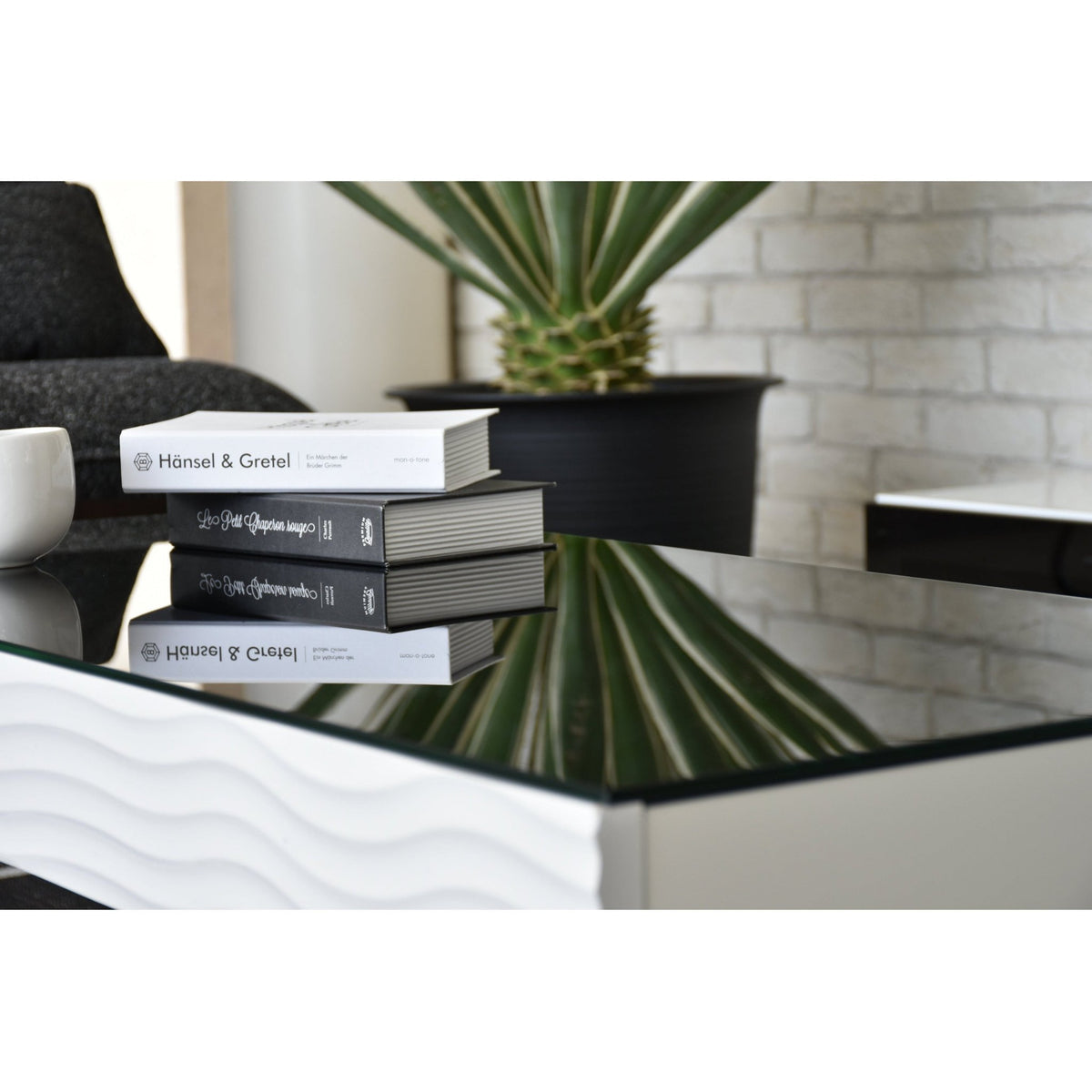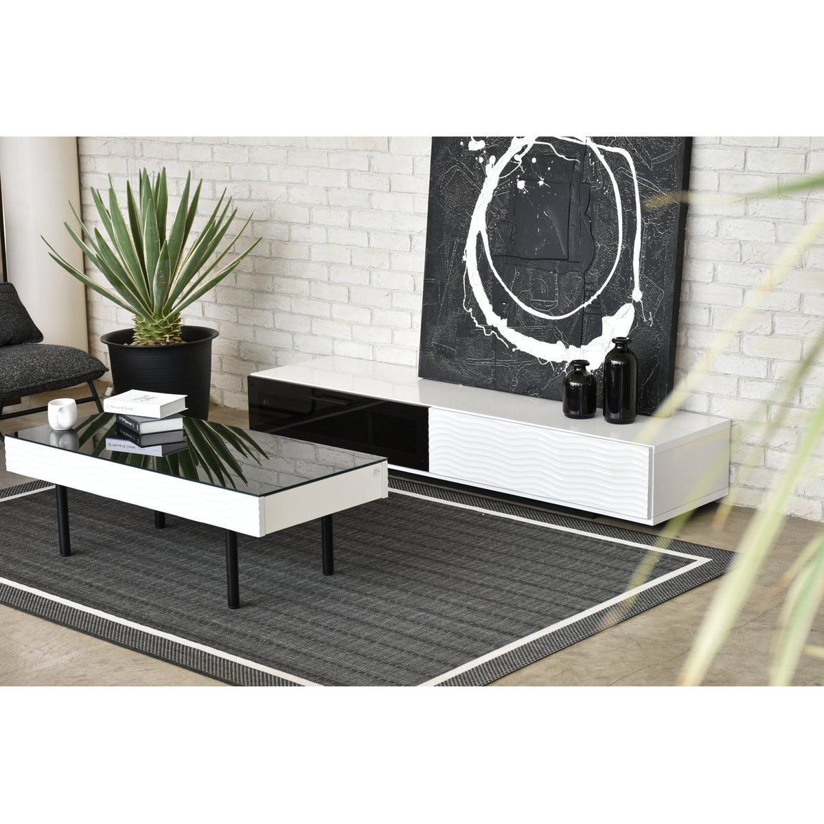 ホワイトとブラックのコントラストが美しいシュールシリーズのテーブルです。テーブル側面部分は、ウェーブデザインが施されているので、個性的かつおしゃれな印象を与えてくれます。テーブル天板ガラスには飛散防止フィルムが貼ってありますので、安全製も確保しています。またテーブル側面部分には引き出しが備わっており、テーブル周りの小物や雑誌などを収納でき、散らかりやすいテーブル上もすっきり片付きます。脚部分はスタイリッシュなフォルムなので、おしゃれ感のあるテーブルとなっております。