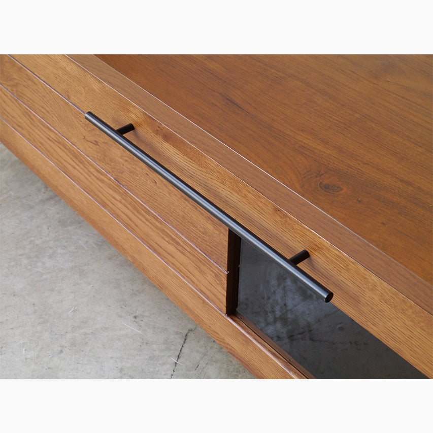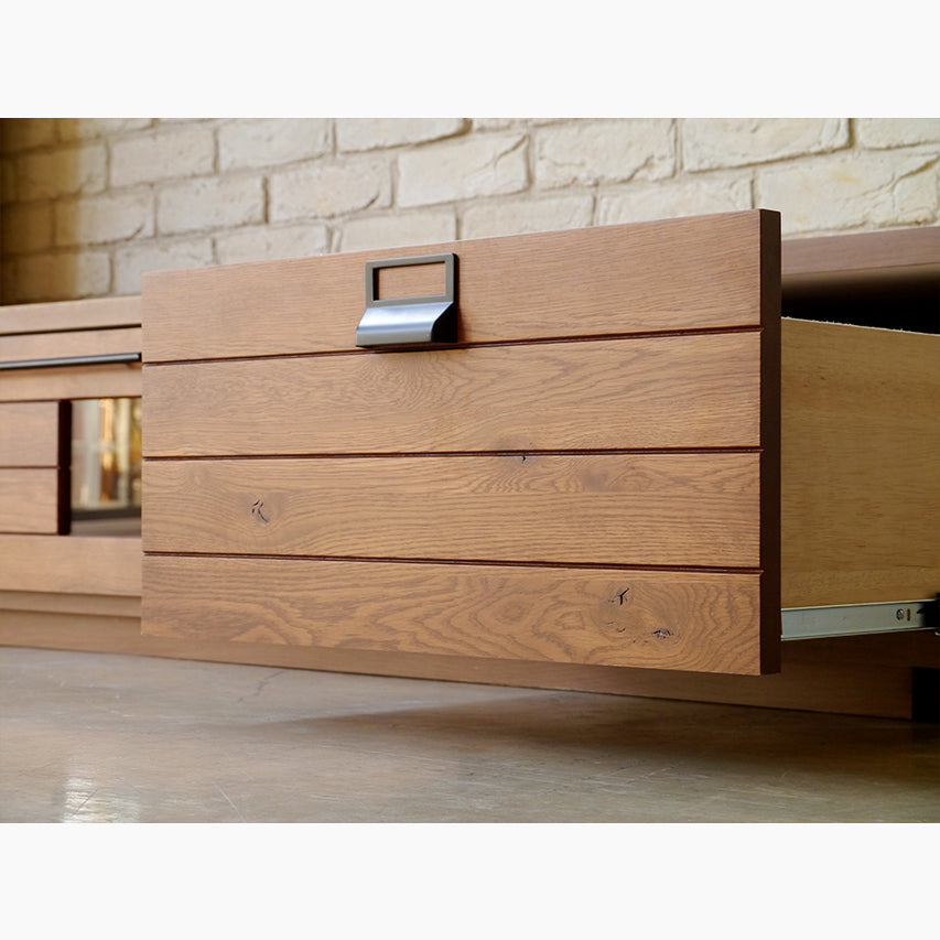 オーク無垢材の北欧的な表情を活かし、前板のデザインにインダストリアルな雰囲気を持たせたローボードです。扉や引出前板にスリットを施し立体的なデザインにすることで、オーク無垢の美しさが映えています。素材感が美しいオーク材は、高級感があり、硬く耐久性に優れていて長くお使えいただけます。シンプルなデザインですが、取手部にトレンドであるインダストリアルテイストを取り込み、北欧デザインでありながら引き締まった表情になっています。