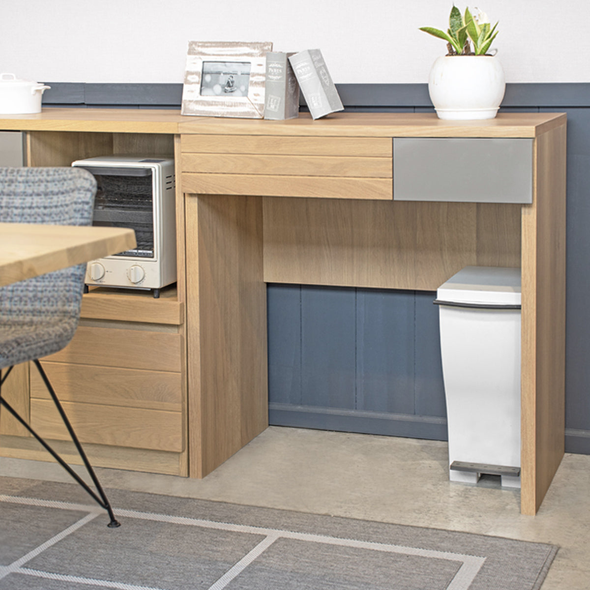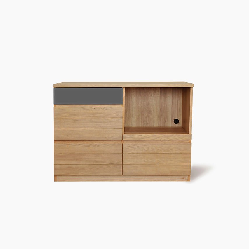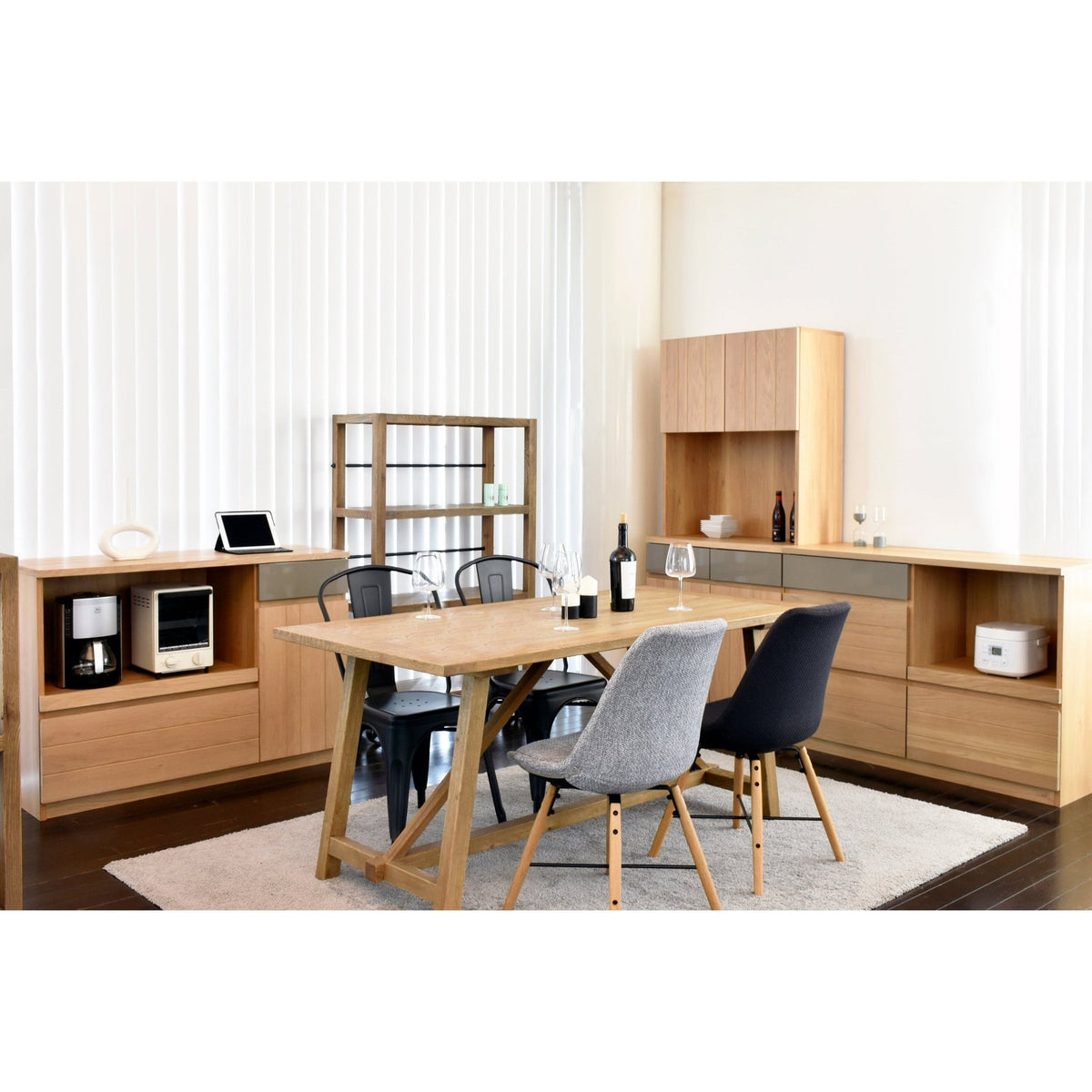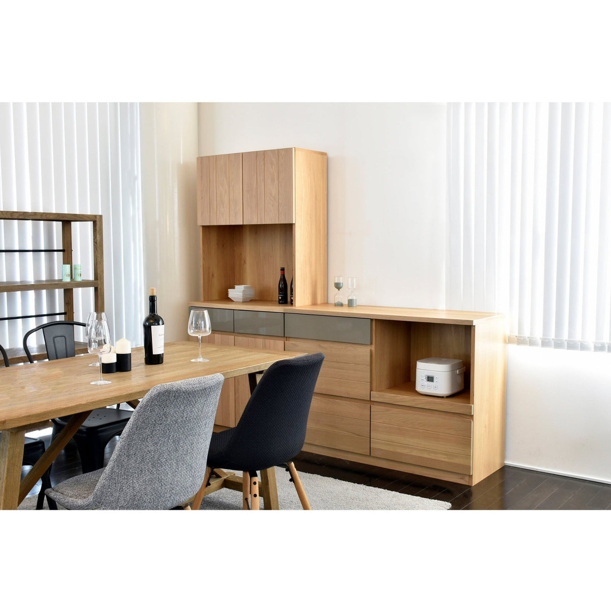 シンプルなデザインと北欧テイストのグレー前板が特徴のカップボードです。主張しすぎない絶妙な配色バランスで上品なイメージを演出しています。取っ手が見えないデザインもすっきりとした印象です。前板にはオイル塗装を施したオーク無垢材を使用しているので、温かみのある雰囲気も感じられます。