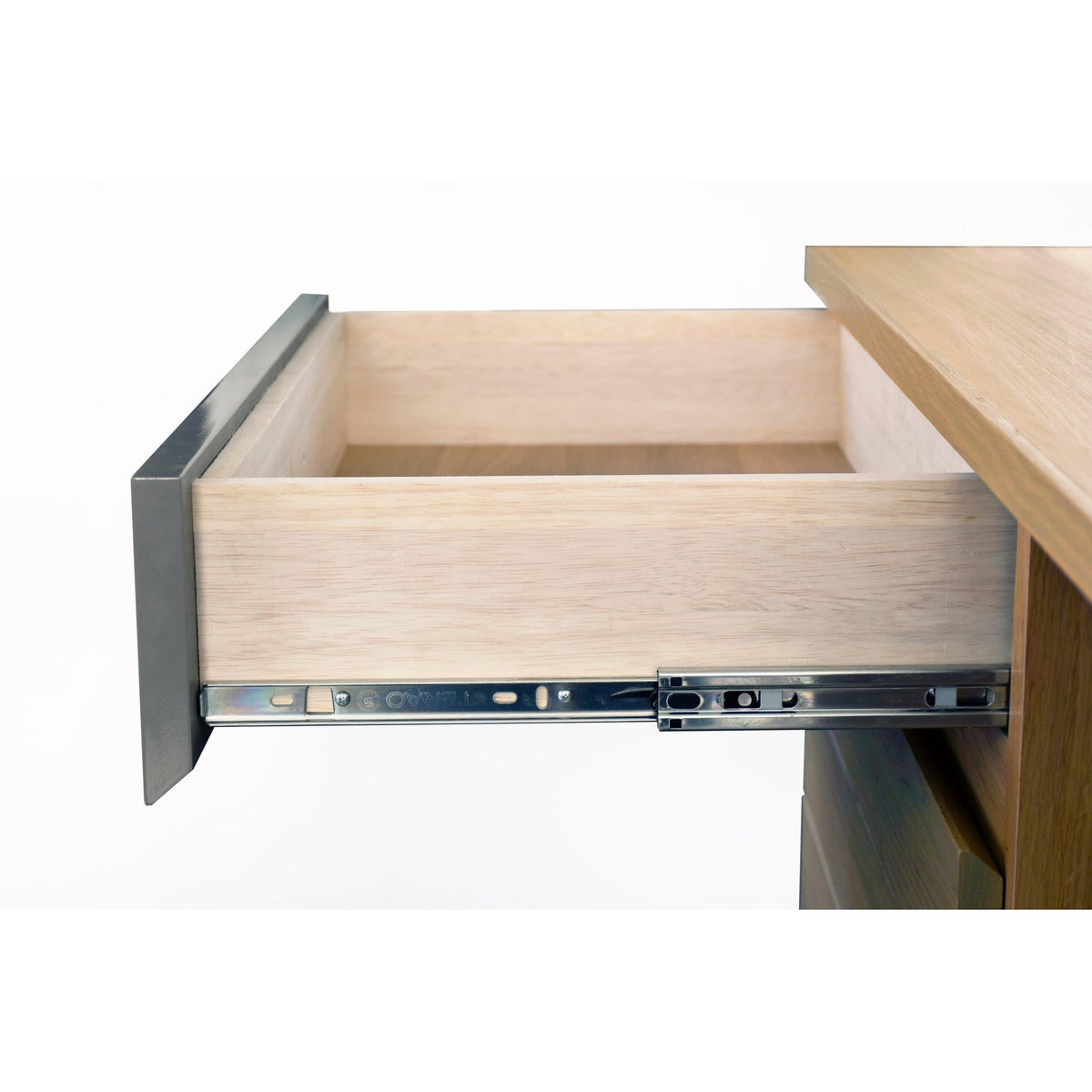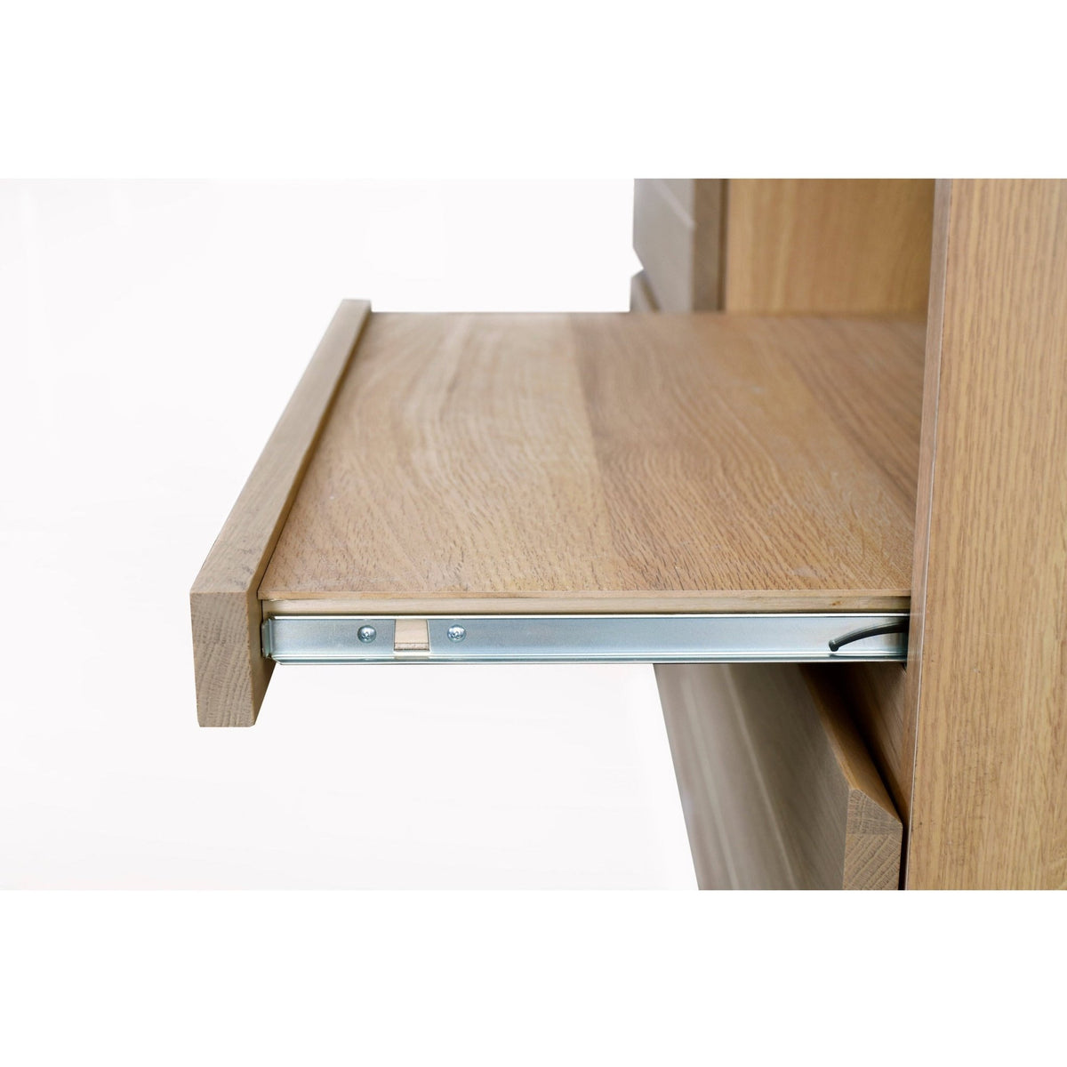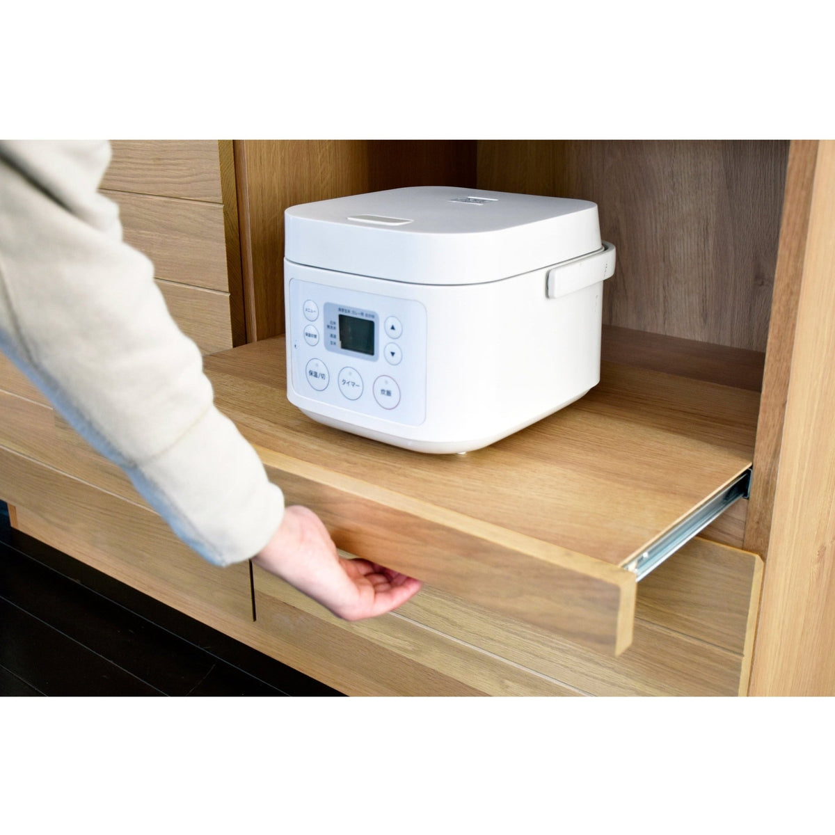 シンプルなデザインと北欧テイストのグレー前板が特徴のカップボードです。主張しすぎない絶妙な配色バランスで上品なイメージを演出しています。取っ手が見えないデザインもすっきりとした印象です。前板にはオイル塗装を施したオーク無垢材を使用しているので、温かみのある雰囲気も感じられます。
