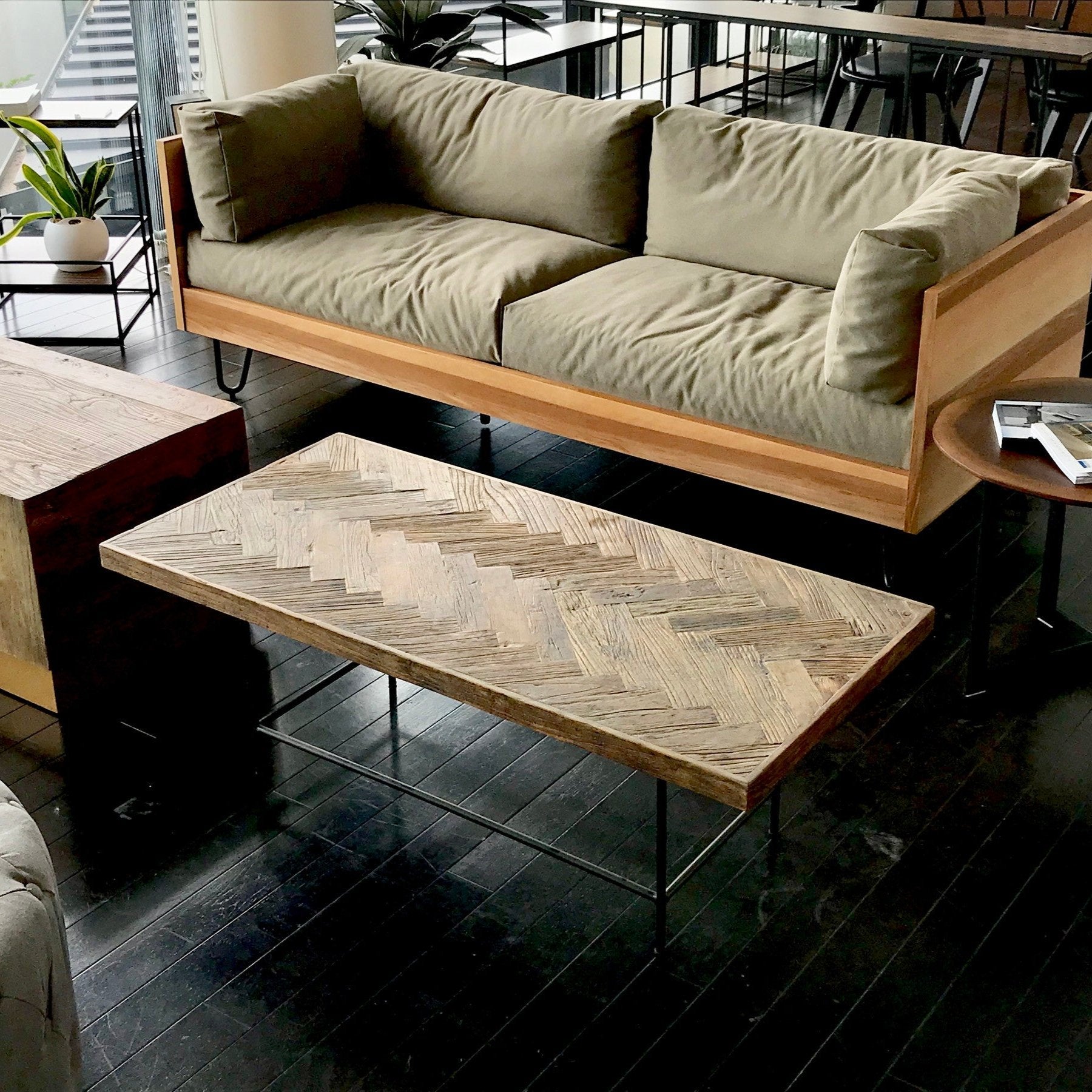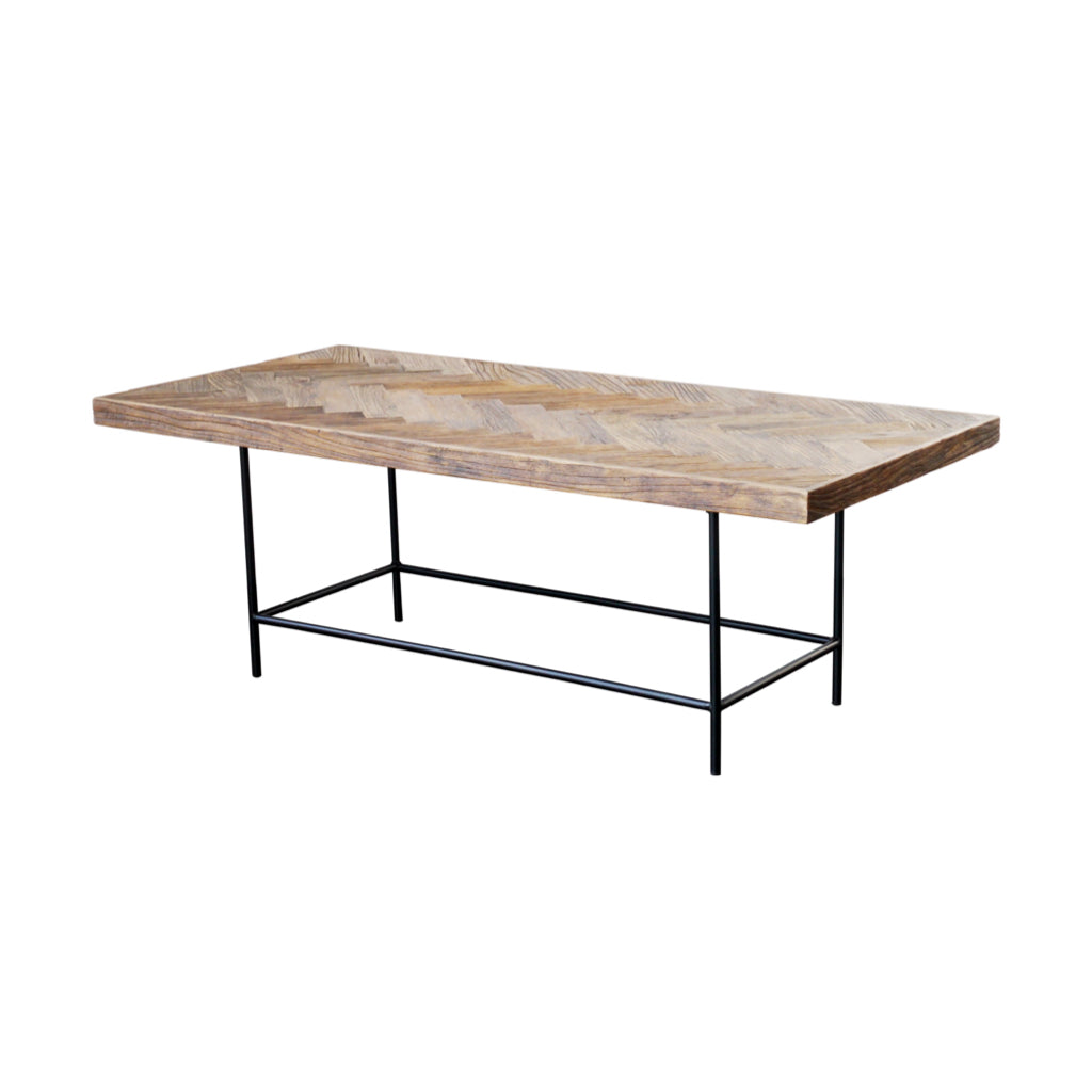 エルム単板をヘリンボーン状に組み合わせた個性的な天板に、繊細なスチールの脚を合わせたリビングテーブルです。
