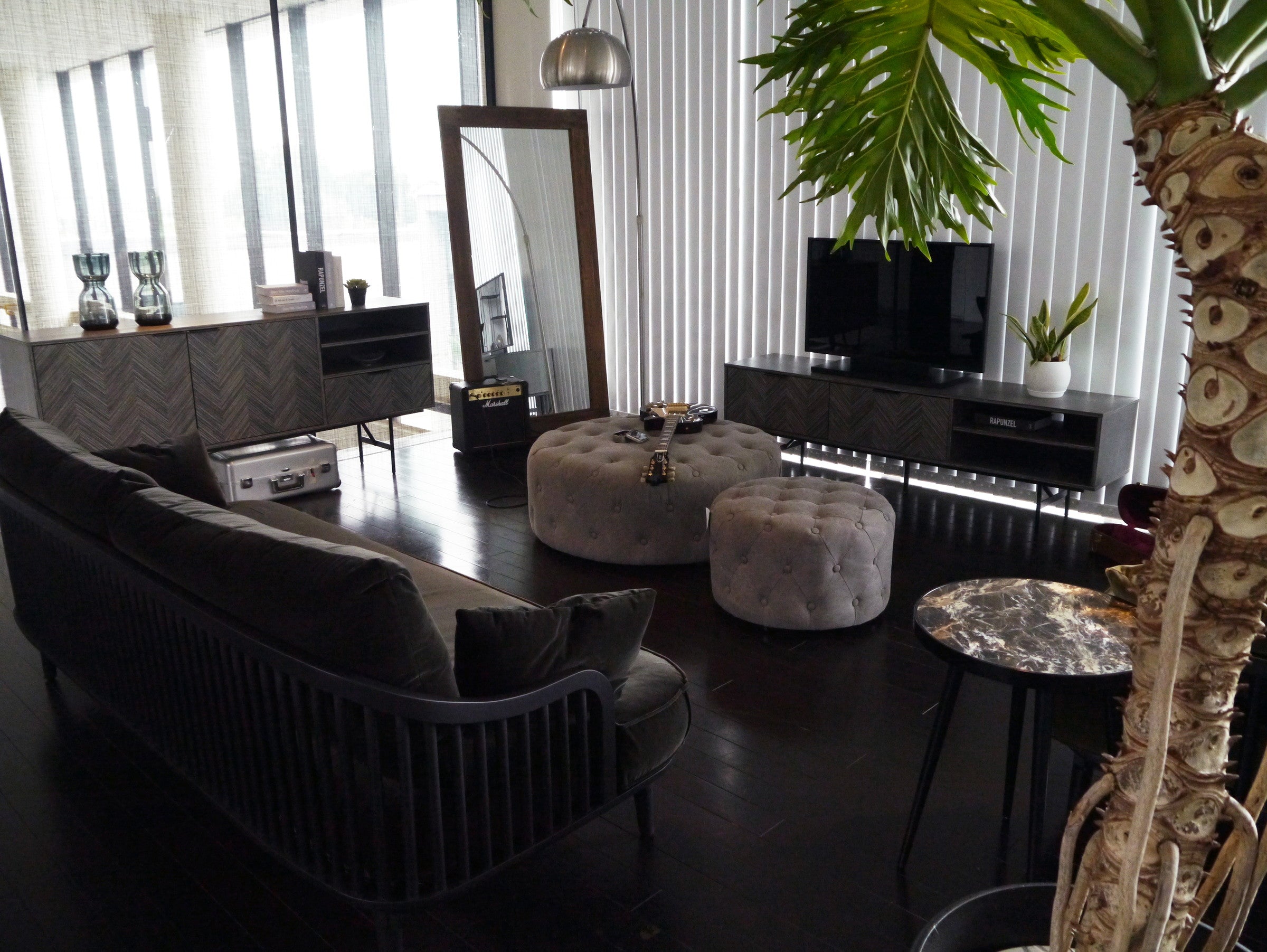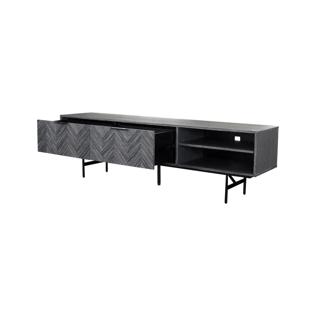 シャープで北欧モダンなヘリンボーン柄の突板を合わせたテレビボードです。スチール脚とアシンメトリーな扉のバランスが非常に美しく、まるでアートのようなデザインに仕上がりました。スタイリッシュで高級感のあるヘリンボーン柄を前扉に採用しています。存在感のある柄とリビングで映えるデザインで重厚な高級感のある空間を演出してくれます。