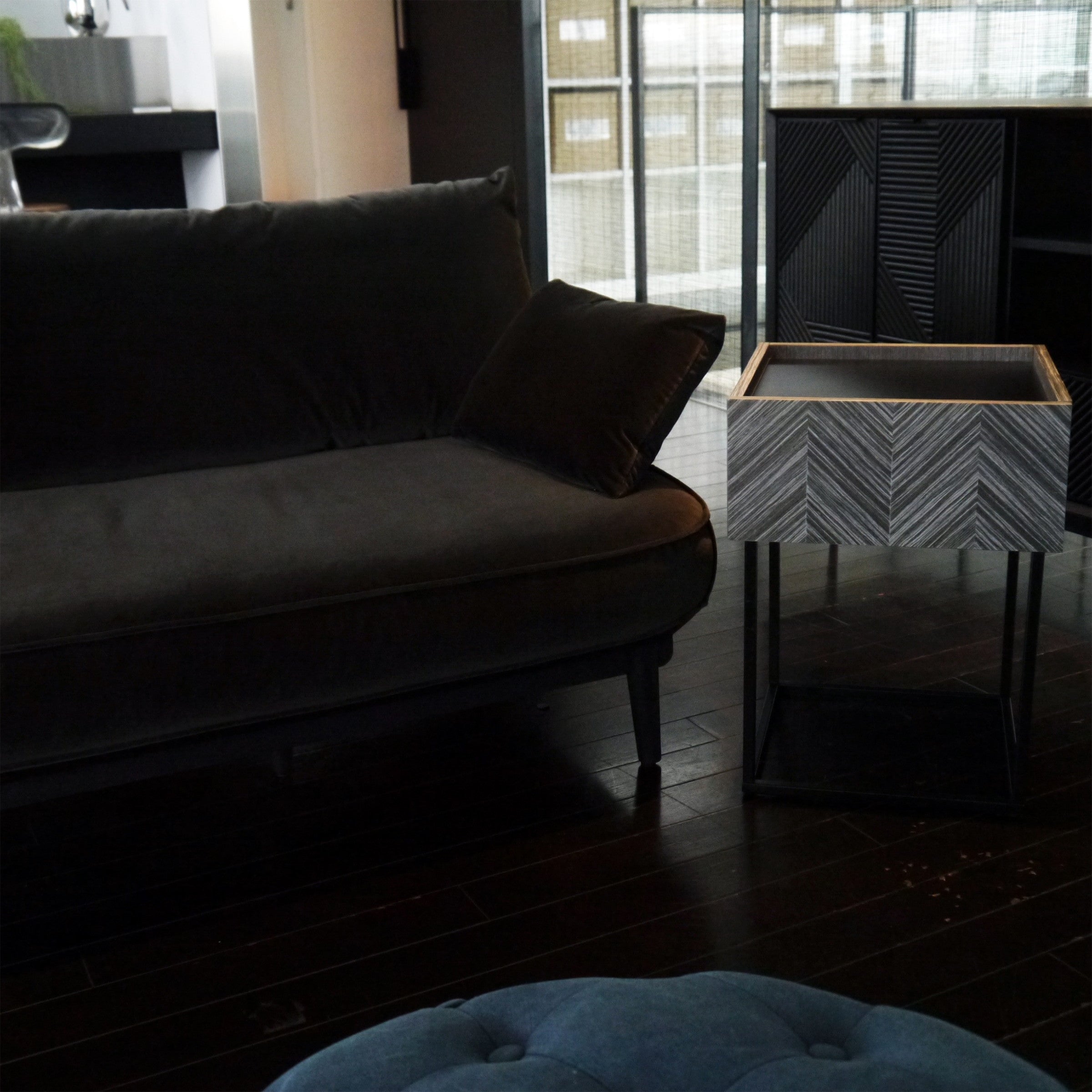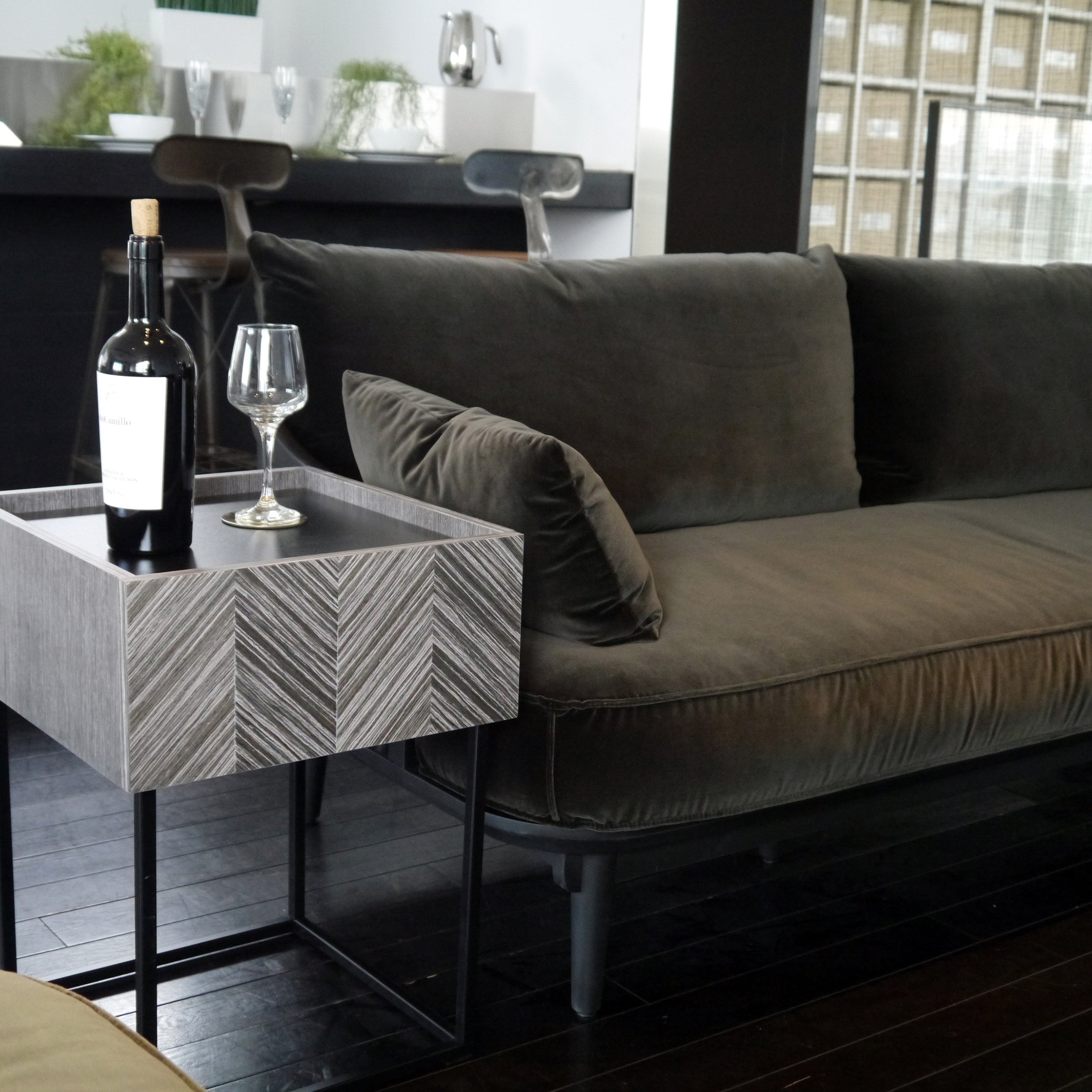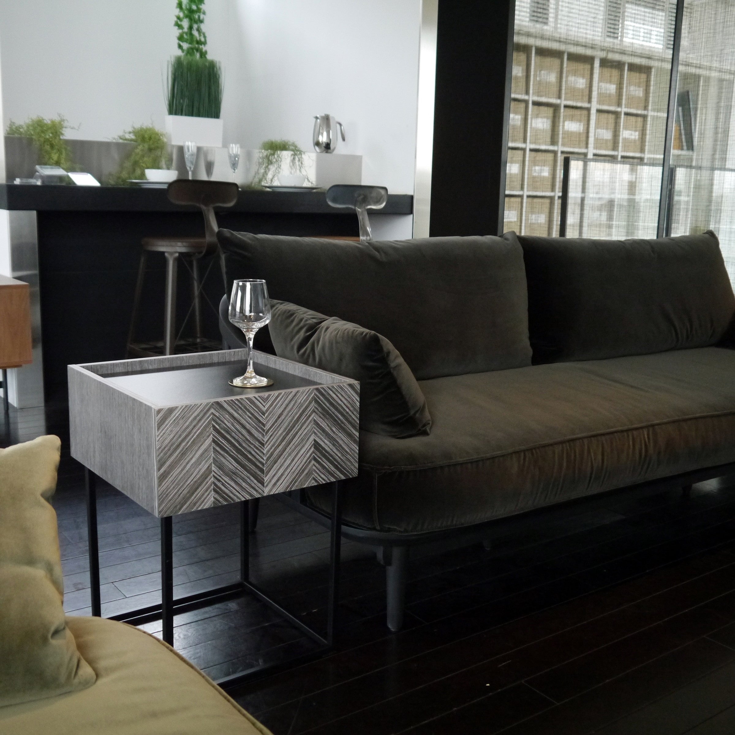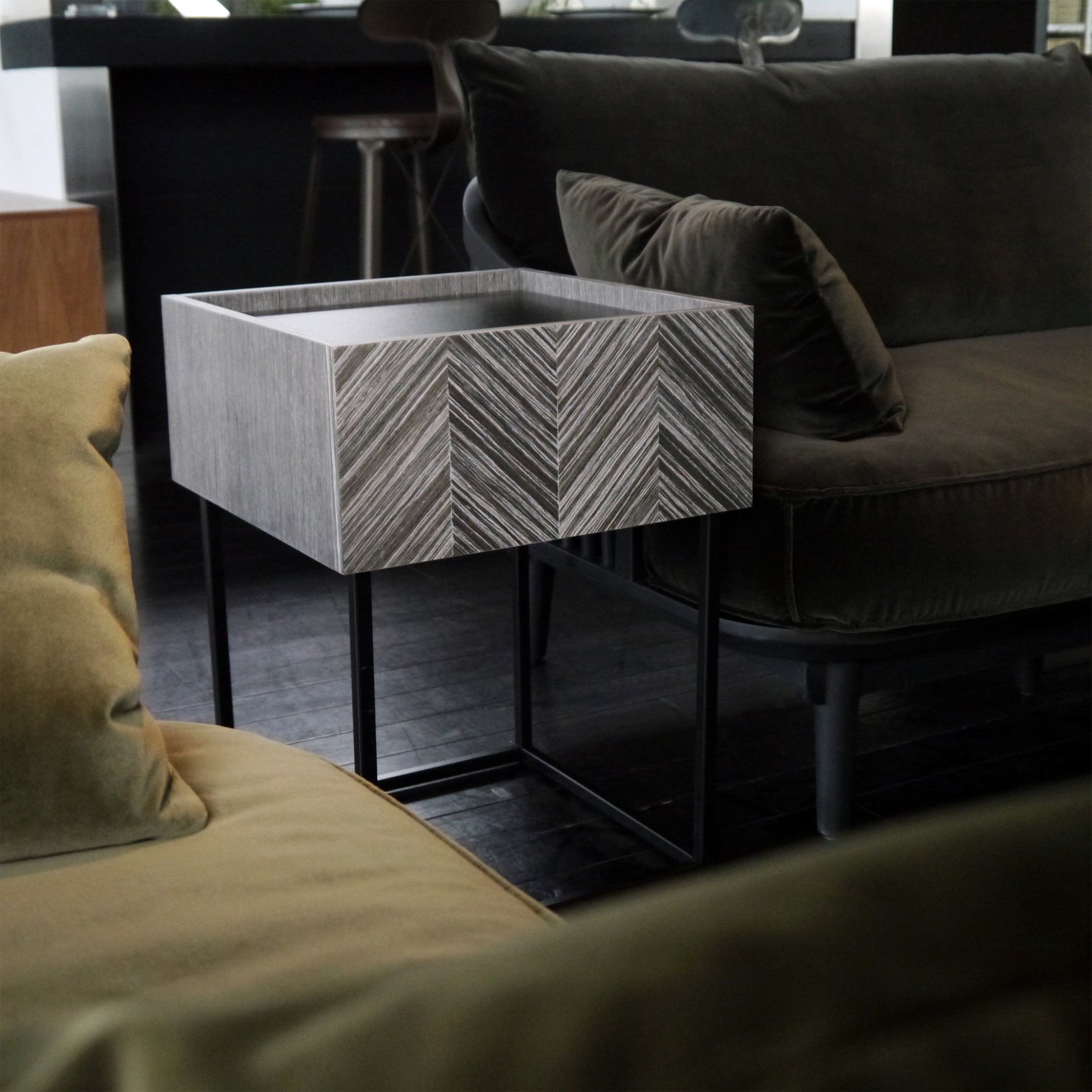ソファサイドやベッドサイドなど、場所を選ばず使いやすく、どこに置かれても絵になる佇まいを持ったサイドテーブルです。グレーに染色された人口突板を矢羽根貼りし、美しい表情を創り出す前板と、その表情を活かすミニマルな構成と繊細さを持ったデザインシリーズです。