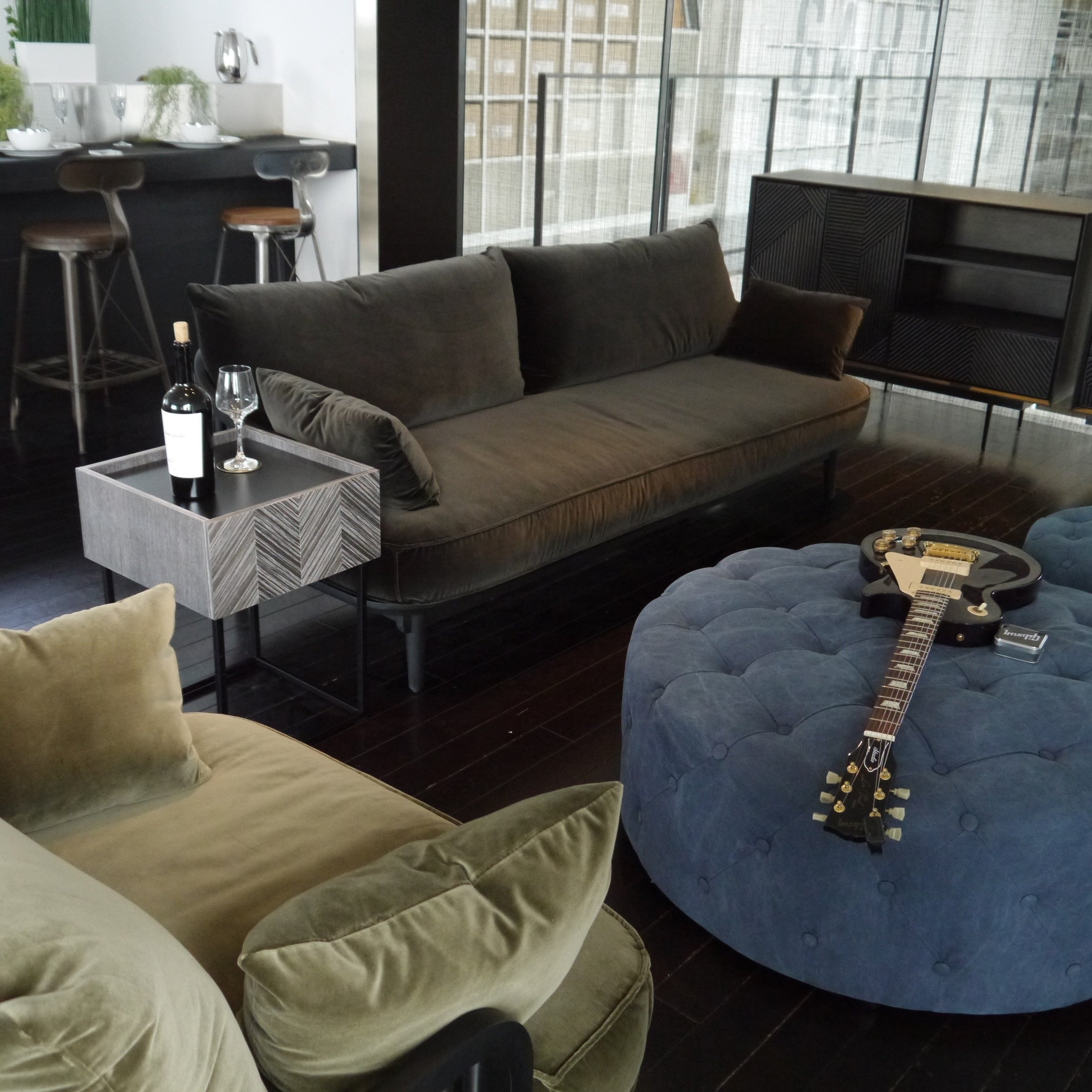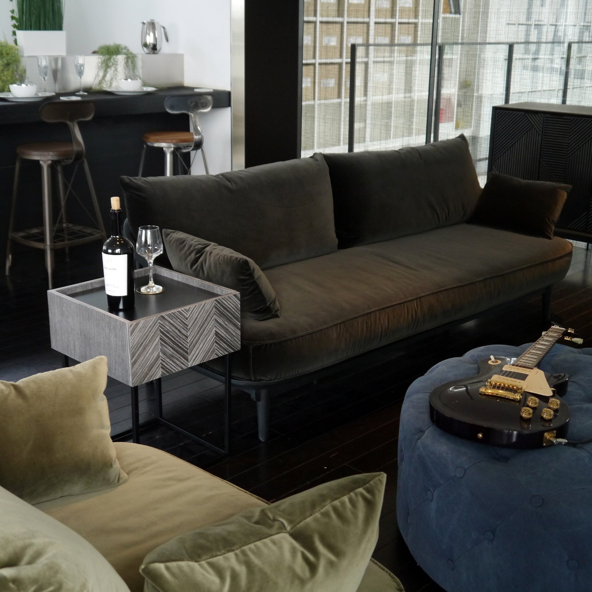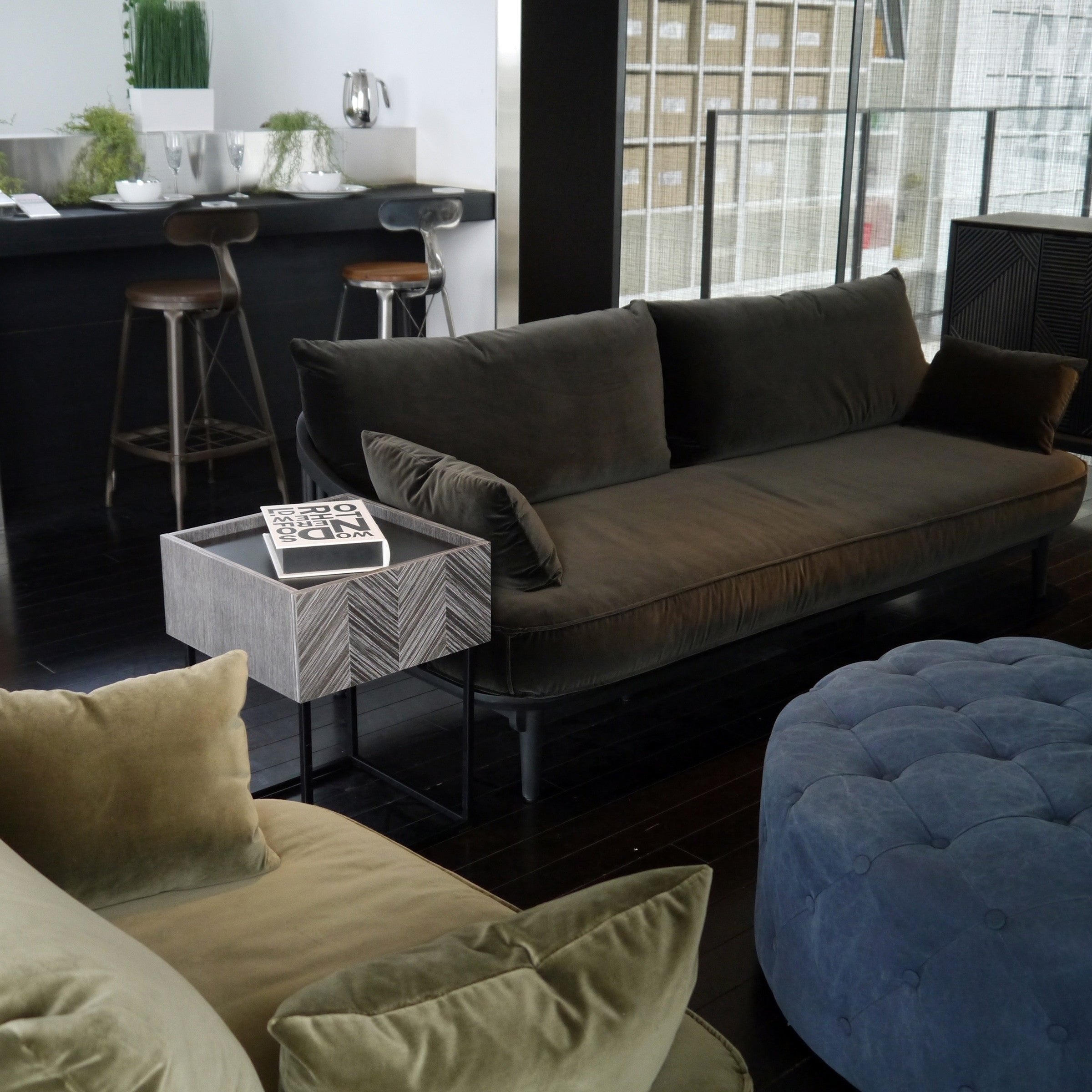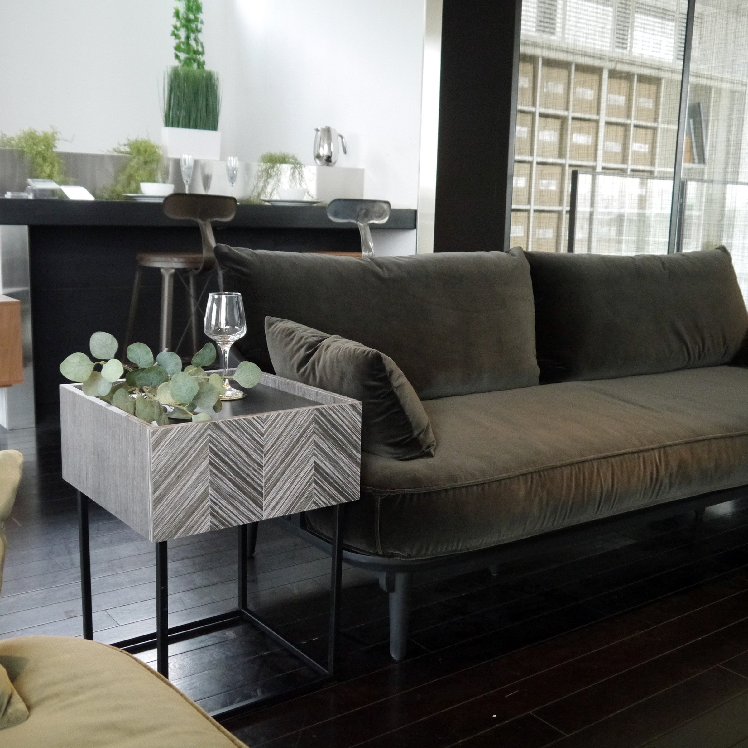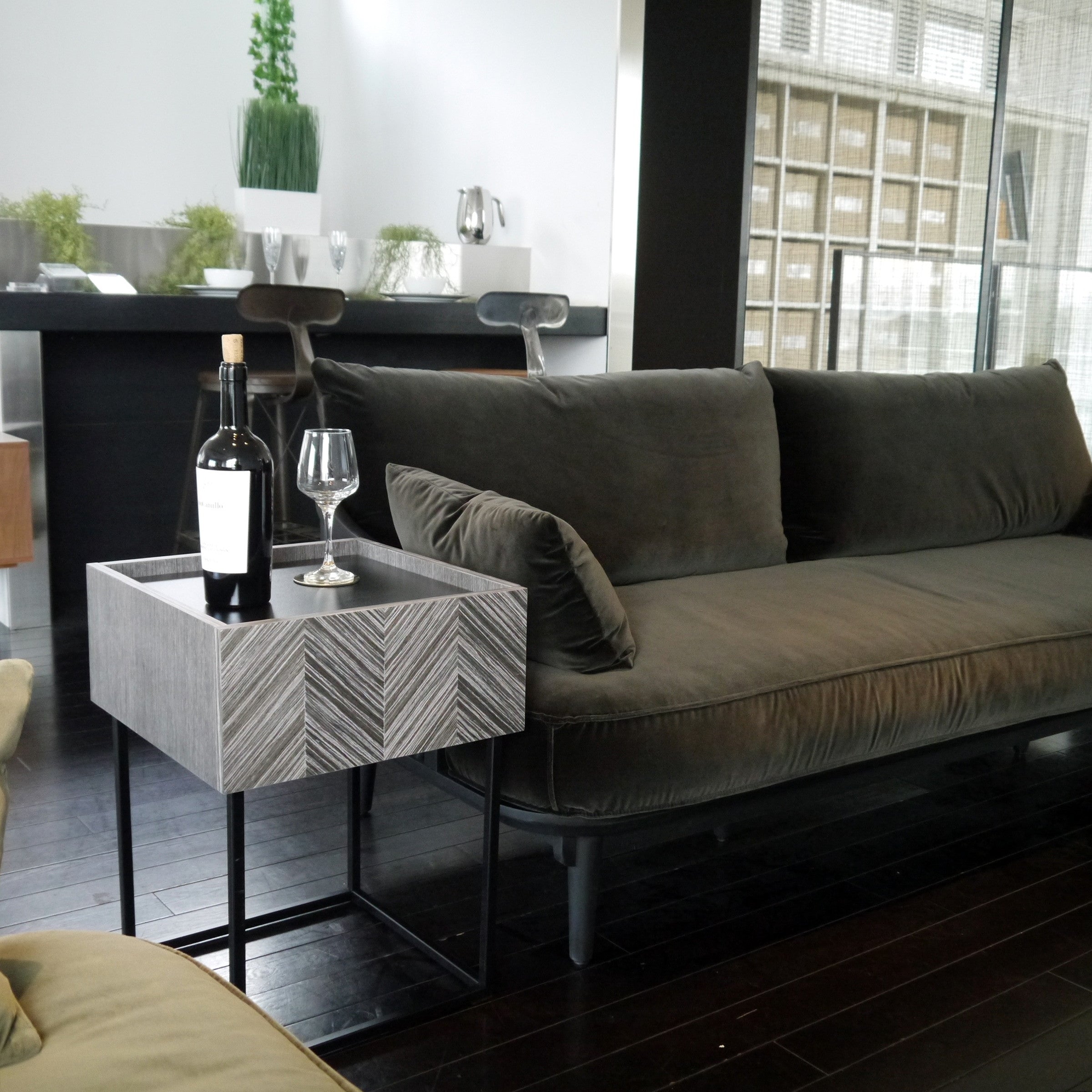ソファサイドやベッドサイドなど、場所を選ばず使いやすく、どこに置かれても絵になる佇まいを持ったサイドテーブルです。グレーに染色された人口突板を矢羽根貼りし、美しい表情を創り出す前板と、その表情を活かすミニマルな構成と繊細さを持ったデザインシリーズです。