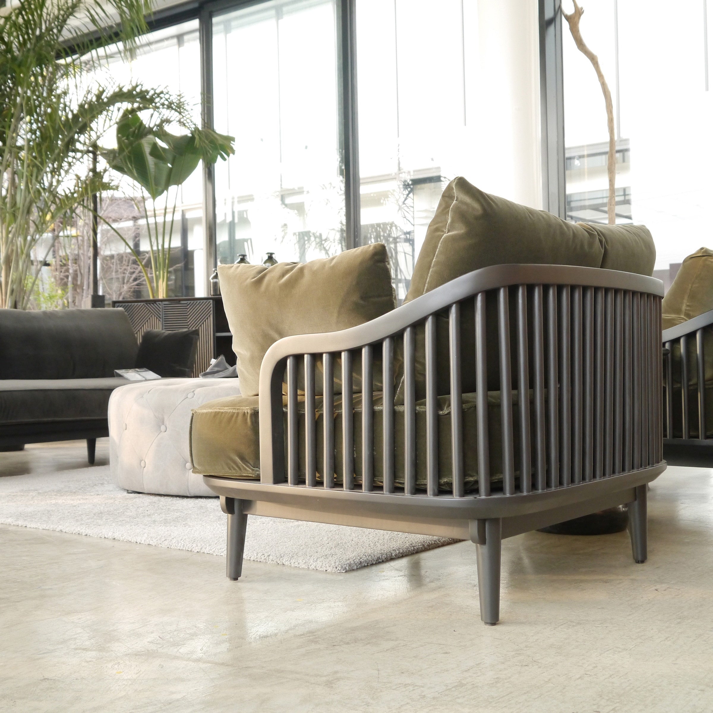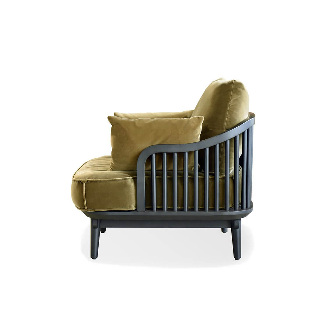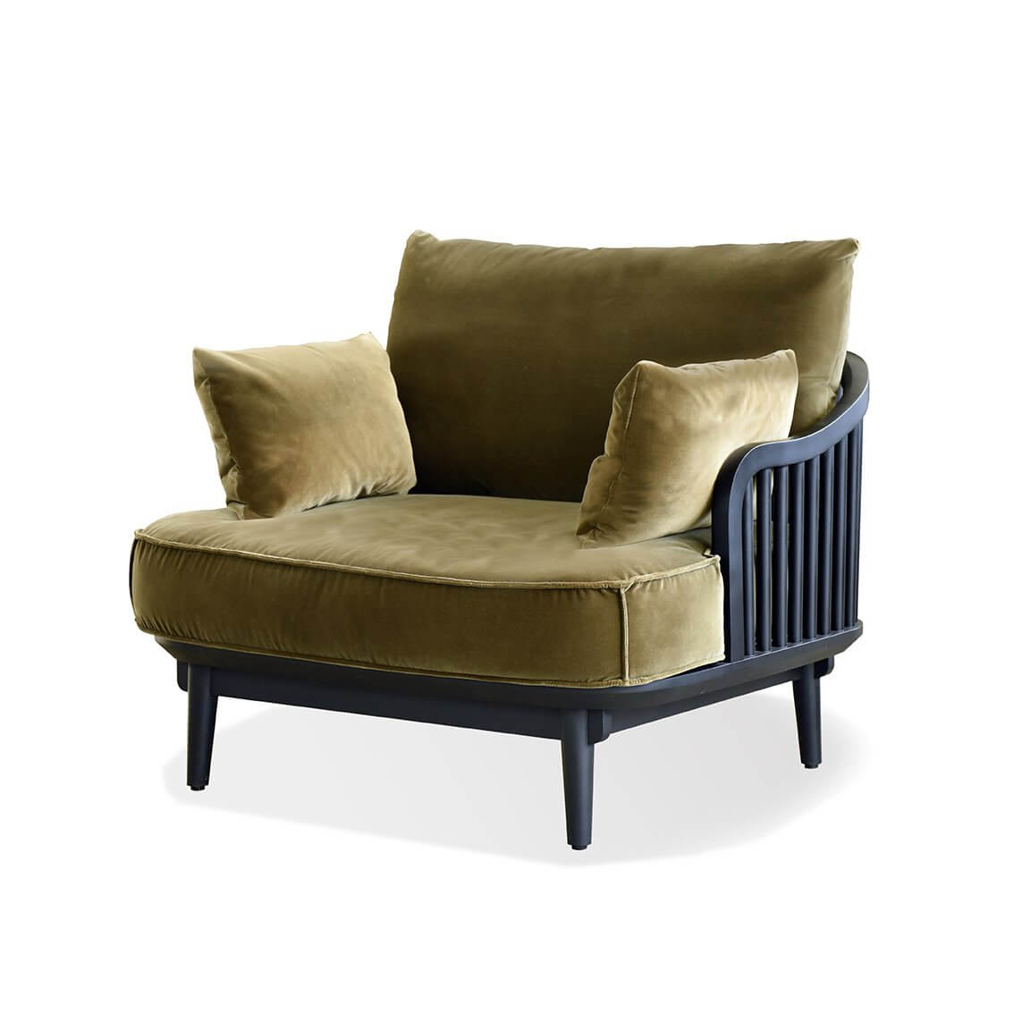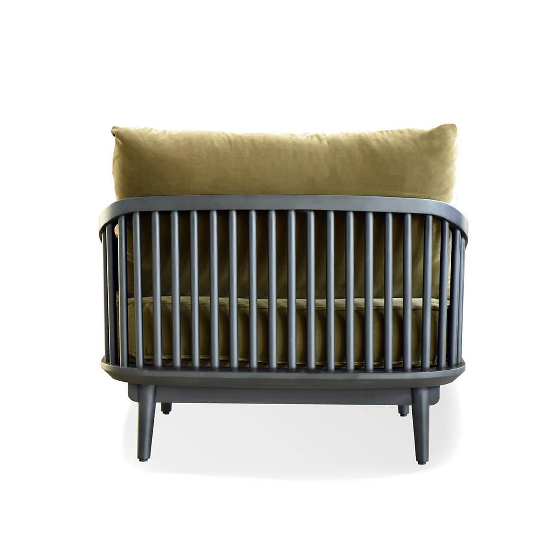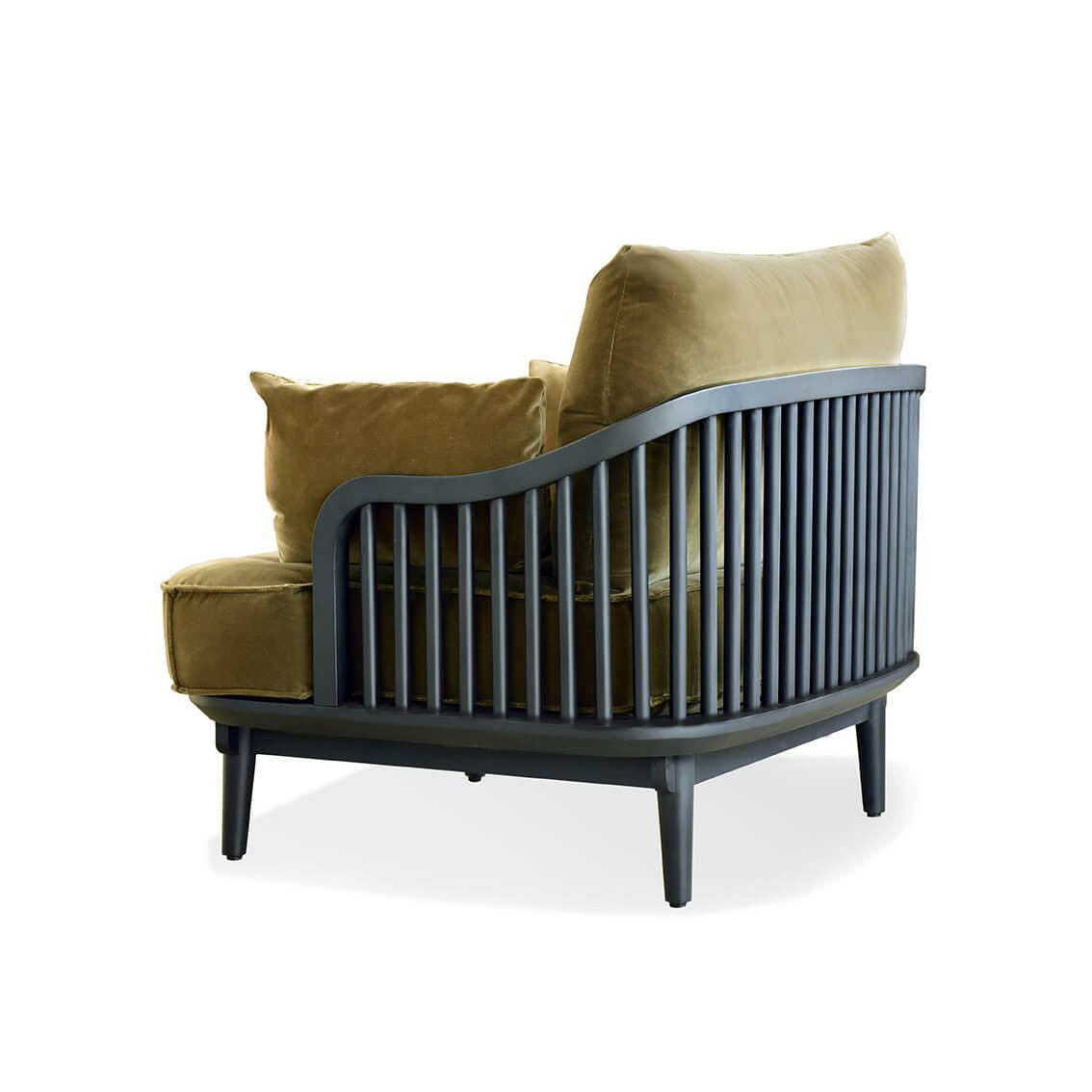 アームから背中までラウンドしてつながる笠木に、縦桟の連続性が美しい1人掛けソファです。マットな黒の質感と陰影が斜め後ろからの美しい表情を引き立てます。全ての張地を外すことができますが家庭用の洗濯機では洗濯ができないためご注意ください。