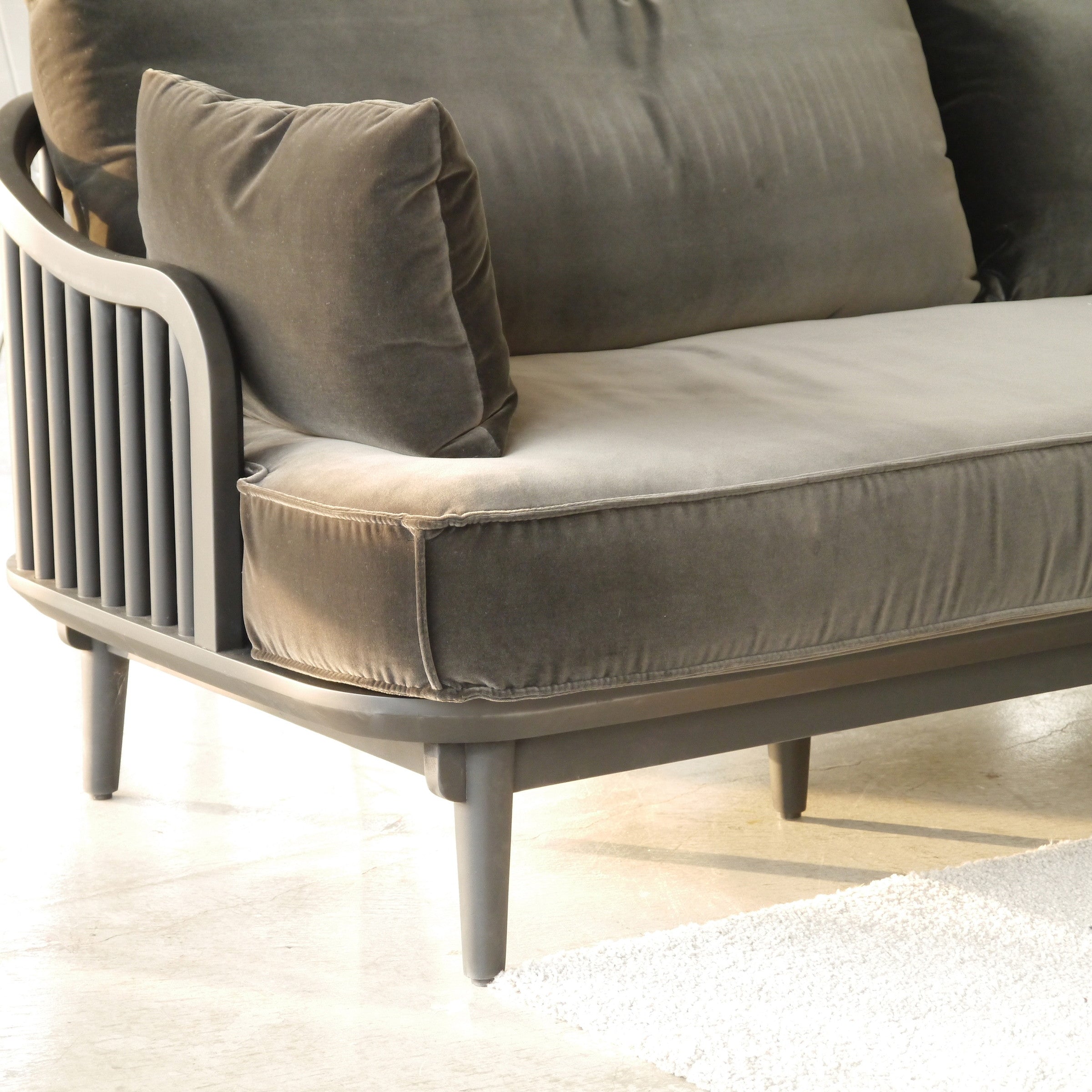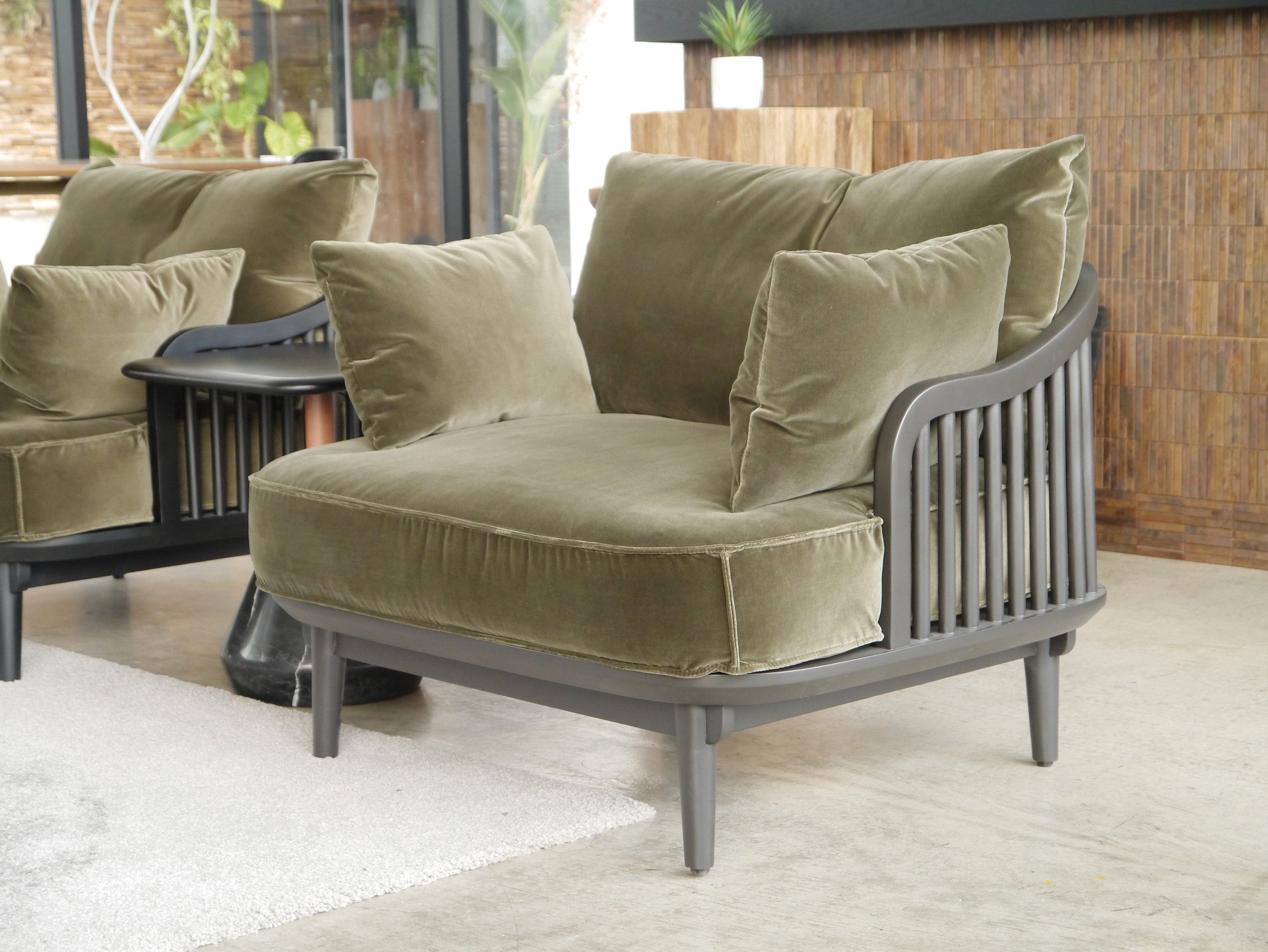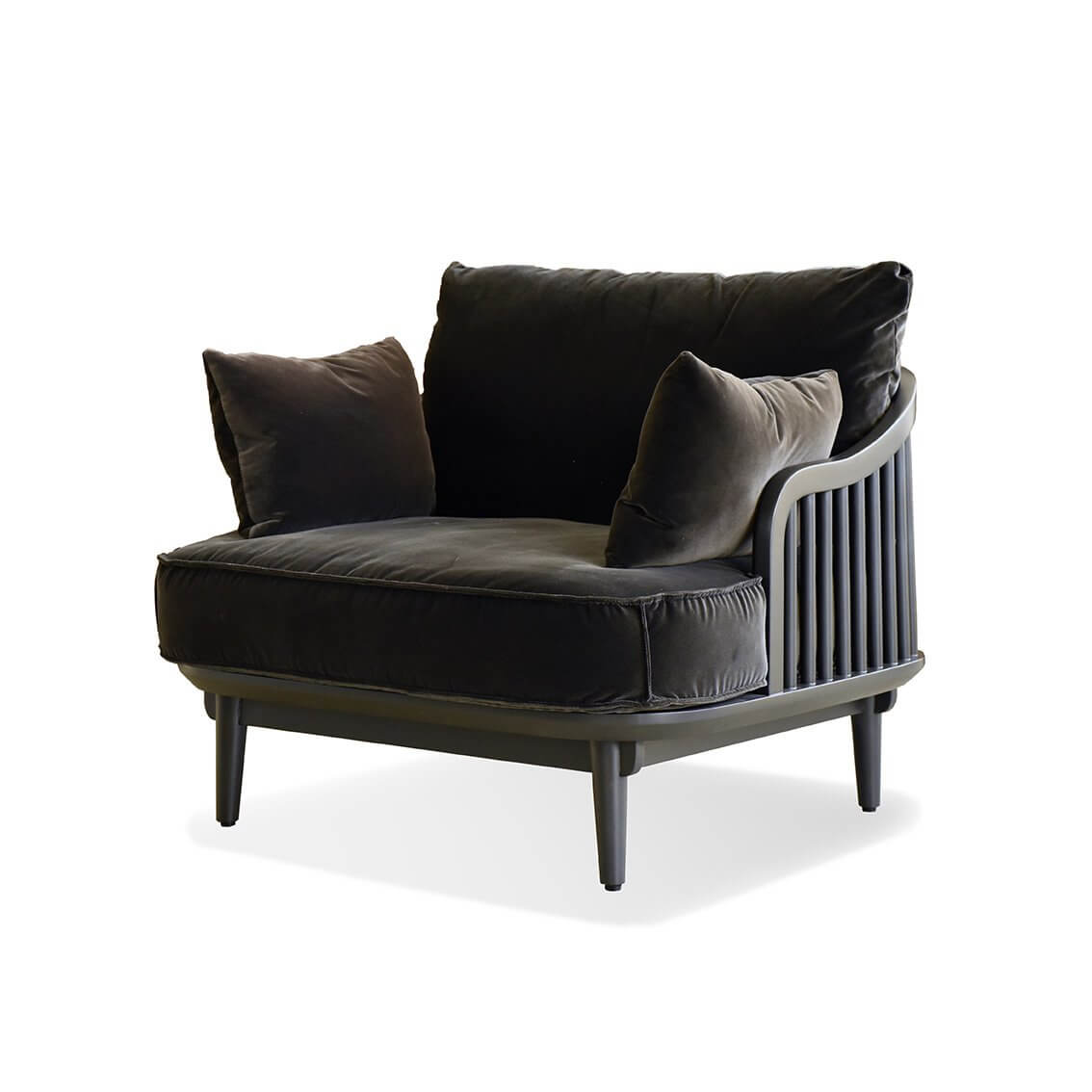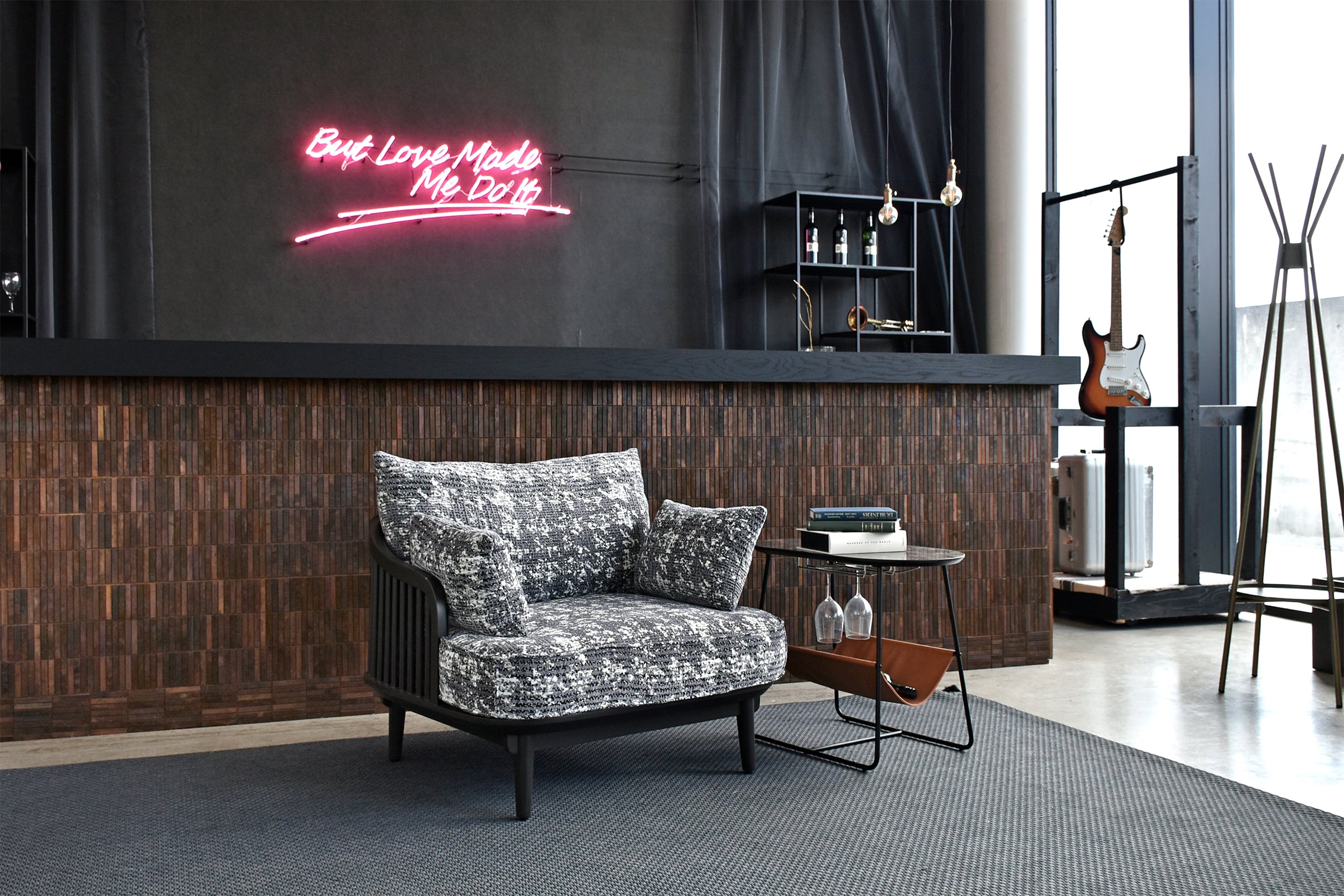 アームから背中までラウンドしてつながる笠木に、縦桟の連続性が美しい1人掛けソファです。マットな黒の質感と陰影が斜め後ろからの美しい表情を引き立てます。全ての張地を外すことができますが家庭用の洗濯機では洗濯ができないためご注意ください。
