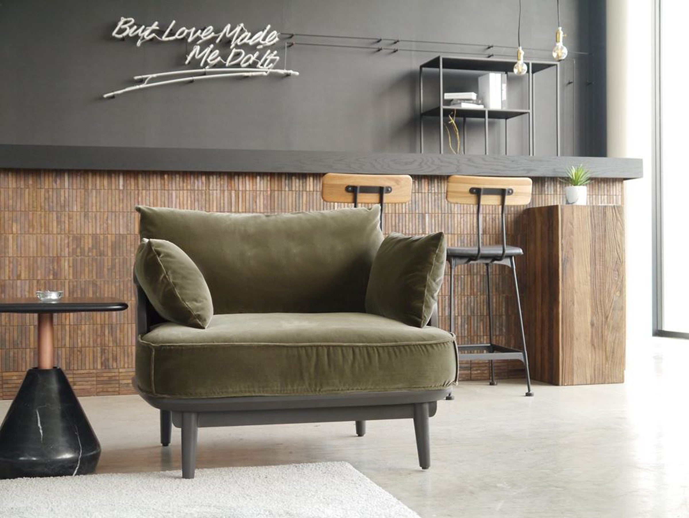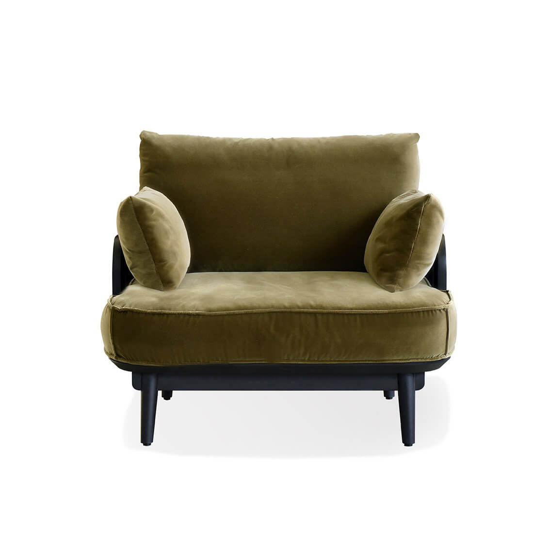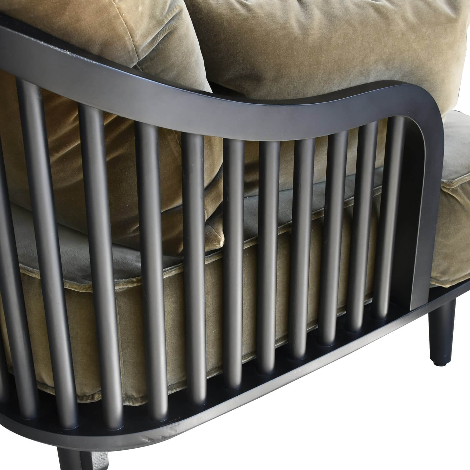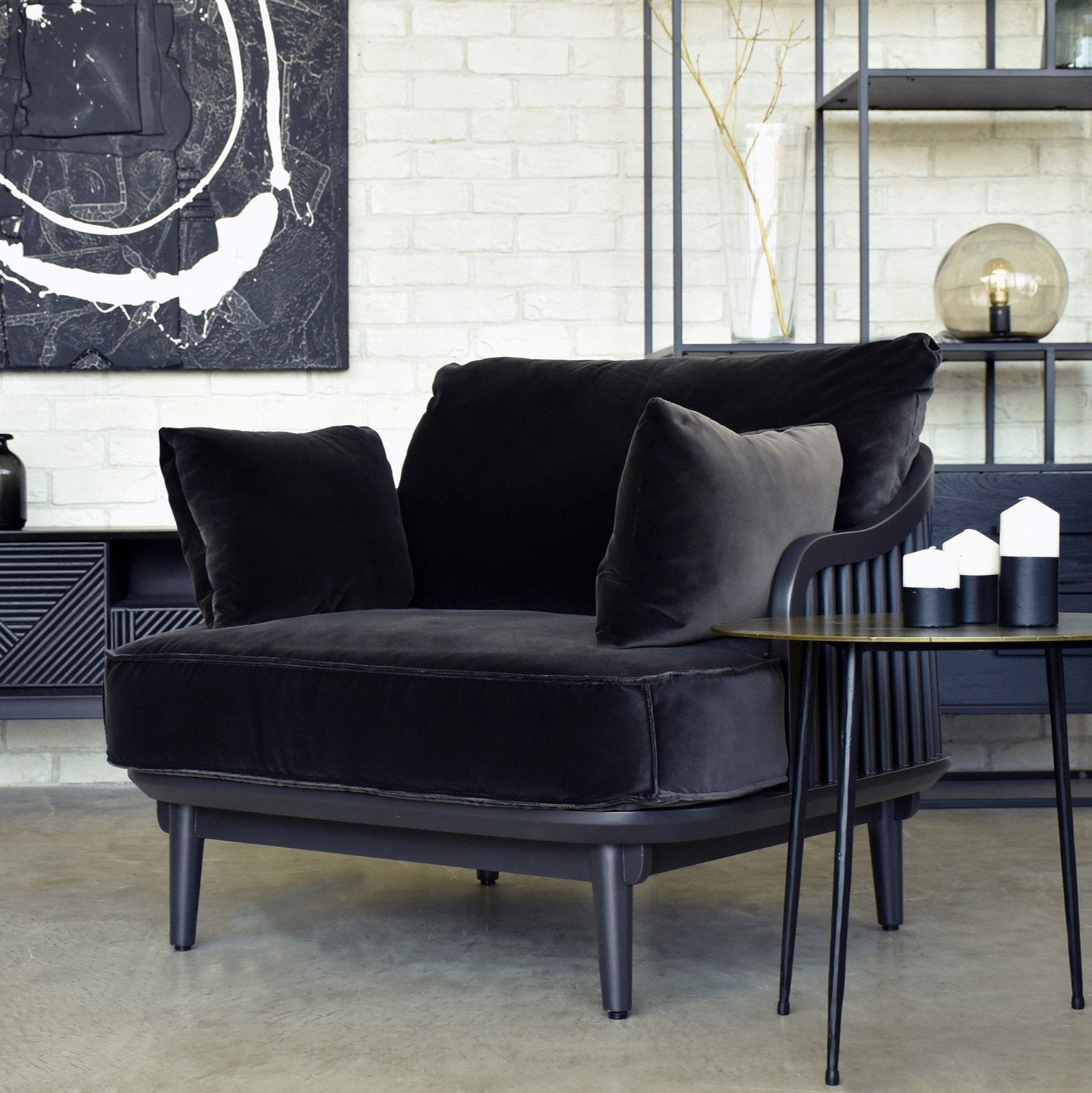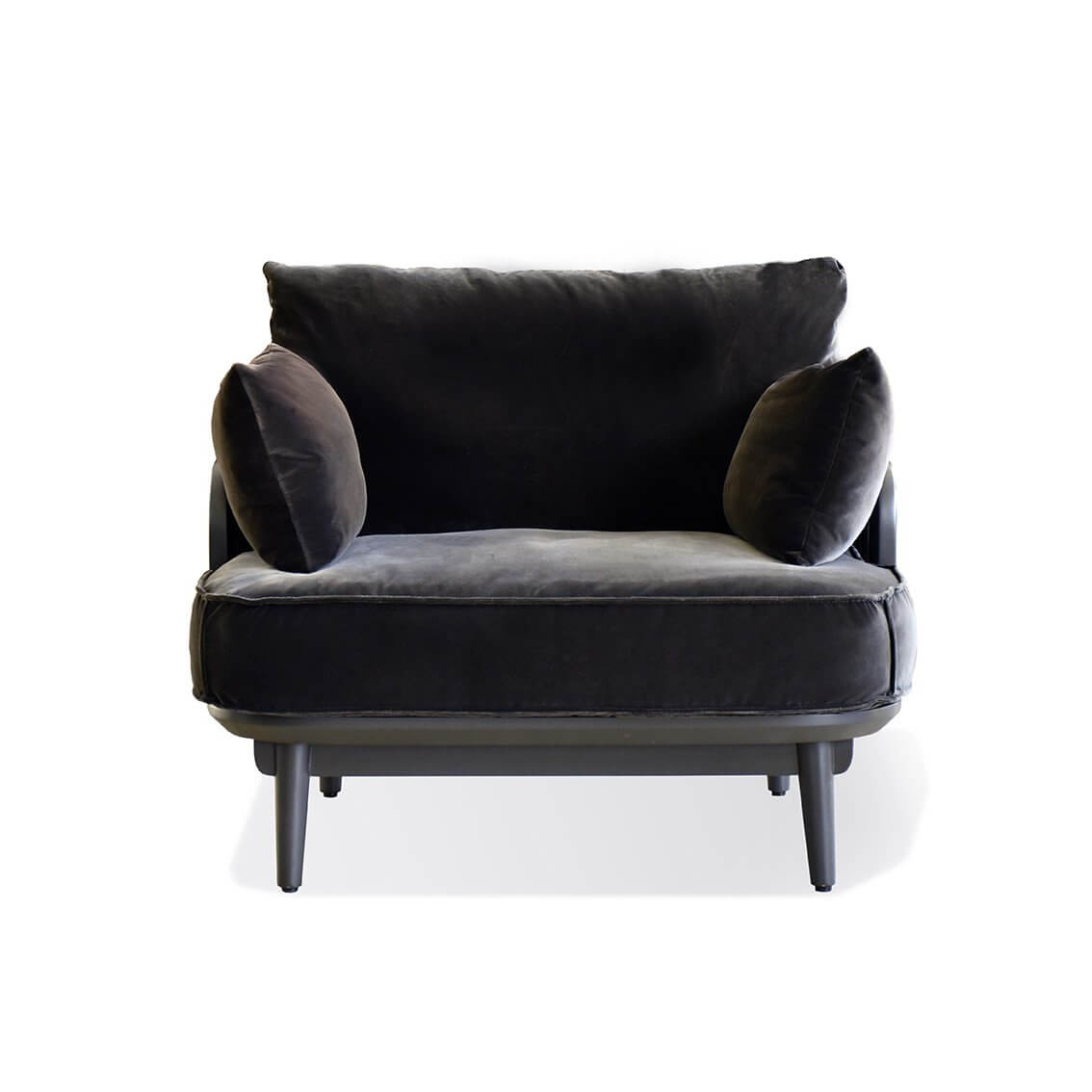 アームから背中までラウンドしてつながる笠木に、縦桟の連続性が美しい1人掛けソファです。マットな黒の質感と陰影が斜め後ろからの美しい表情を引き立てます。全ての張地を外すことができますが家庭用の洗濯機では洗濯ができないためご注意ください。