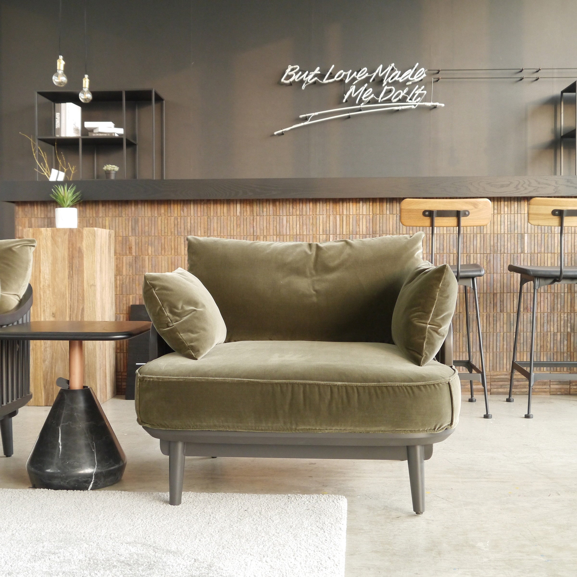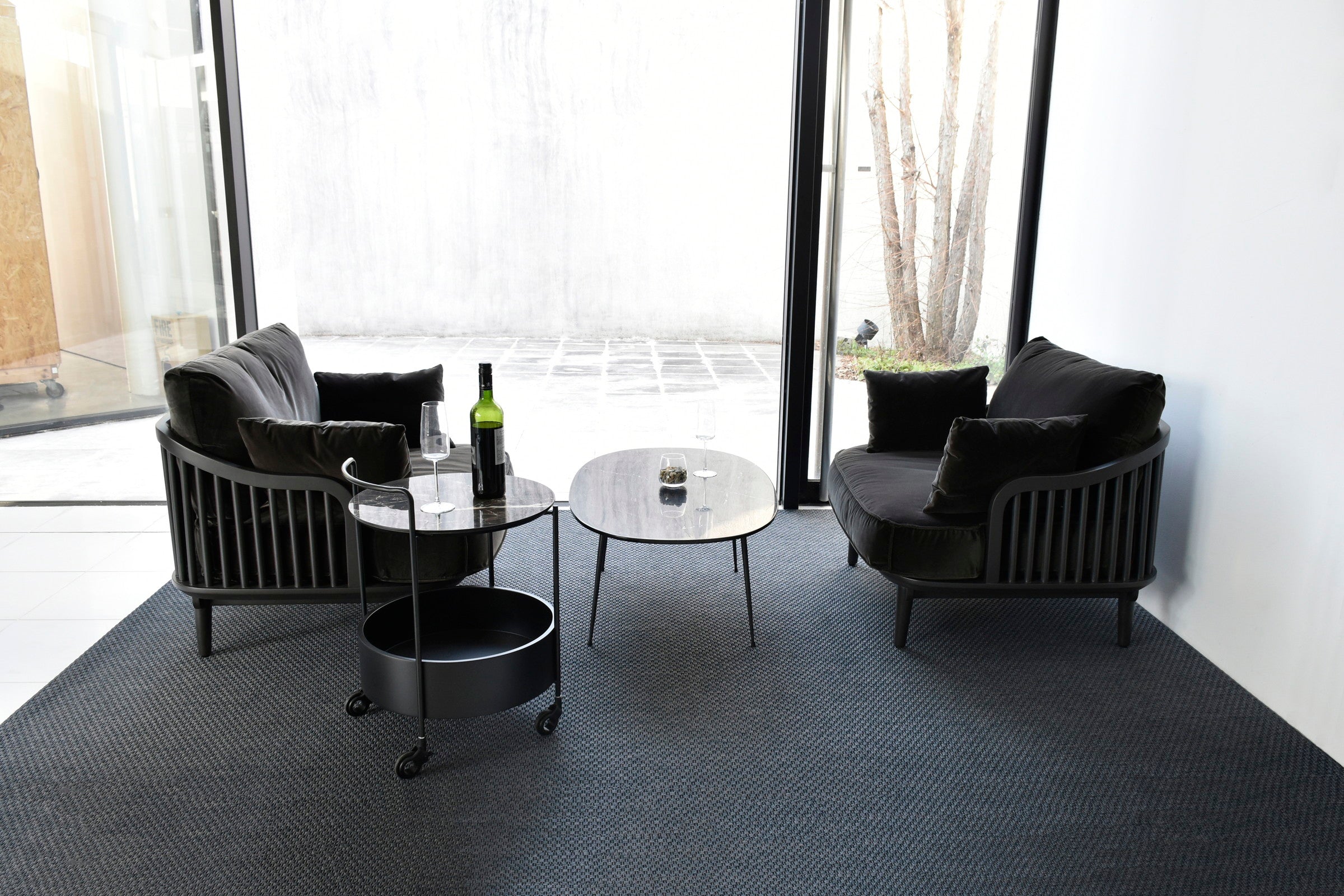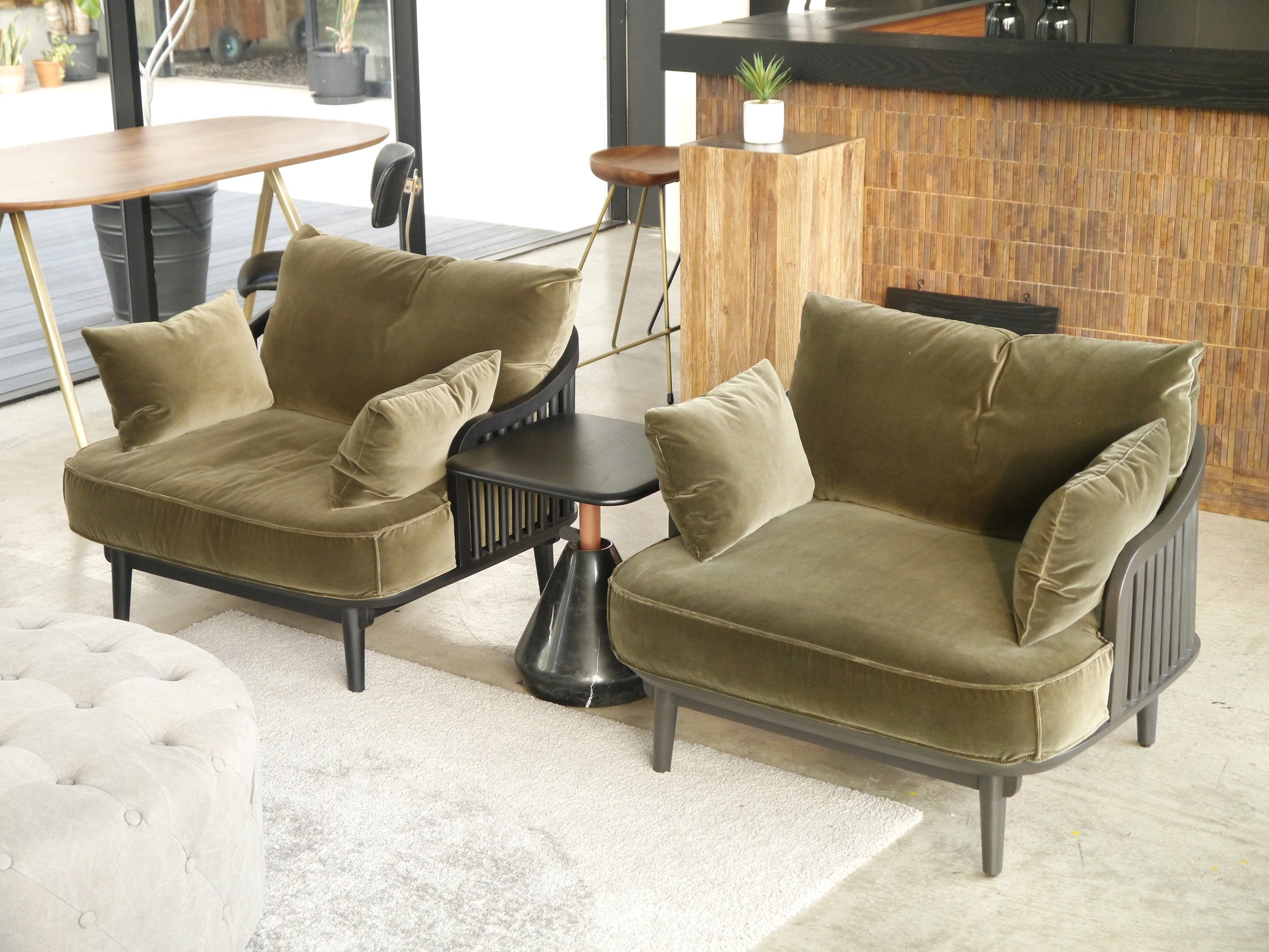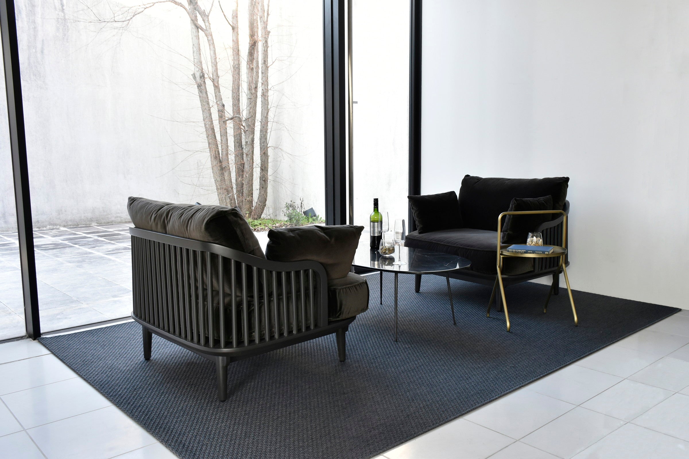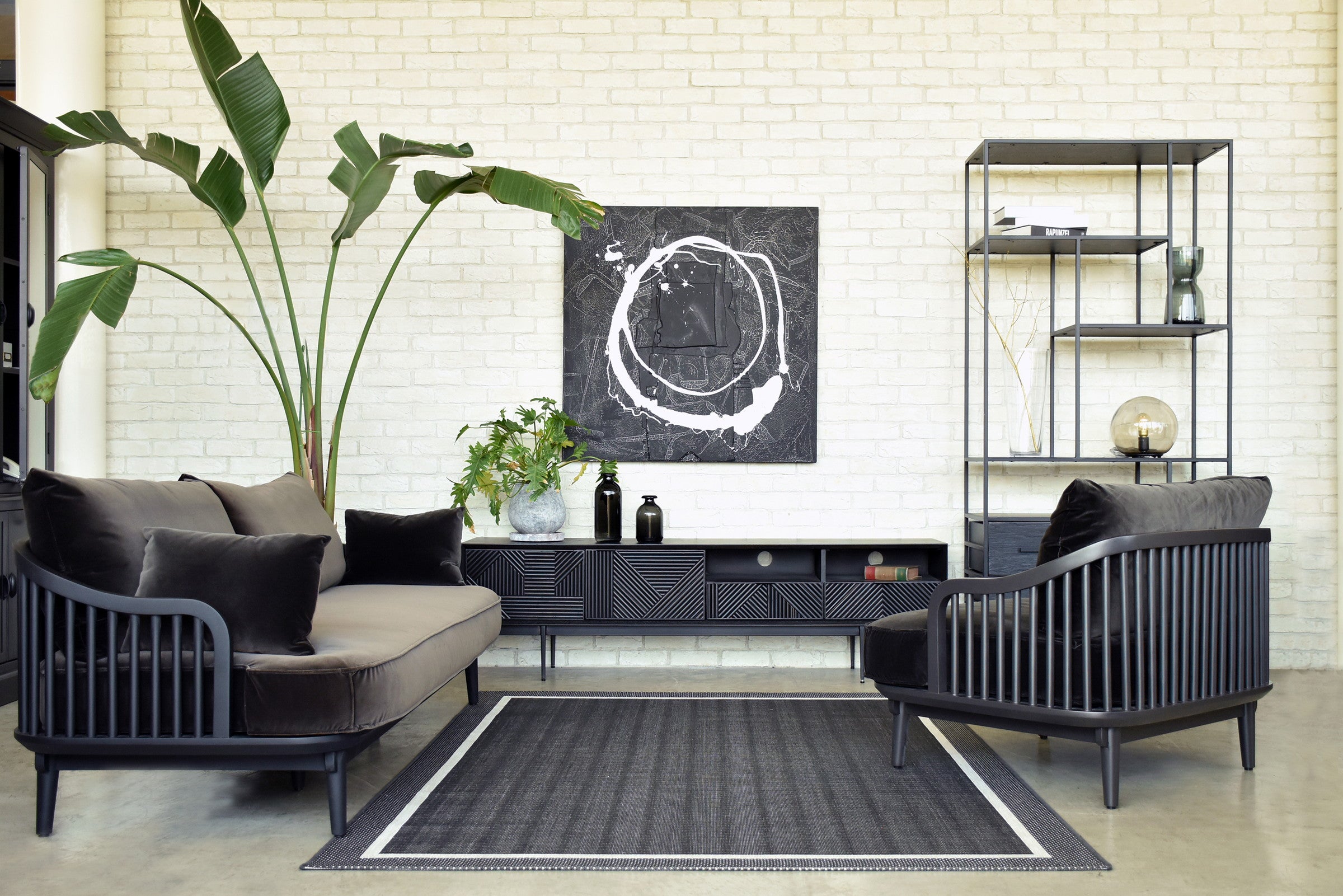 アームから背中までラウンドしてつながる笠木に、縦桟の連続性が美しい1人掛けソファです。マットな黒の質感と陰影が斜め後ろからの美しい表情を引き立てます。全ての張地を外すことができますが家庭用の洗濯機では洗濯ができないためご注意ください。