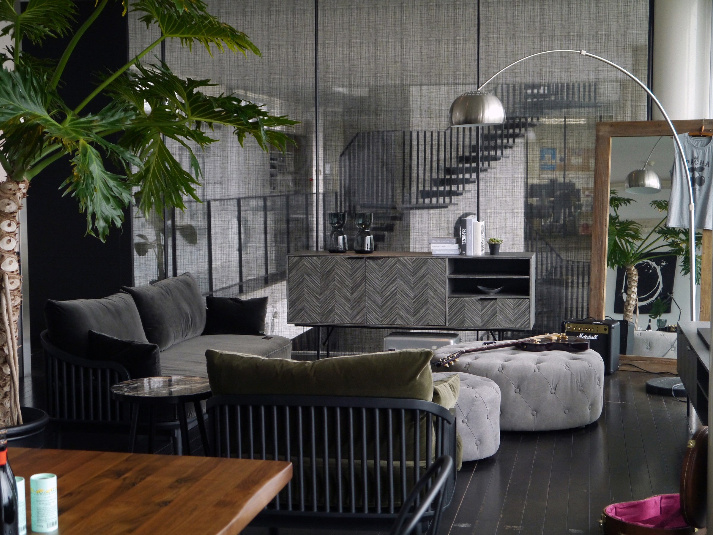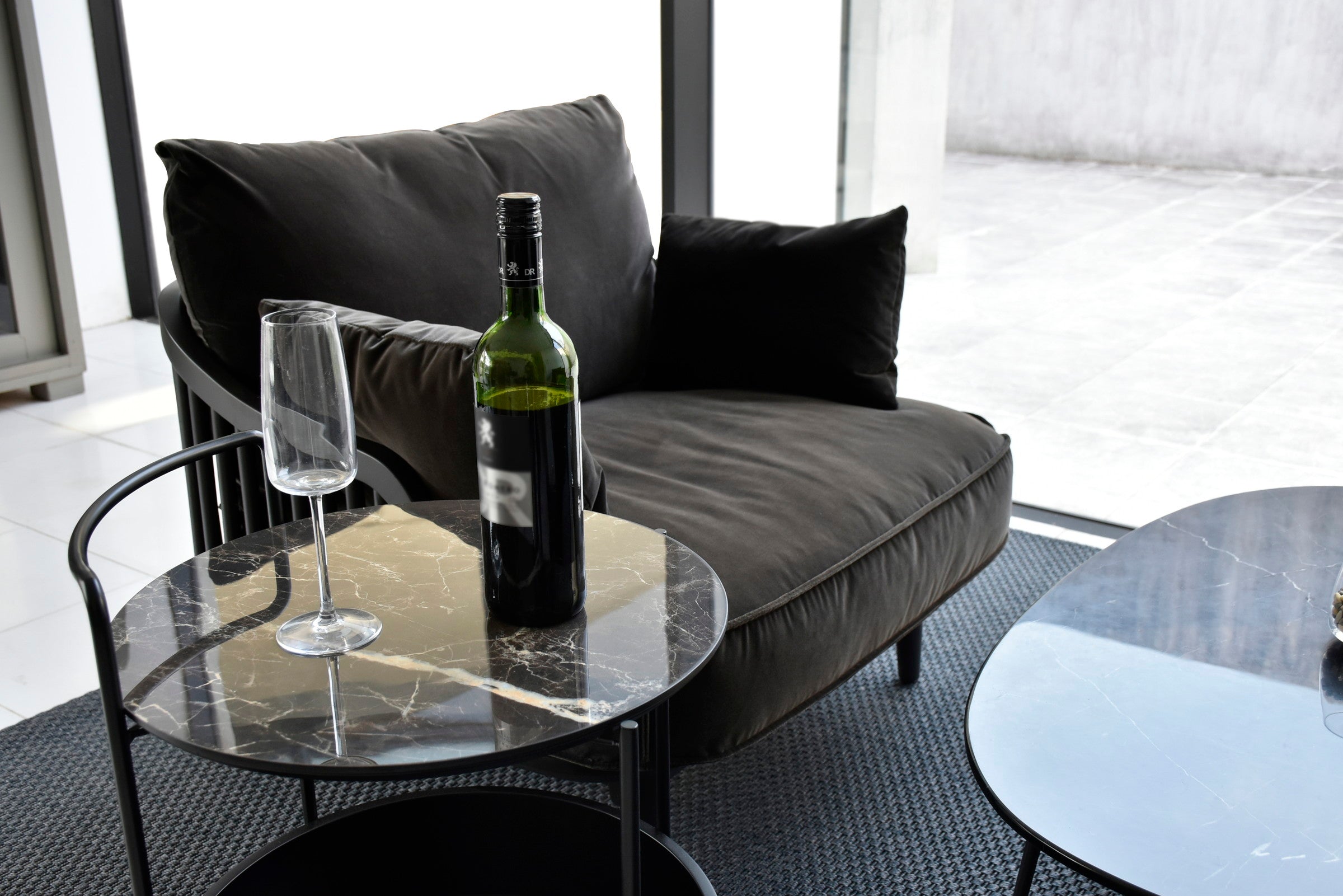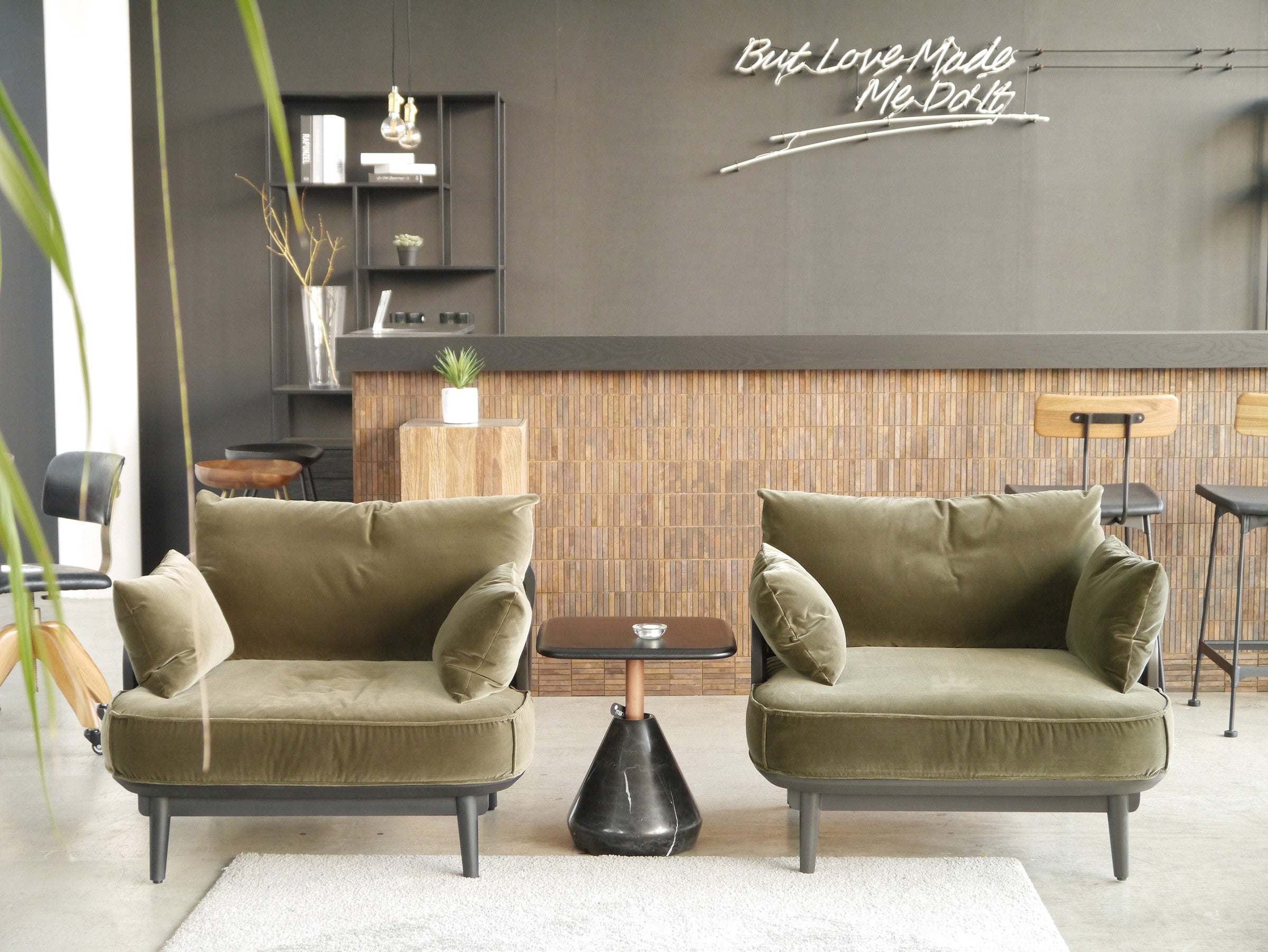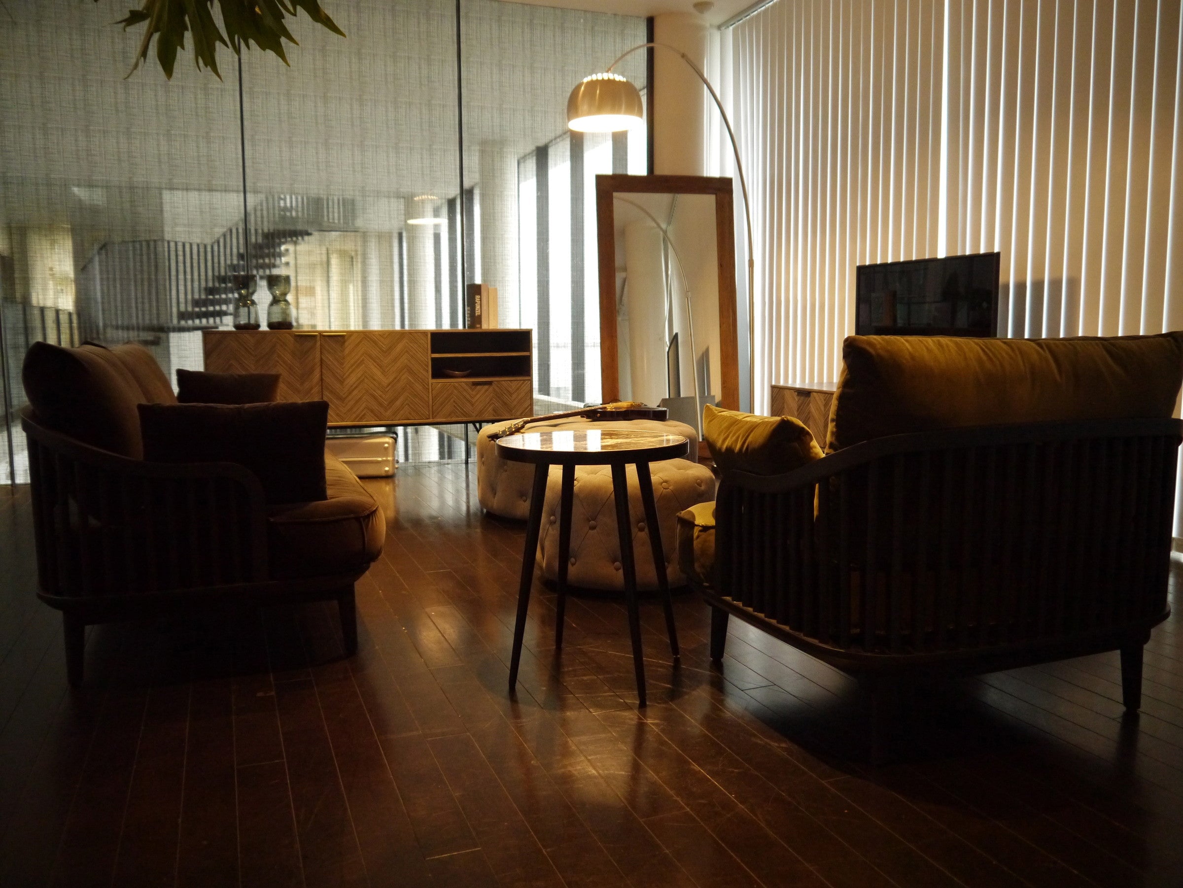 アームから背中までラウンドしてつながる笠木に、縦桟の連続性が美しい1人掛けソファです。マットな黒の質感と陰影が斜め後ろからの美しい表情を引き立てます。全ての張地を外すことができますが家庭用の洗濯機では洗濯ができないためご注意ください。