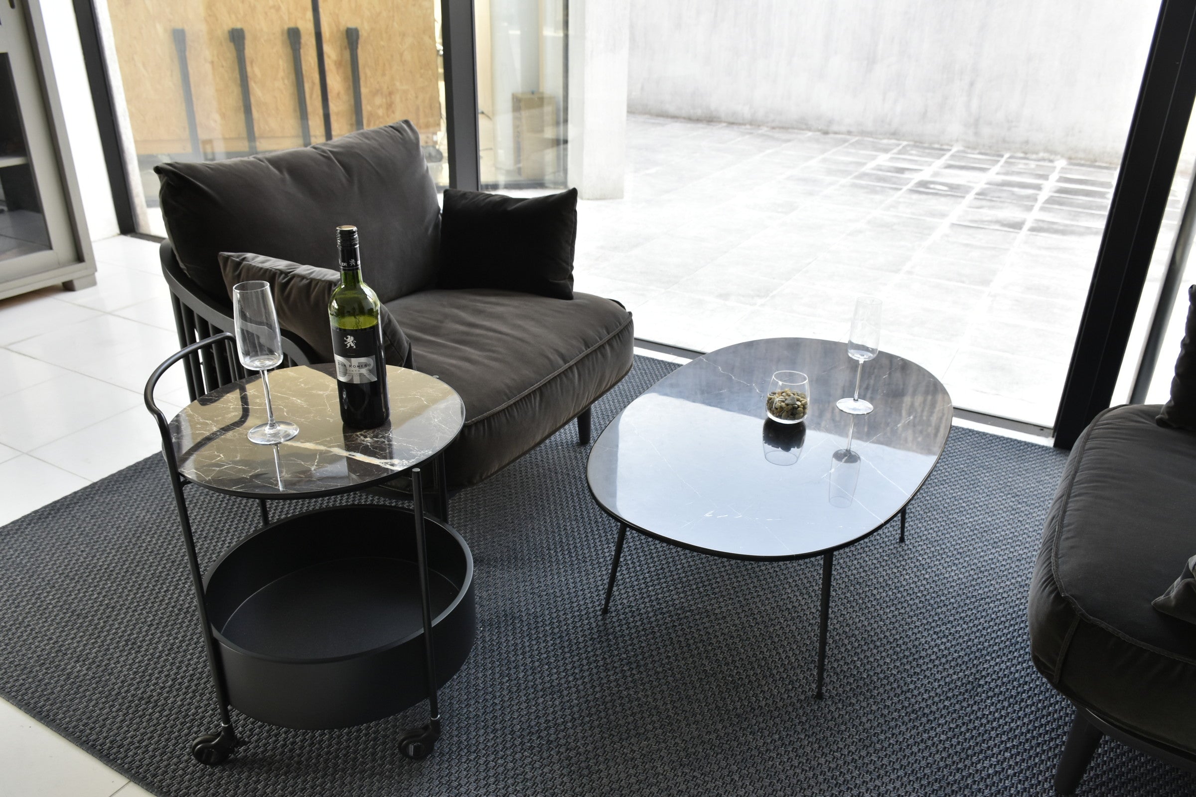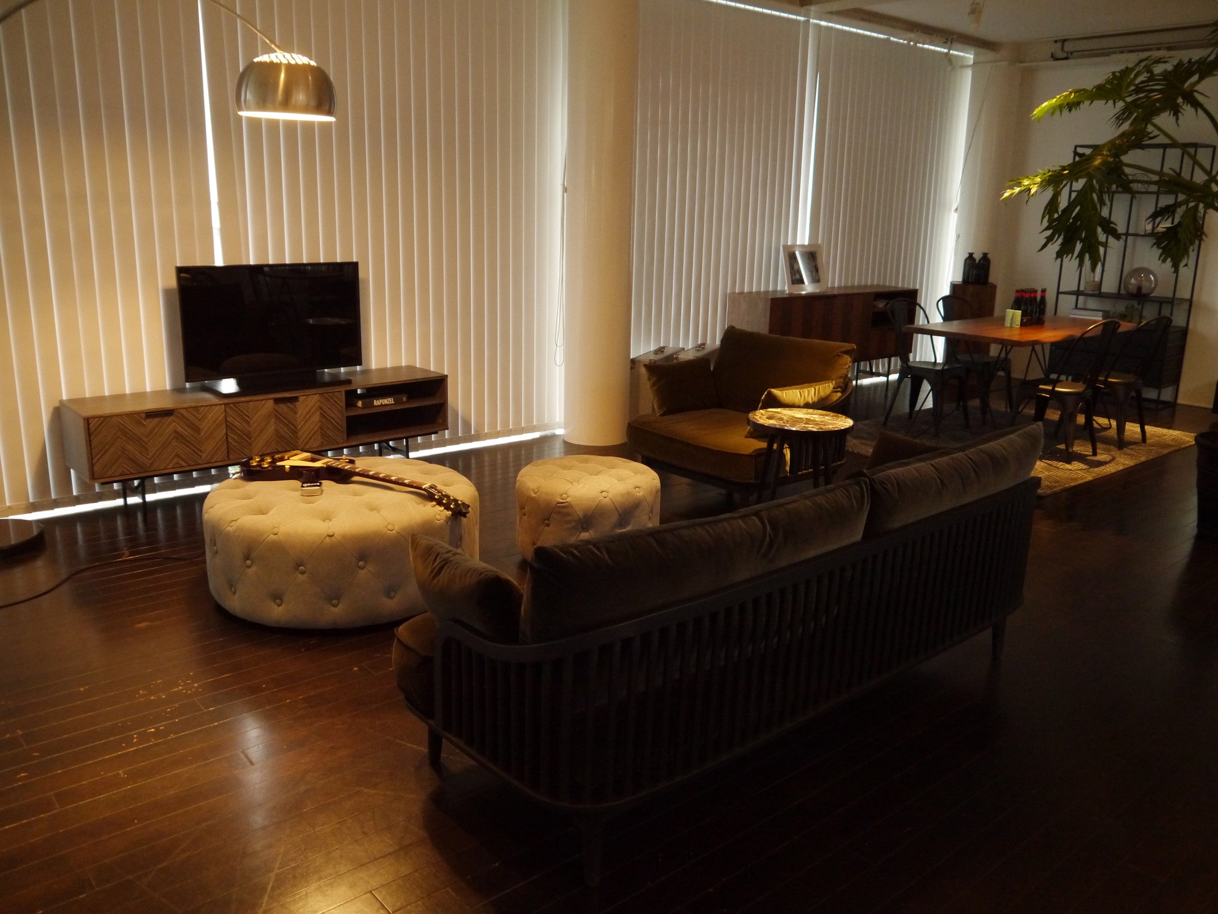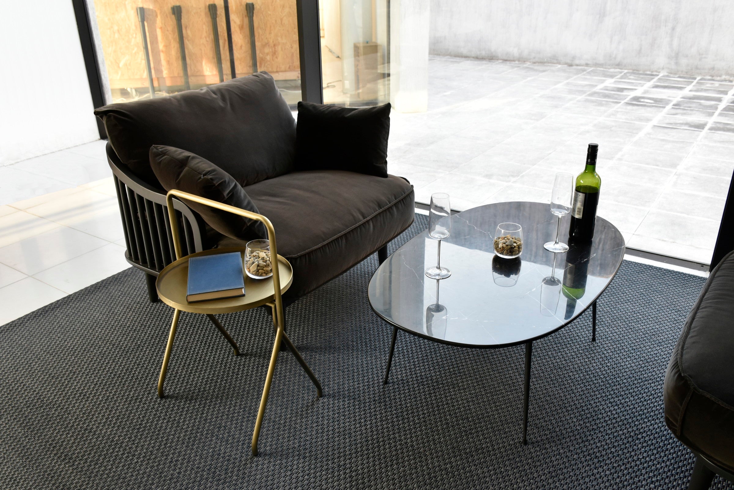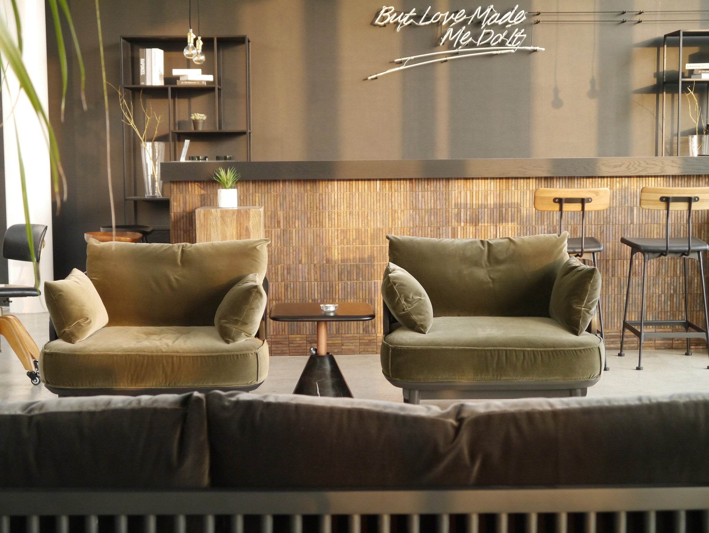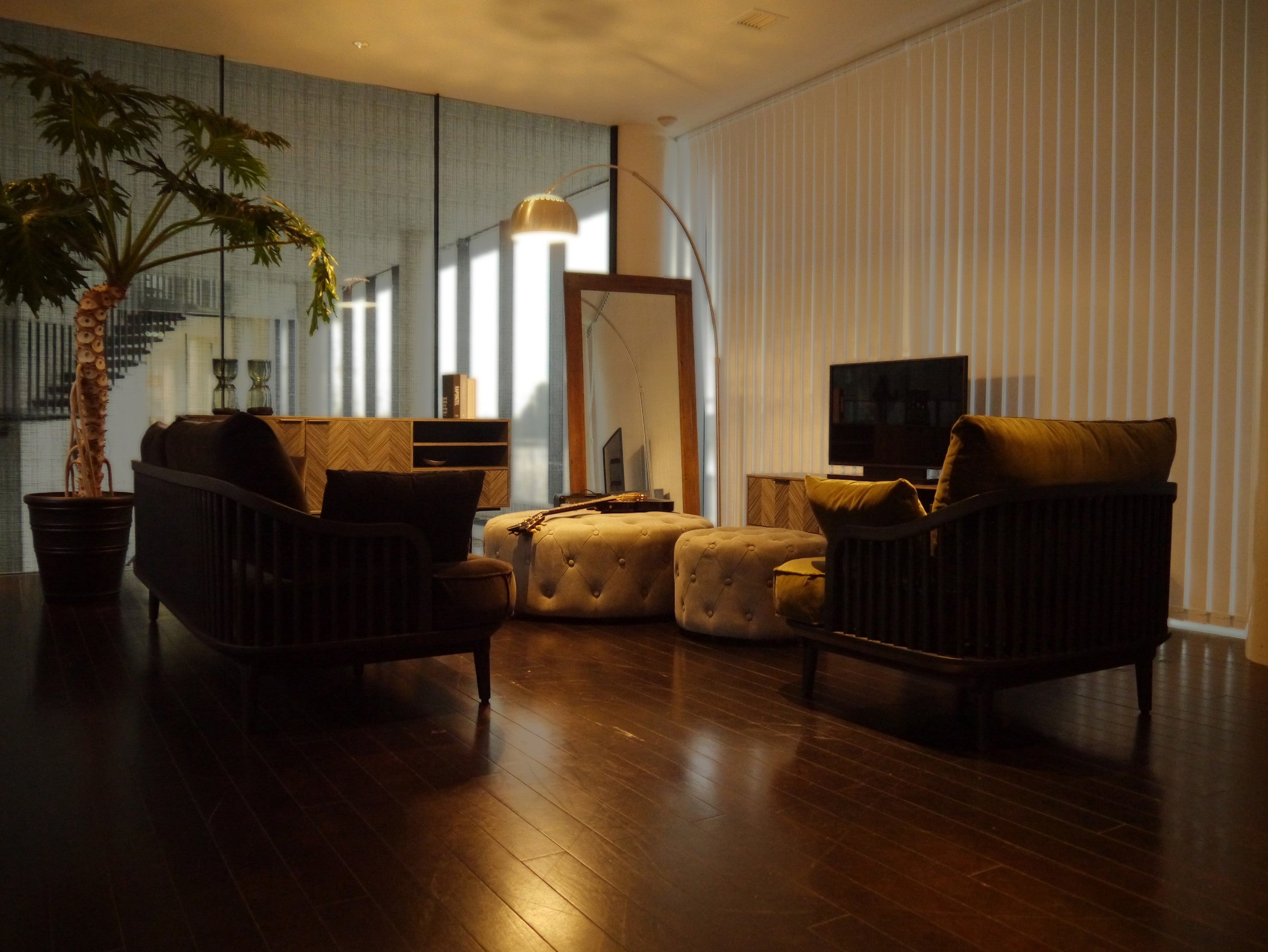 アームから背中までラウンドしてつながる笠木に、縦桟の連続性が美しい1人掛けソファです。マットな黒の質感と陰影が斜め後ろからの美しい表情を引き立てます。全ての張地を外すことができますが家庭用の洗濯機では洗濯ができないためご注意ください。