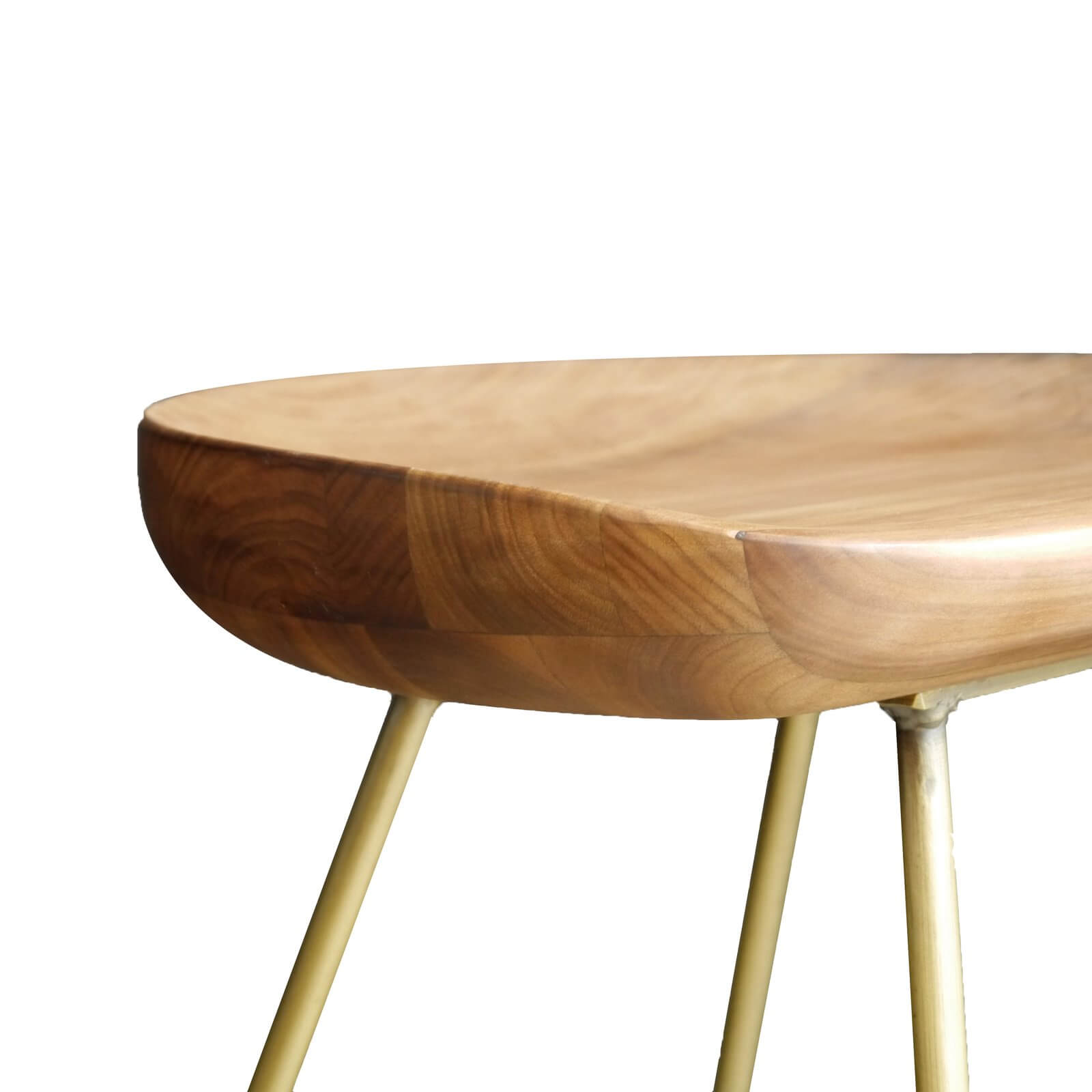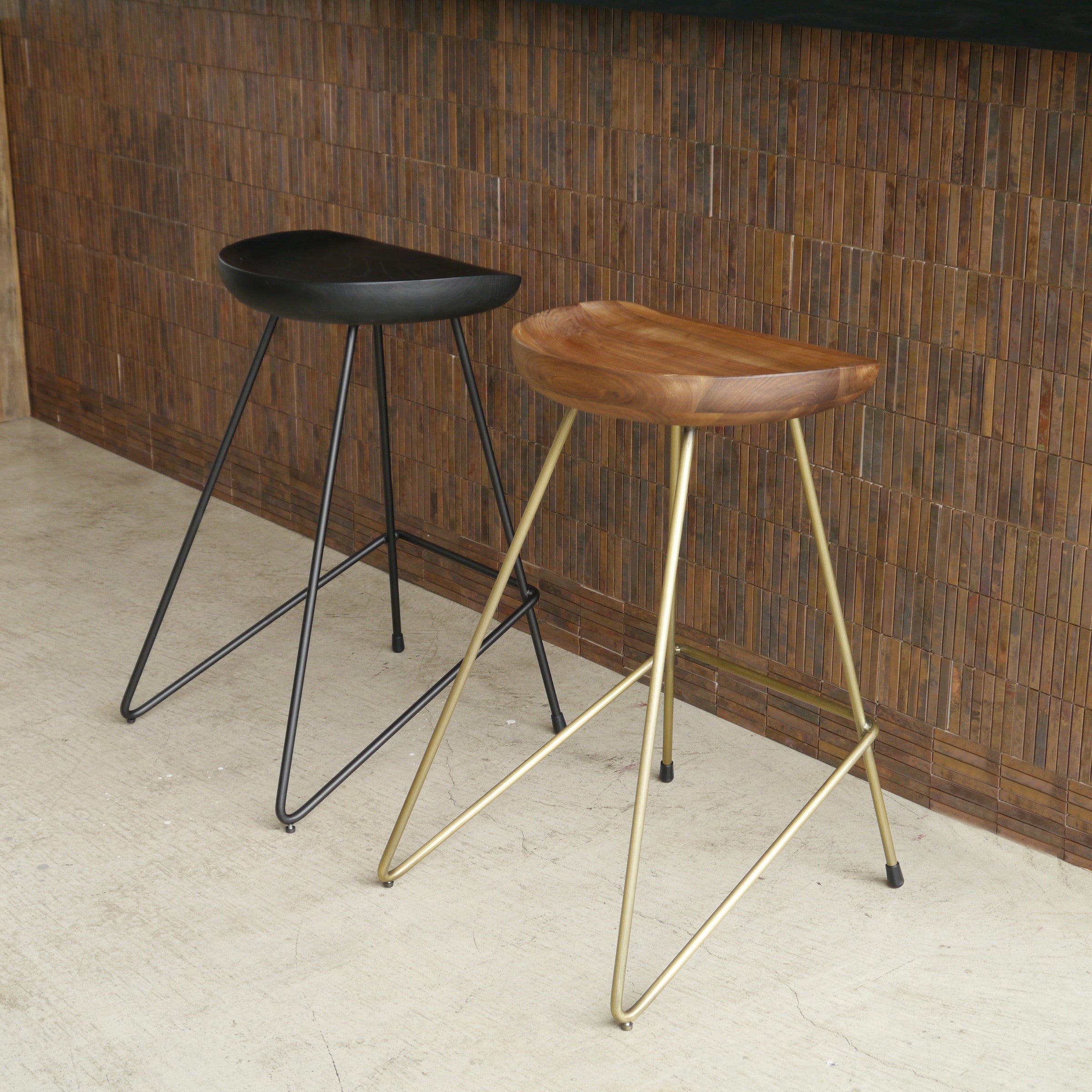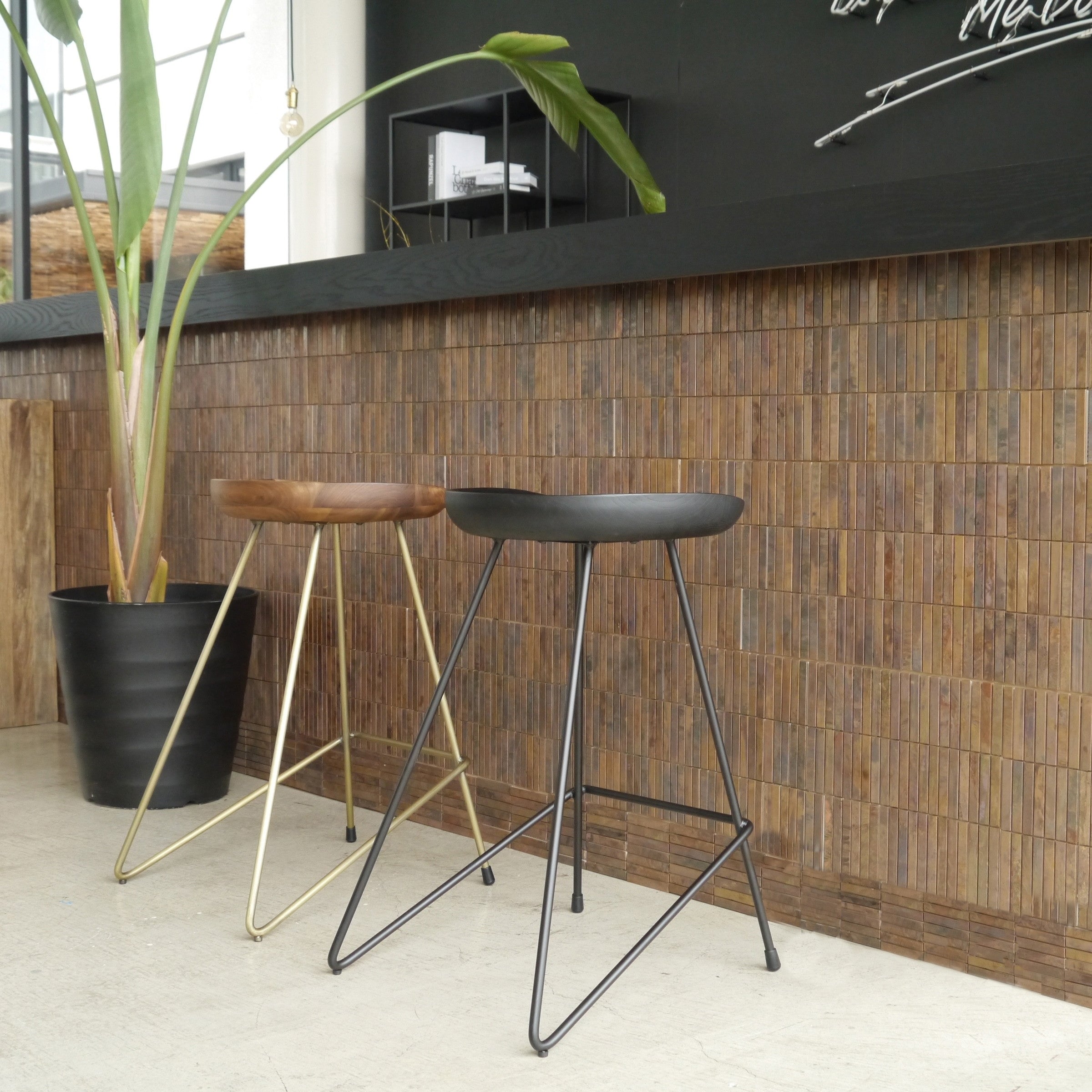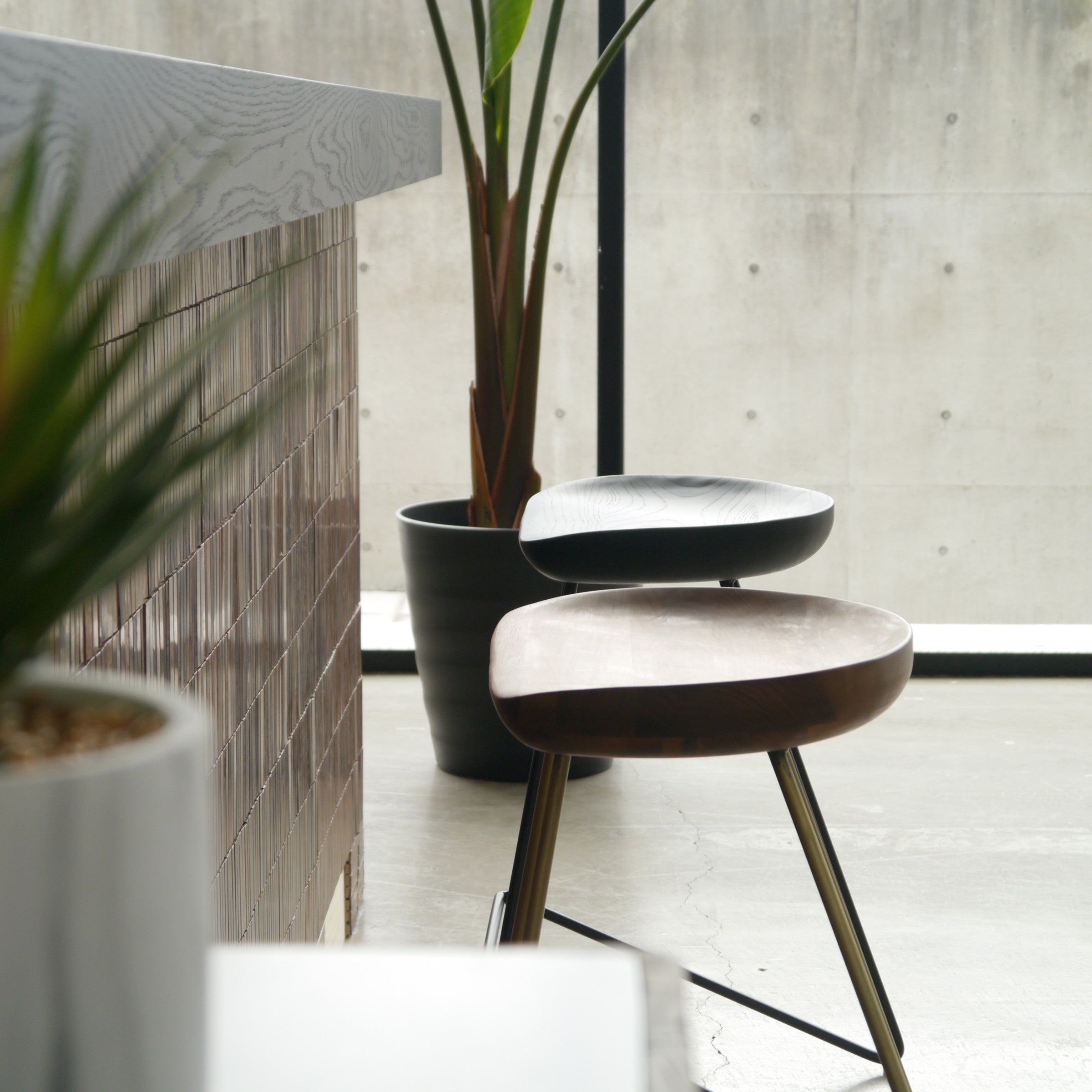 無垢材から贅沢に削り出した座面の量感と、スチール脚の繊細なバランスが美しいハイチェアです。ブラウンはウォールナット無垢材ワックス塗装仕上げ、座面ブラックはアッシュ無垢材ウレタン塗装仕上げで、カラーにより仕上げを変えて素材をさらに引き立てています。