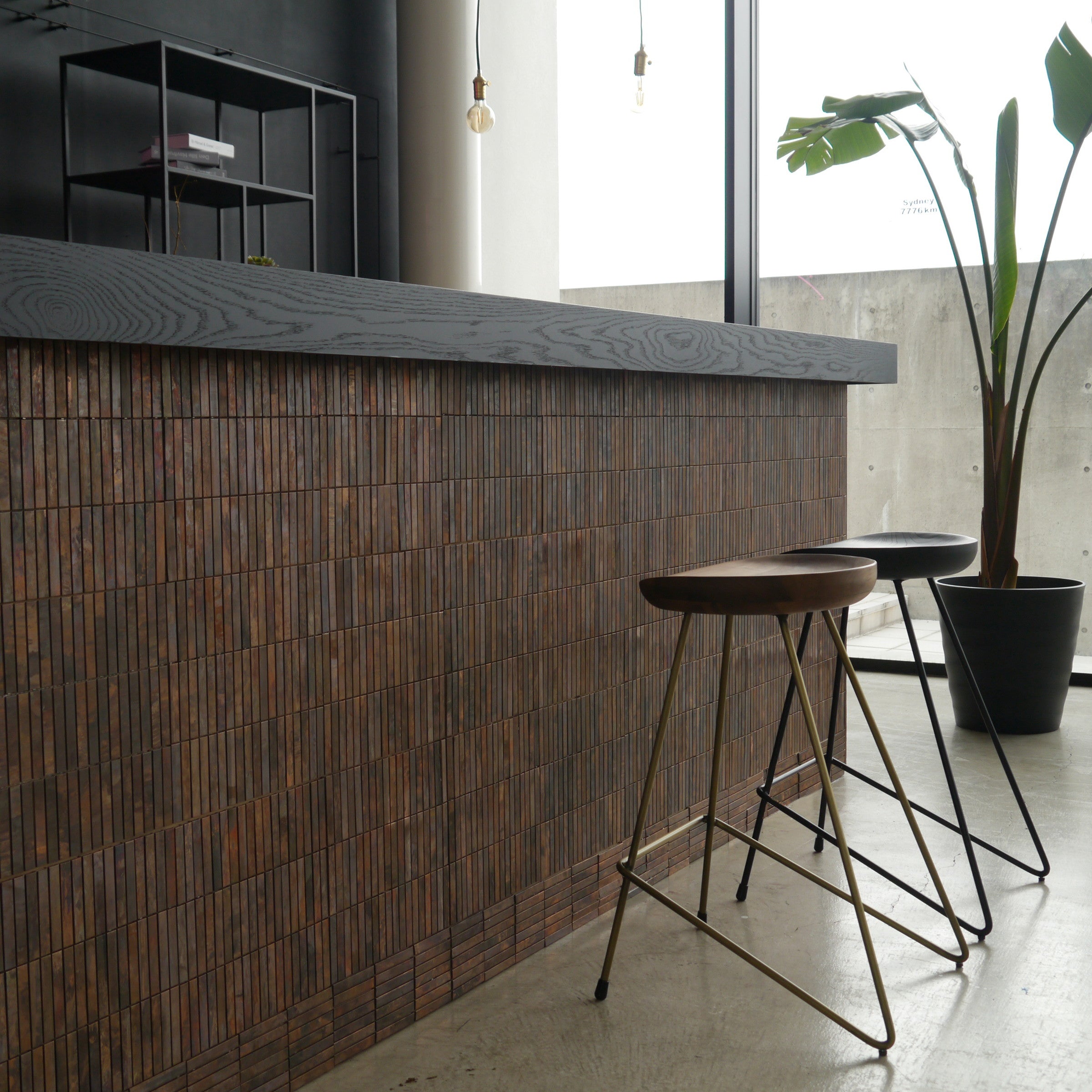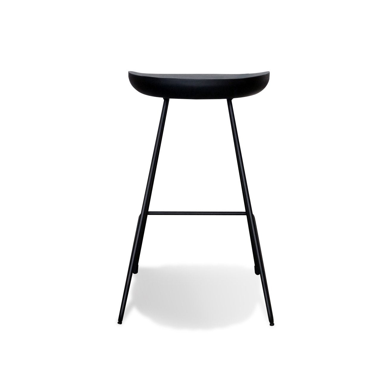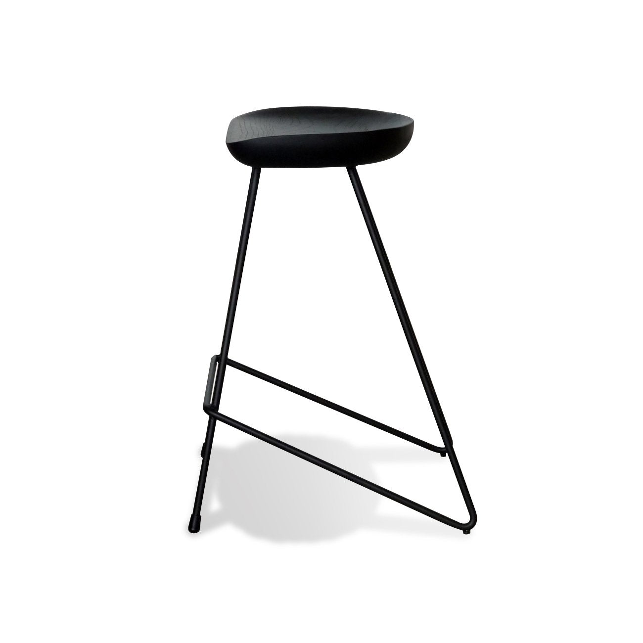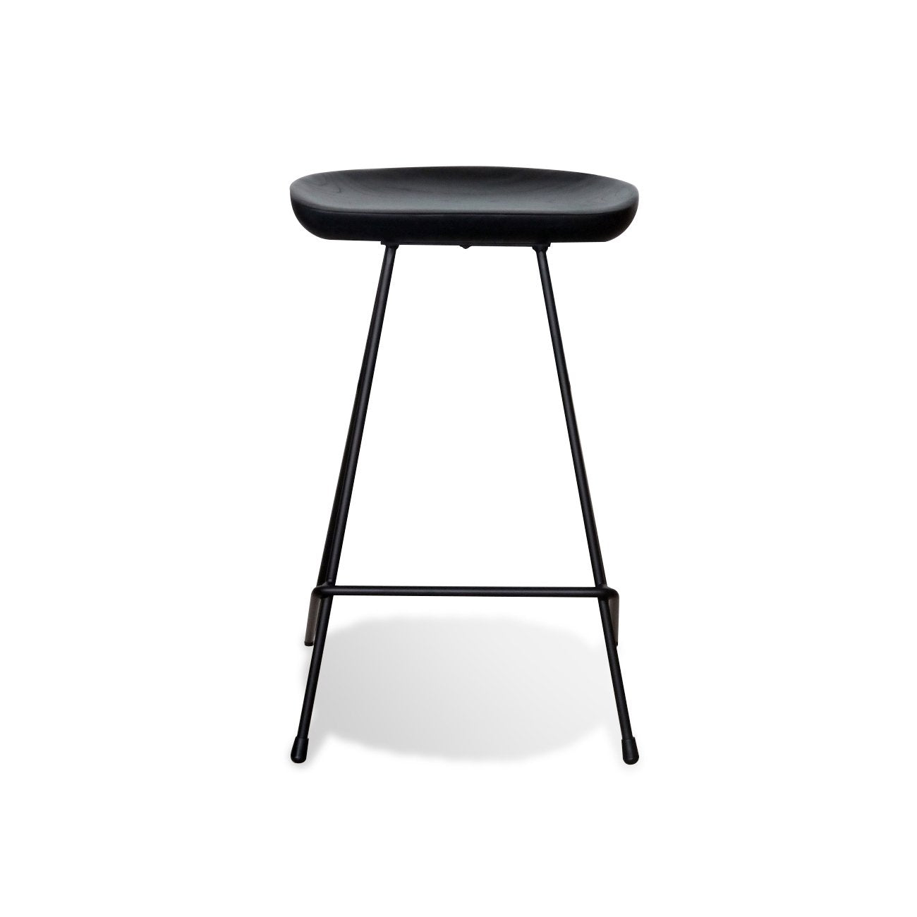 無垢材から贅沢に削り出した座面の量感と、スチール脚の繊細なバランスが美しいハイチェアです。ブラウンはウォールナット無垢材ワックス塗装仕上げ、座面ブラックはアッシュ無垢材ウレタン塗装仕上げで、カラーにより仕上げを変えて素材をさらに引き立てています。