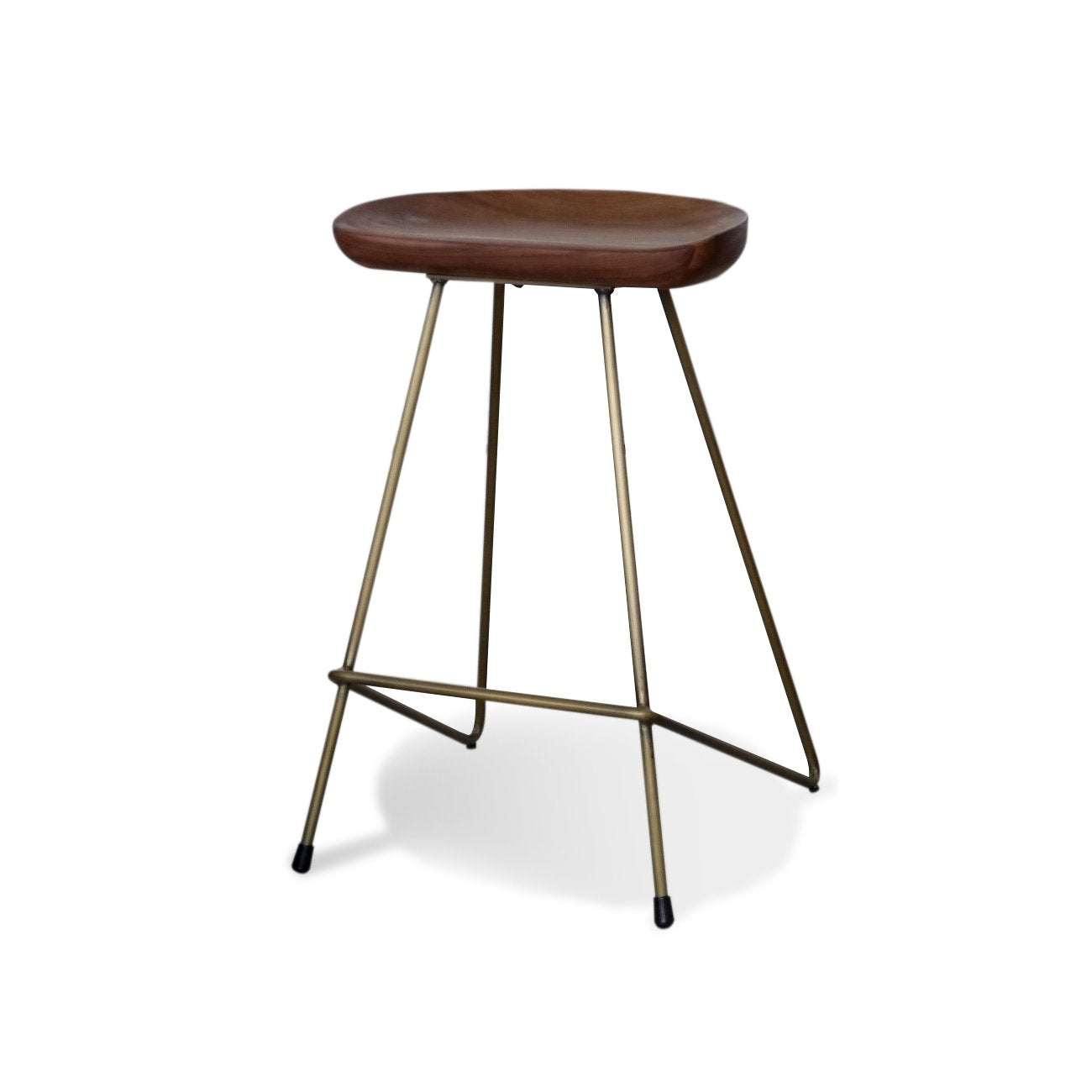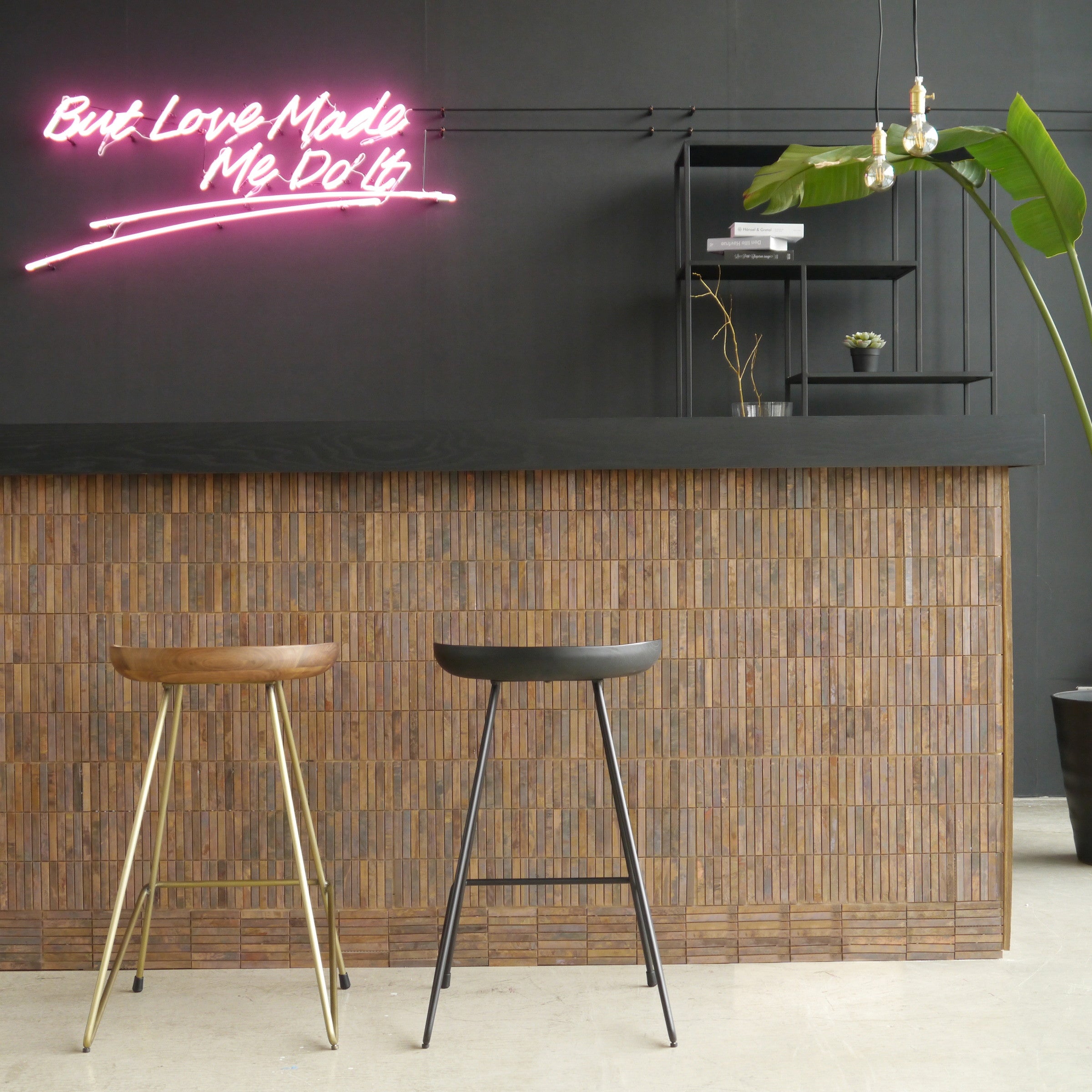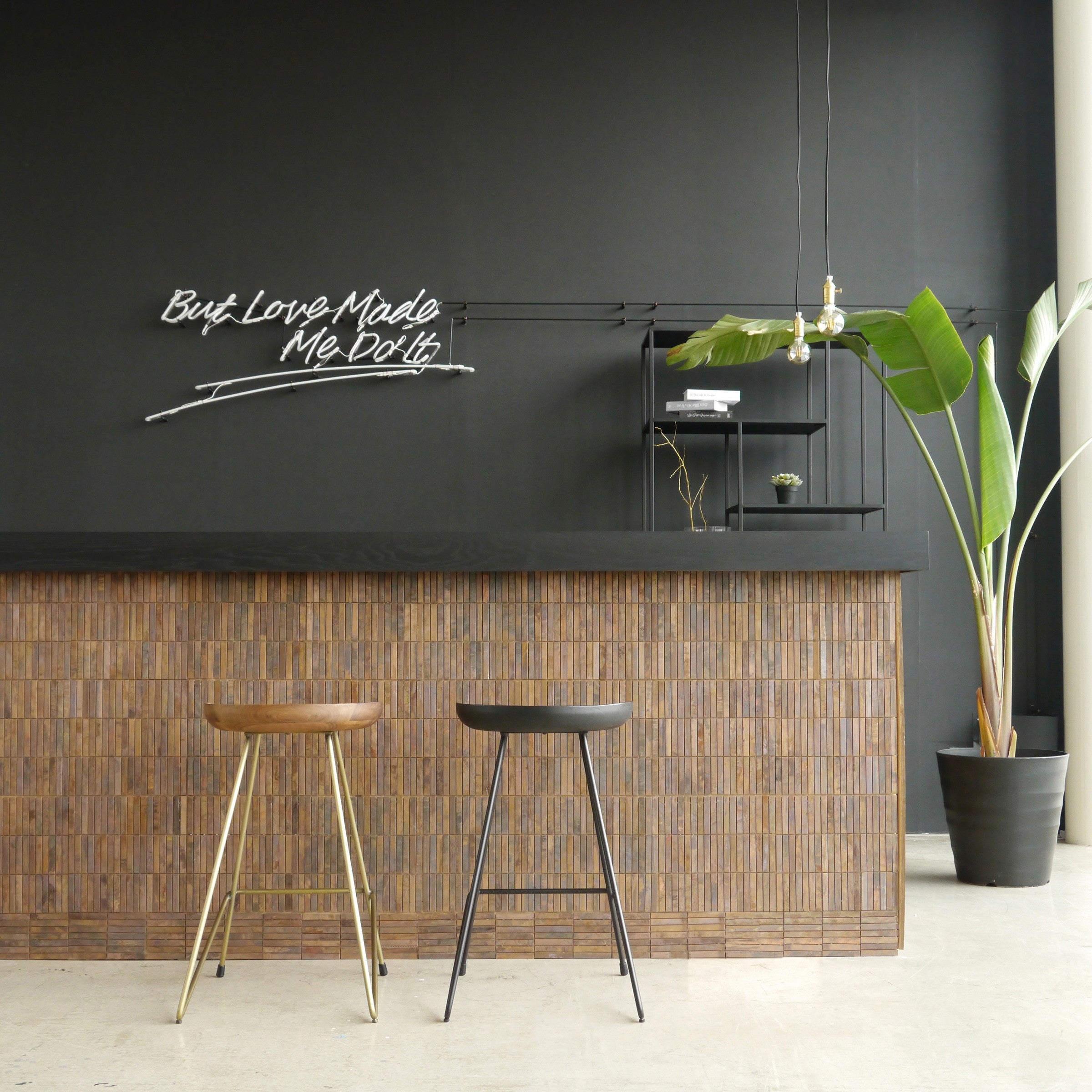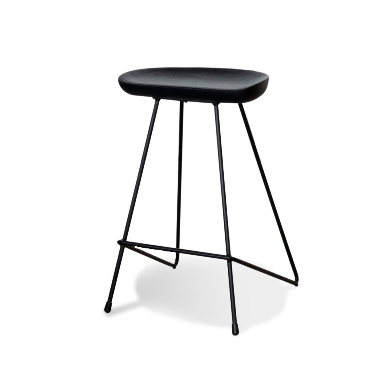 無垢材から贅沢に削り出した座面の量感と、スチール脚の繊細なバランスが美しいハイチェアです。ブラウンはウォールナット無垢材ワックス塗装仕上げ、座面ブラックはアッシュ無垢材ウレタン塗装仕上げで、カラーにより仕上げを変えて素材をさらに引き立てています。